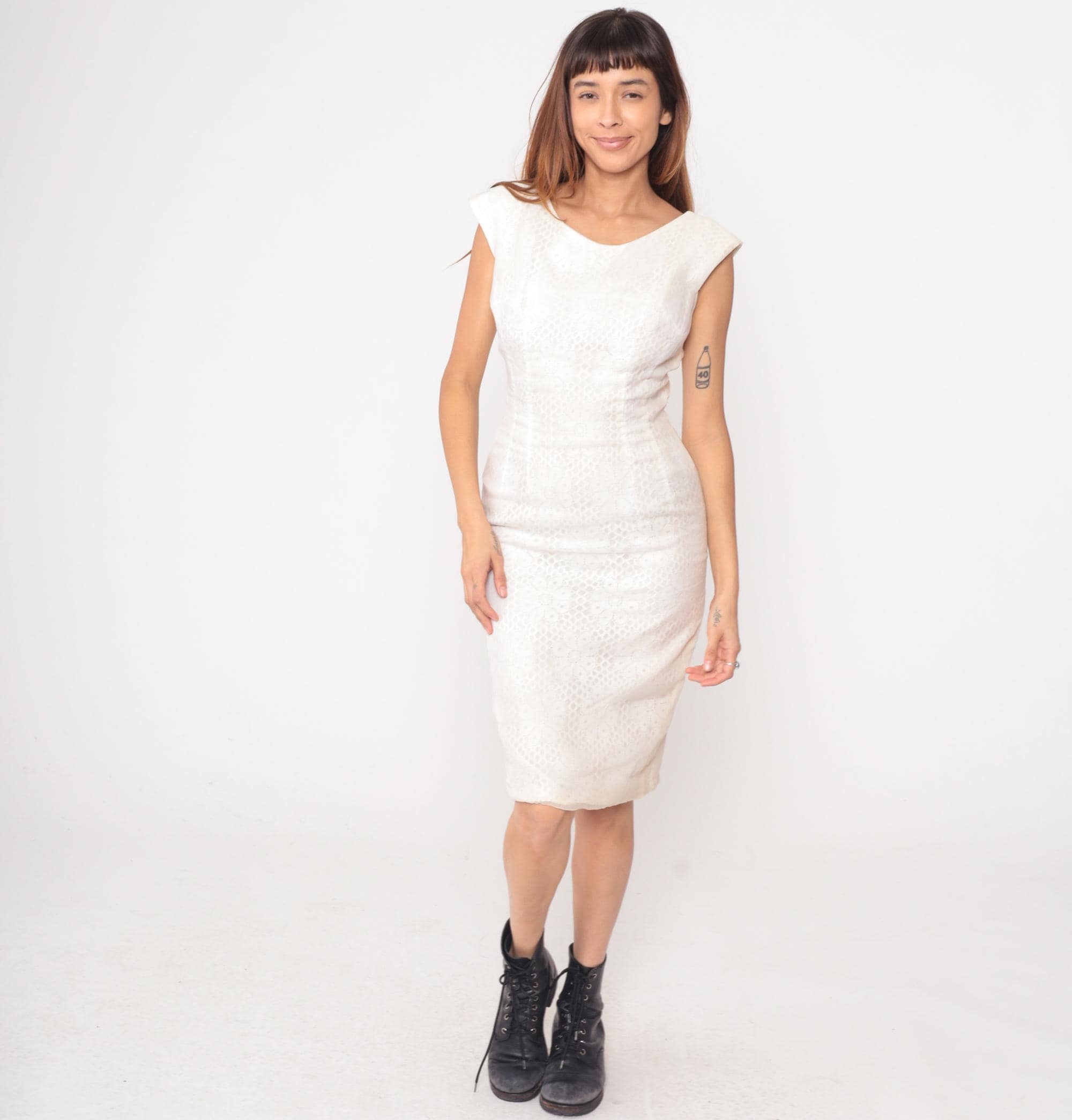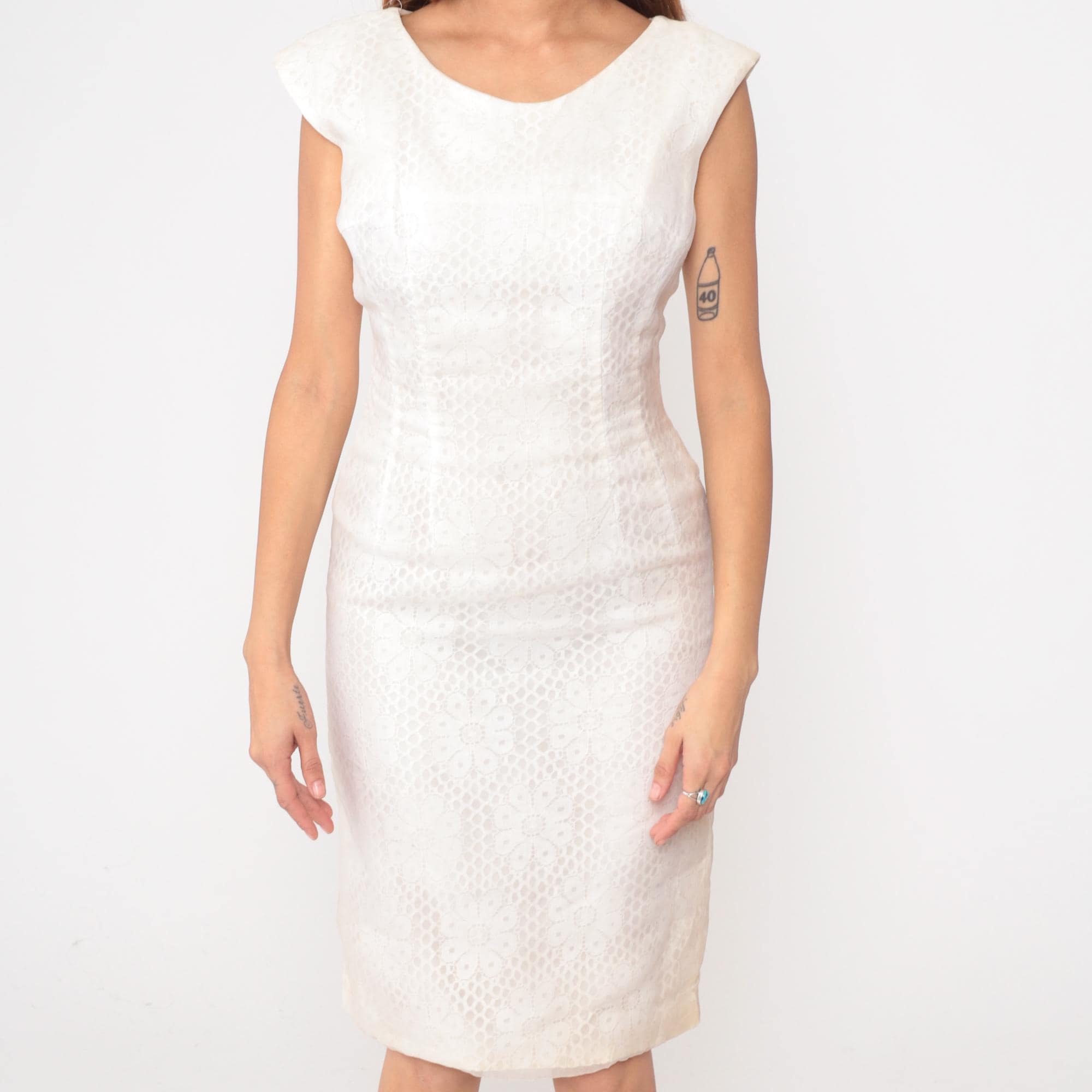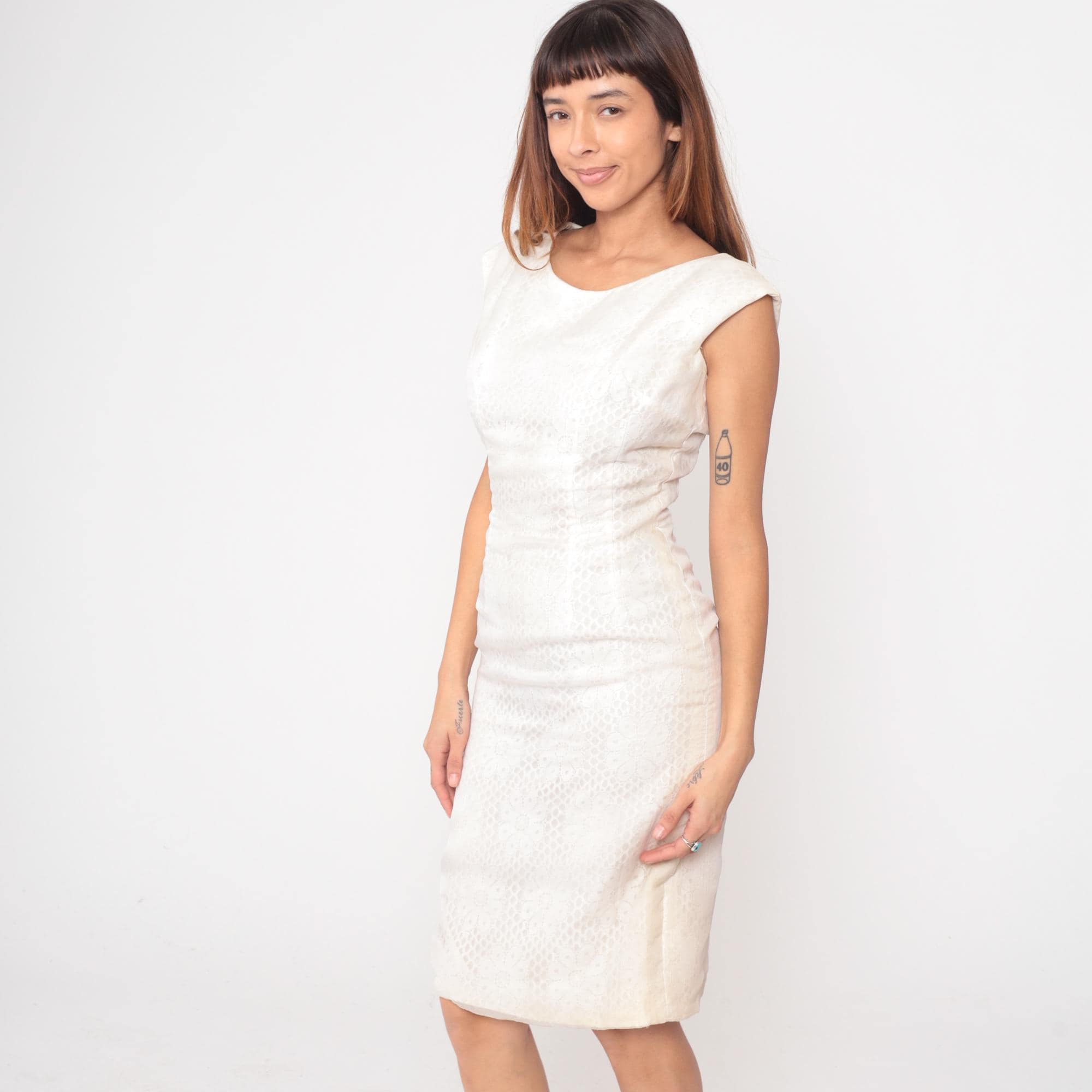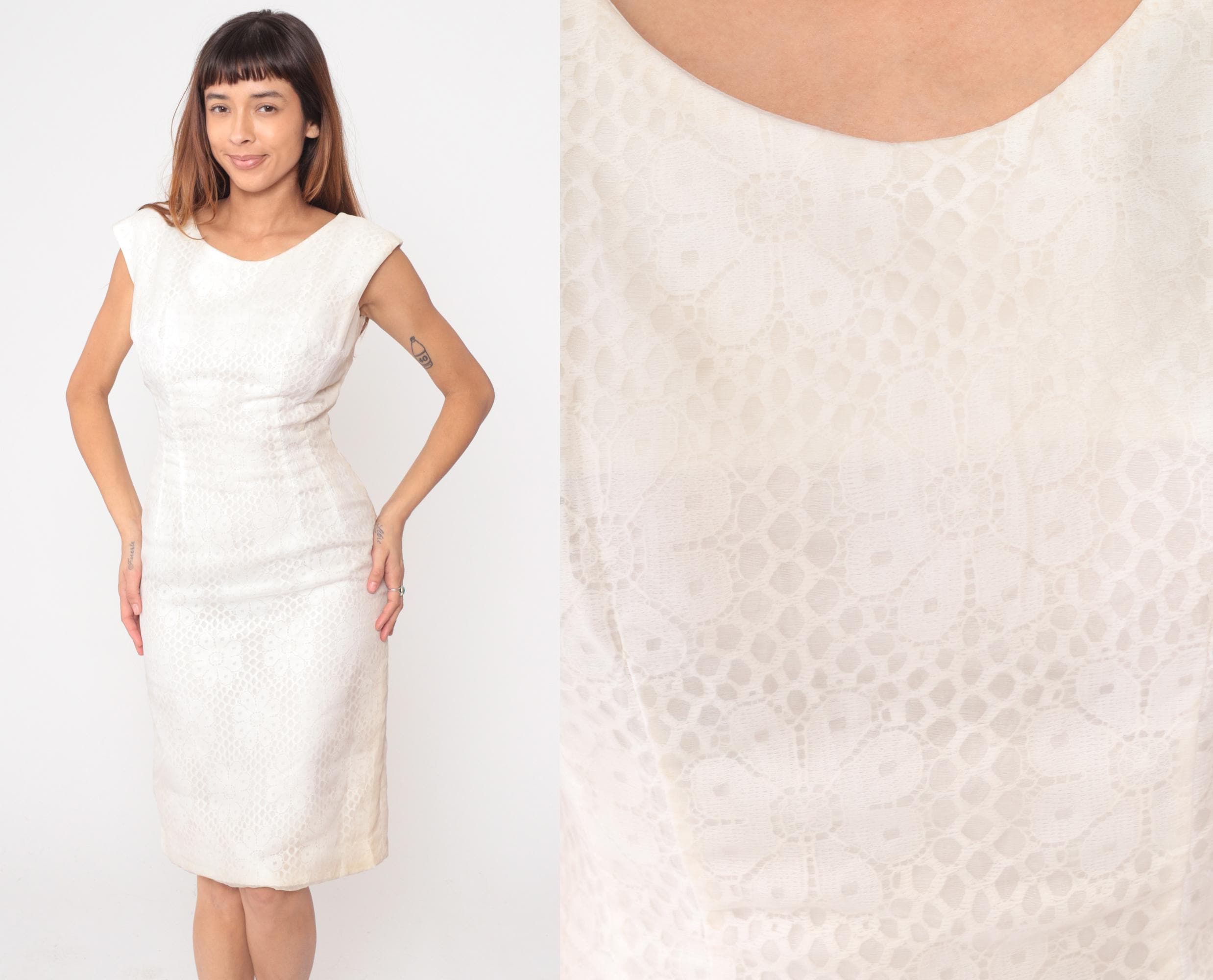 60s white dress from Claralura Original with textured brocade pattern across the fabric. Boat neckline, short cap sleeves, fitted bodice with back zipper closure. Straight knee-length skirt.