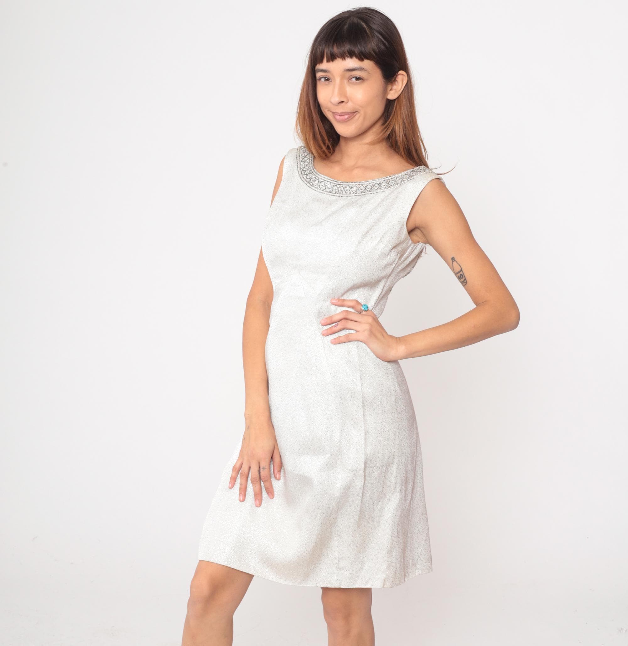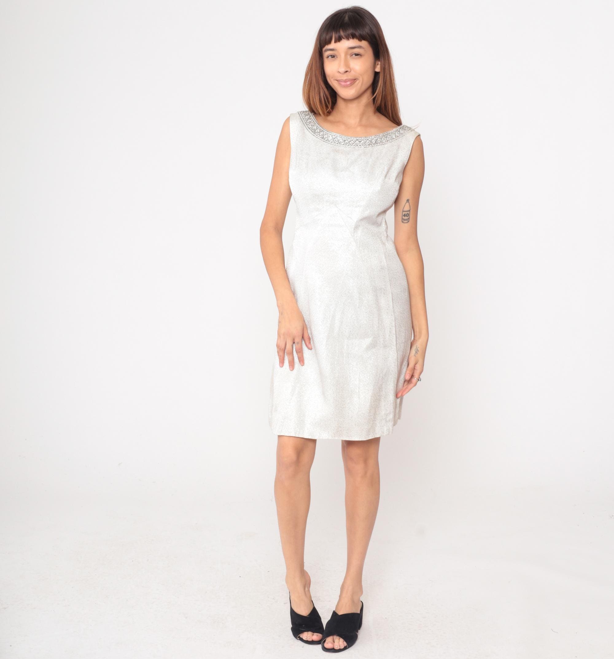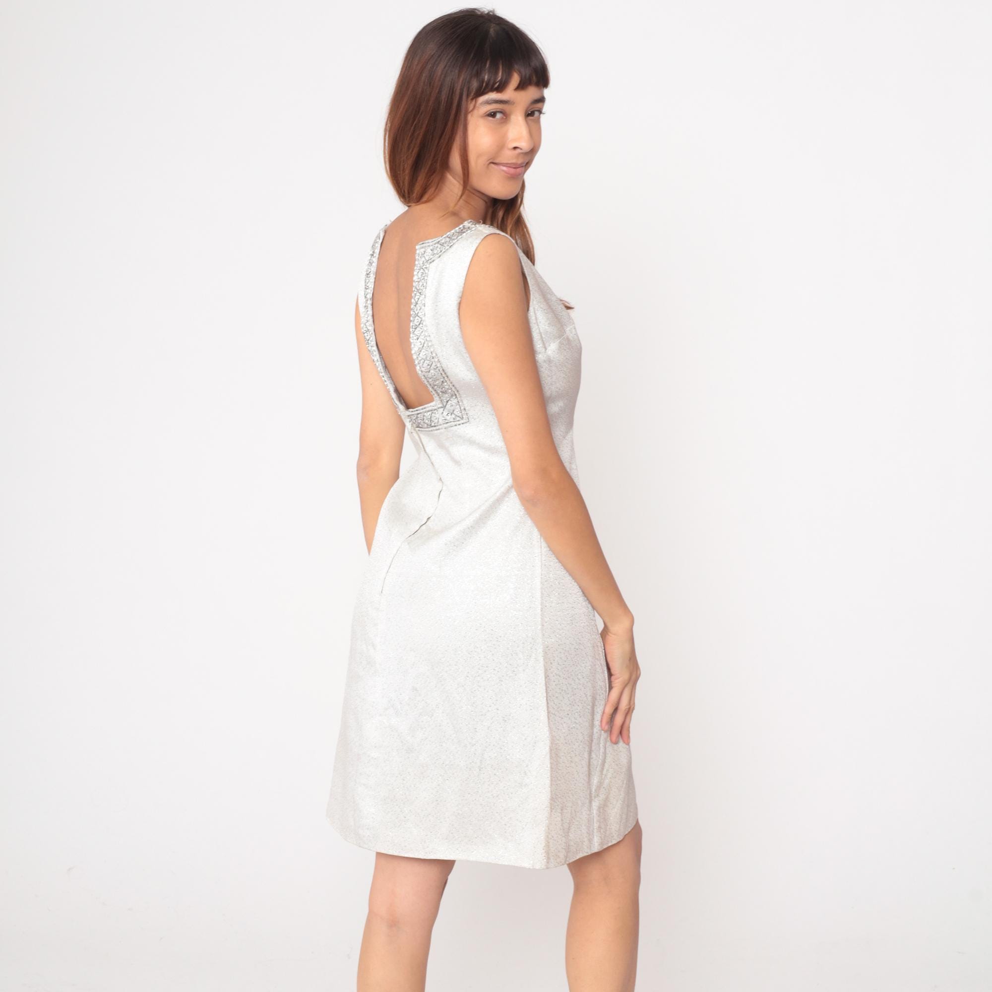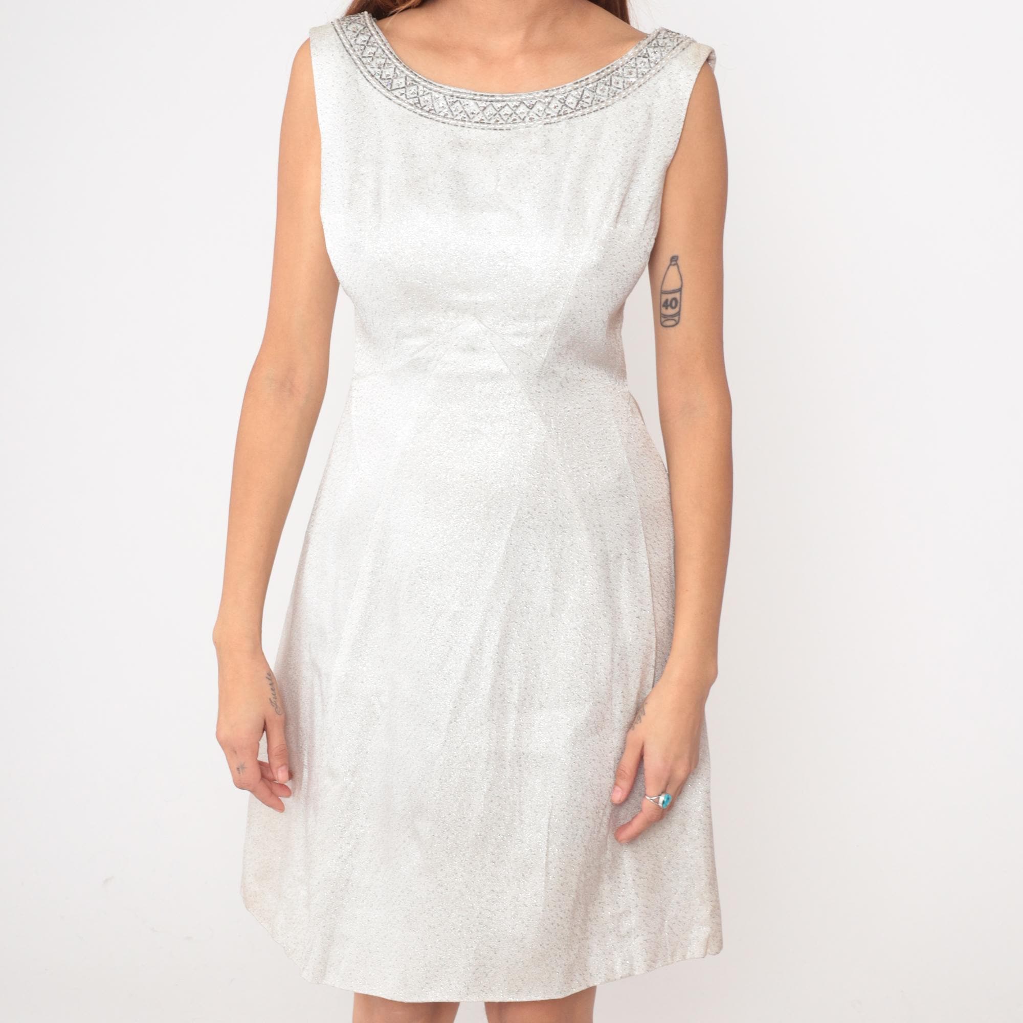 60s white metallic dress from Jean Allen with geometric beaded trim framing the scoop neckline and open back cutout. Sleeveless A-line silhouette with back zipper closure. Metallic blend fabric throughout.