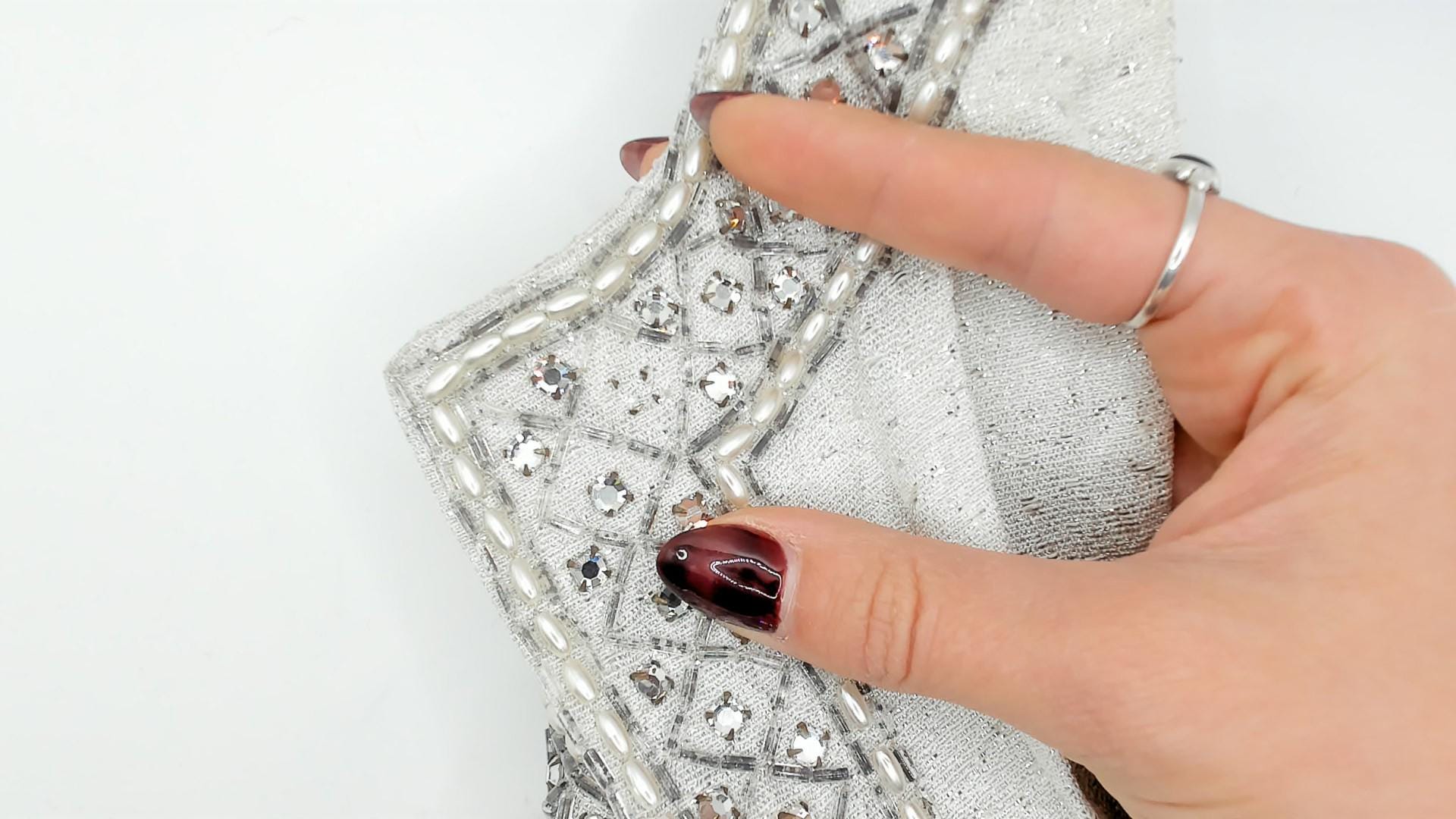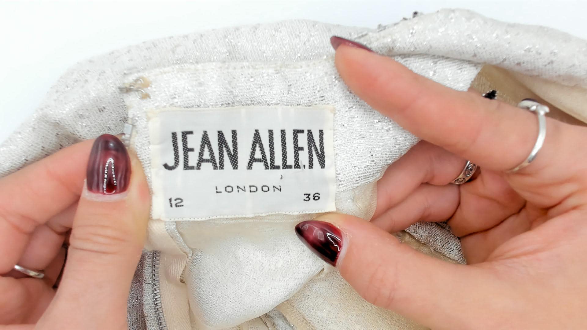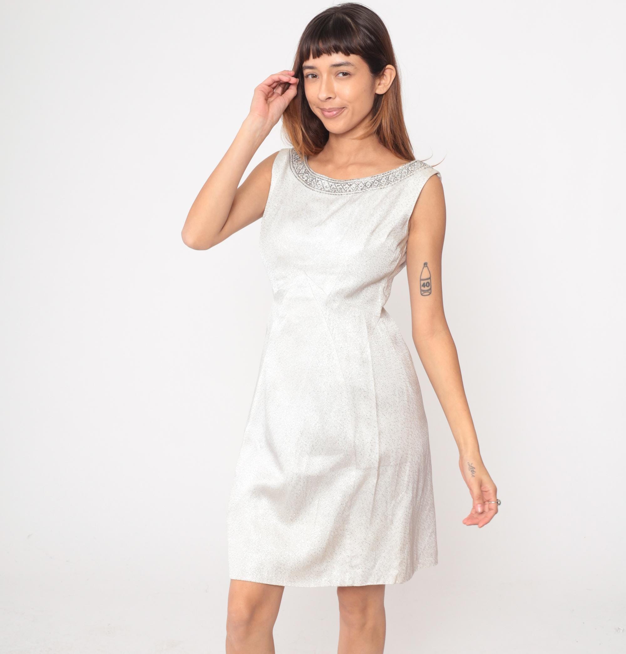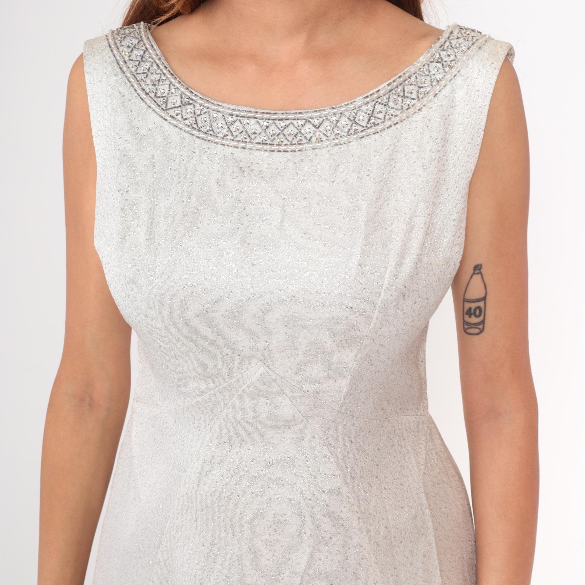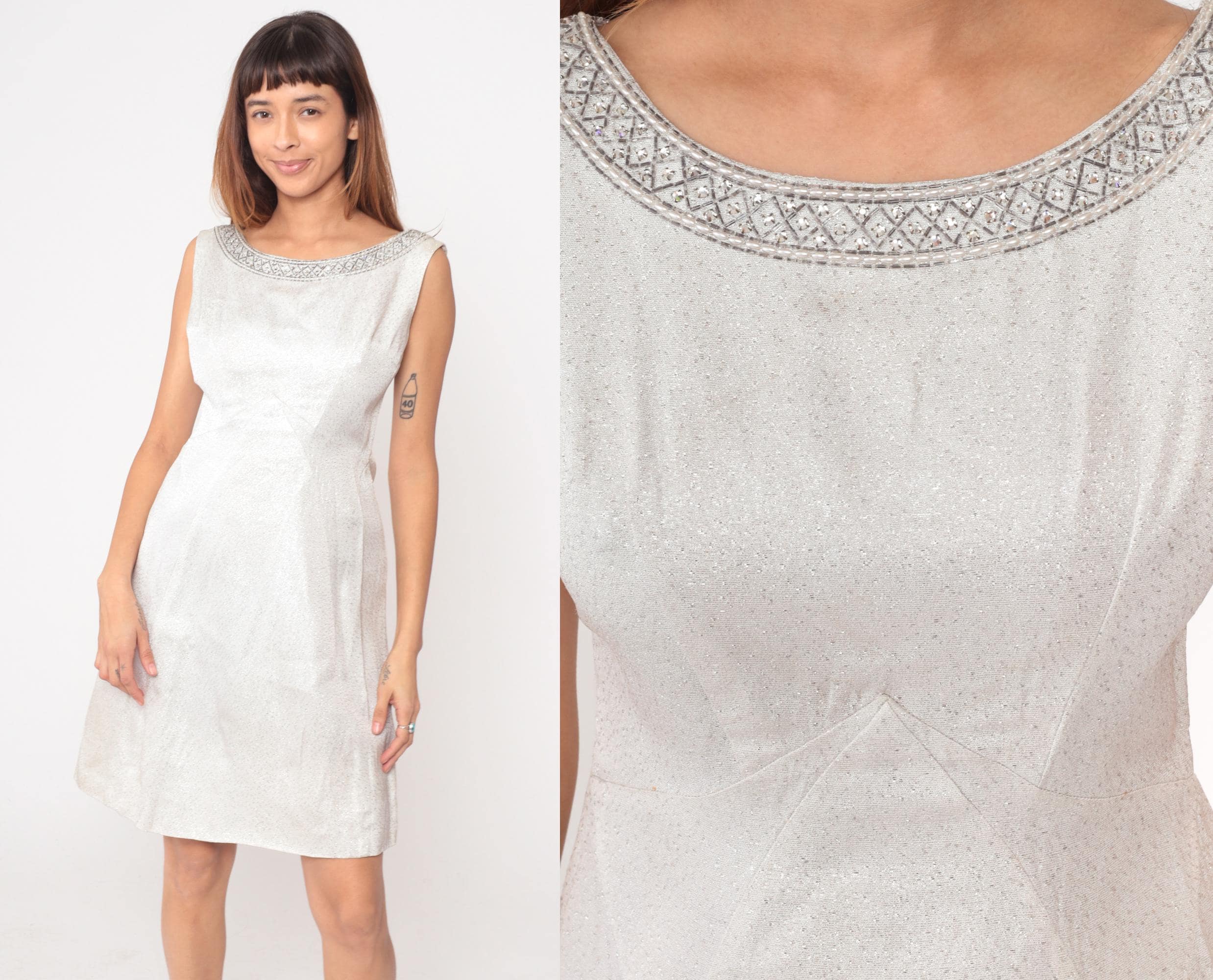 60s white metallic dress from Jean Allen with geometric beaded trim framing the scoop neckline and open back cutout. Sleeveless A-line silhouette with back zipper closure. Metallic blend fabric throughout.