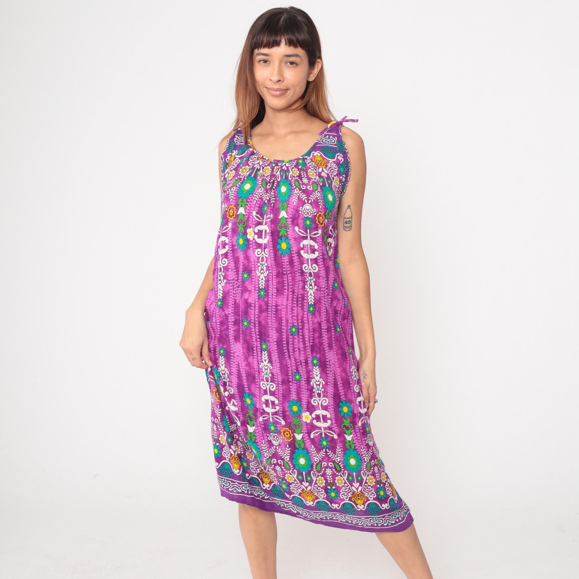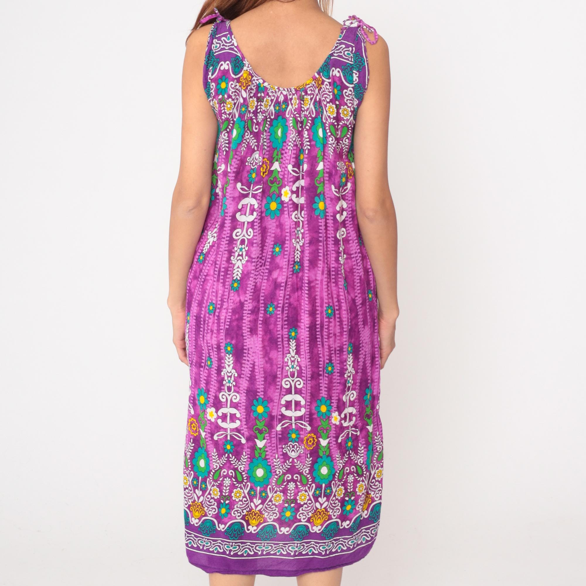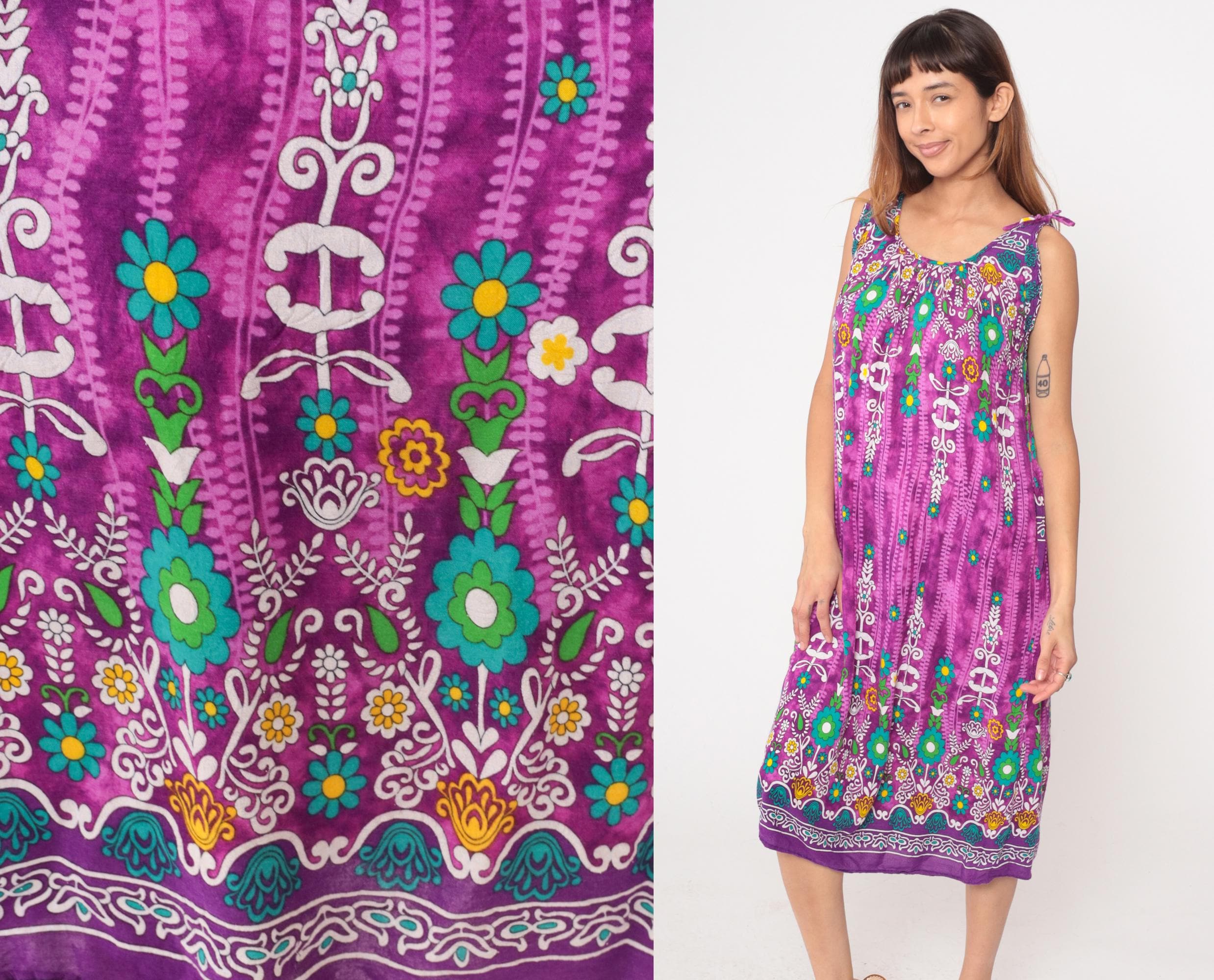 Y2k purple maxi dress from Vanee with multicolored floral and geometric border print design. Sleeveless with tie shoulder straps and scoop neckline, white embroidered-style motifs with teal, green, yellow, and orange floral details concentrated at yoke and hem. Vertical decorative striping down body with scattered flowers throughout.