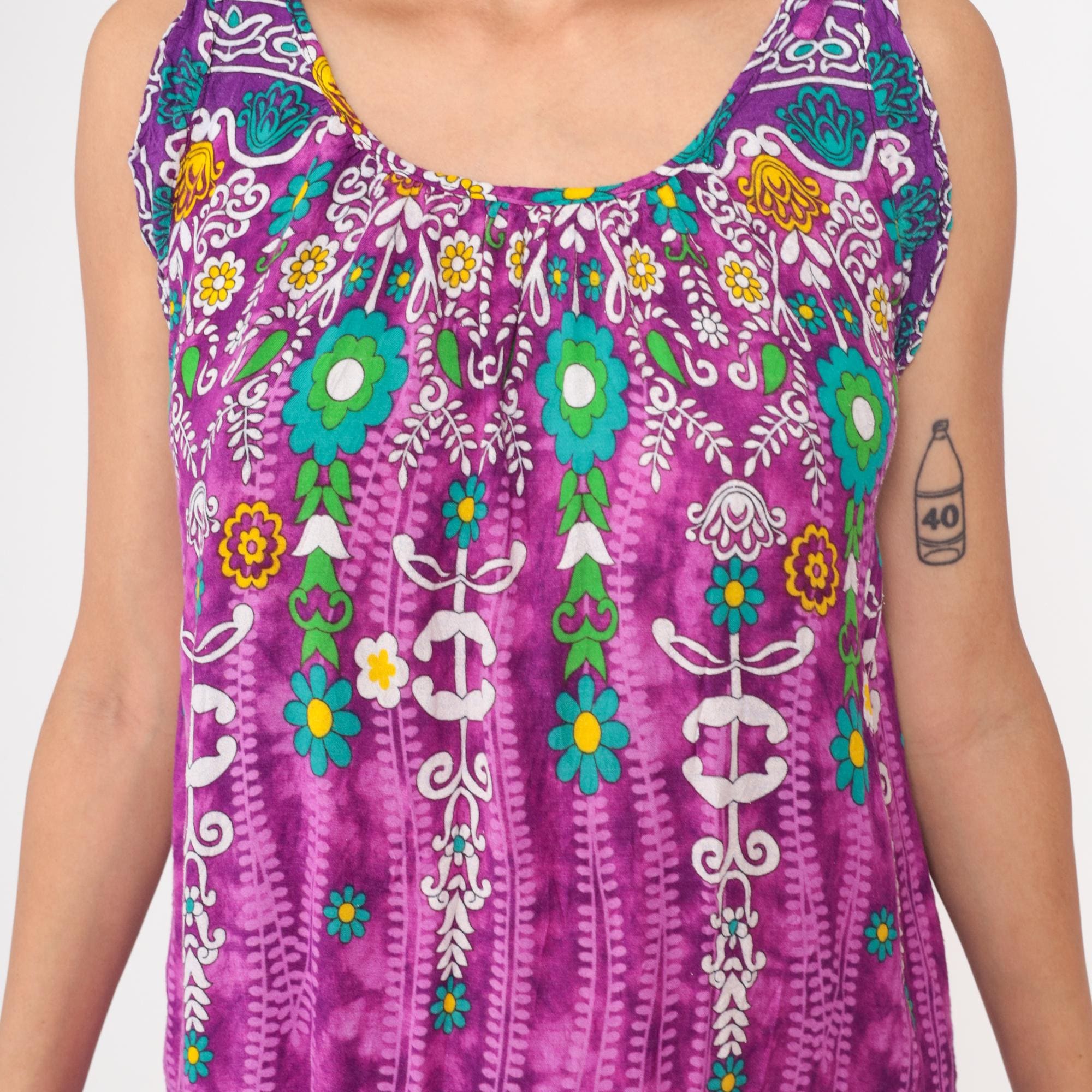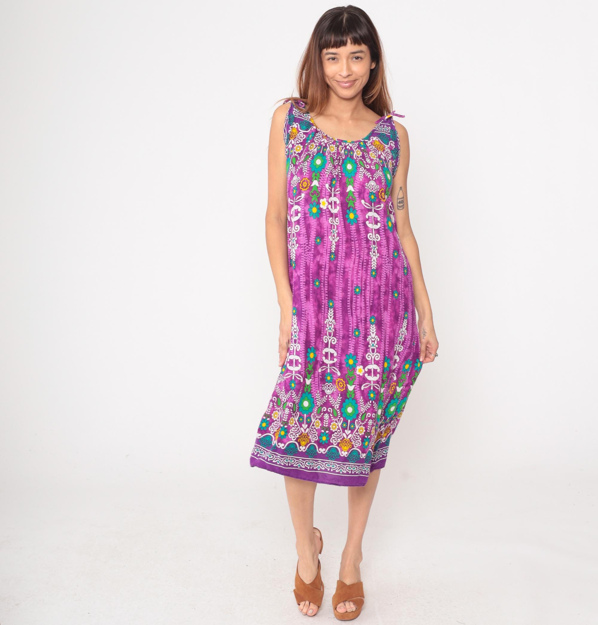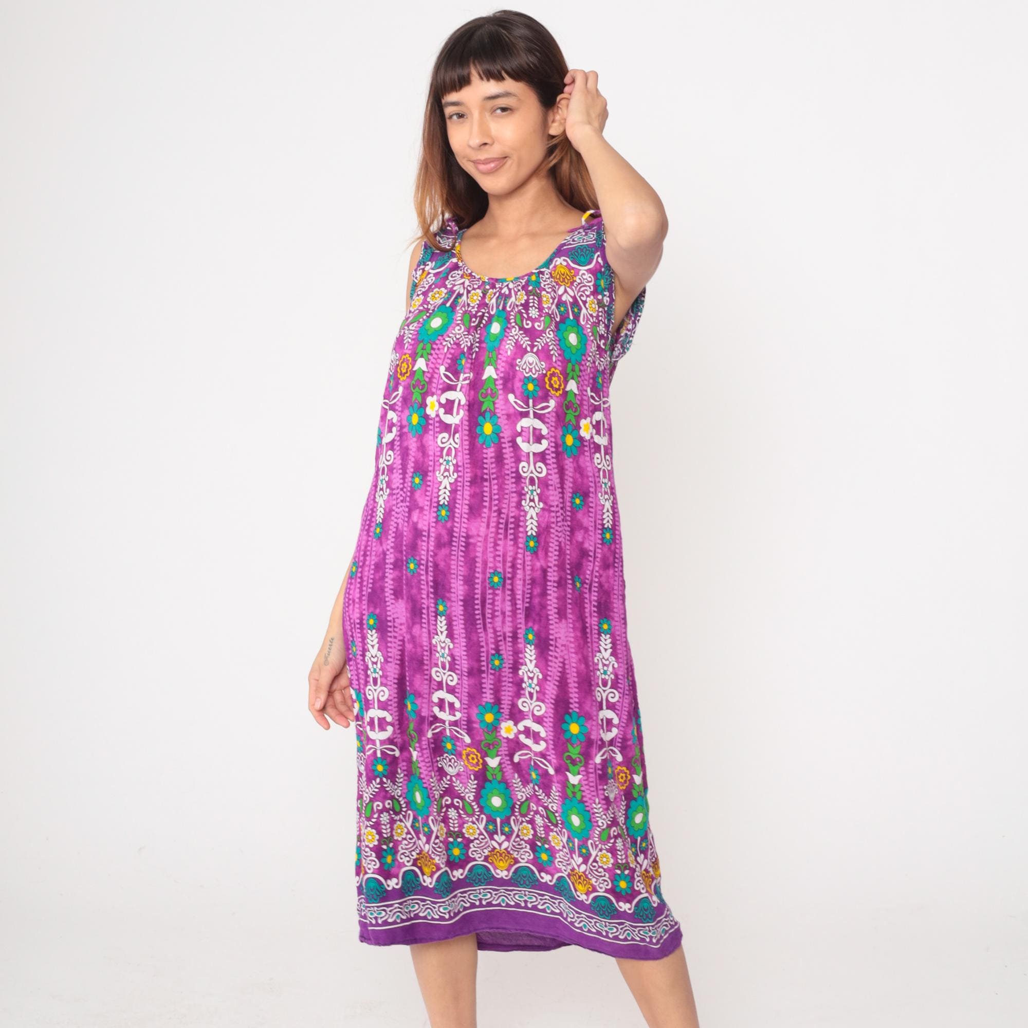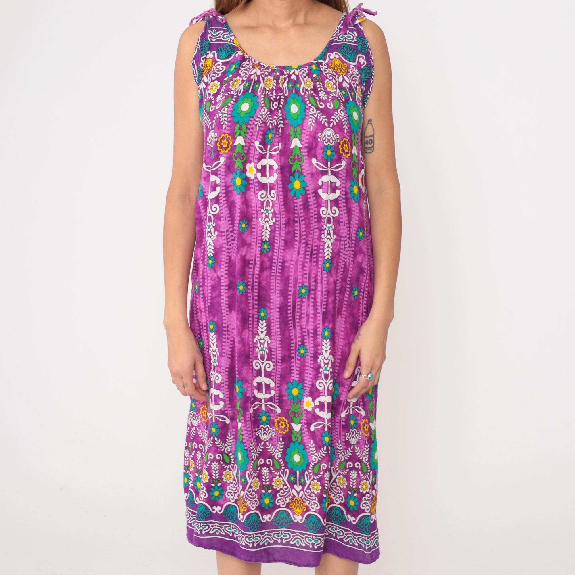 Y2k purple maxi dress from Vanee with multicolored floral and geometric border print design. Sleeveless with tie shoulder straps and scoop neckline, white embroidered-style motifs with teal, green, yellow, and orange floral details concentrated at yoke and hem. Vertical decorative striping down body with scattered flowers throughout.