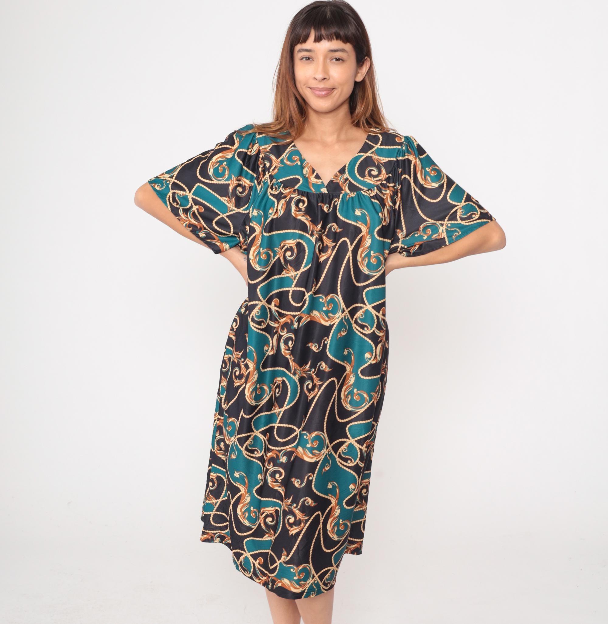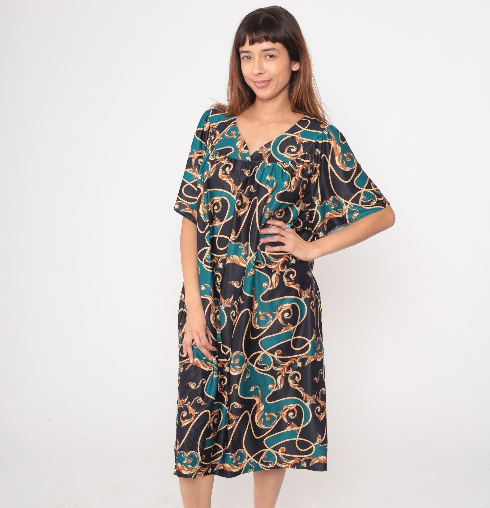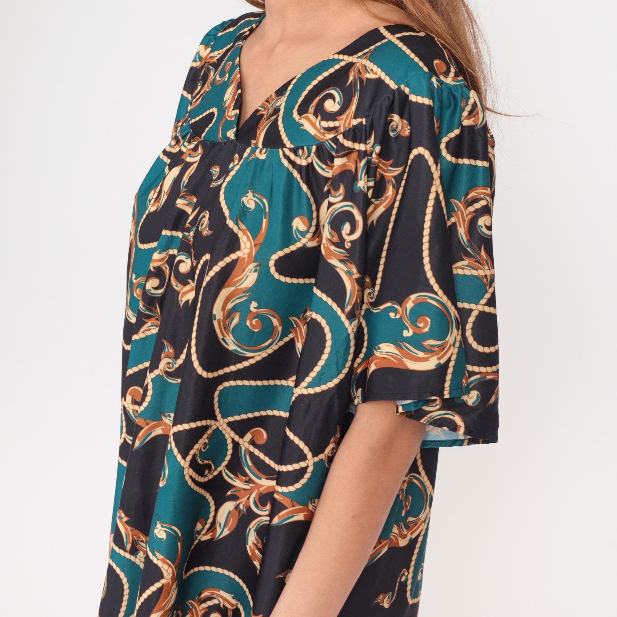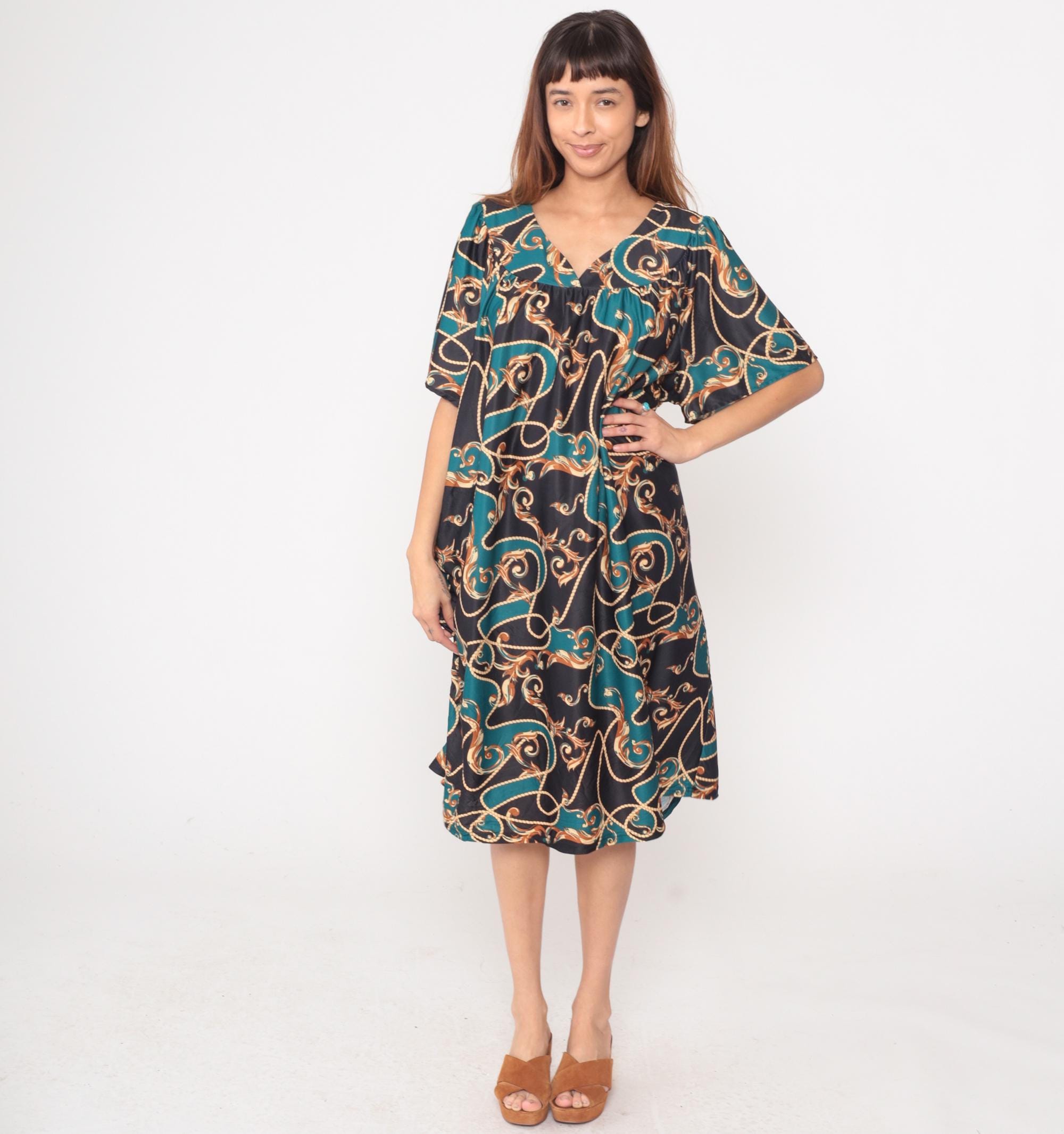 Y2K black and teal dress from Anthony Richards with ornate baroque scroll print in gold and tan throughout. V-neckline, short kimono-style sleeves, relaxed fit.
