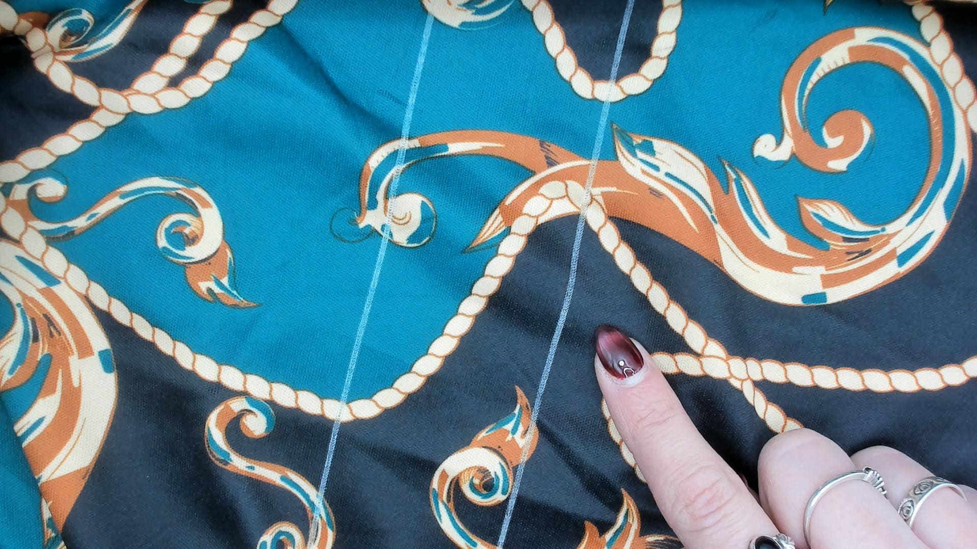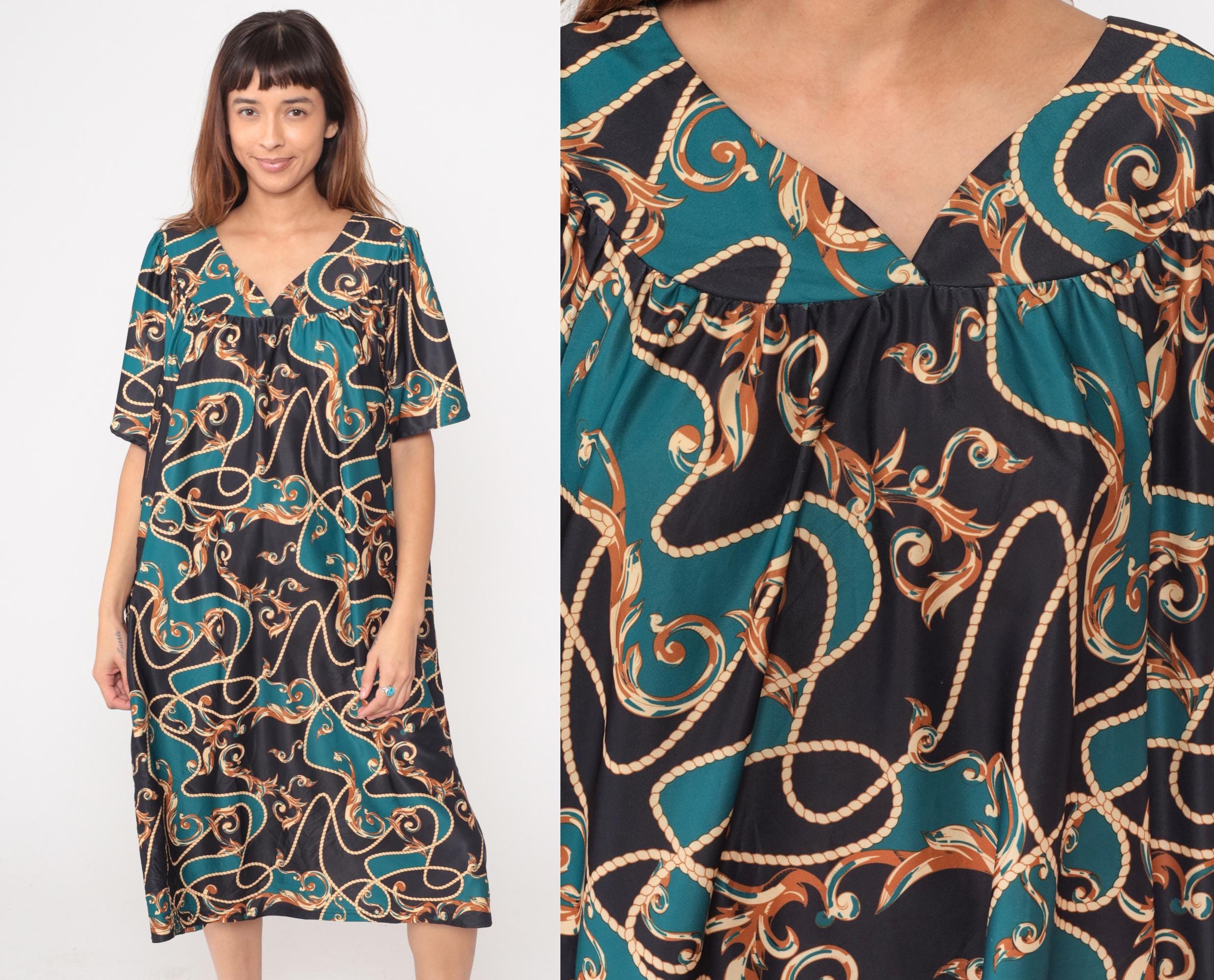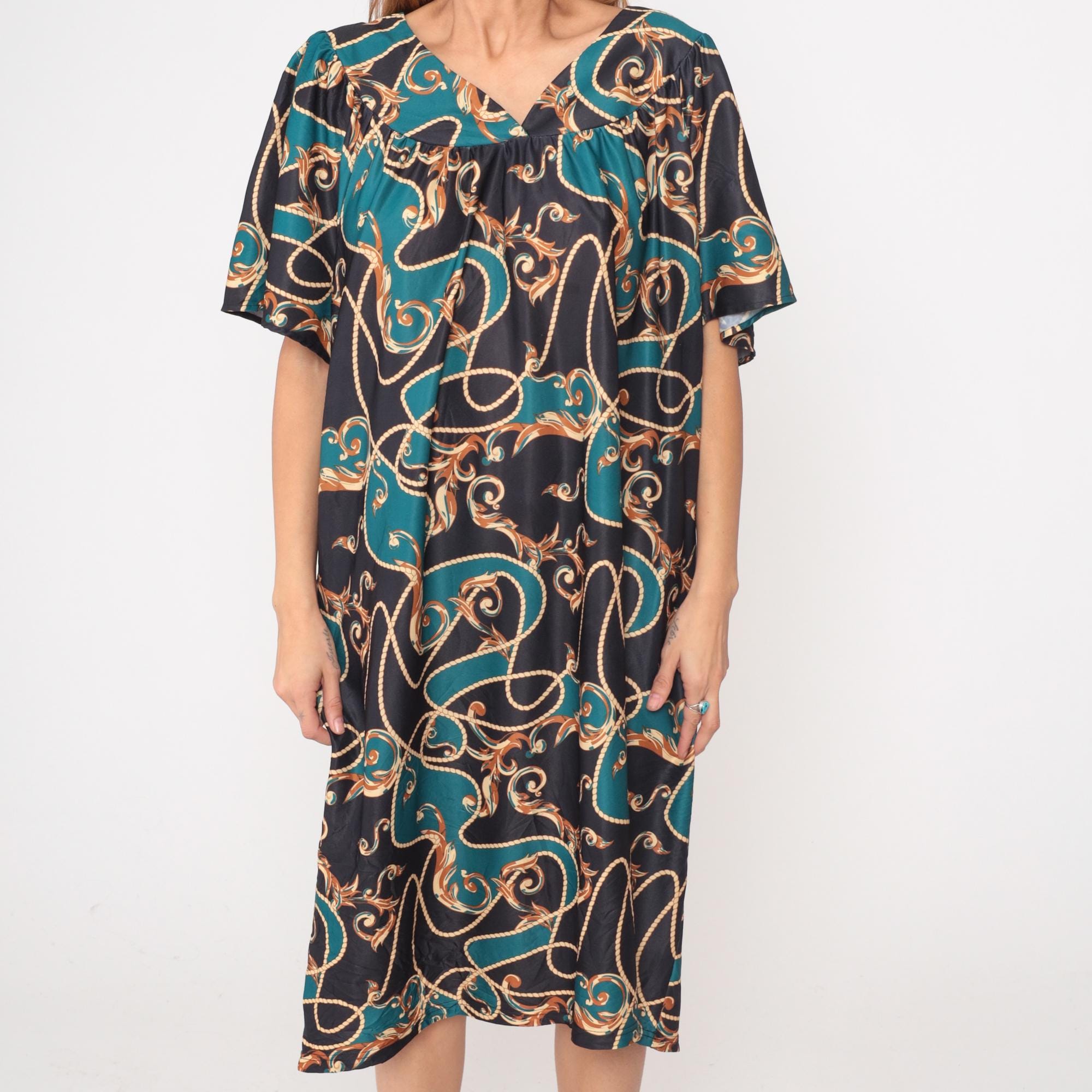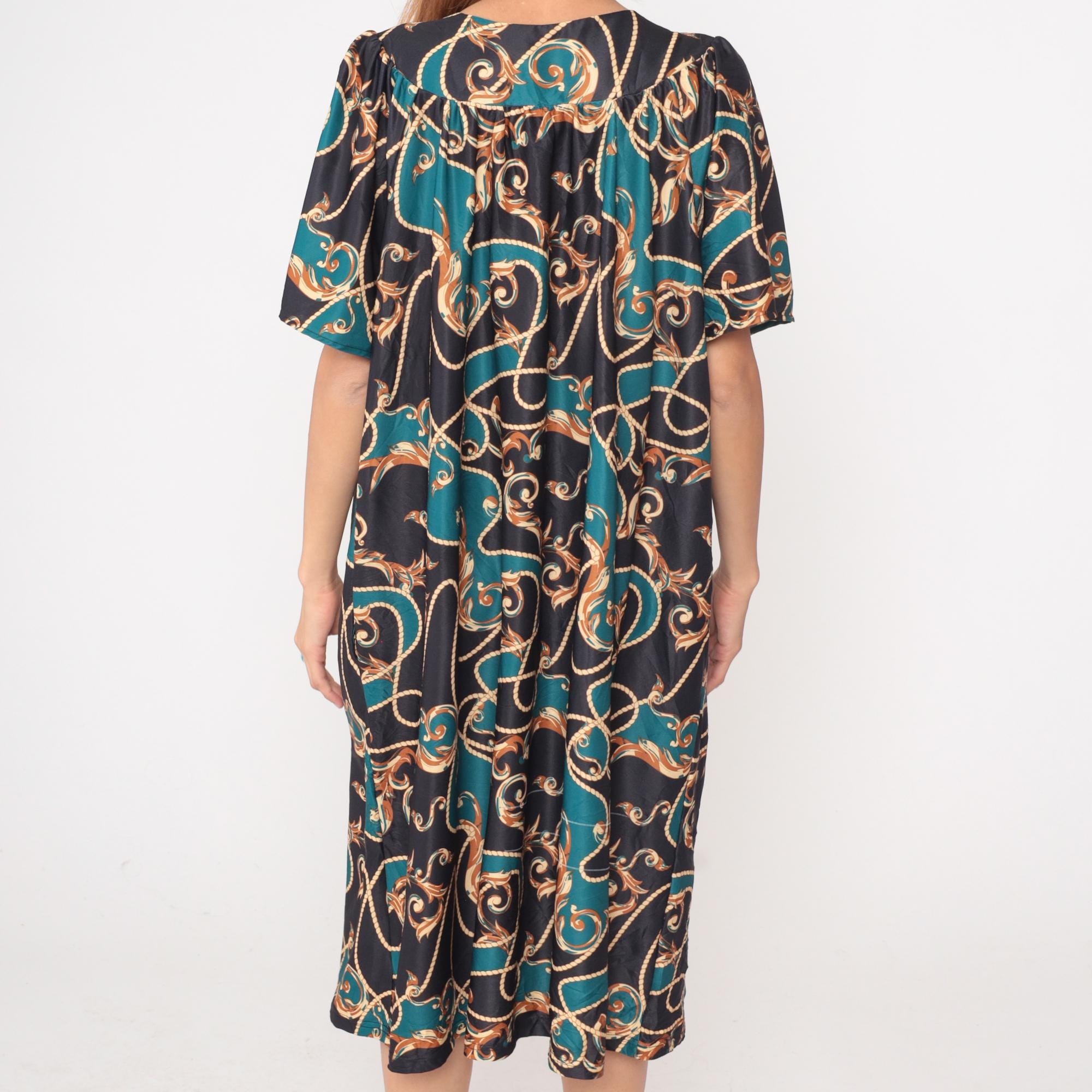 Y2K black and teal dress from Anthony Richards with ornate baroque scroll print in gold and tan throughout. V-neckline, short kimono-style sleeves, relaxed fit.