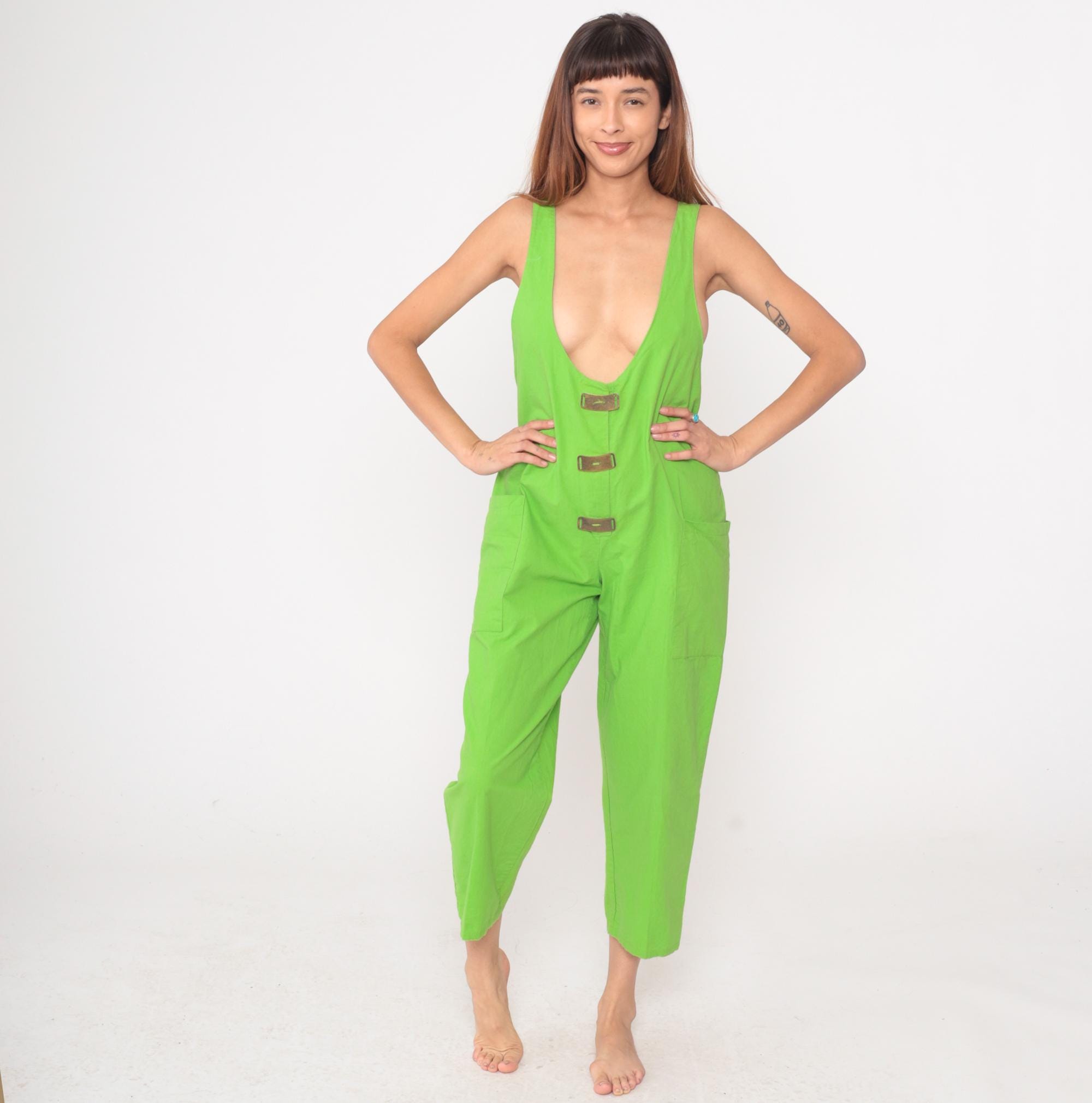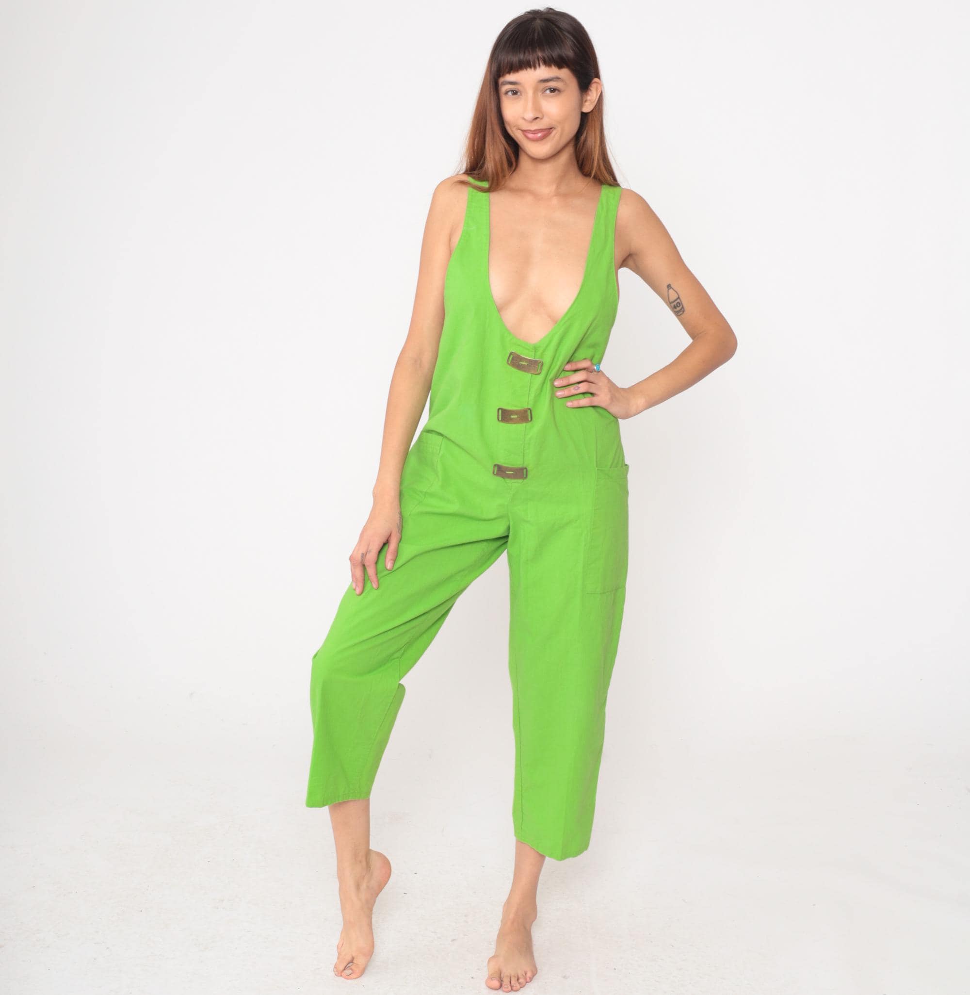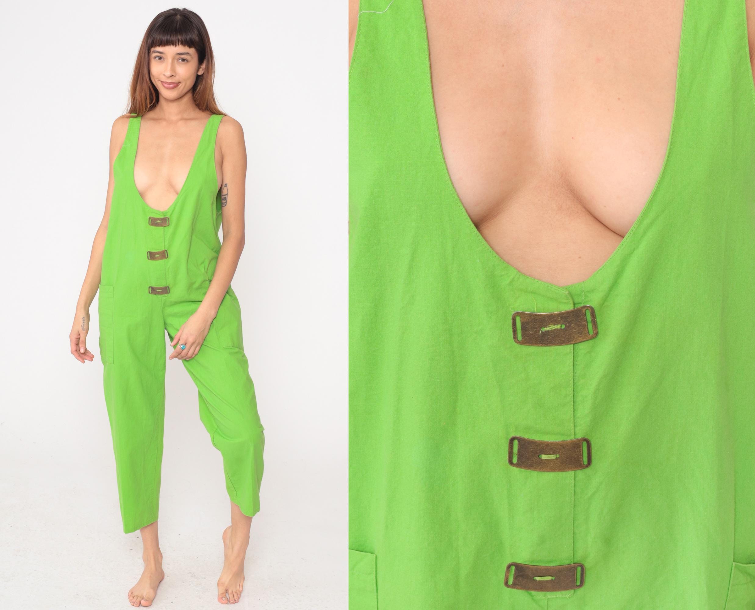 80s neon green jumpsuit from Ginger with deep scoop V-neckline in front and back. Sleeveless tank style with three brown decorative tab closures down the center front, relaxed fit through the body, and cropped ankle-length pants with side pockets.