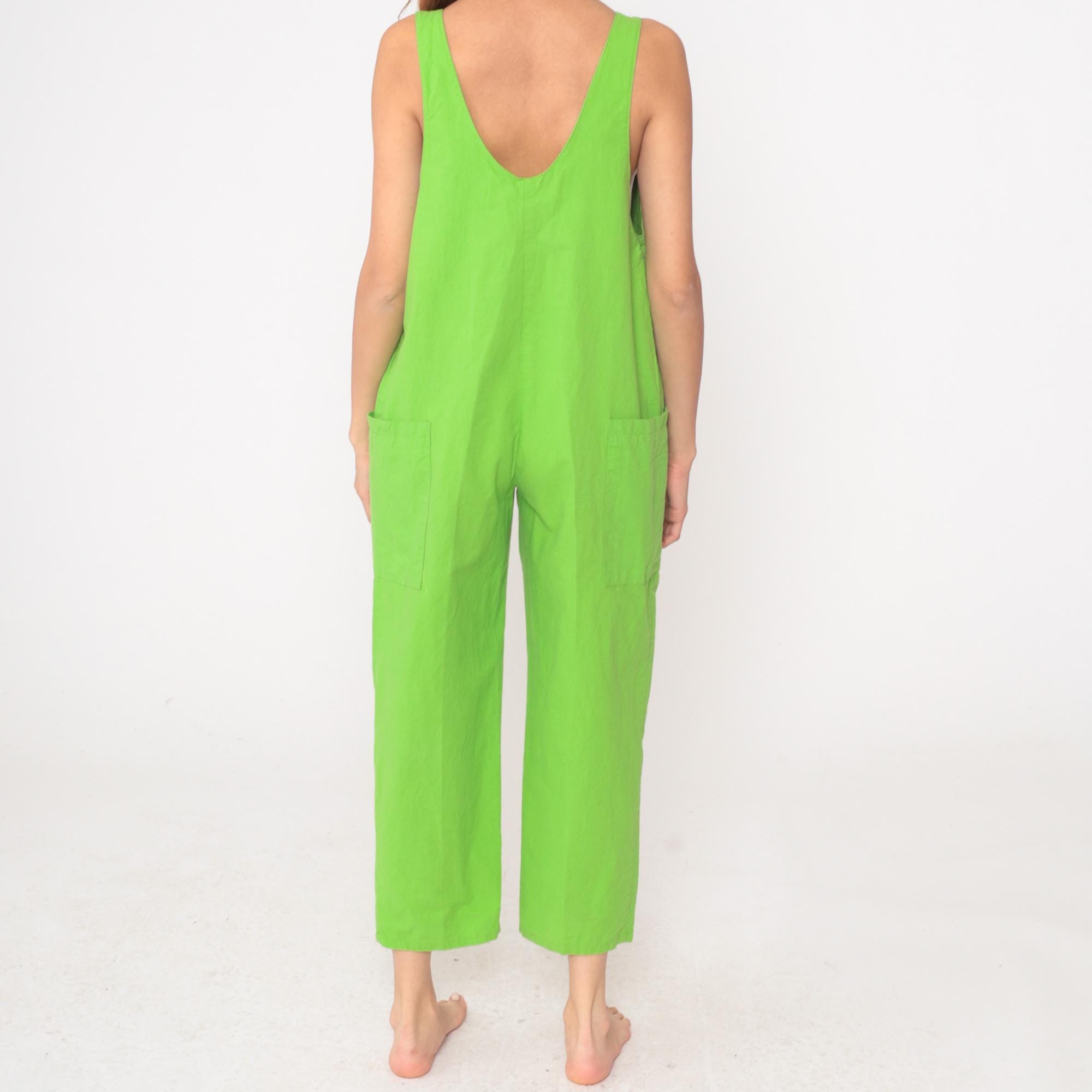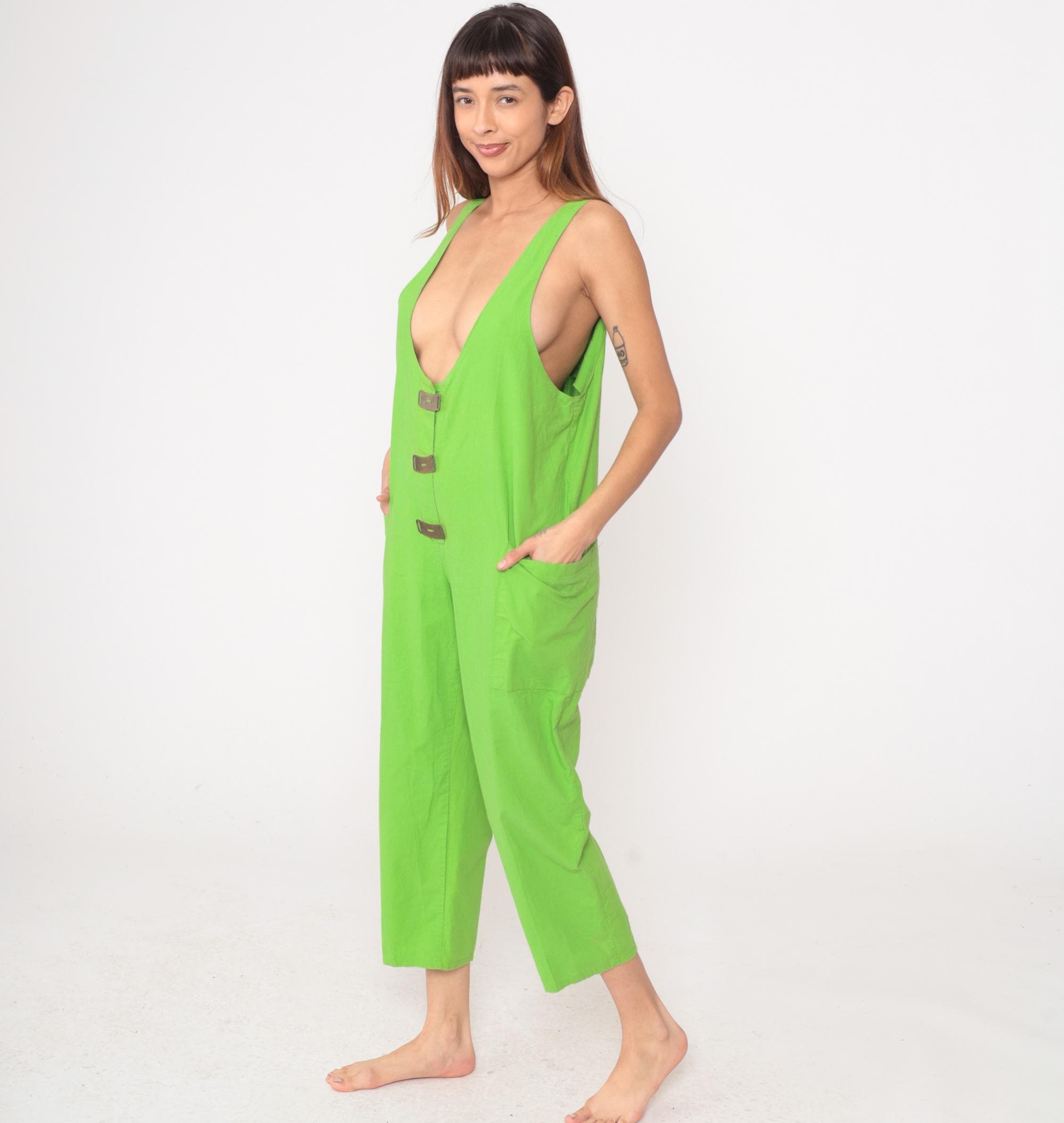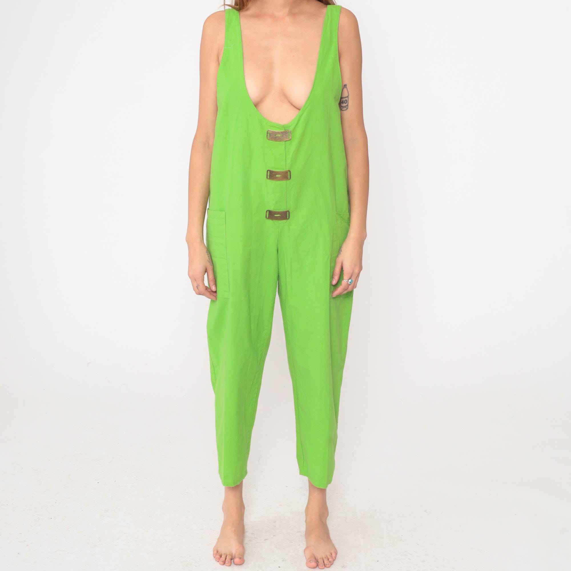 80s neon green jumpsuit from Ginger with deep scoop V-neckline in front and back. Sleeveless tank style with three brown decorative tab closures down the center front, relaxed fit through the body, and cropped ankle-length pants with side pockets.