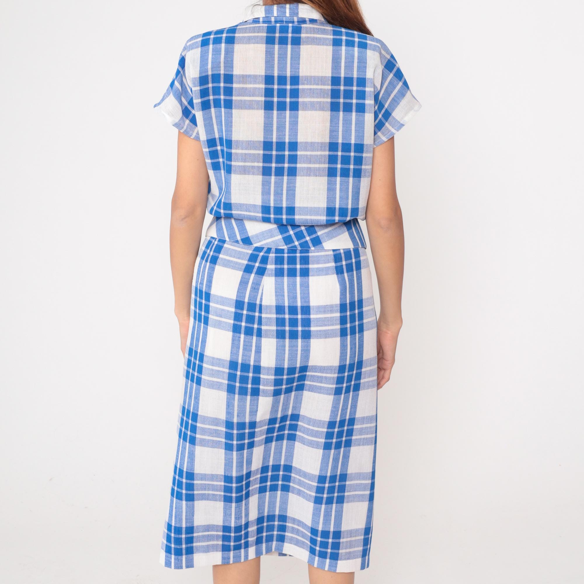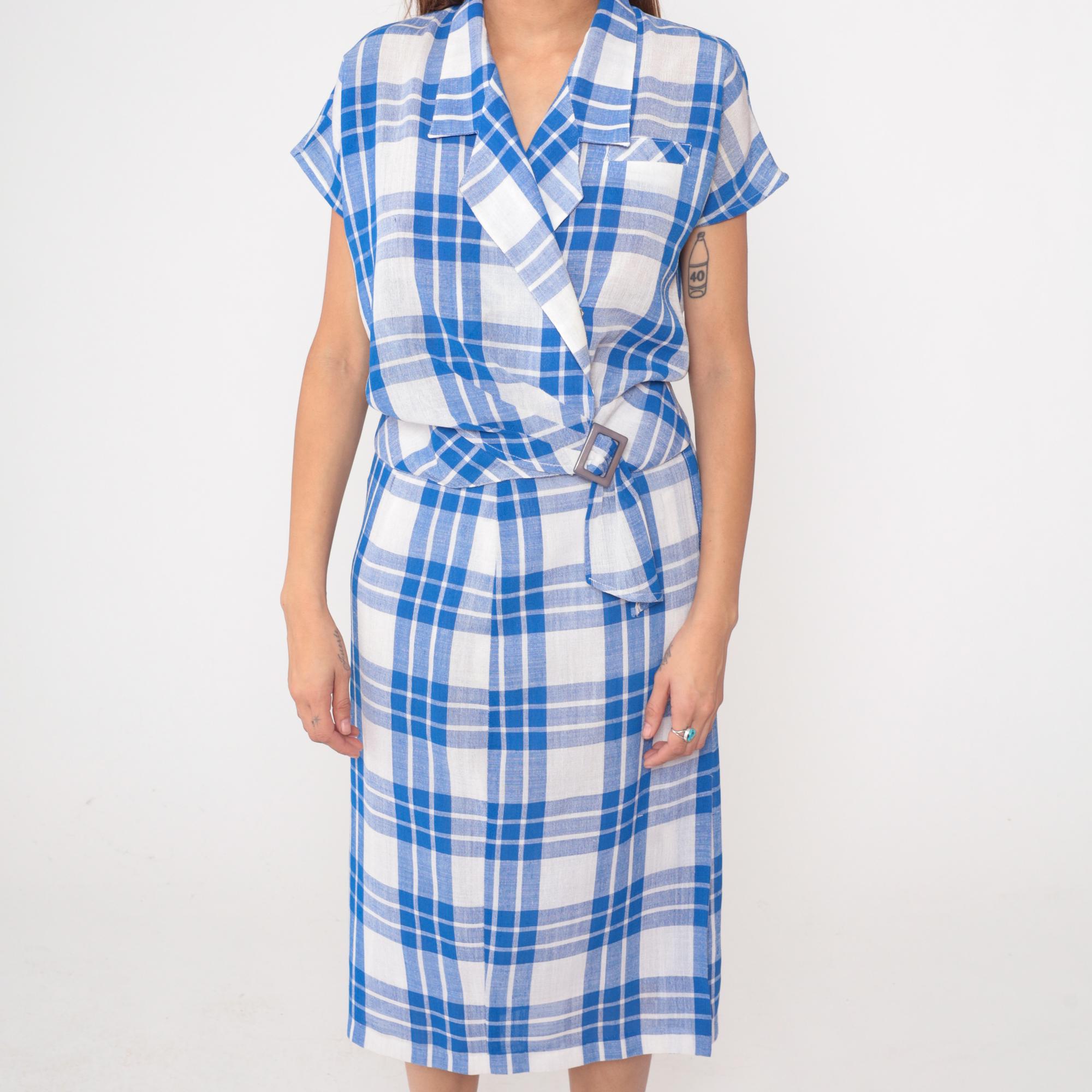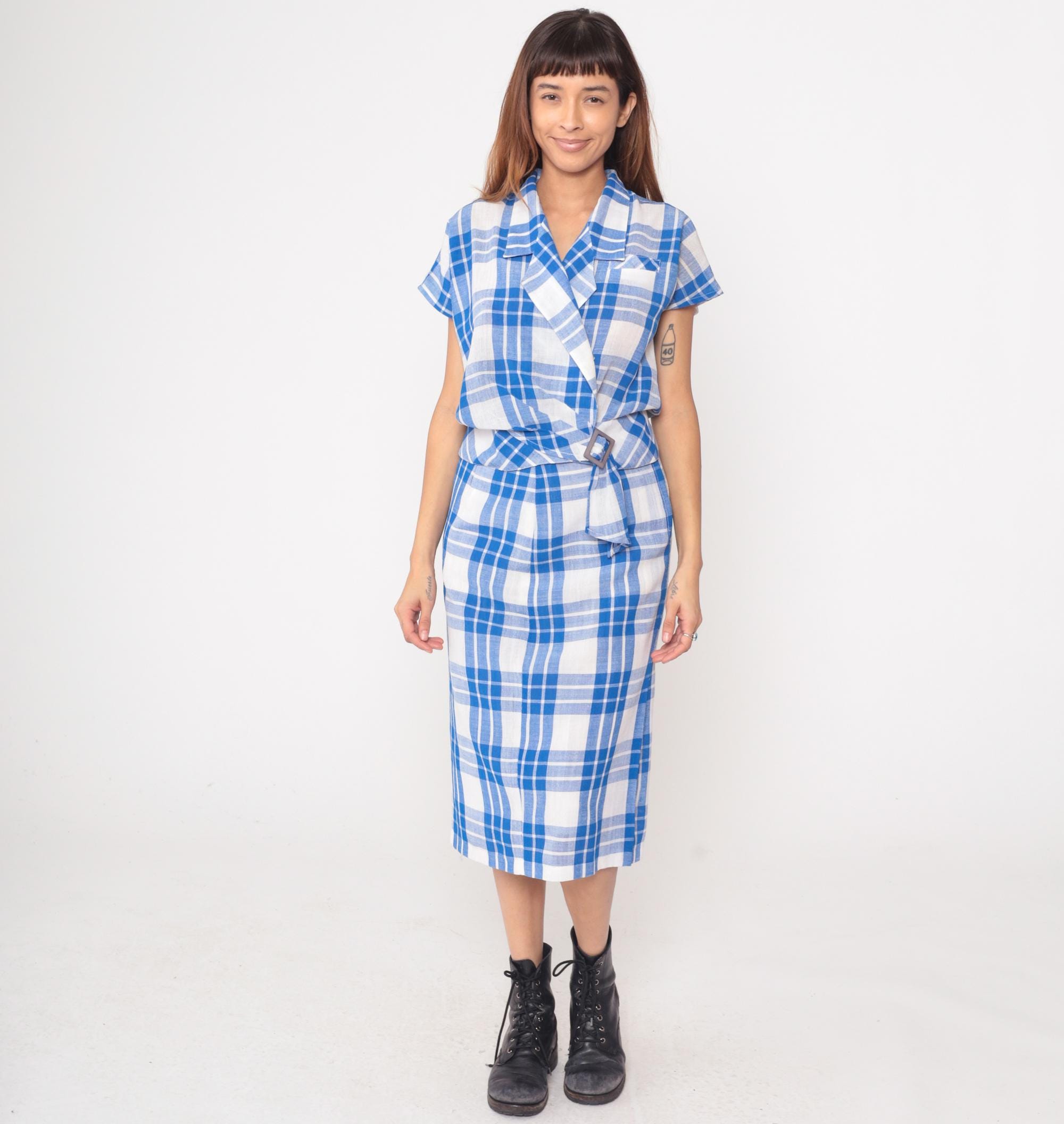 80s blue and white plaid two piece set with wrap-style short sleeve top and midi skirt. Top has notched collar, chest pocket, and tie waist closure. Matching skirt with same plaid pattern throughout.