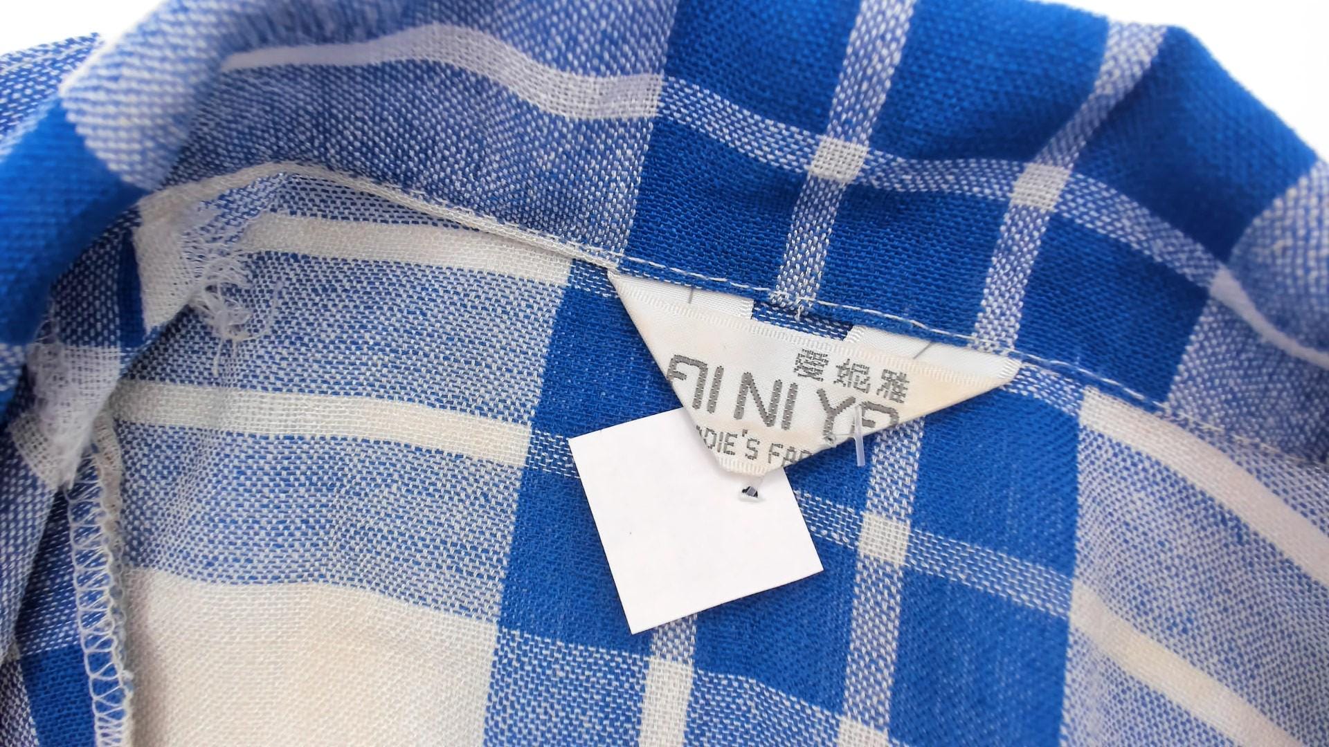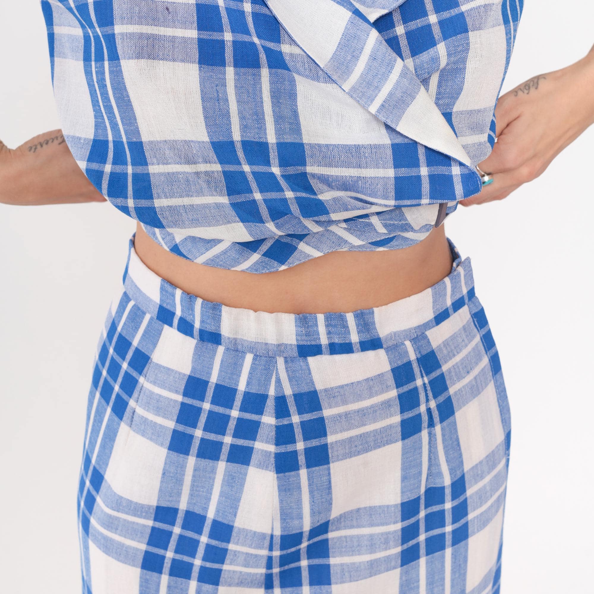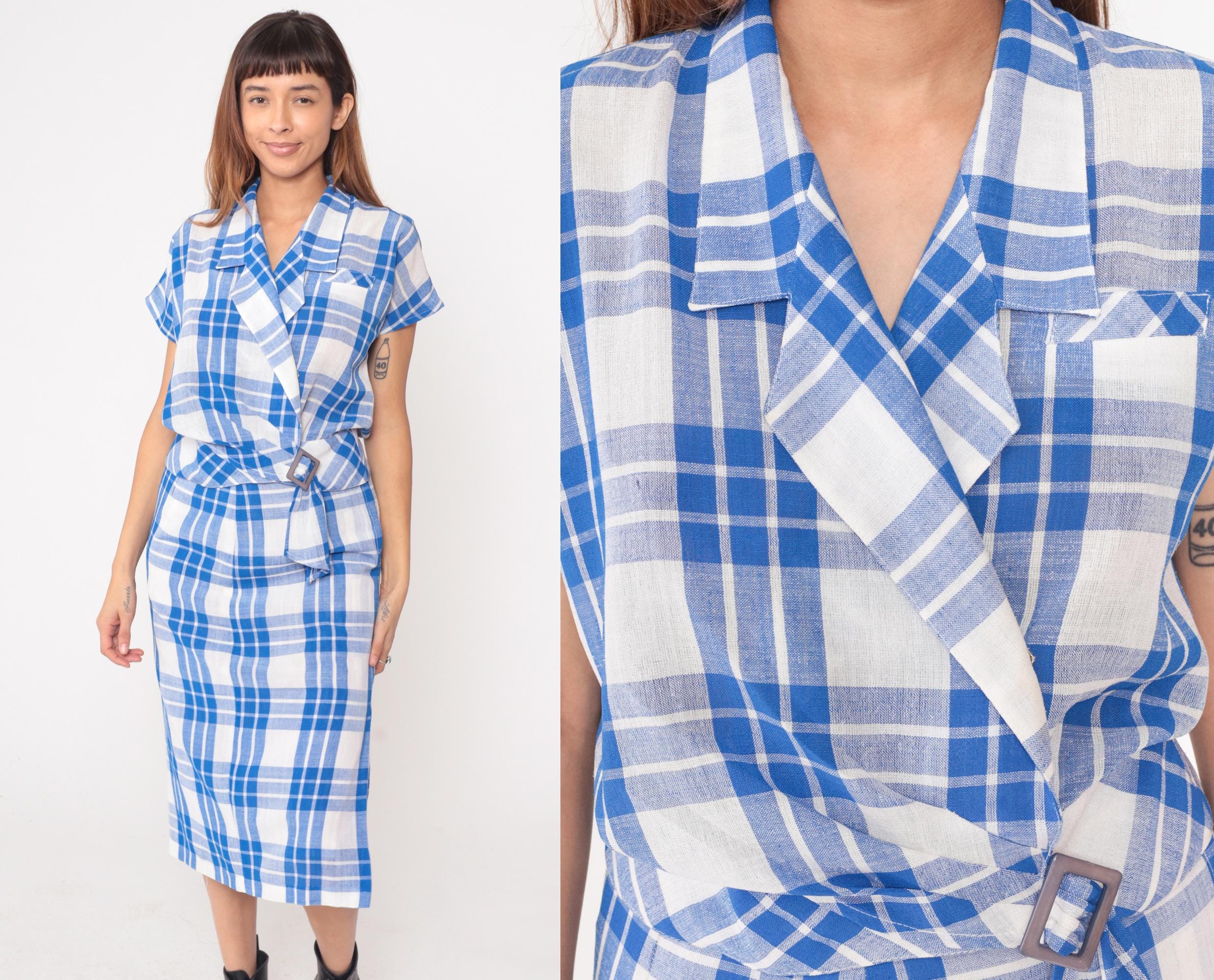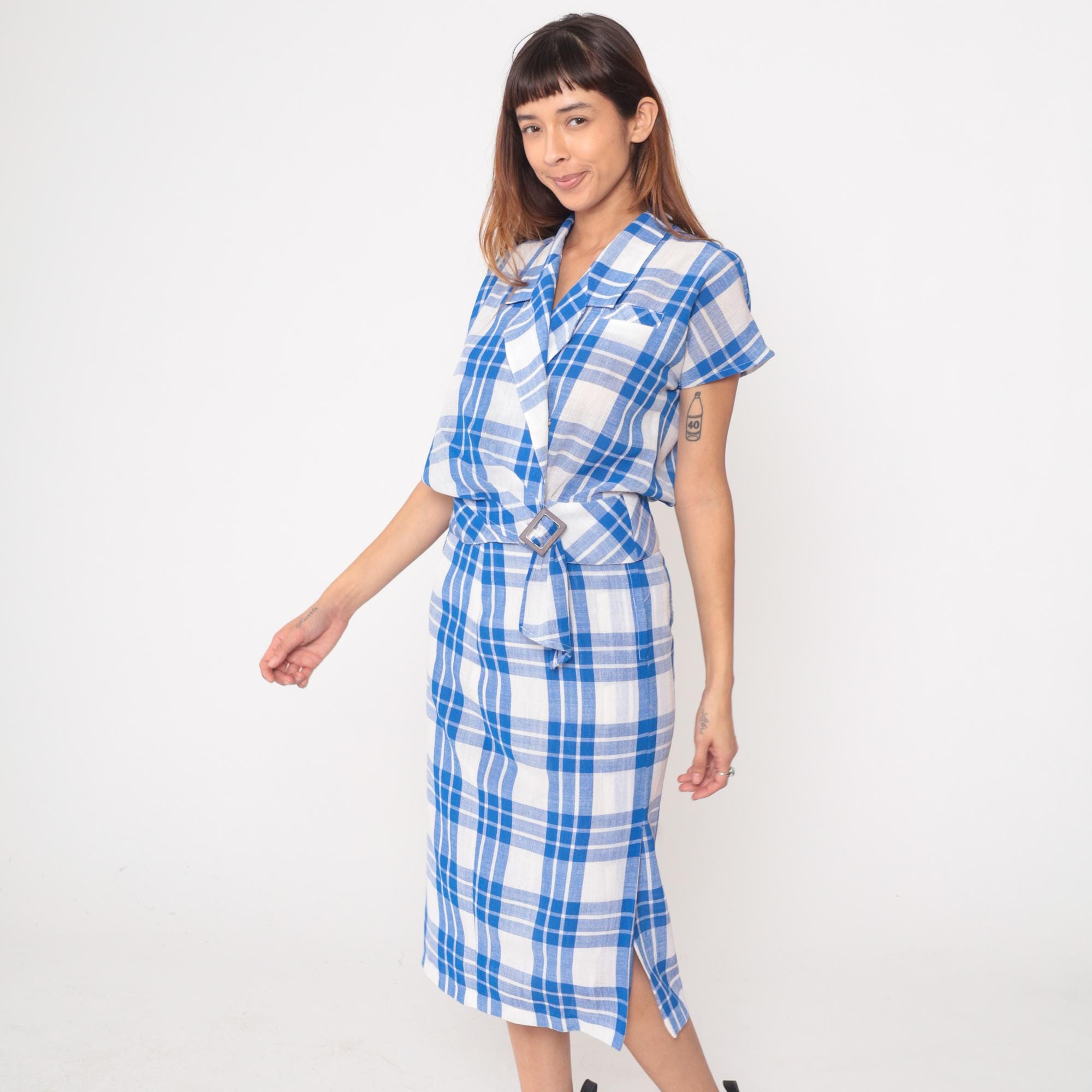 80s blue and white plaid two piece set with wrap-style short sleeve top and midi skirt. Top has notched collar, chest pocket, and tie waist closure. Matching skirt with same plaid pattern throughout.