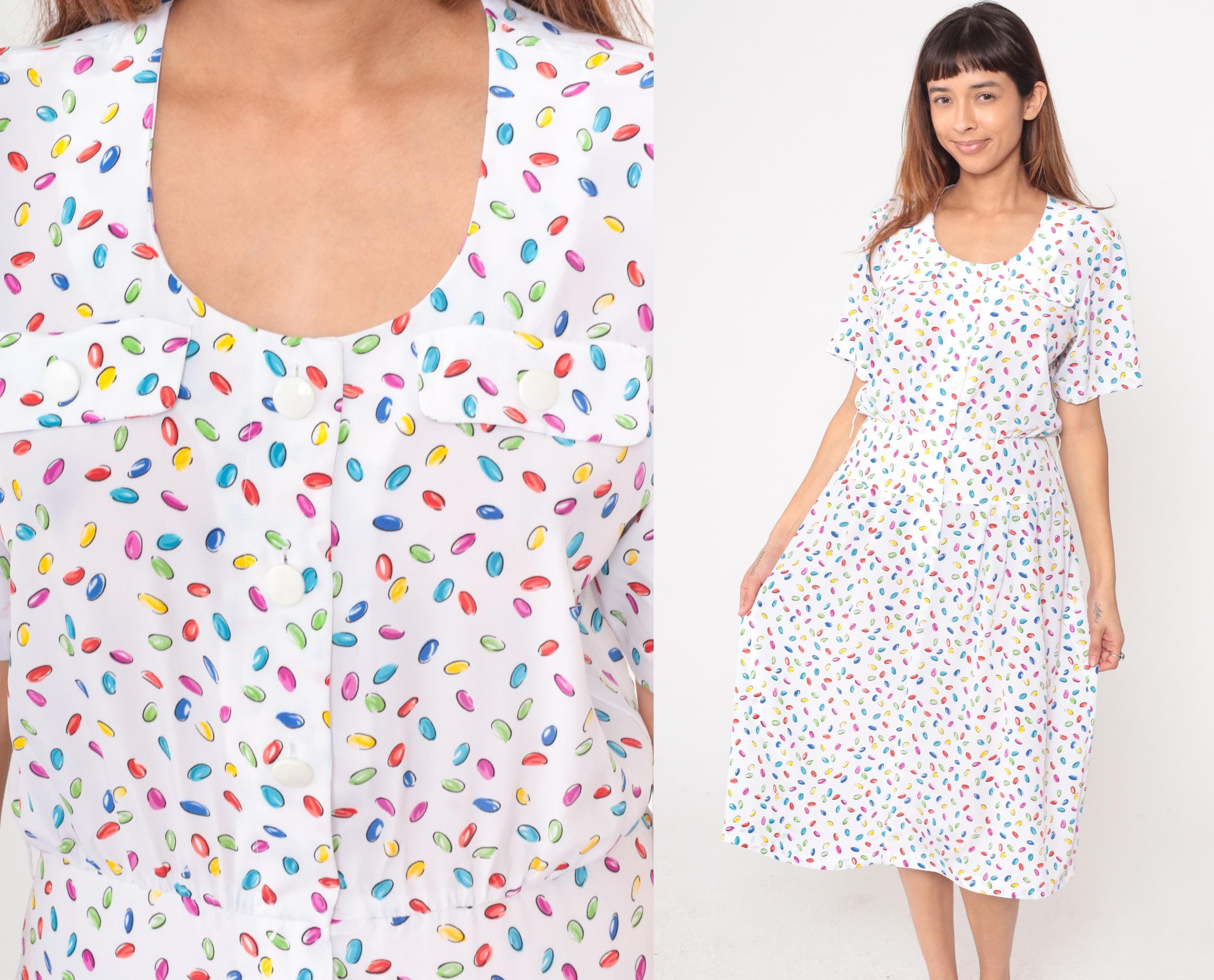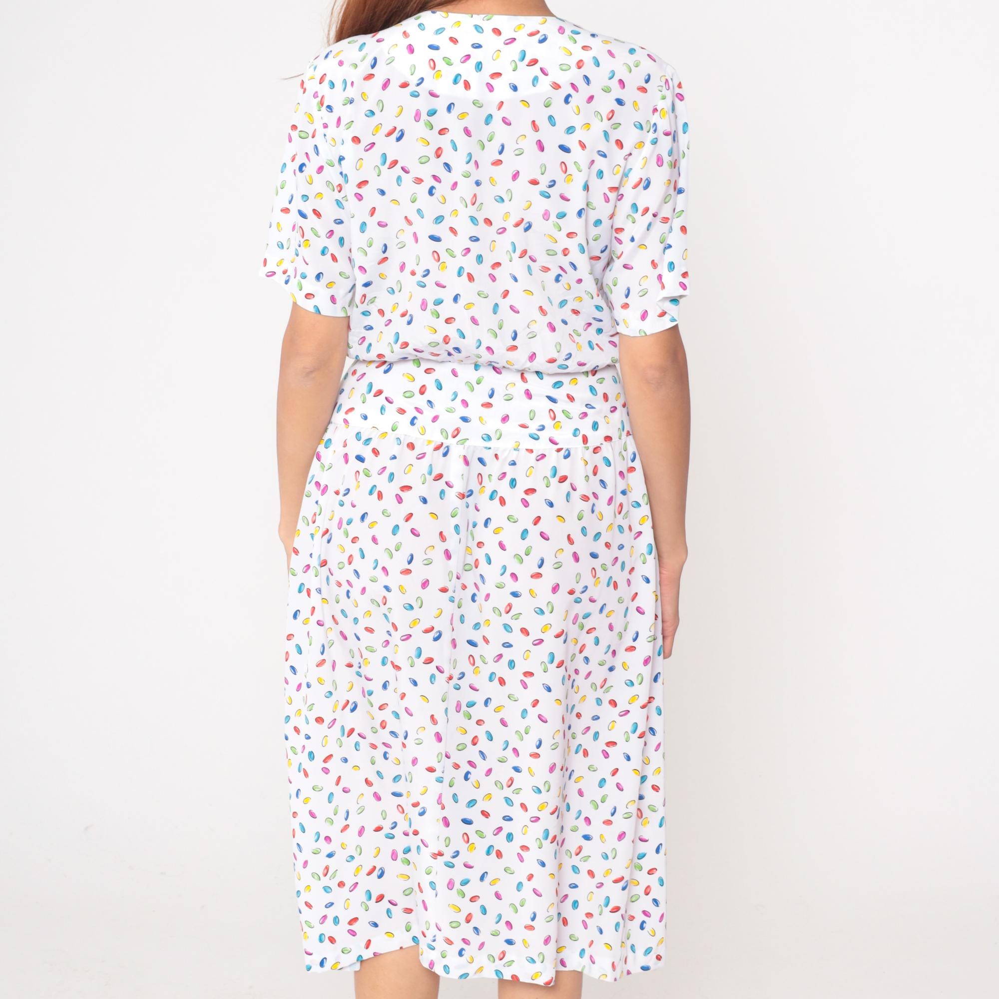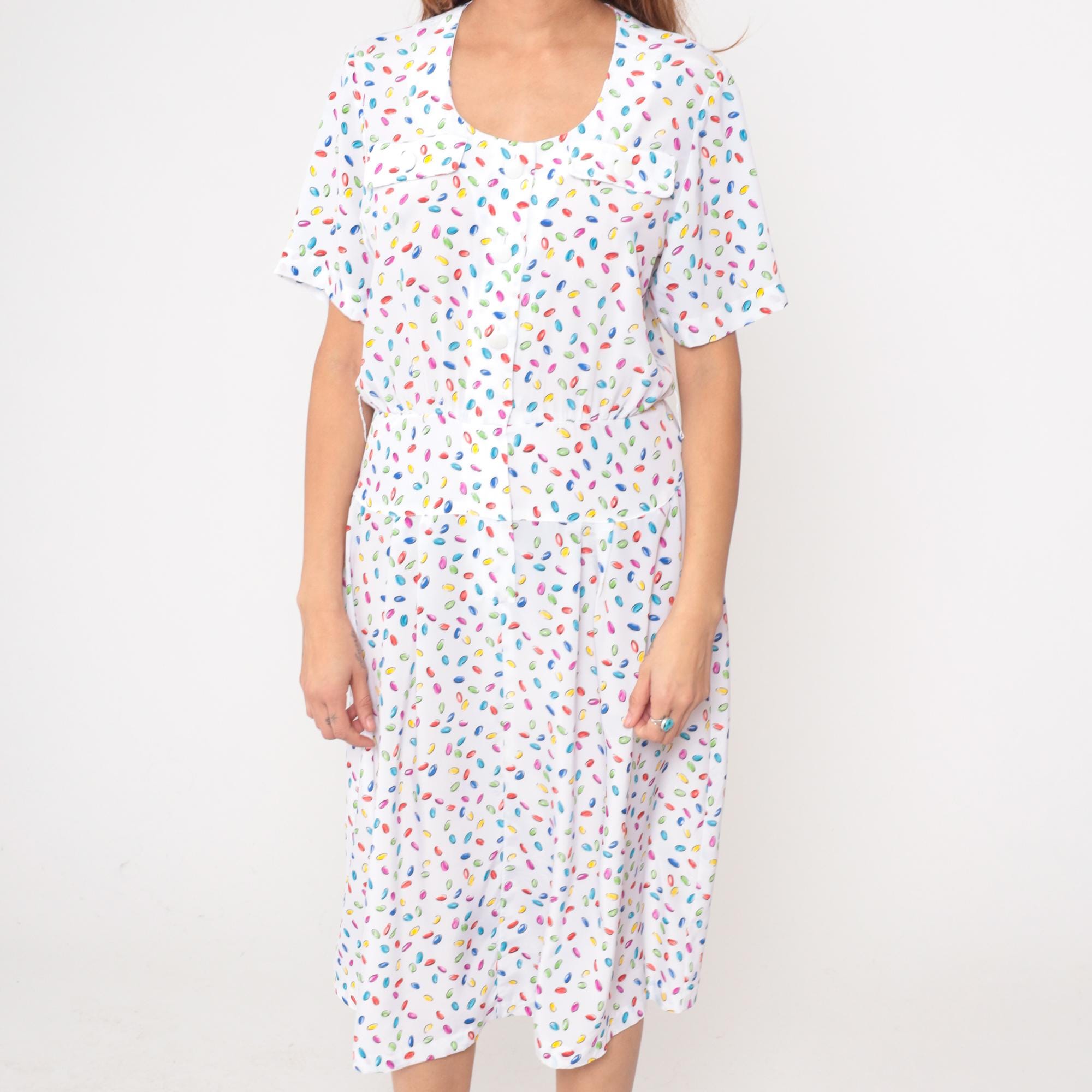 80s white dress from Liz Petites with multicolored confetti jelly beans print in pink, blue, yellow, green, red, and purple. Drop waist silhouette with blouson bodice, scoop neckline, short sleeves with turned cuffs. Knee-length skirt with side pockets.