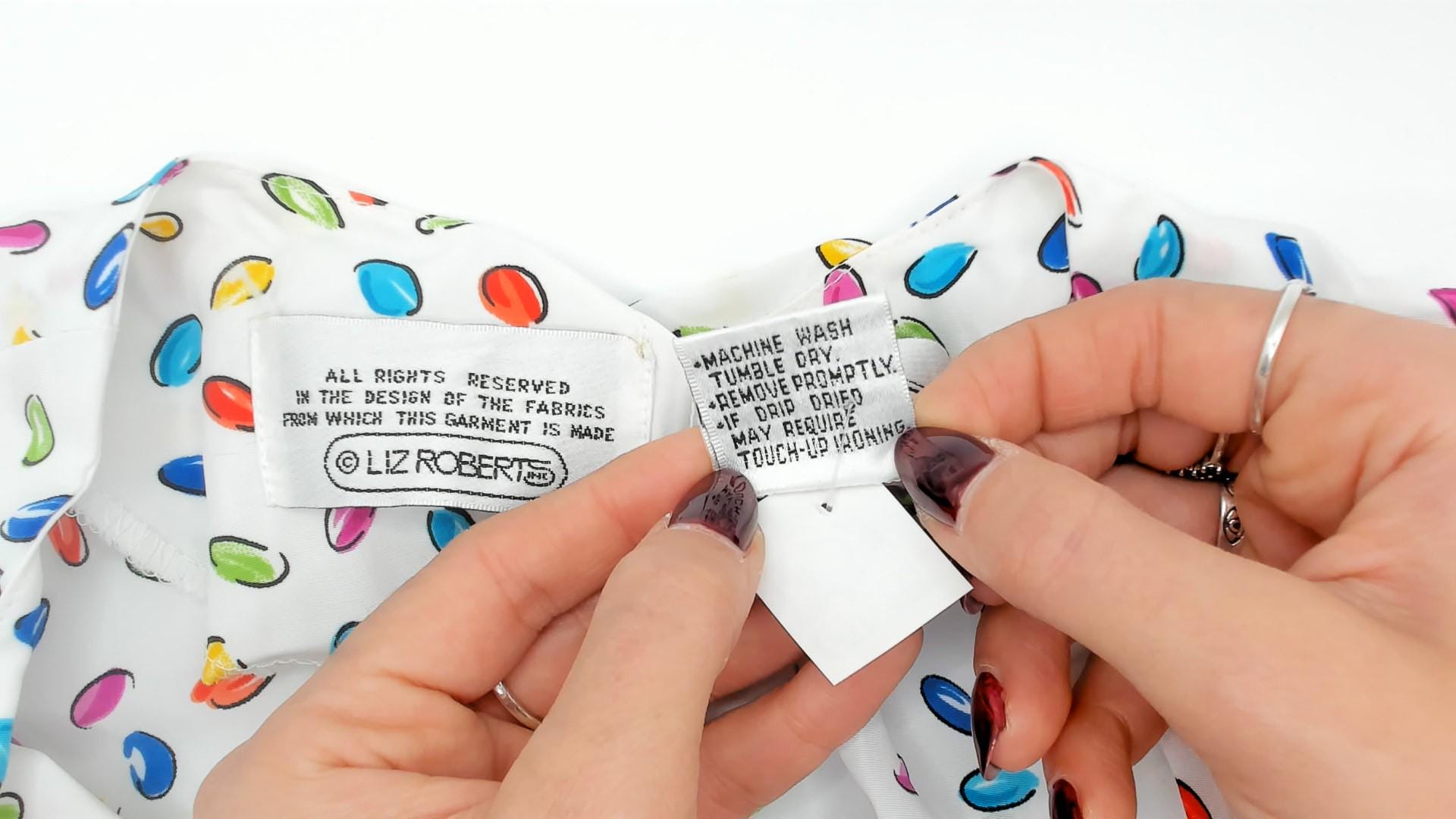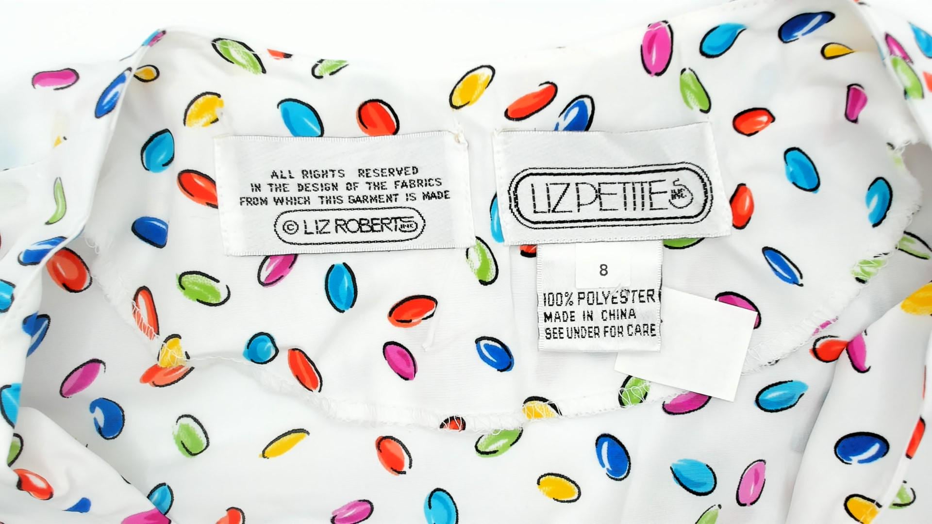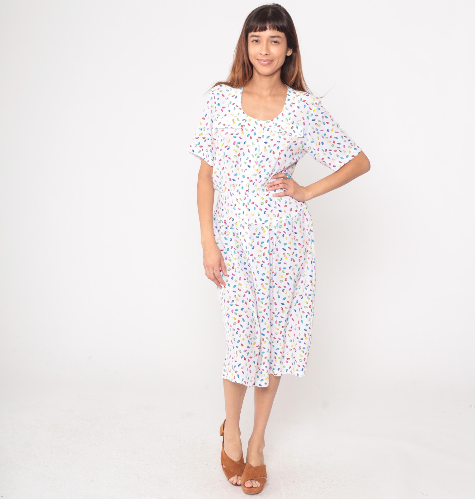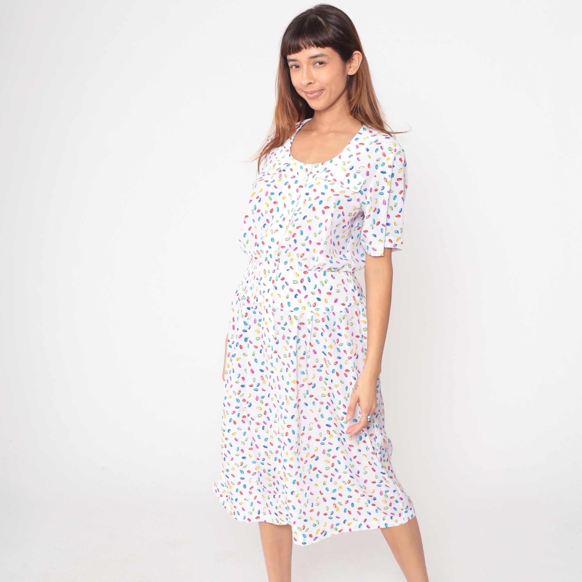 80s white dress from Liz Petites with multicolored confetti jelly beans print in pink, blue, yellow, green, red, and purple. Drop waist silhouette with blouson bodice, scoop neckline, short sleeves with turned cuffs. Knee-length skirt with side pockets.