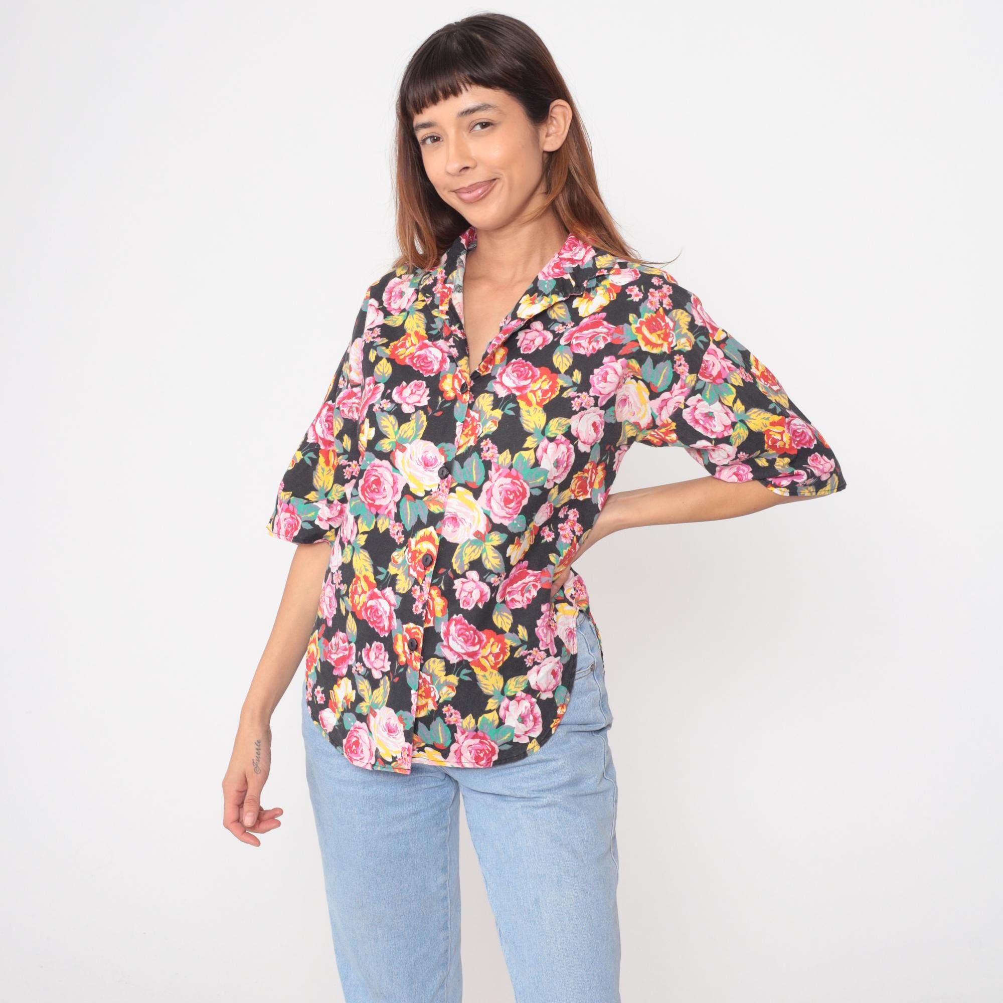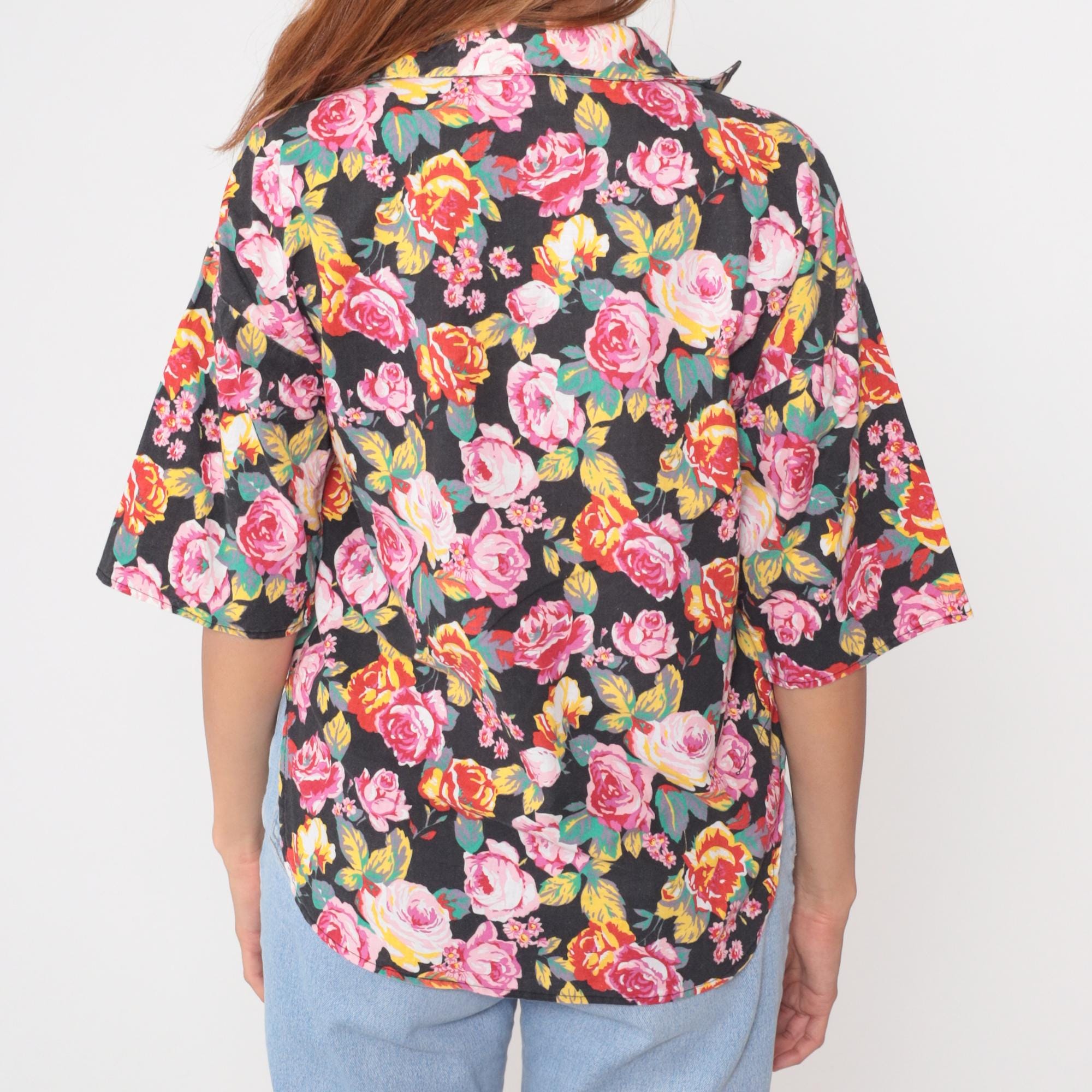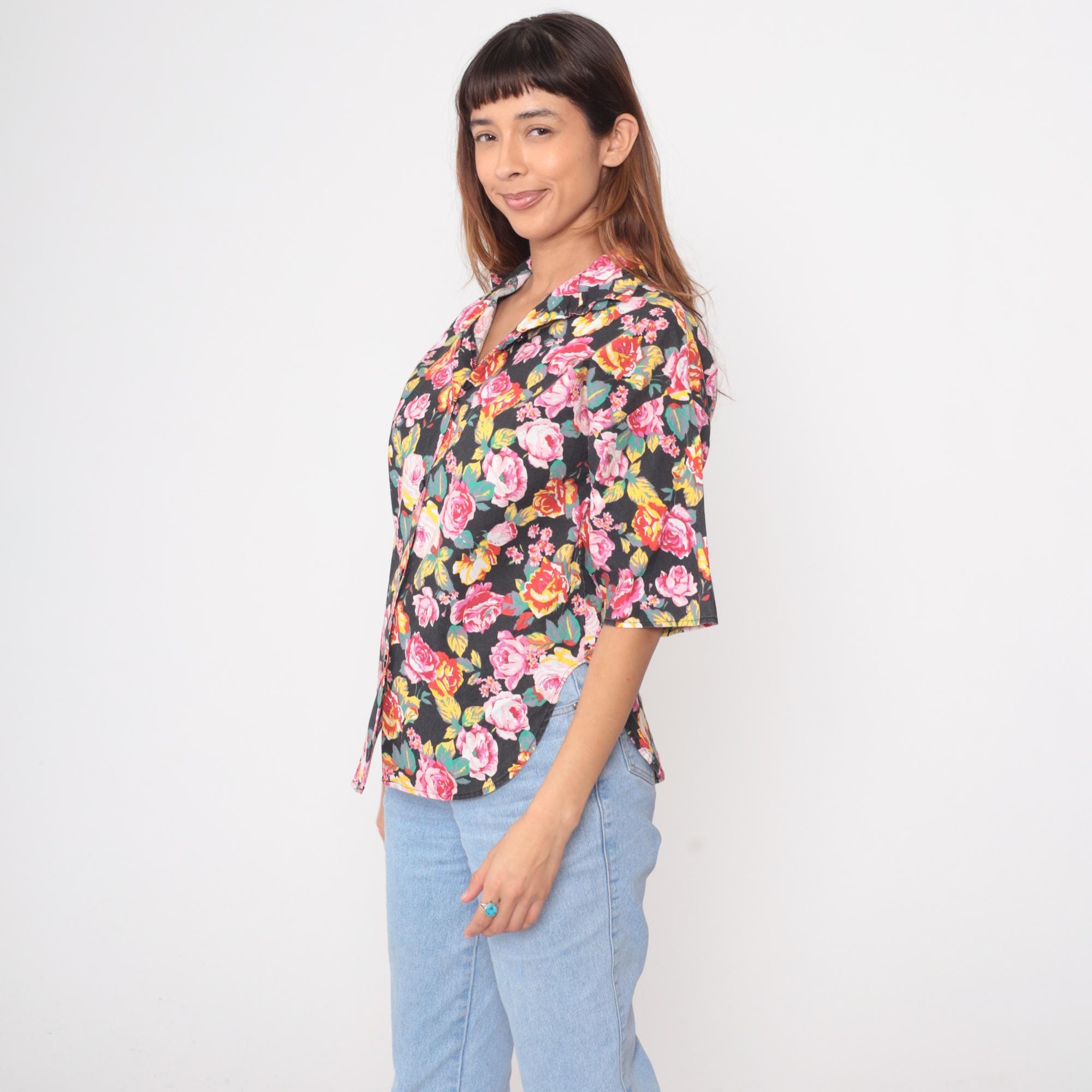 90s black floral shirt from Sure Thing of California with large-scale rose print in pink, red, yellow, and orange with green and teal leaves. Button front with notched collar and short sleeves. Relaxed fit with straight hem.