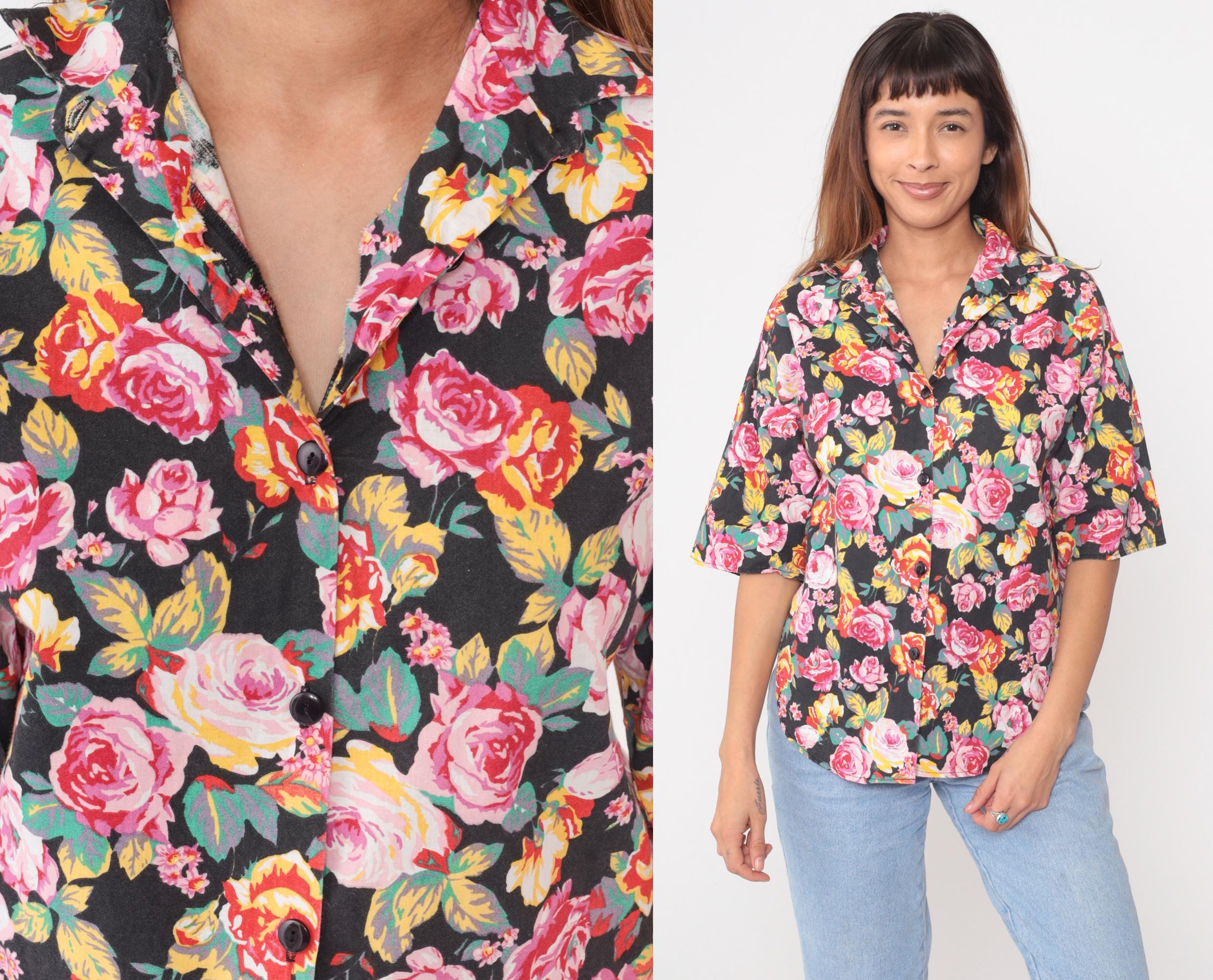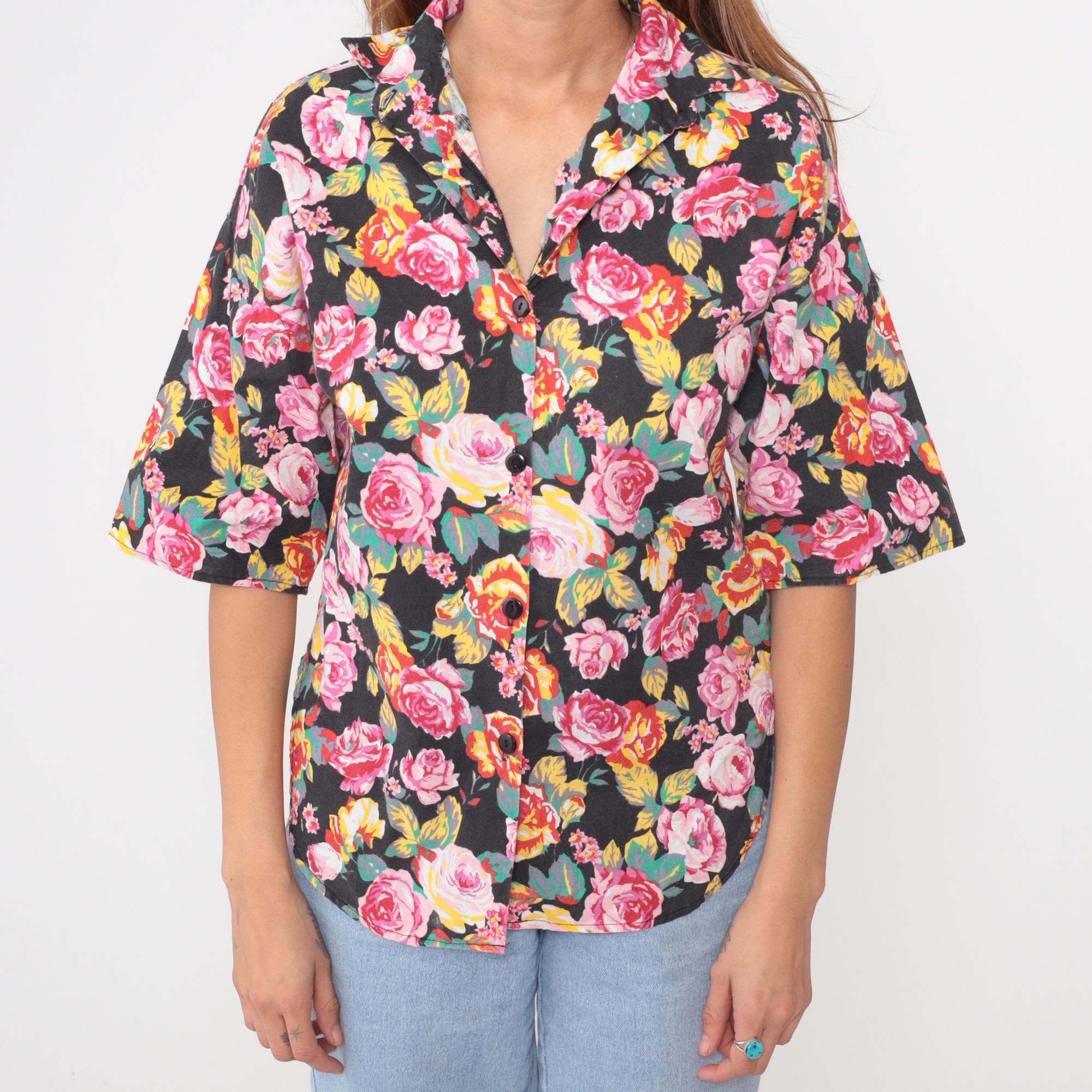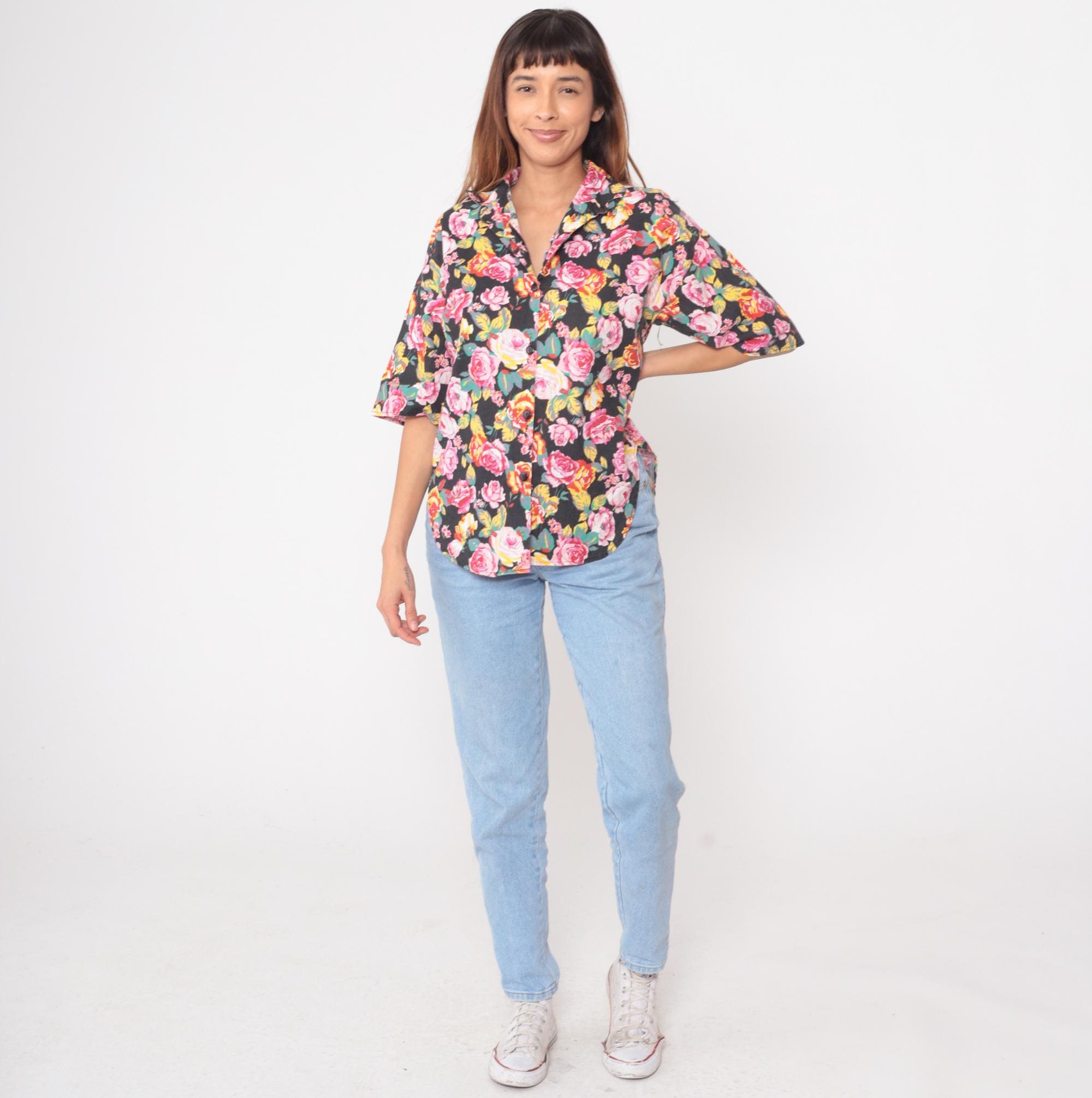 90s black floral shirt from Sure Thing of California with large-scale rose print in pink, red, yellow, and orange with green and teal leaves. Button front with notched collar and short sleeves. Relaxed fit with straight hem.