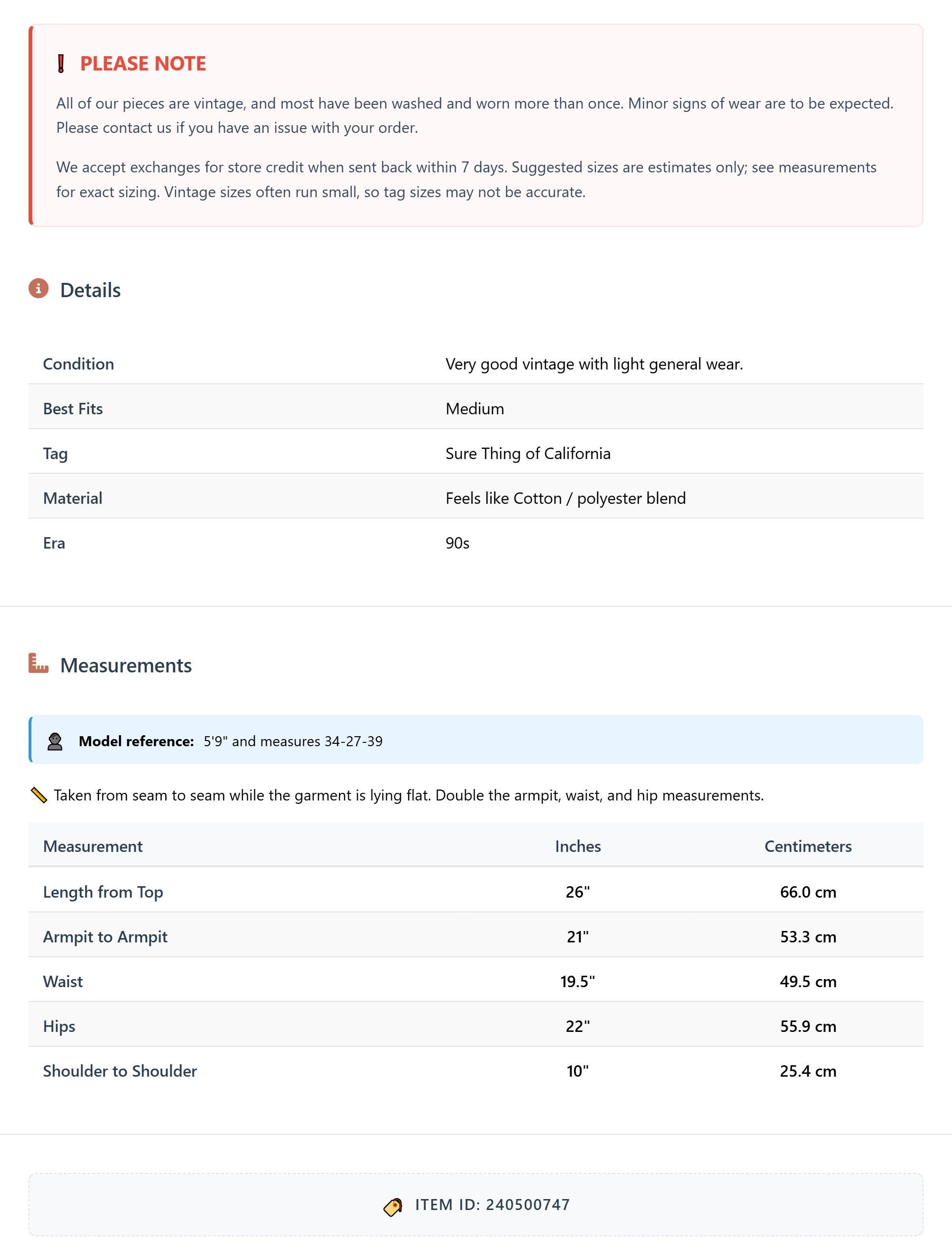 Suggested sizes are estimates only; see measurements for exact sizing. Vintage sizes often run small, so tag sizes may not be accurate.