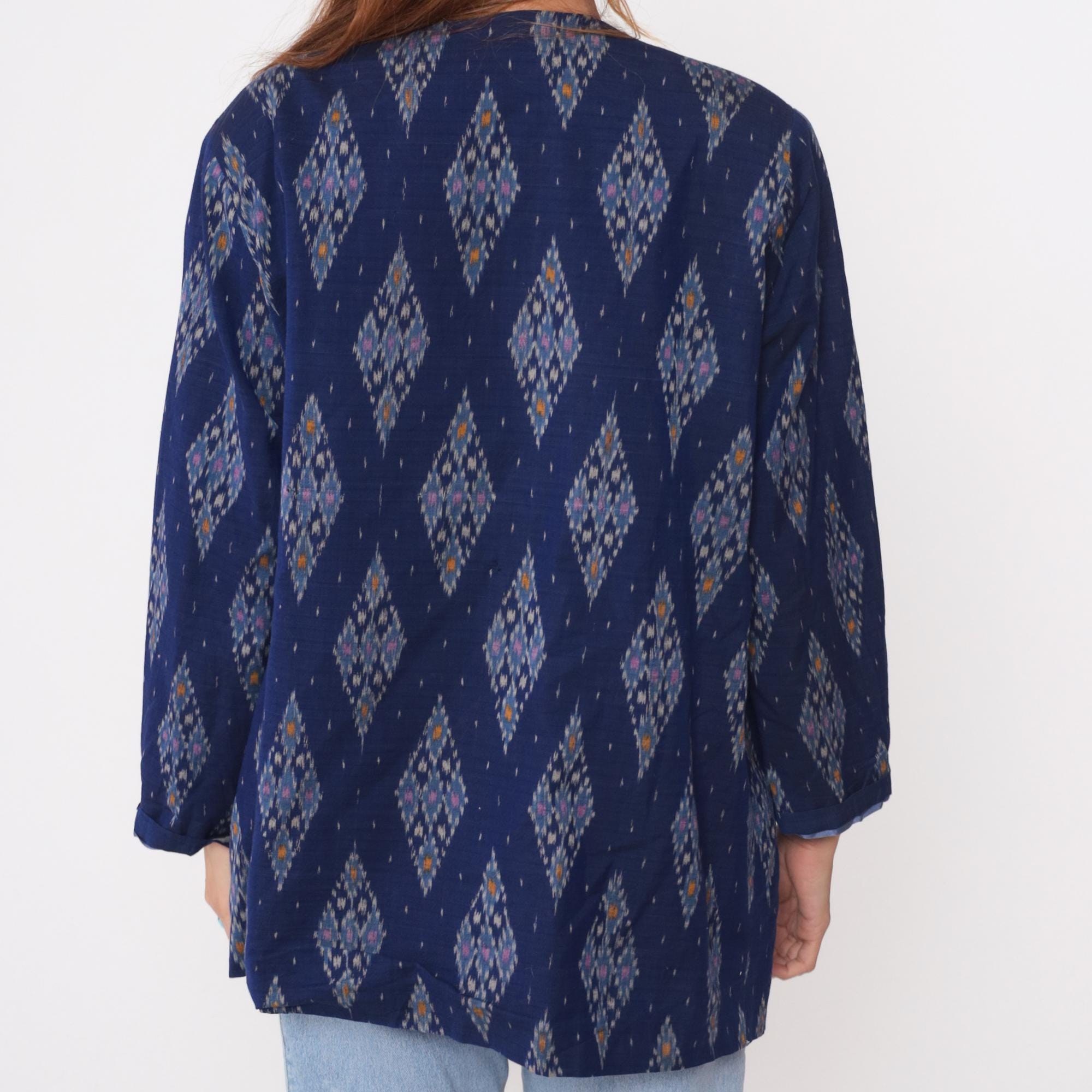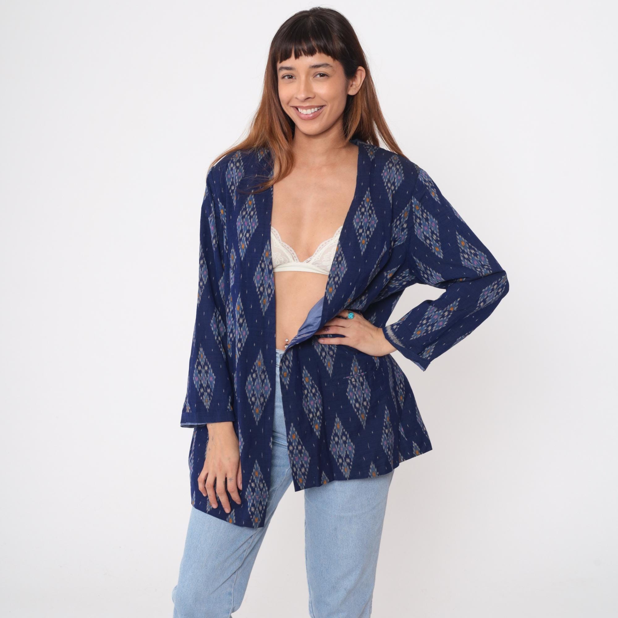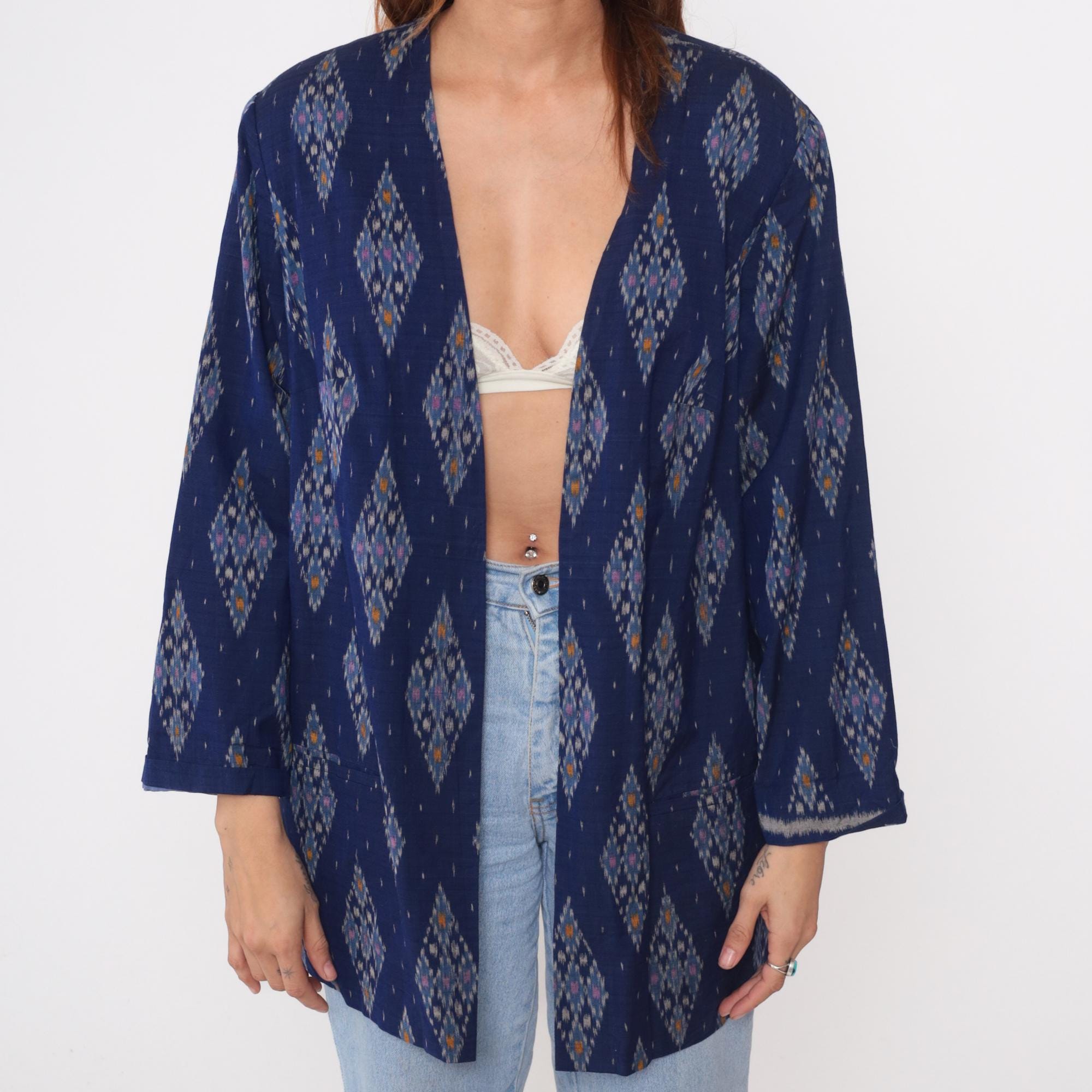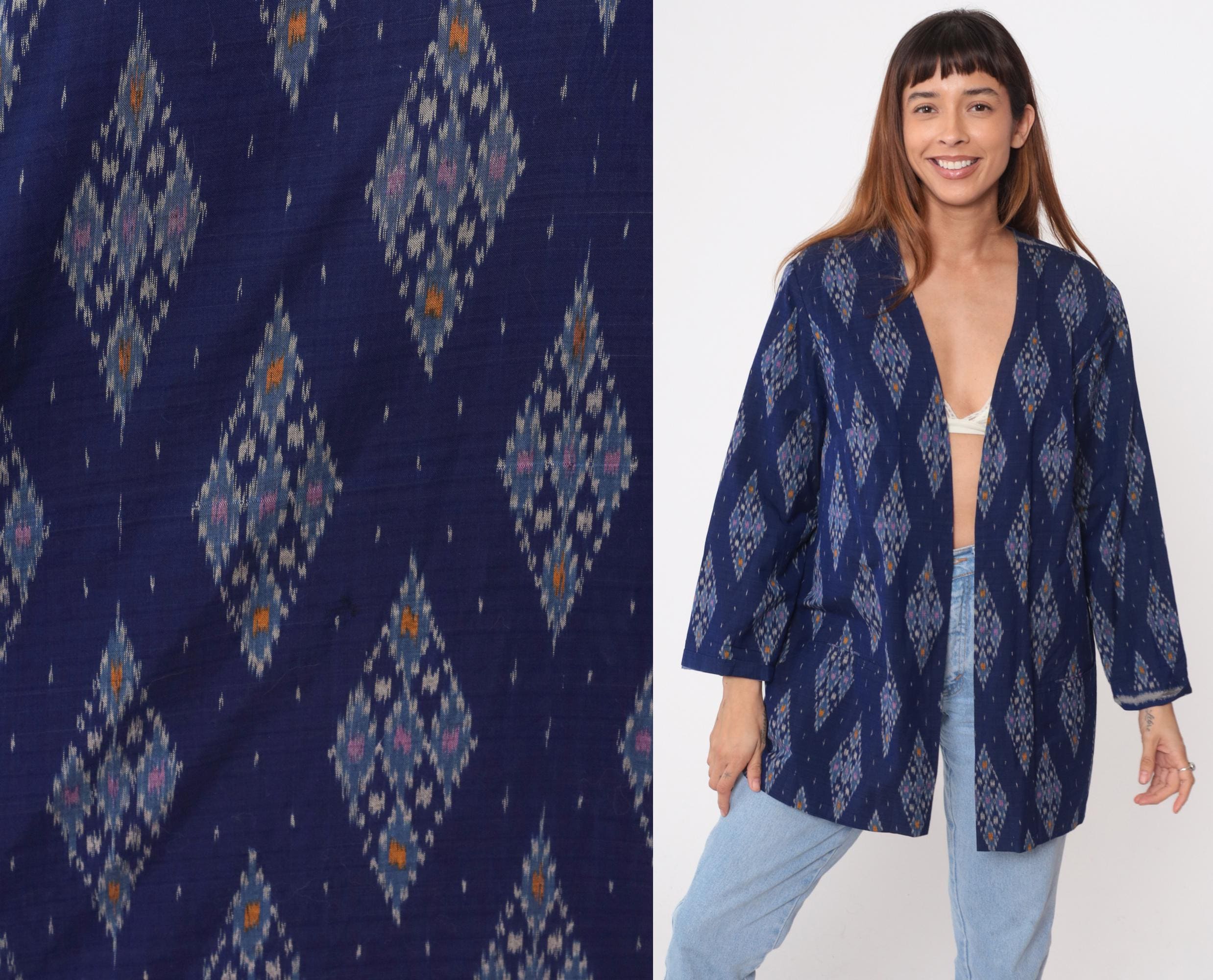 80s navy blue kimono jacket with ikat diamond pattern in pink, orange, gray, and white throughout. Open front with no closures, 3/4 sleeves, hip length. Cotton with acetate lining.