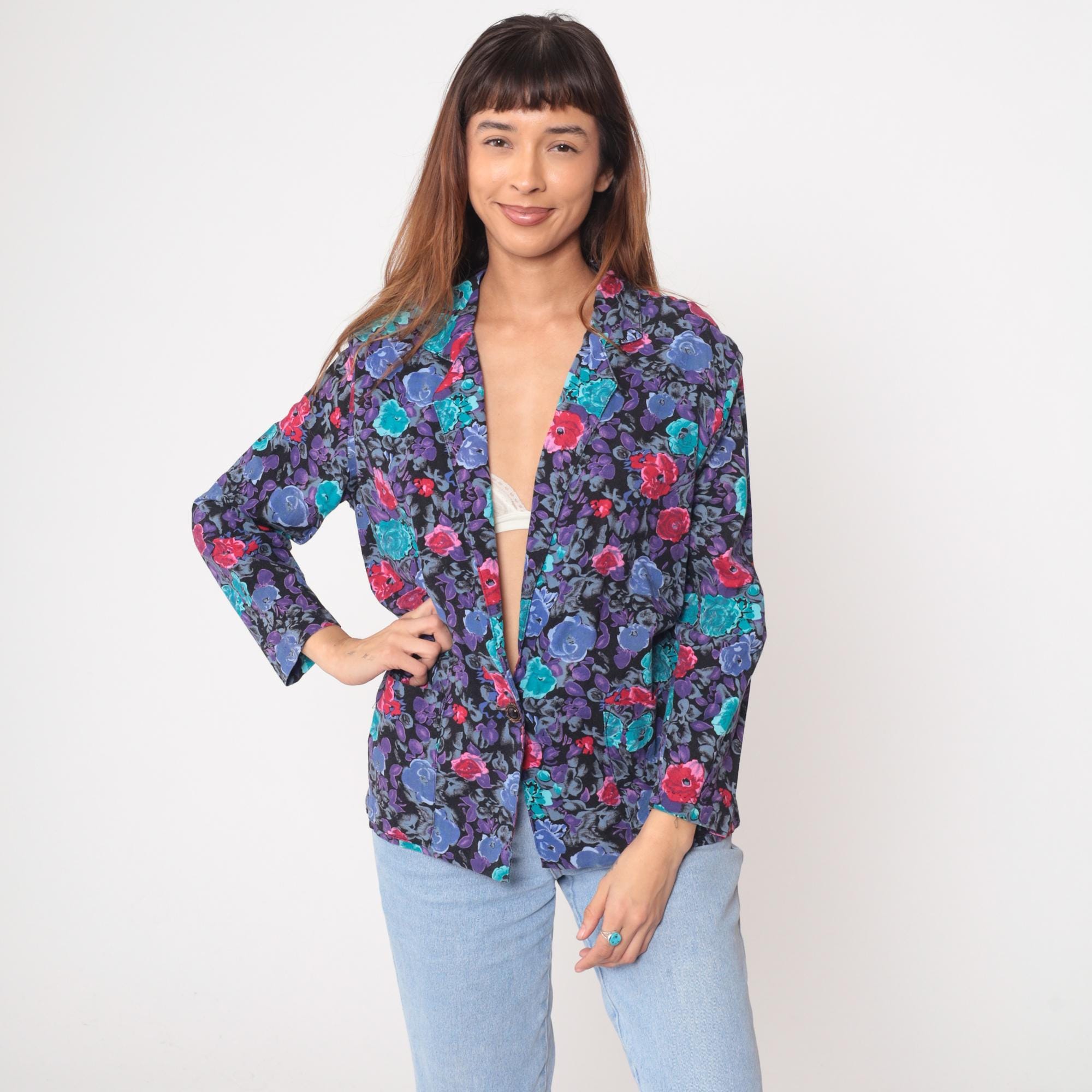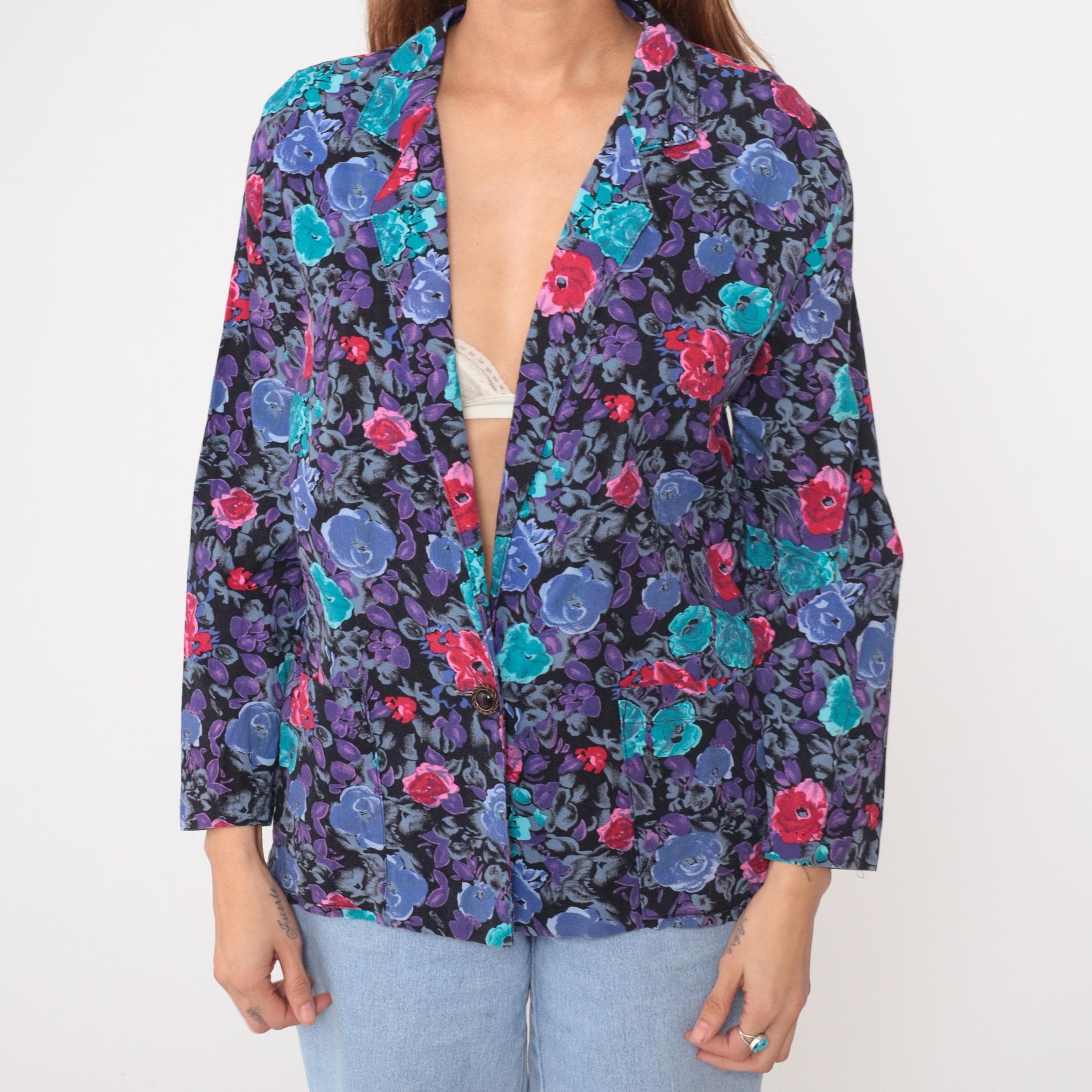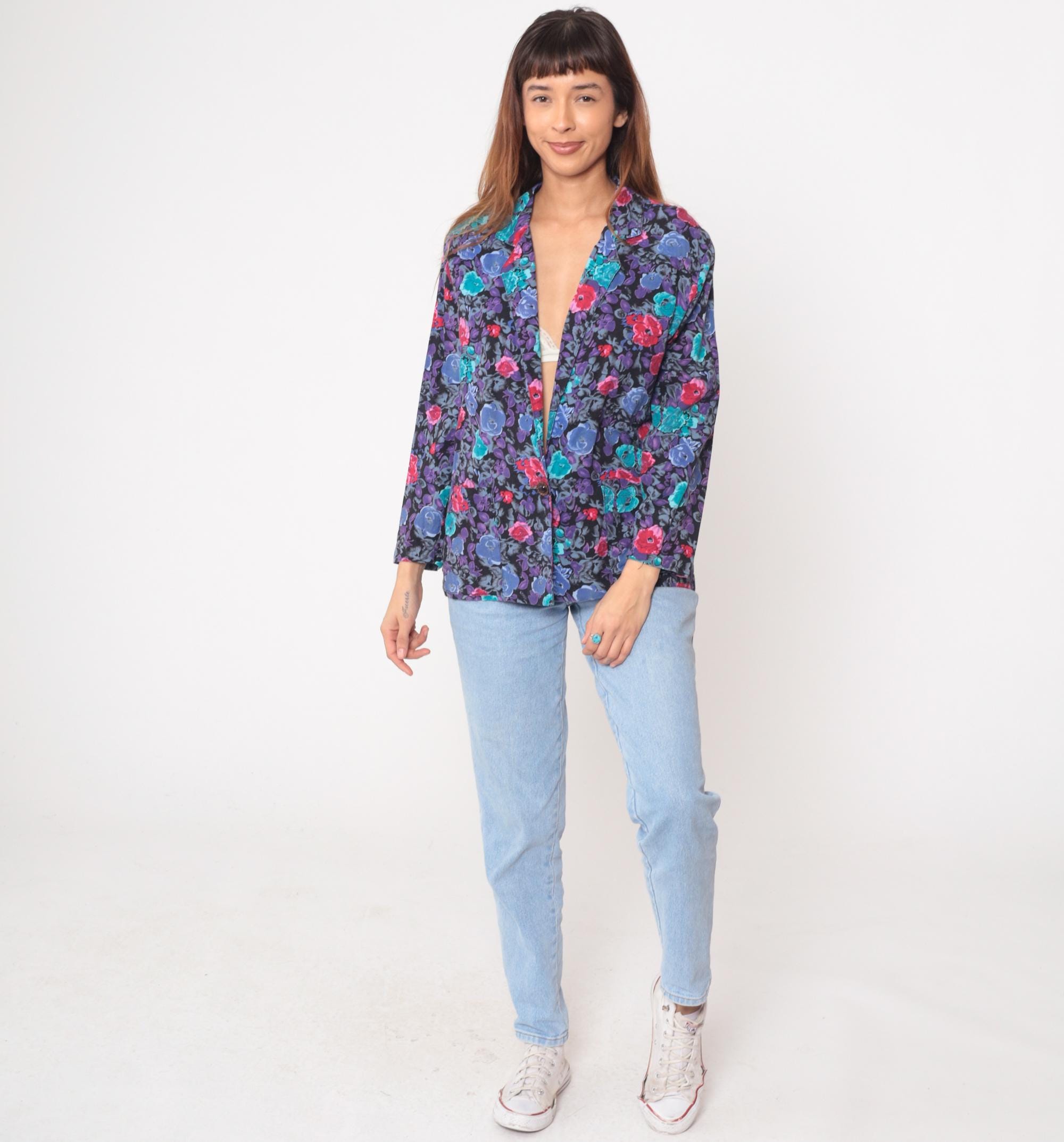90s floral blazer with purple, blue, turquoise, and pink flowers across black background. Single button front closure, notched lapels, long sleeves. Painterly style rose and bloom print throughout.