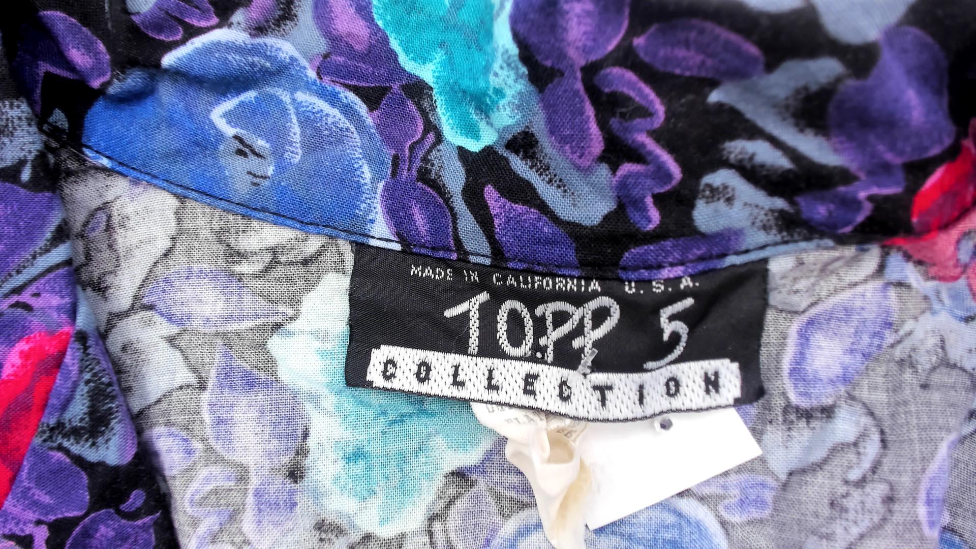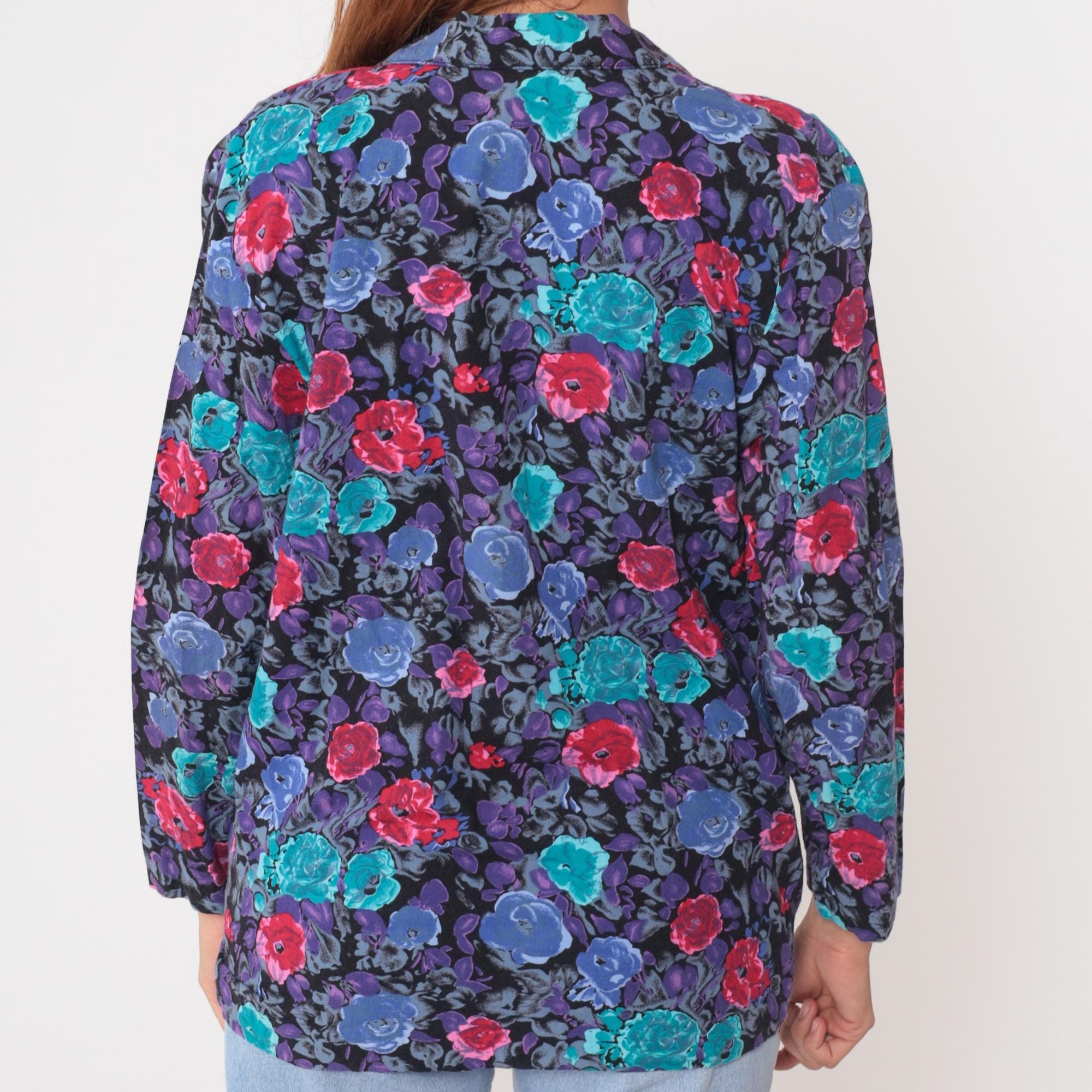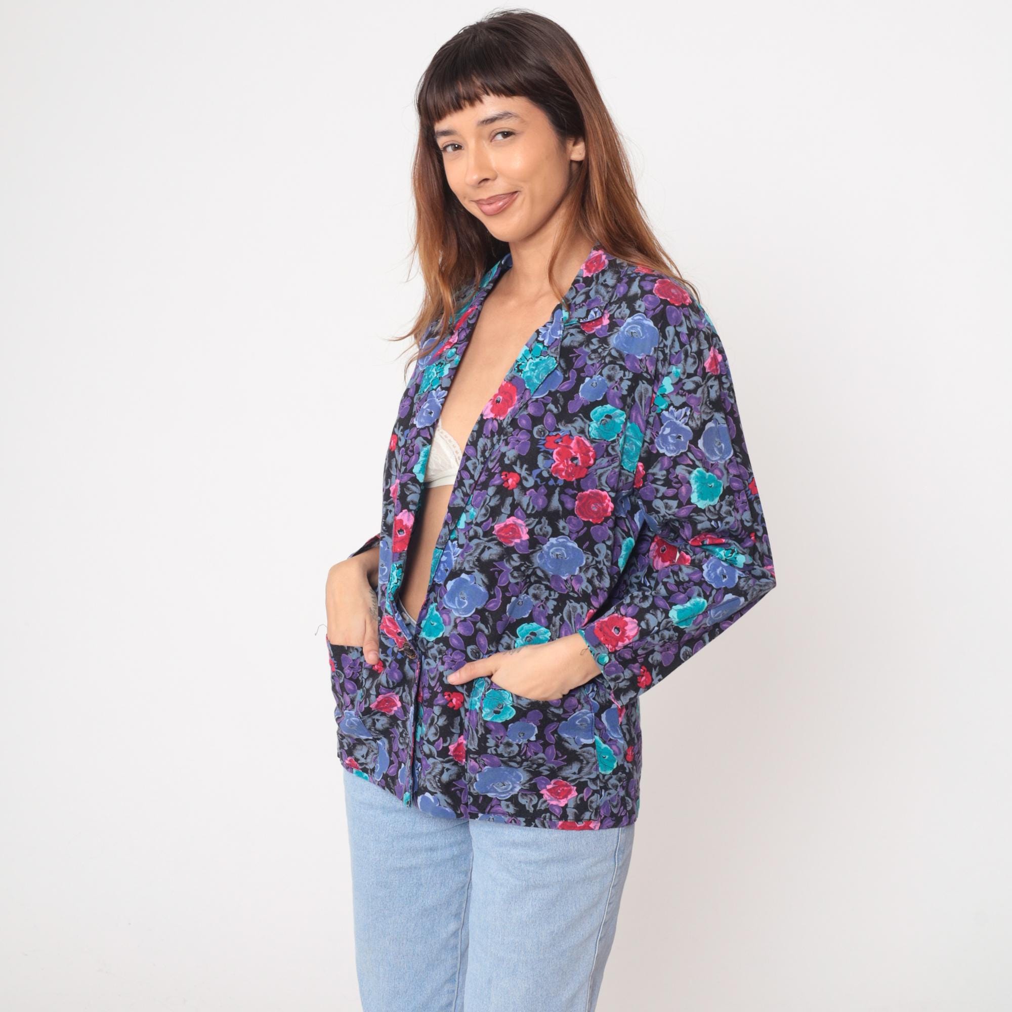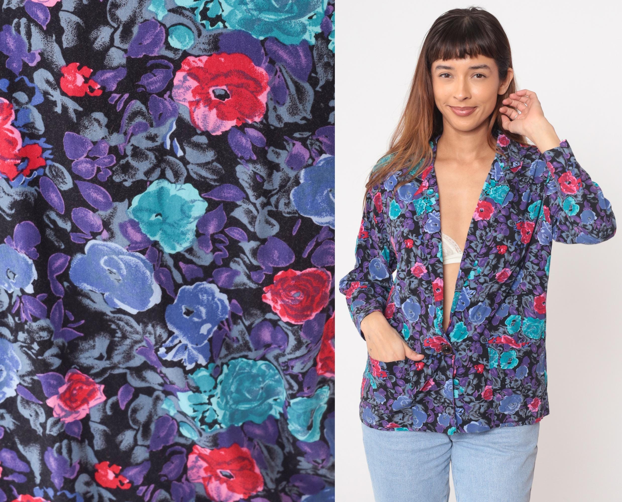 90s floral blazer with purple, blue, turquoise, and pink flowers across black background. Single button front closure, notched lapels, long sleeves. Painterly style rose and bloom print throughout.
