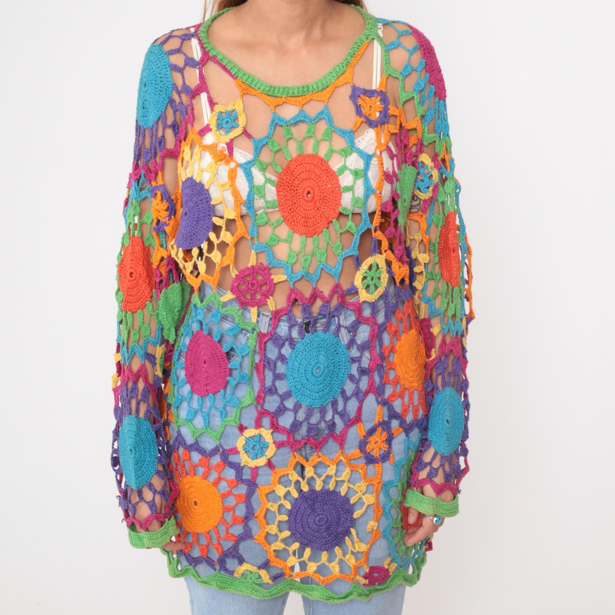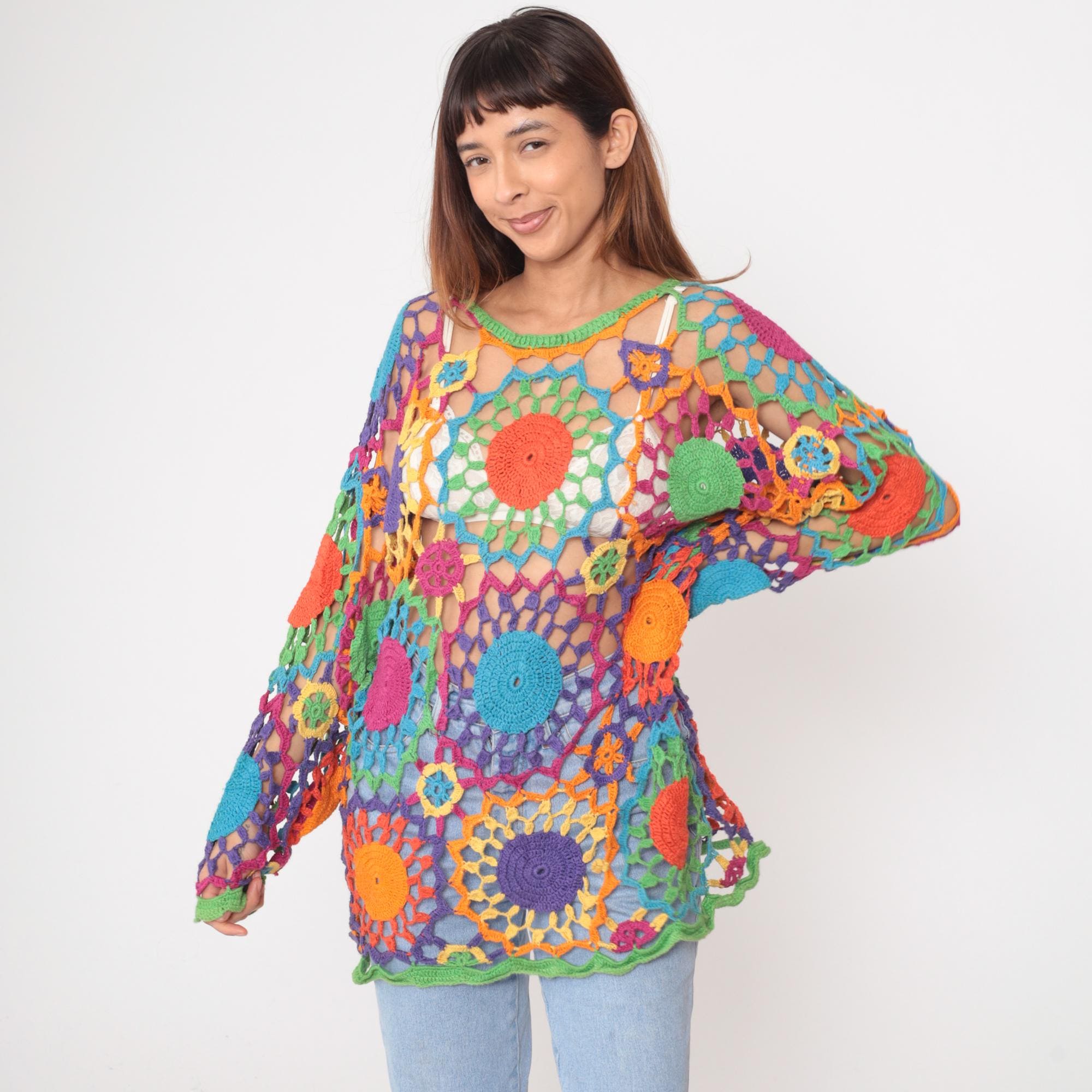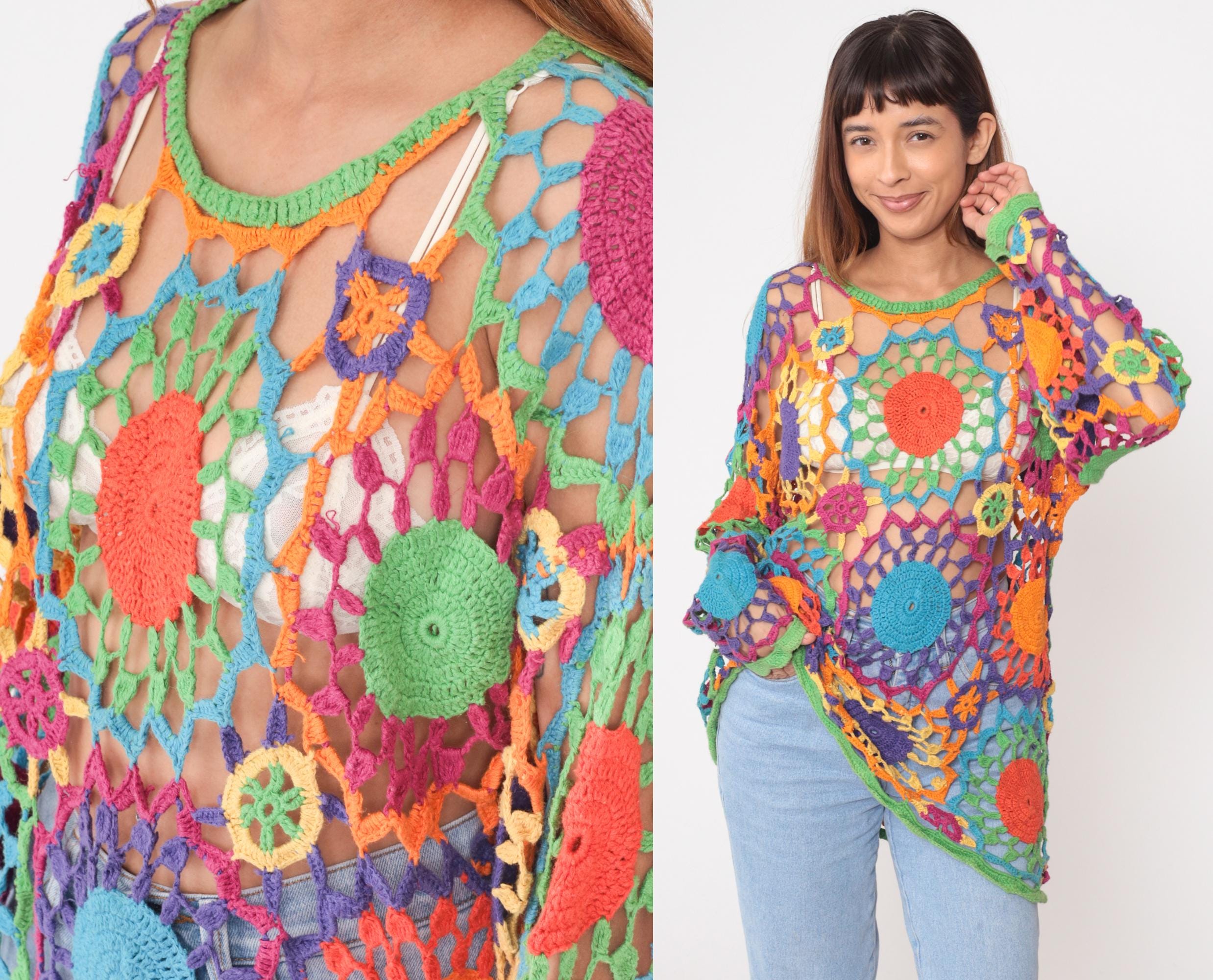 90s multicolor crochet top from International Sportswear Co with open-weave construction featuring circular crochet medallions in orange, pink, purple, blue, green, yellow, and turquoise throughout. Long sleeves with mesh crochet pattern, scoop neckline with green trim, green scalloped hem.