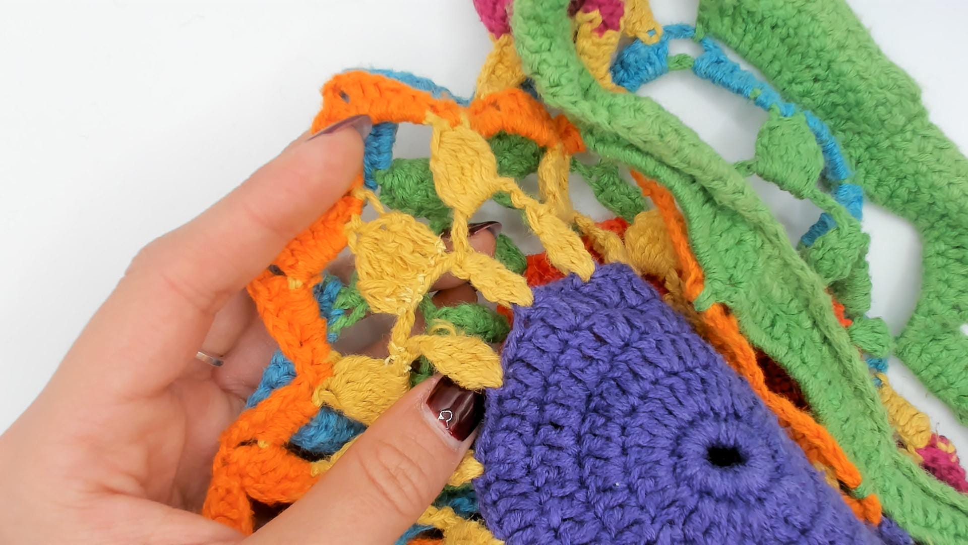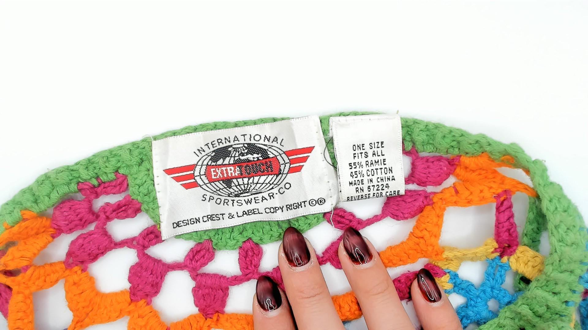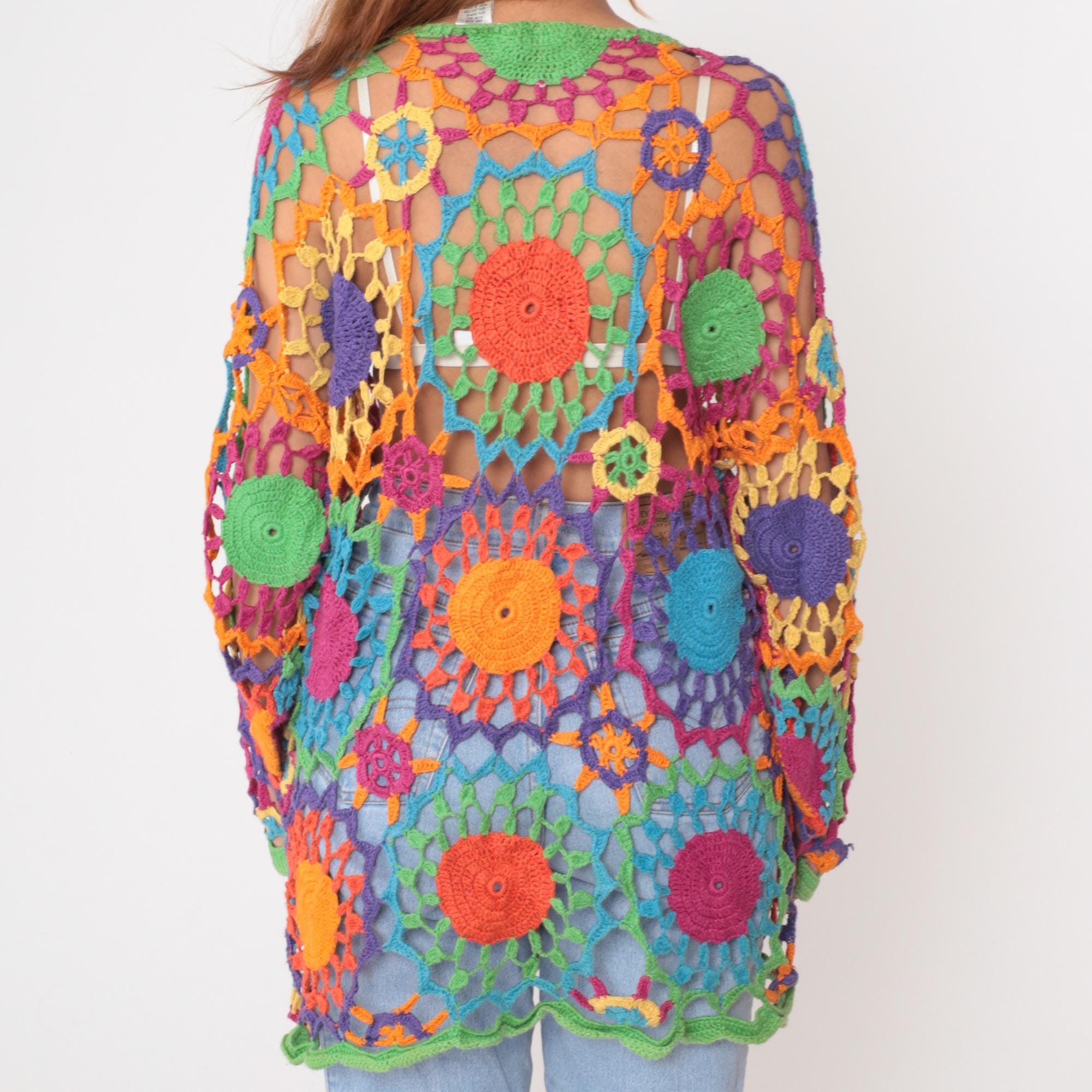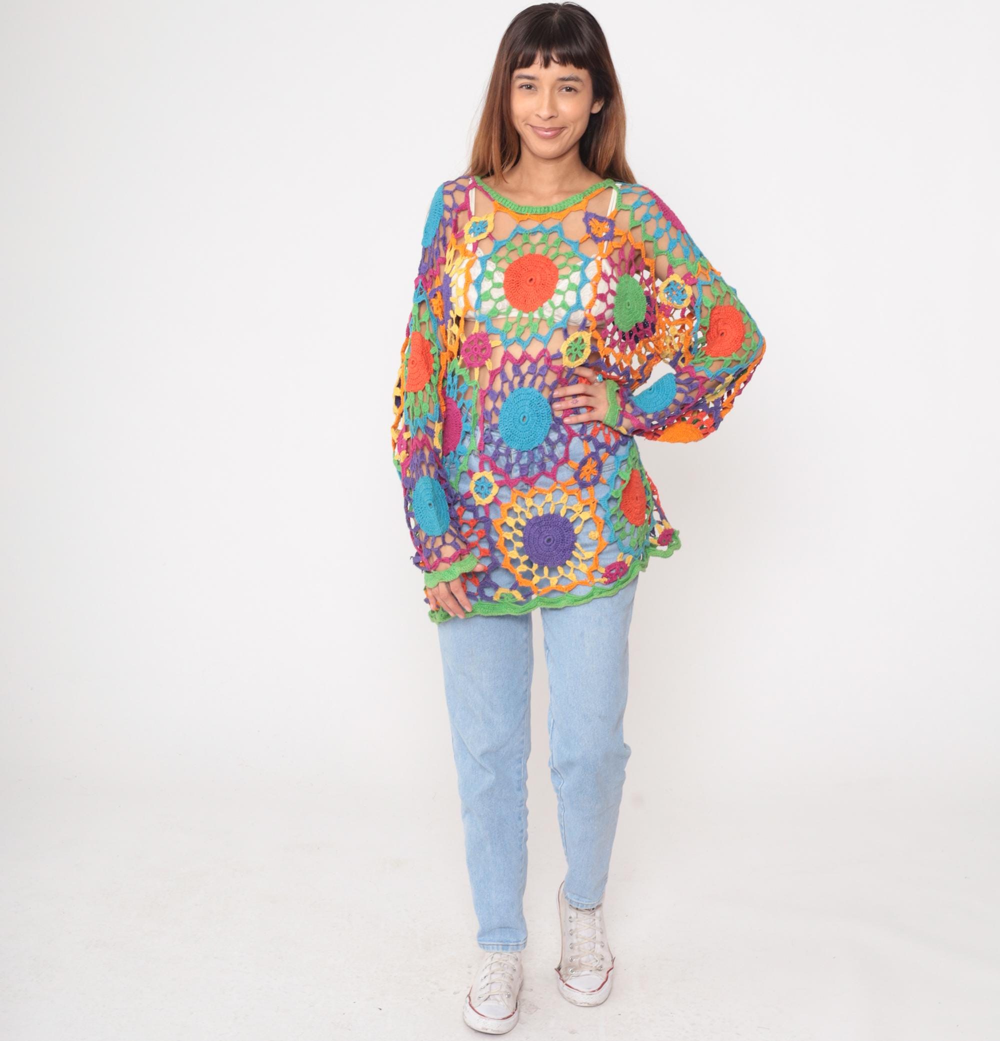 90s multicolor crochet top from International Sportswear Co with open-weave construction featuring circular crochet medallions in orange, pink, purple, blue, green, yellow, and turquoise throughout. Long sleeves with mesh crochet pattern, scoop neckline with green trim, green scalloped hem.