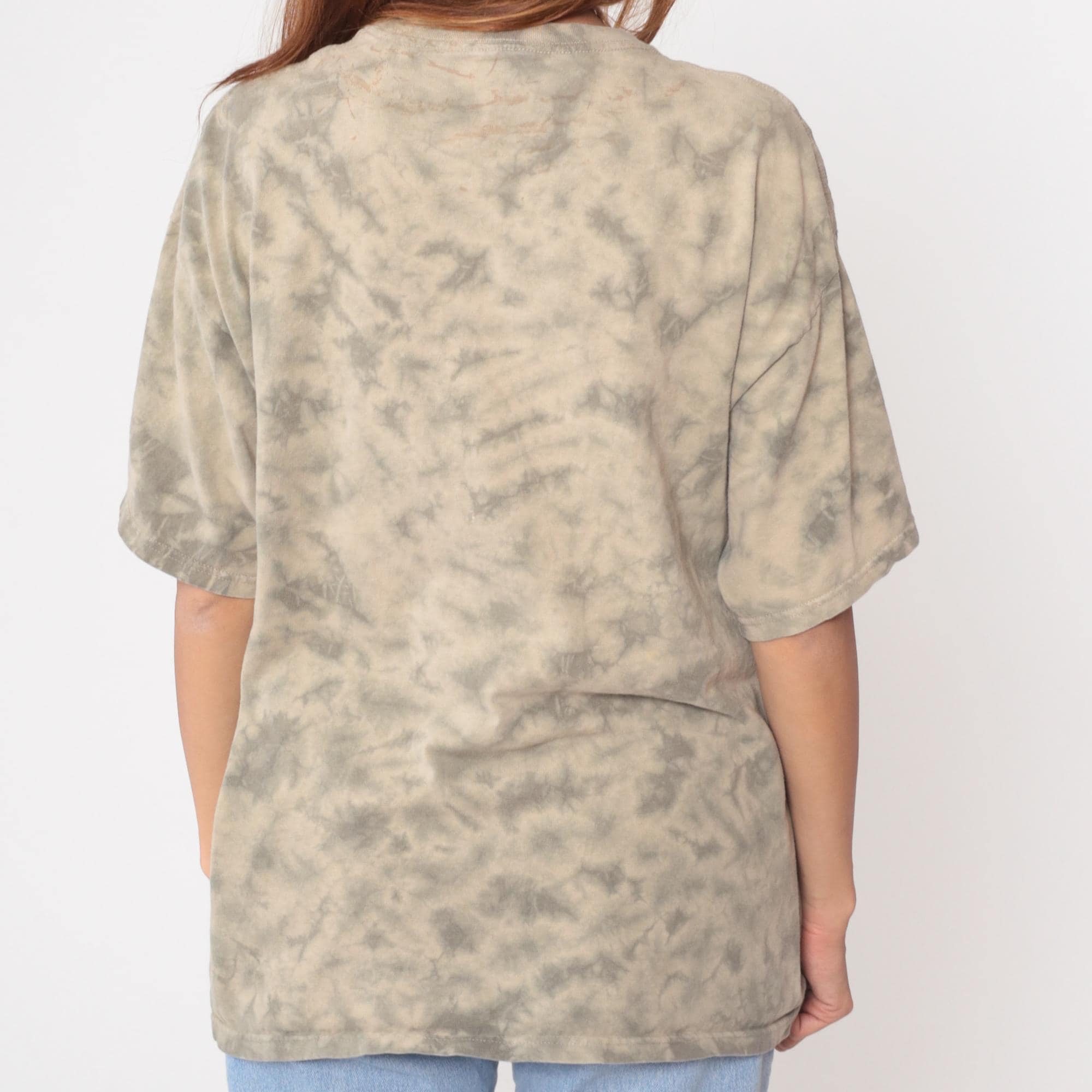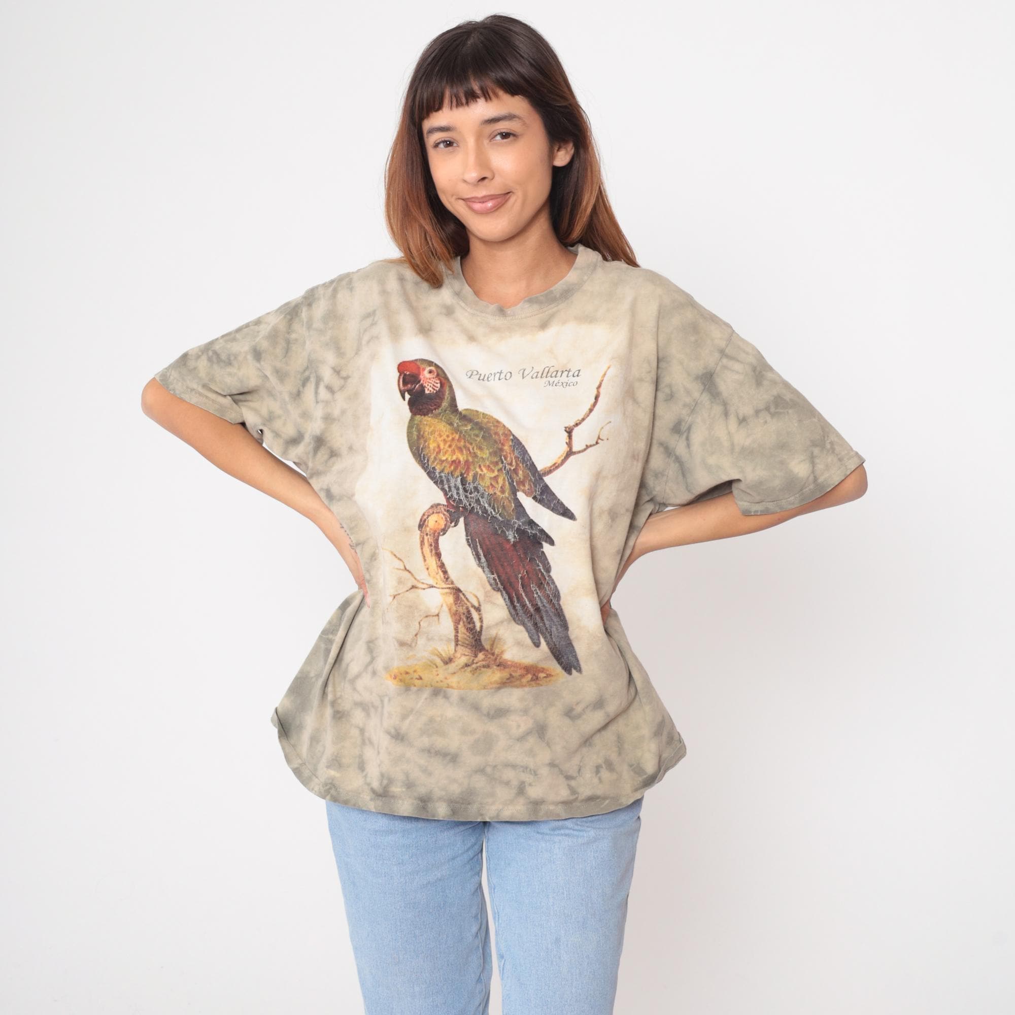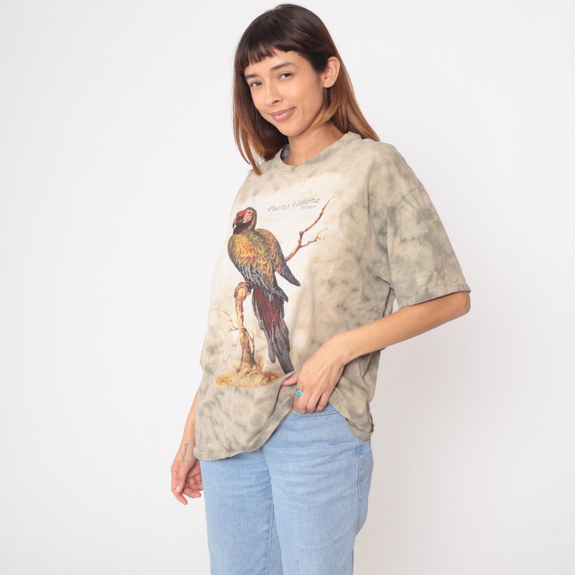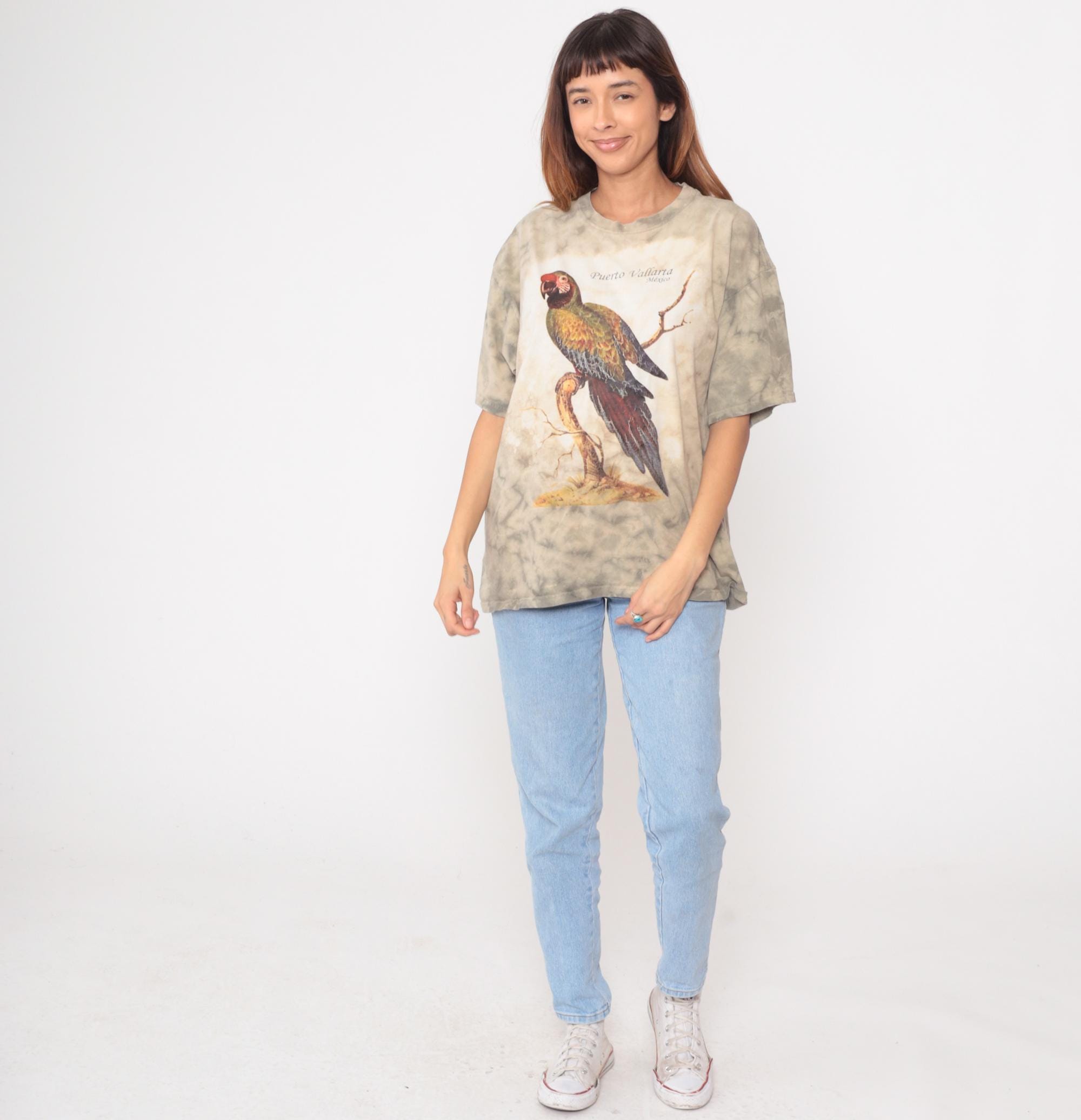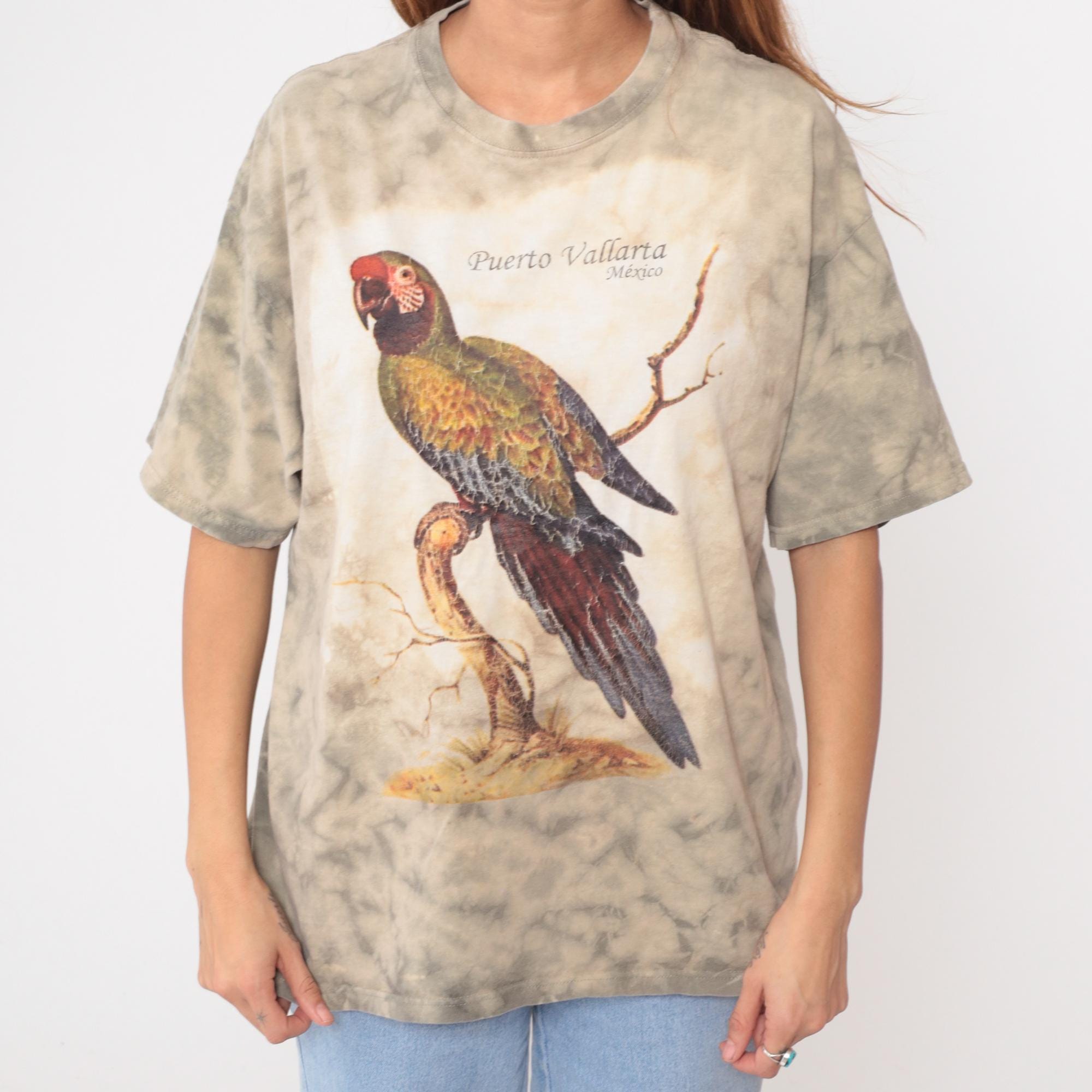 90s beige and gray tie-dye t-shirt from Yazbek with parrot graphic and "Puerto Vallarta Mexico" text. Parrot illustrated in naturalistic detail with red and orange head, green and yellow body, dark wings, and red tail, perched on a branch against the tie-dye background. Short sleeves and crew neck.