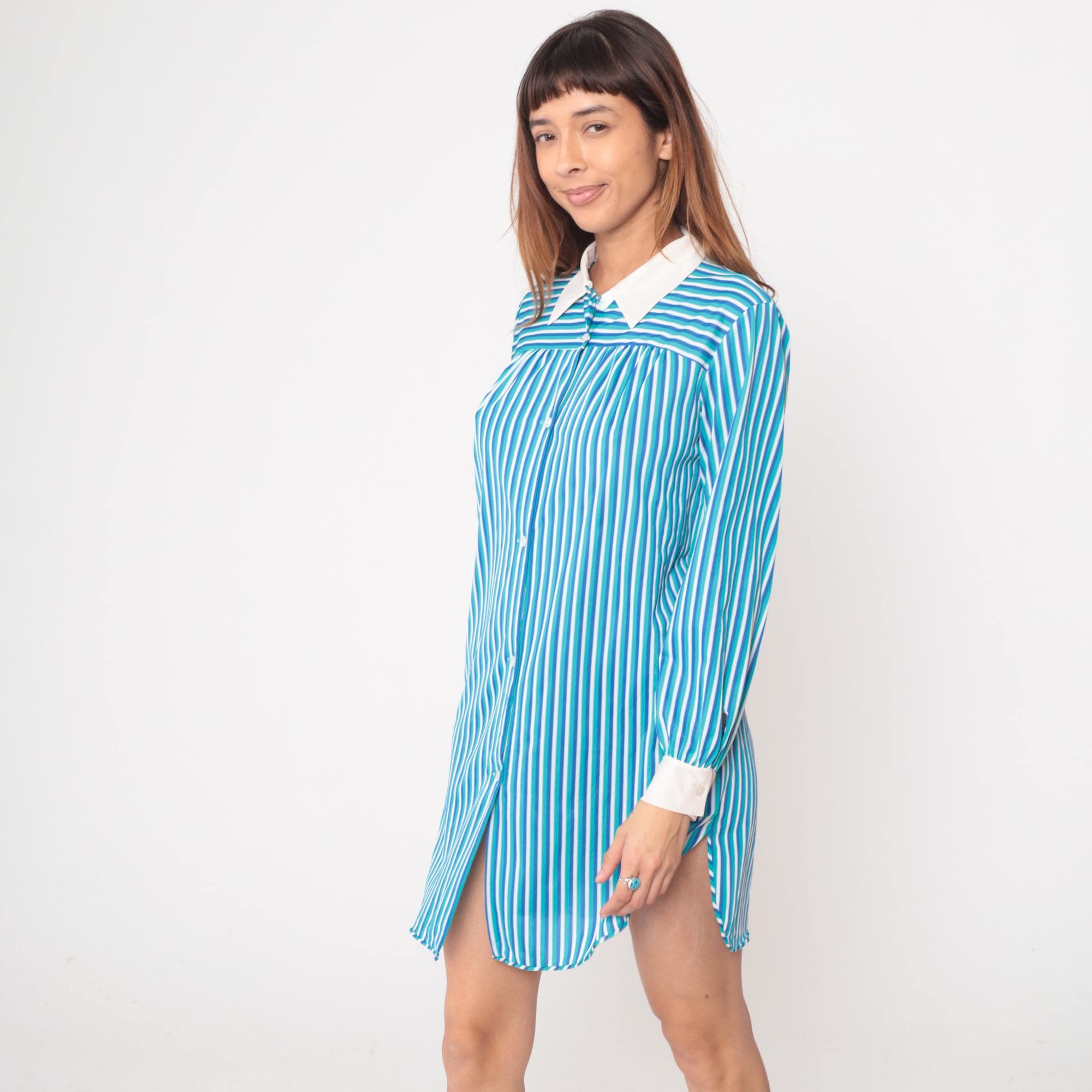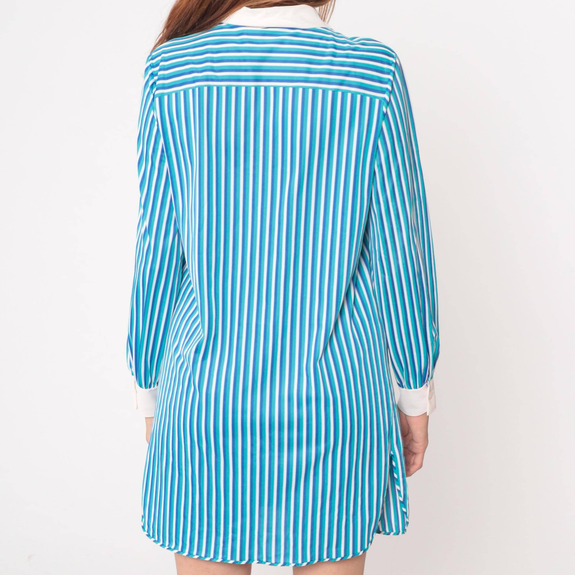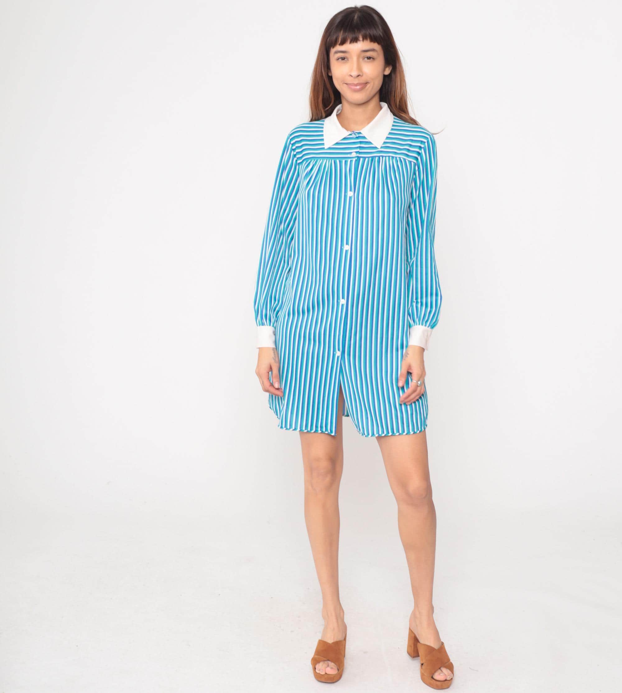 60s blue and white striped mini dress with white pointed collar and white cuffs. Button front closure, gathered yoke below the collar, and long sleeves. Vertical stripes in turquoise blue and white.