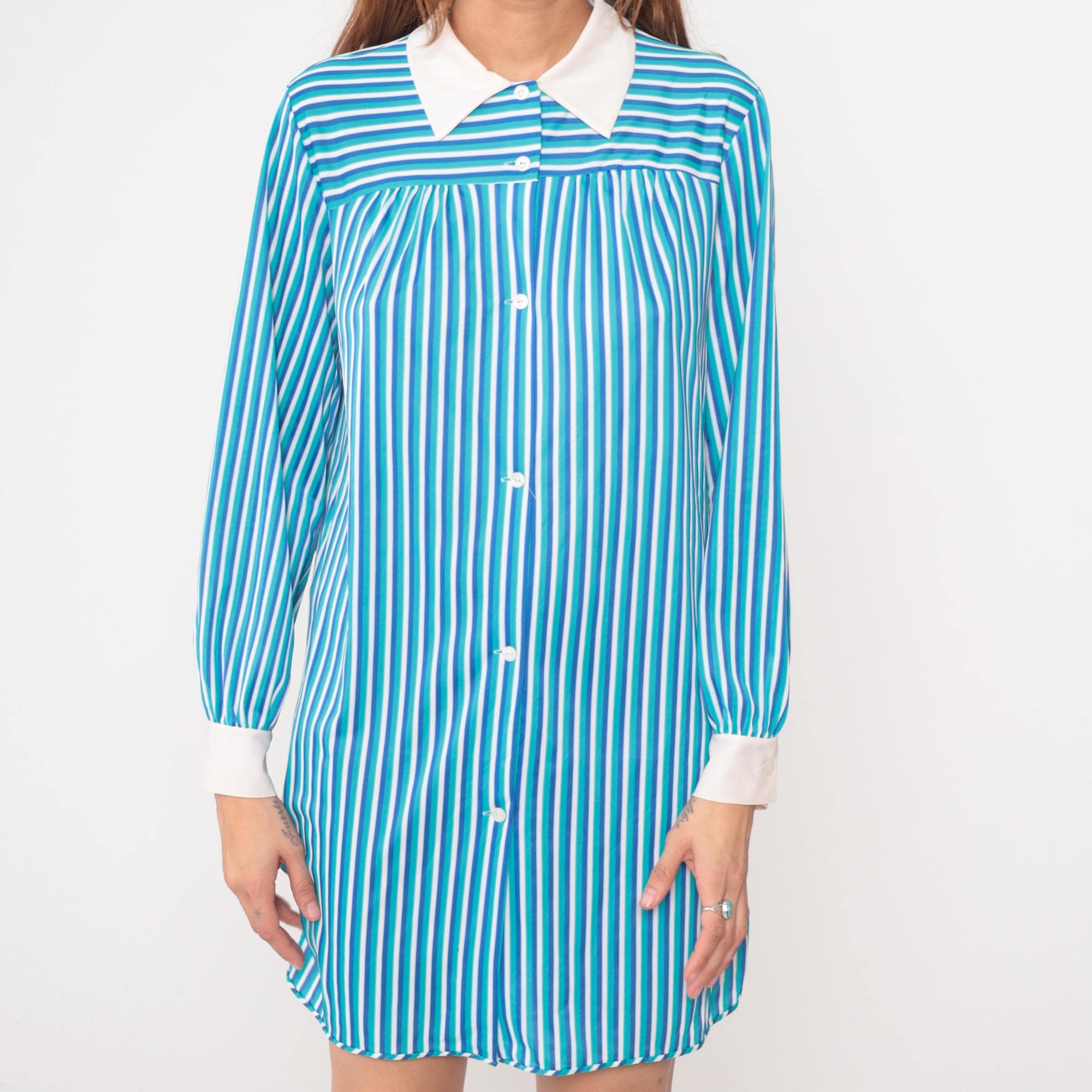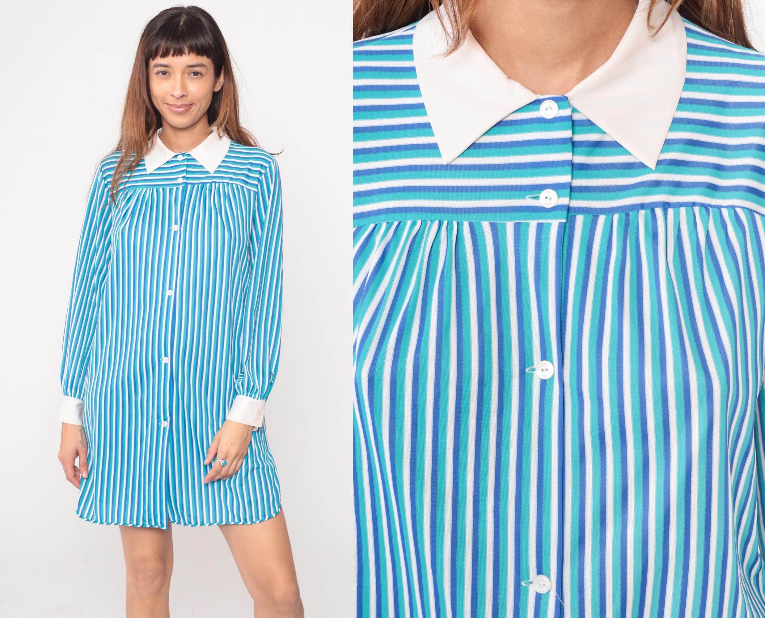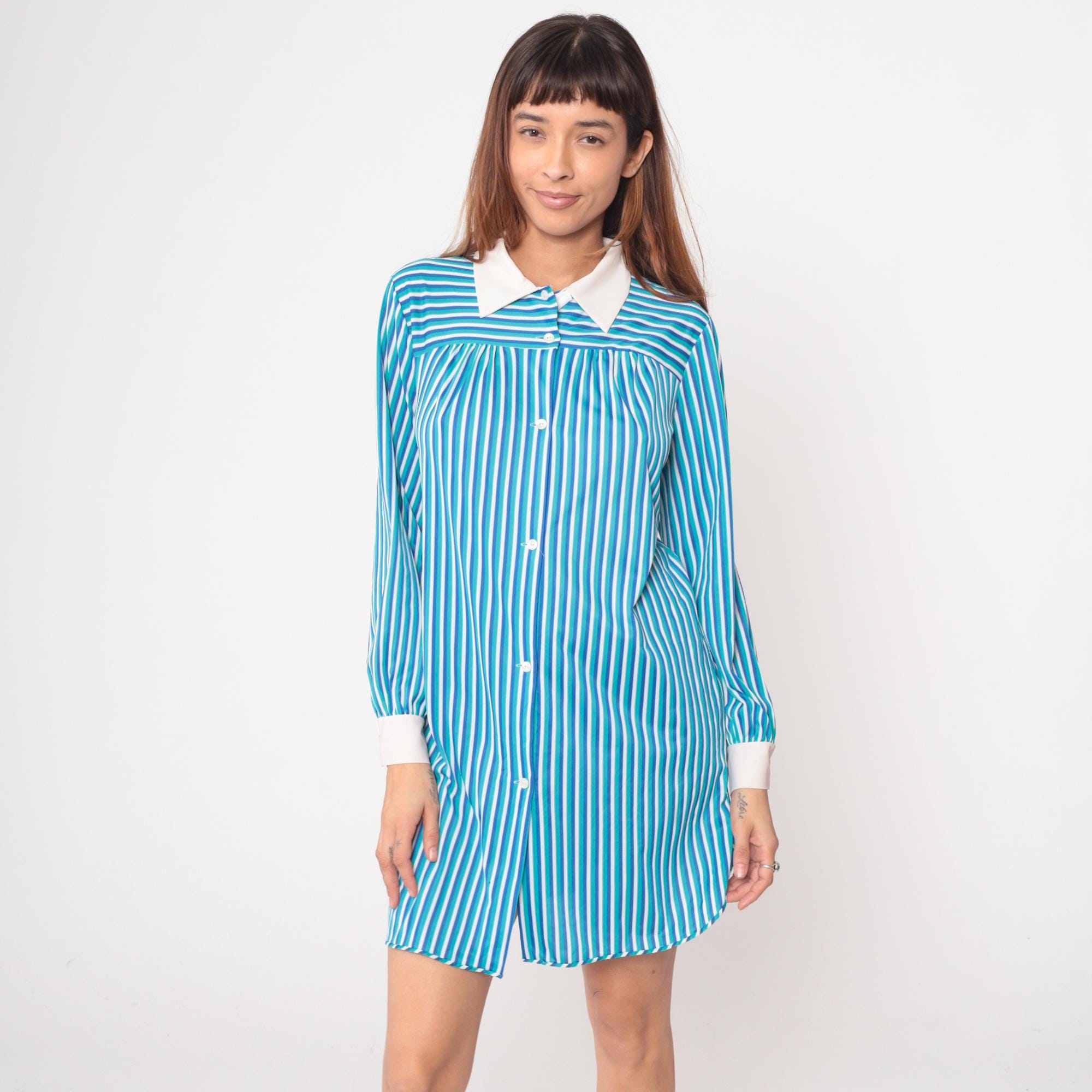 60s blue and white striped mini dress with white pointed collar and white cuffs. Button front closure, gathered yoke below the collar, and long sleeves. Vertical stripes in turquoise blue and white.
