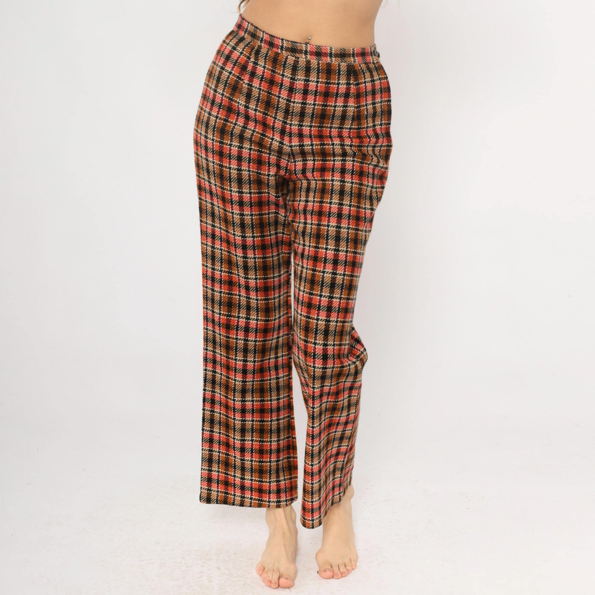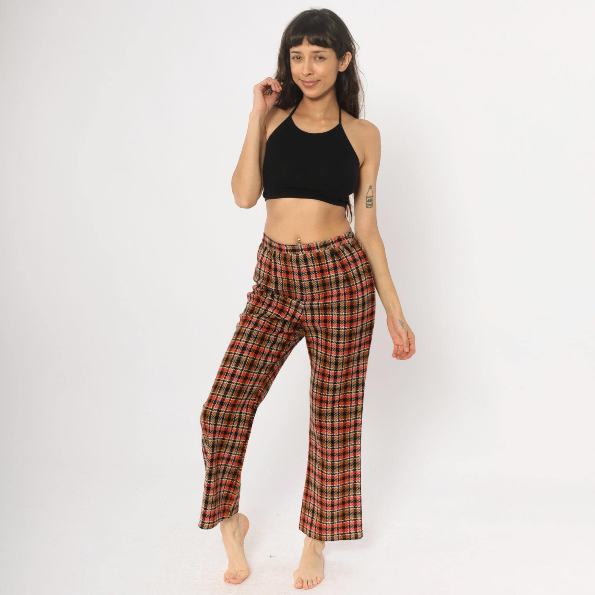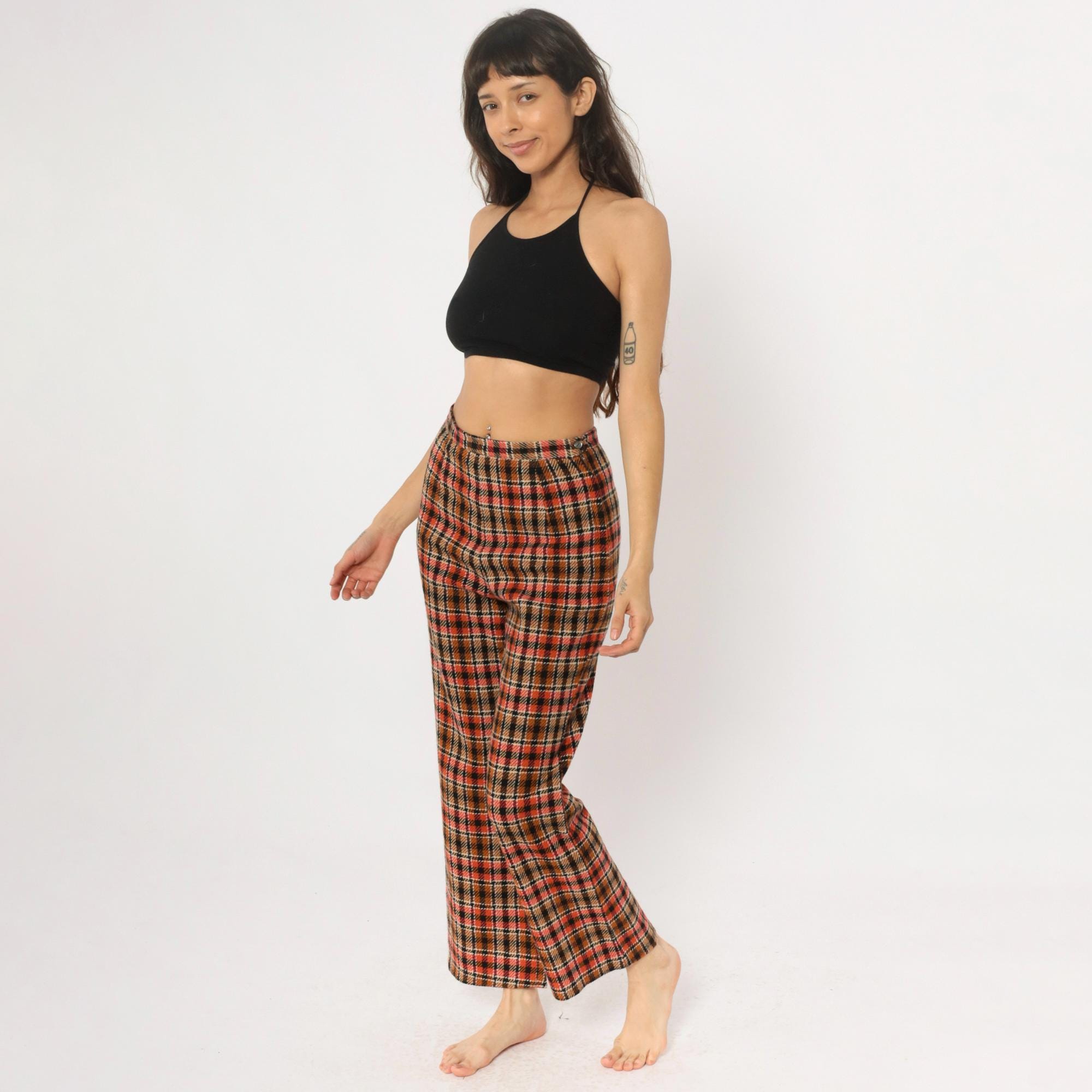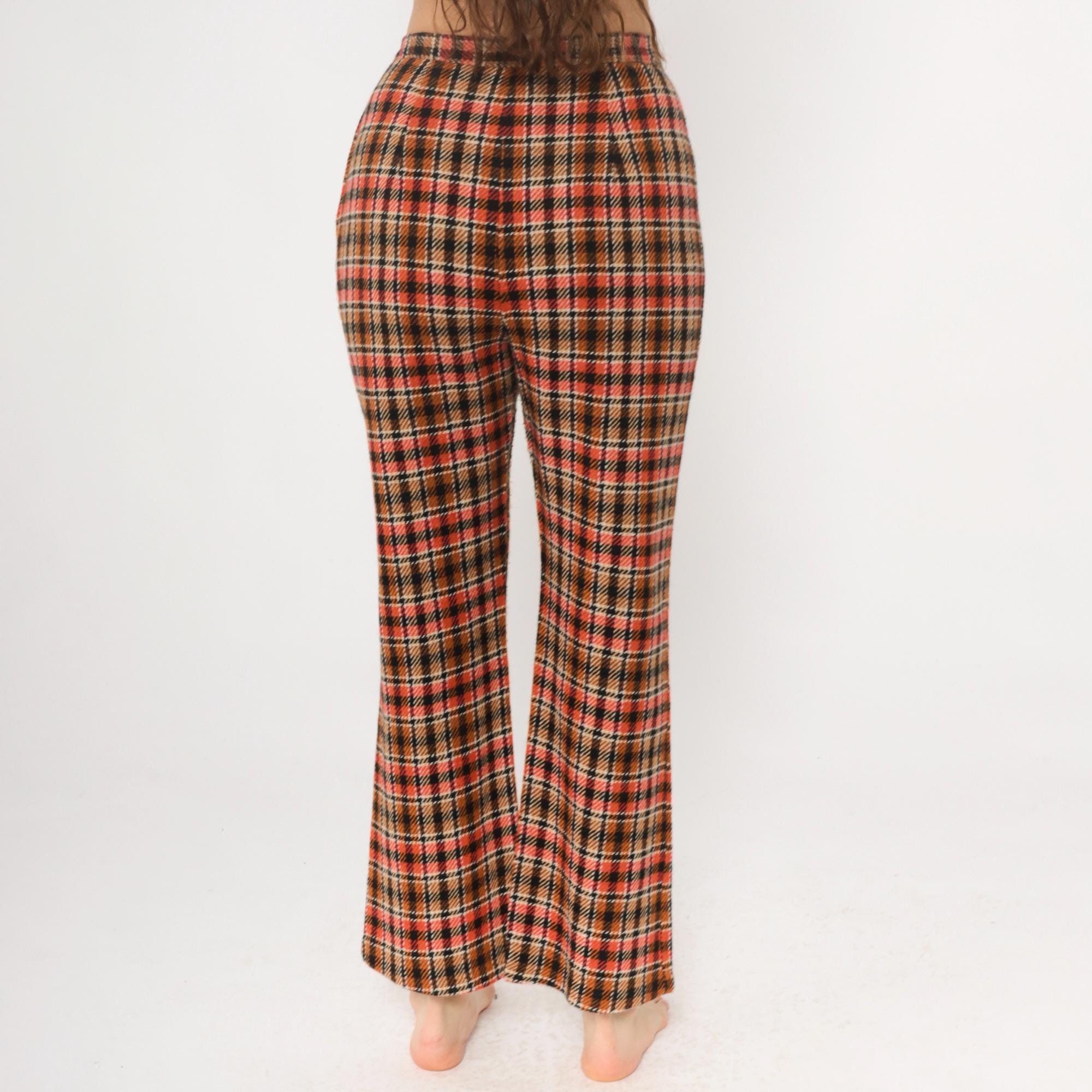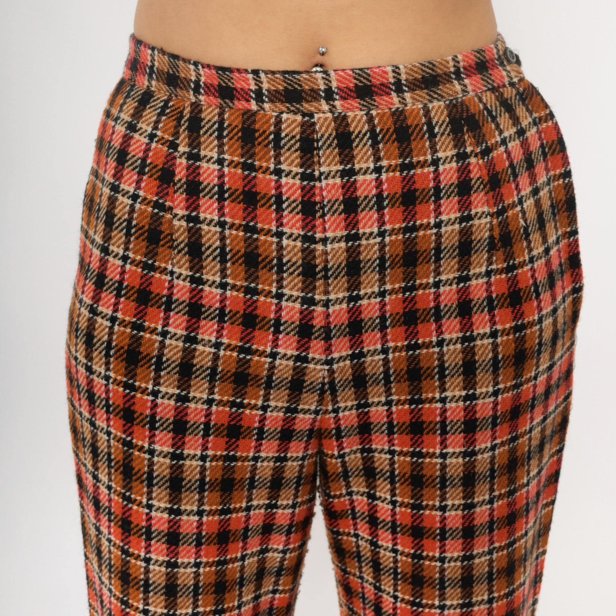 70s wide leg plaid pants in orange, brown, tan, and black houndstooth check pattern. Elastic waistband with button and zipper closure on the side.