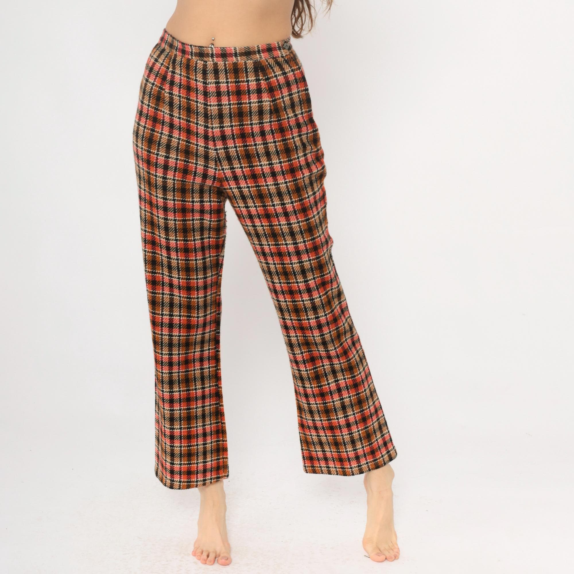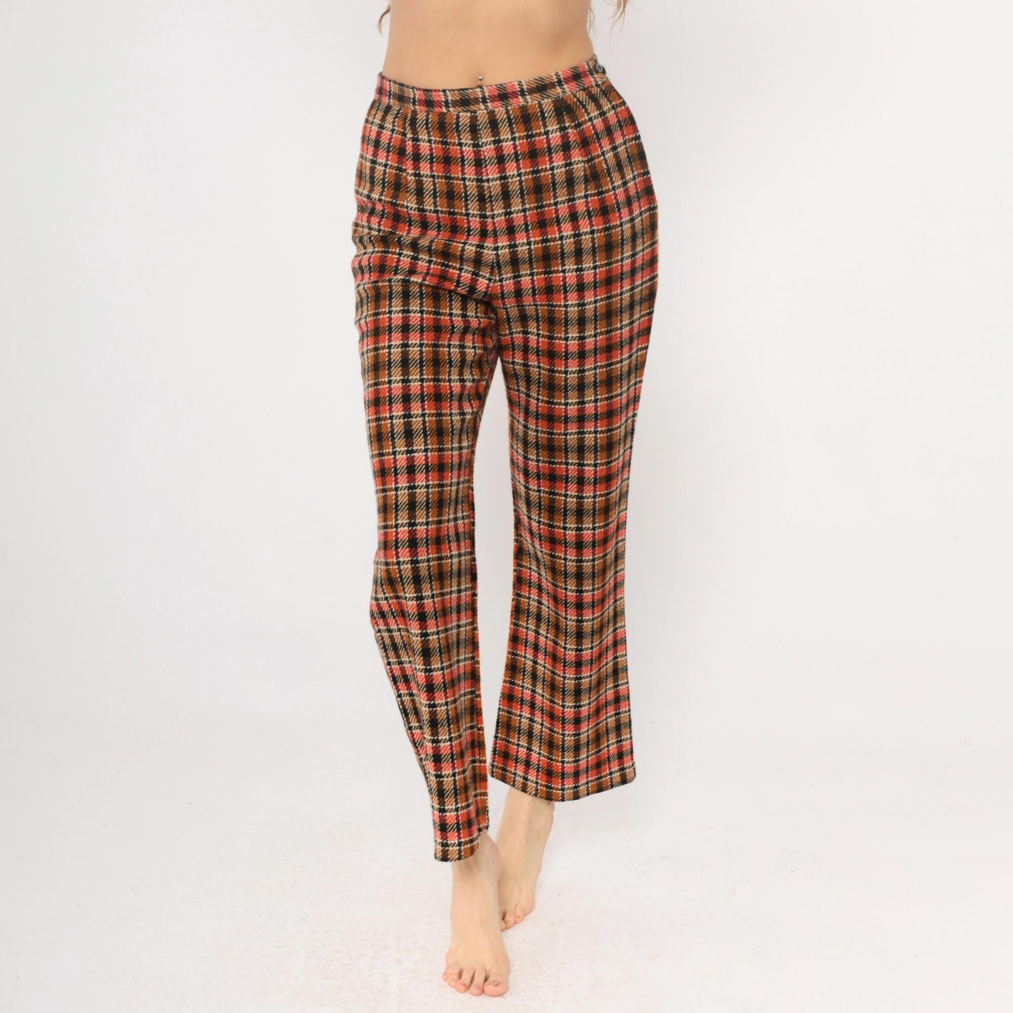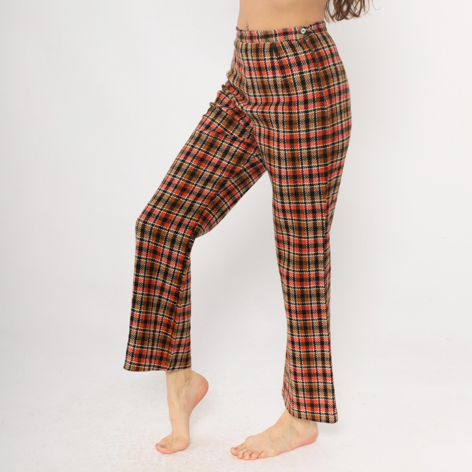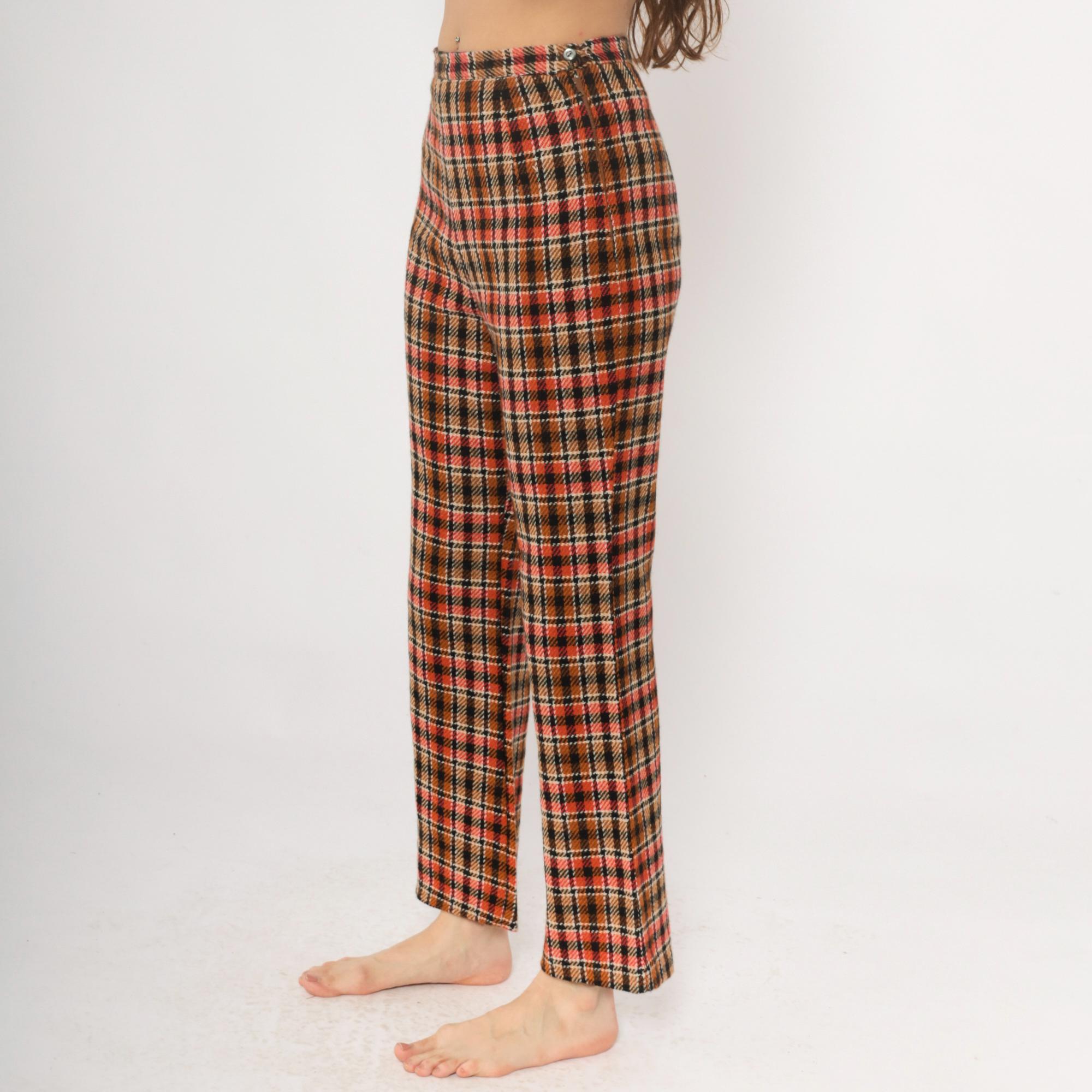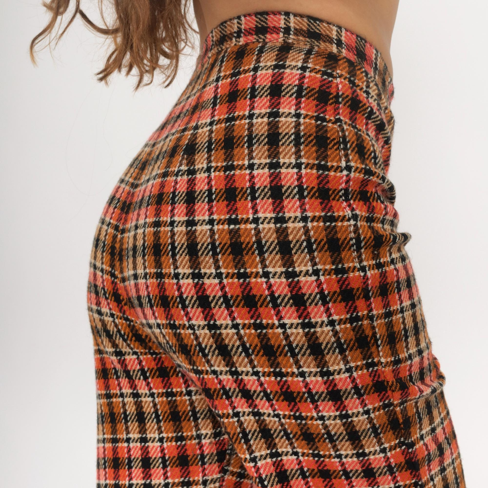 70s wide leg plaid pants in orange, brown, tan, and black houndstooth check pattern. Elastic waistband with button and zipper closure on the side.