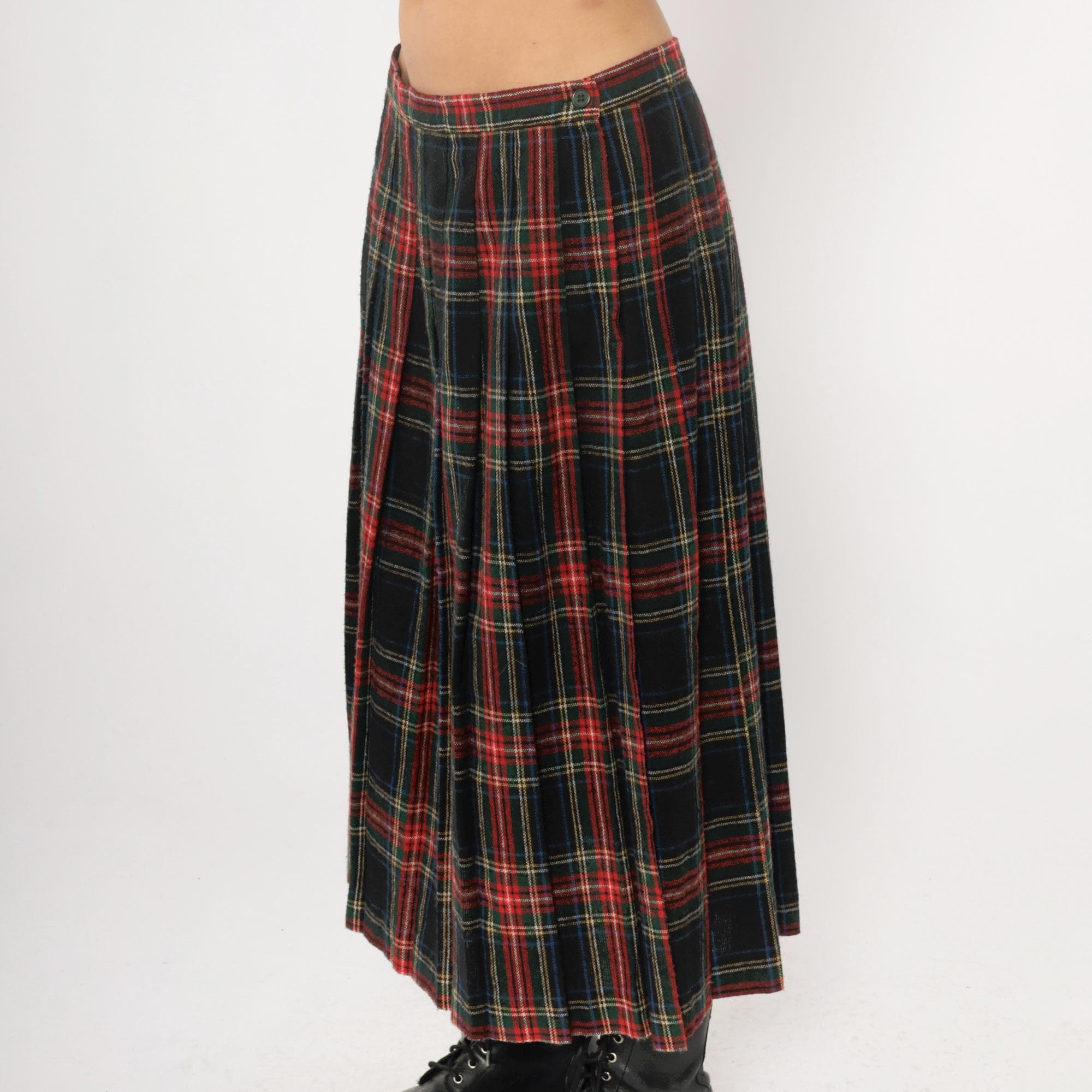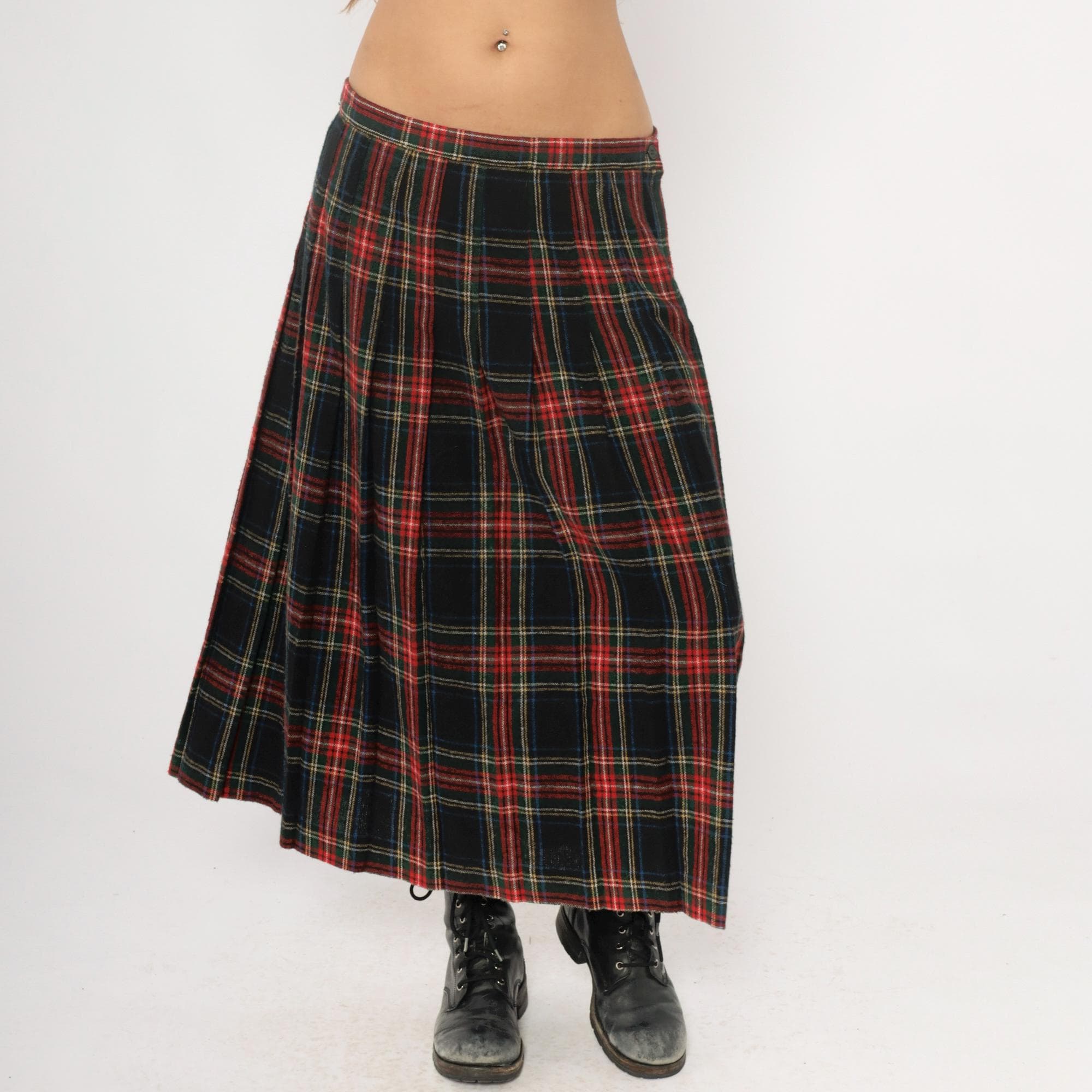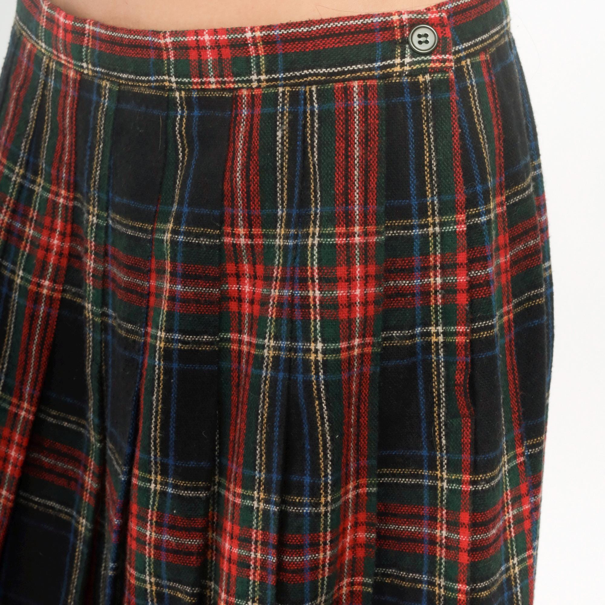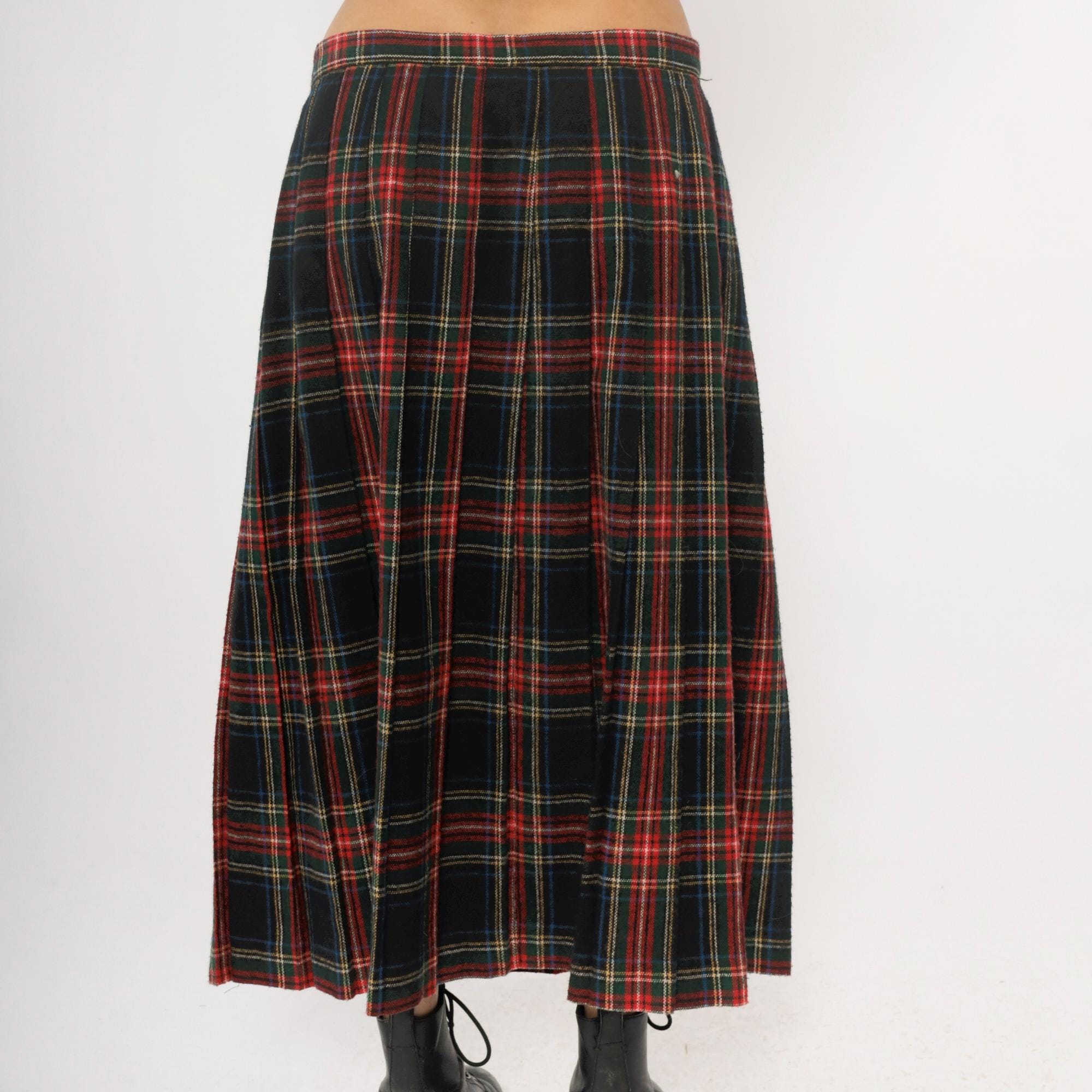 80s tartan plaid midi skirt in black with red, green, yellow, and blue intersecting lines forming classic Scottish plaid pattern. Pleated all around with button closure at waist. Wool, polyester, and acrylic blend.