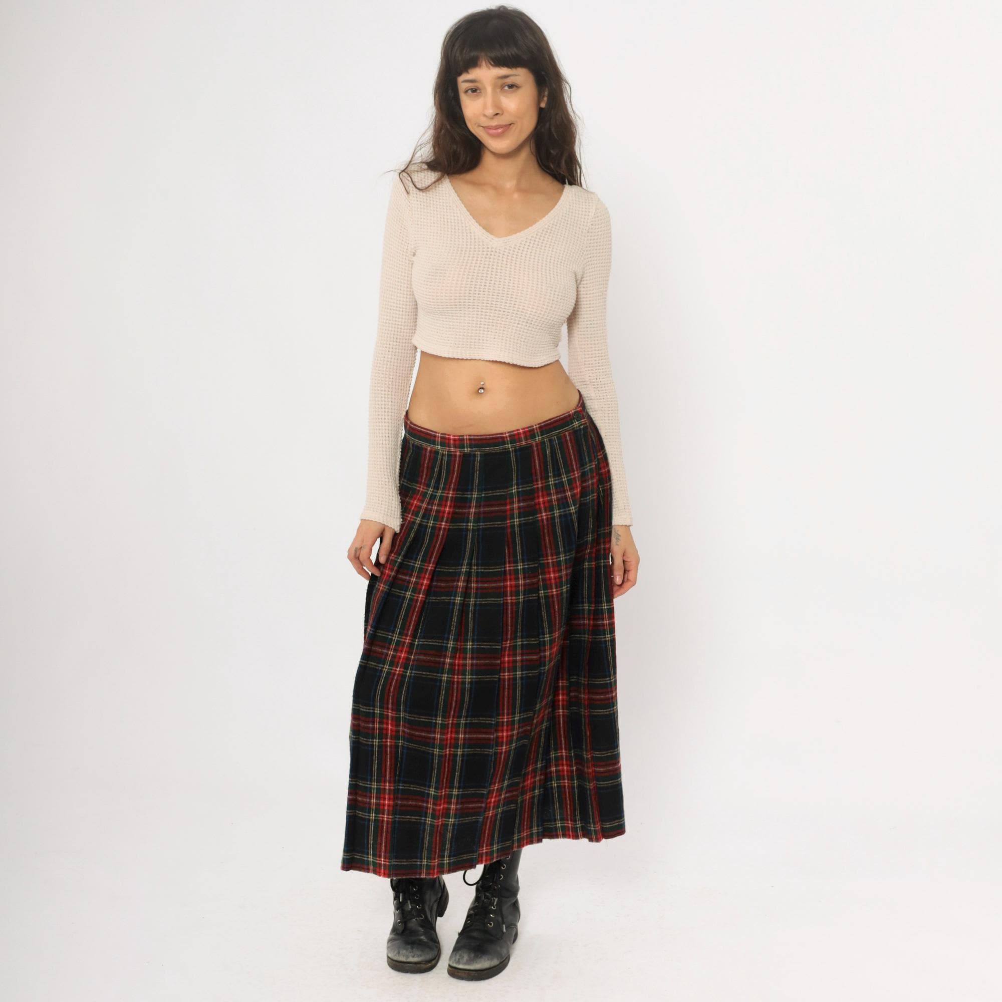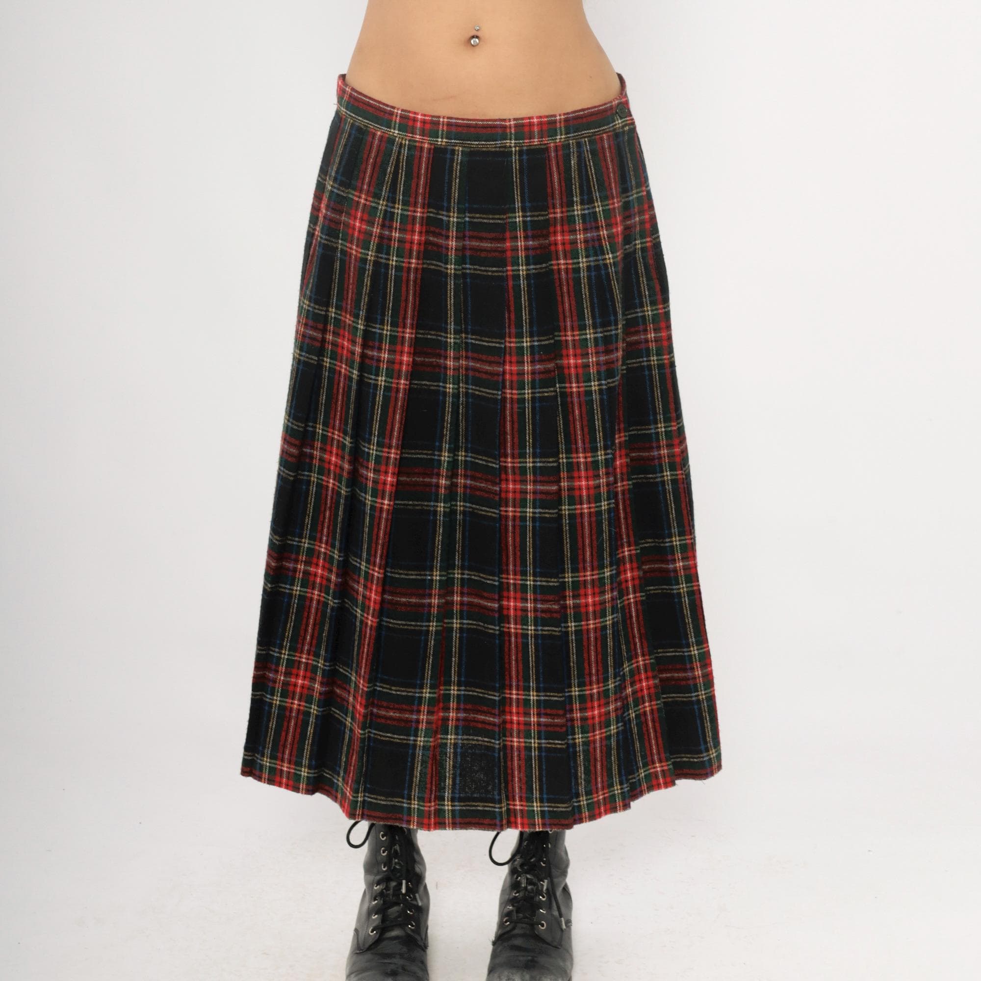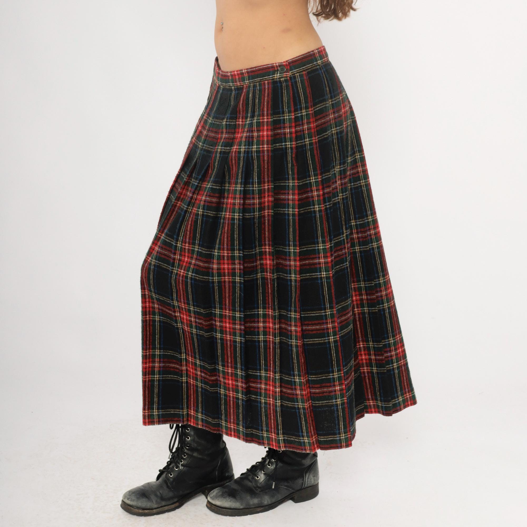 80s tartan plaid midi skirt in black with red, green, yellow, and blue intersecting lines forming classic Scottish plaid pattern. Pleated all around with button closure at waist. Wool, polyester, and acrylic blend.