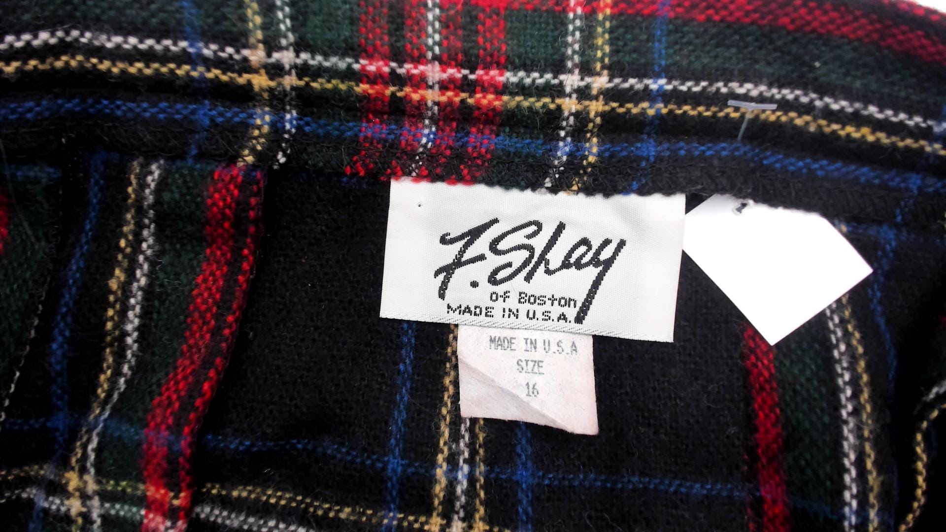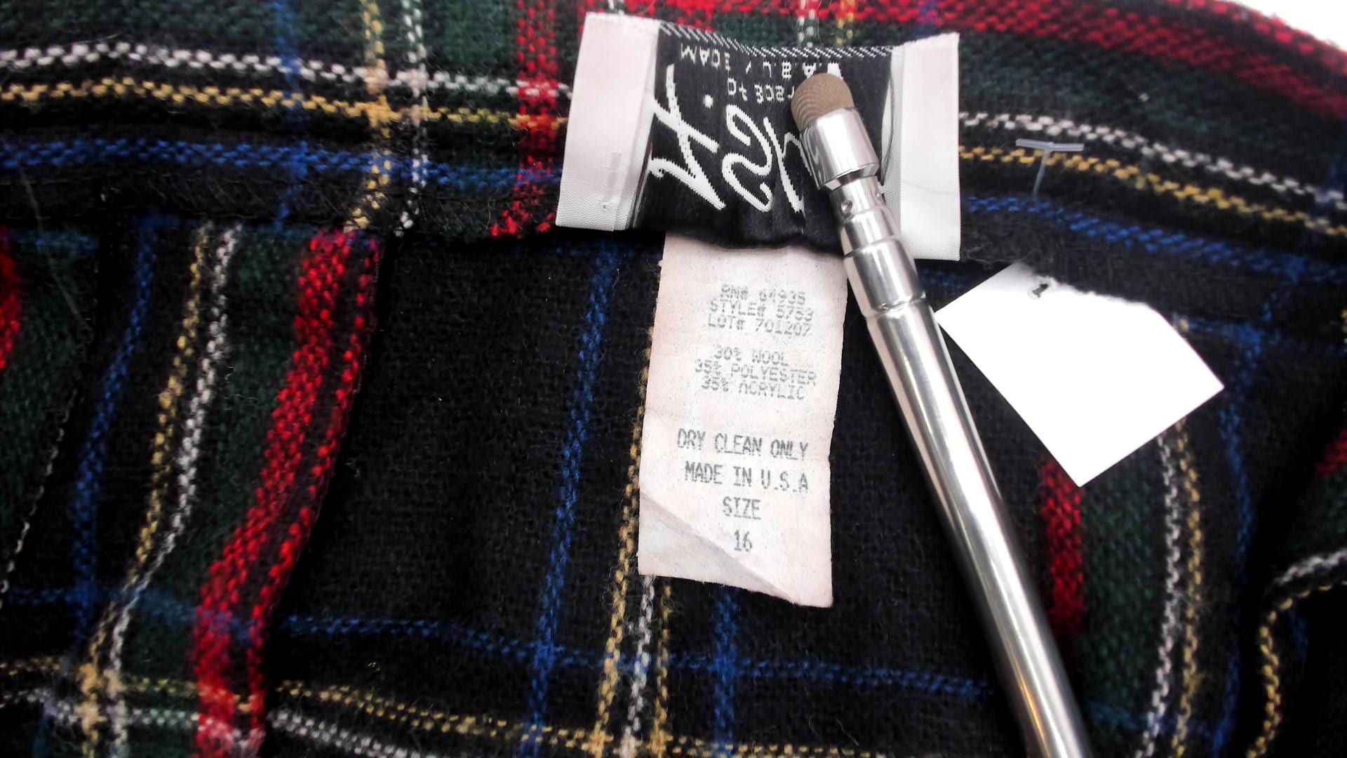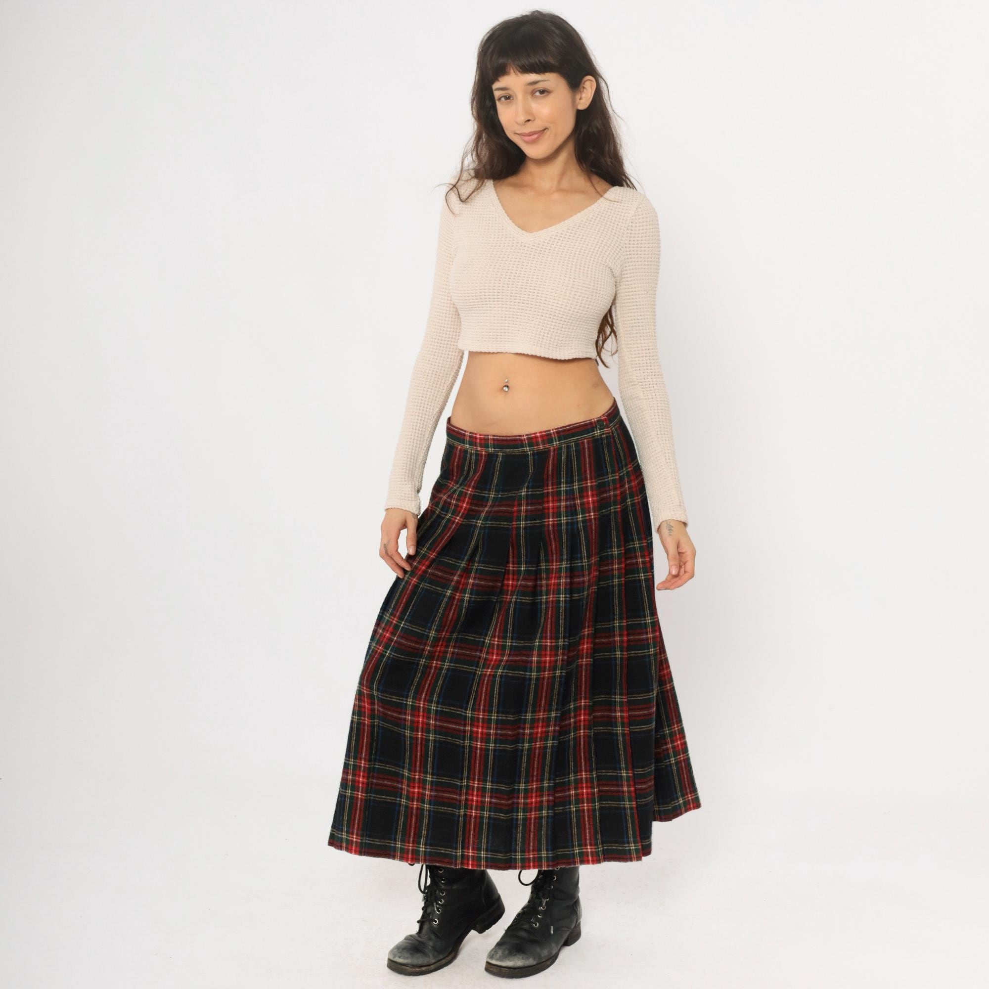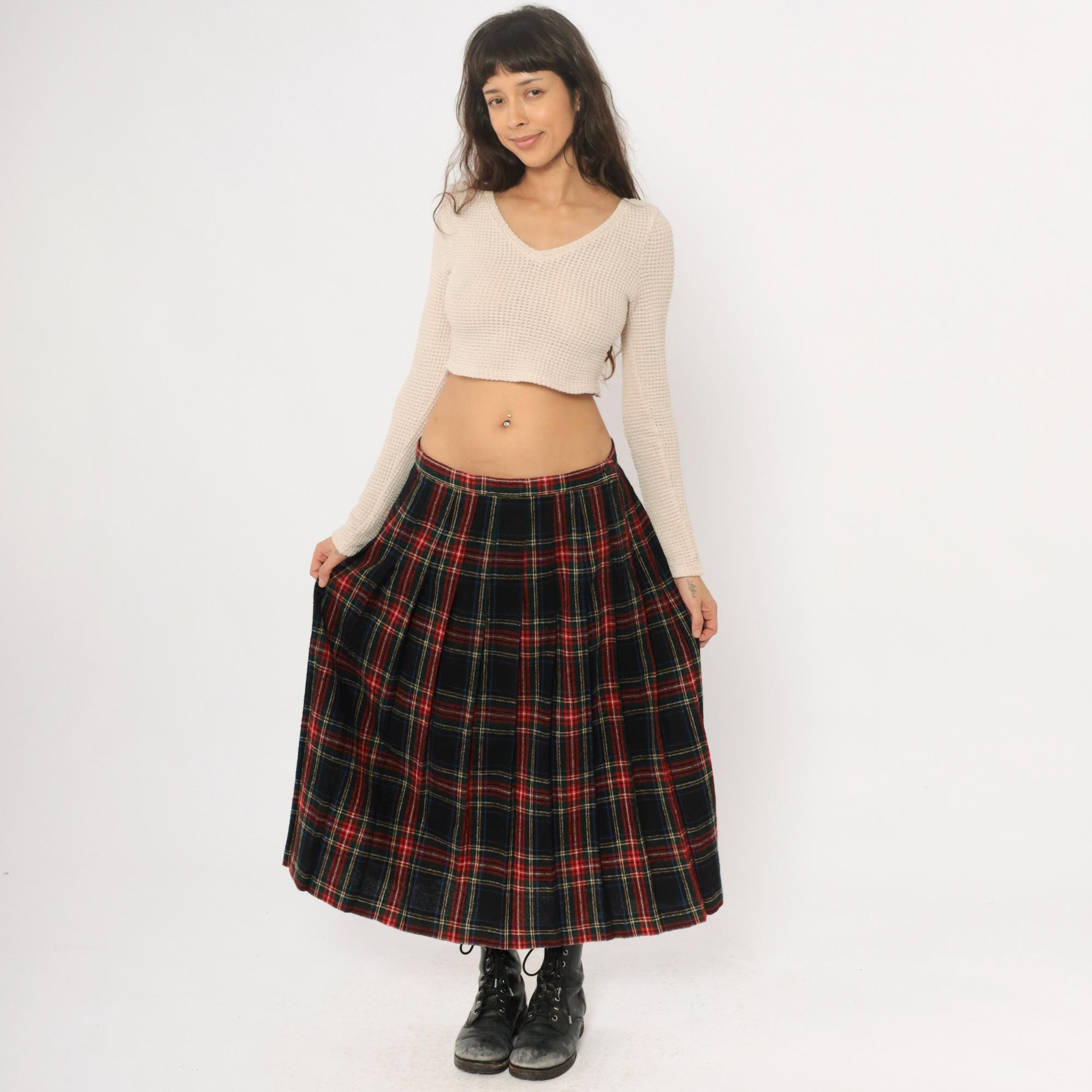 80s tartan plaid midi skirt in black with red, green, yellow, and blue intersecting lines forming classic Scottish plaid pattern. Pleated all around with button closure at waist. Wool, polyester, and acrylic blend.