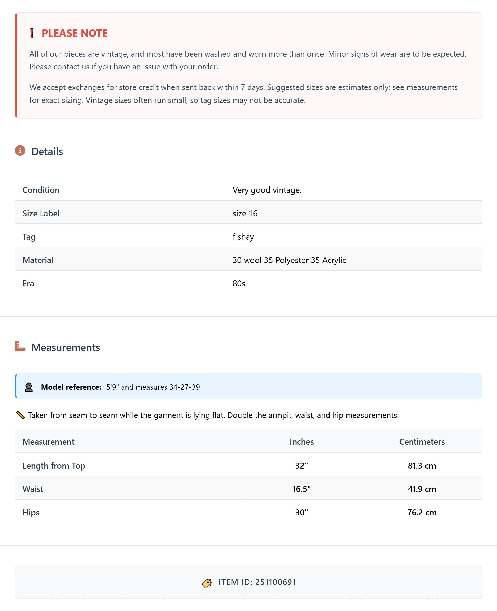 Suggested sizes are estimates only; see measurements for exact sizing. Vintage sizes often run small, so tag sizes may not be accurate.