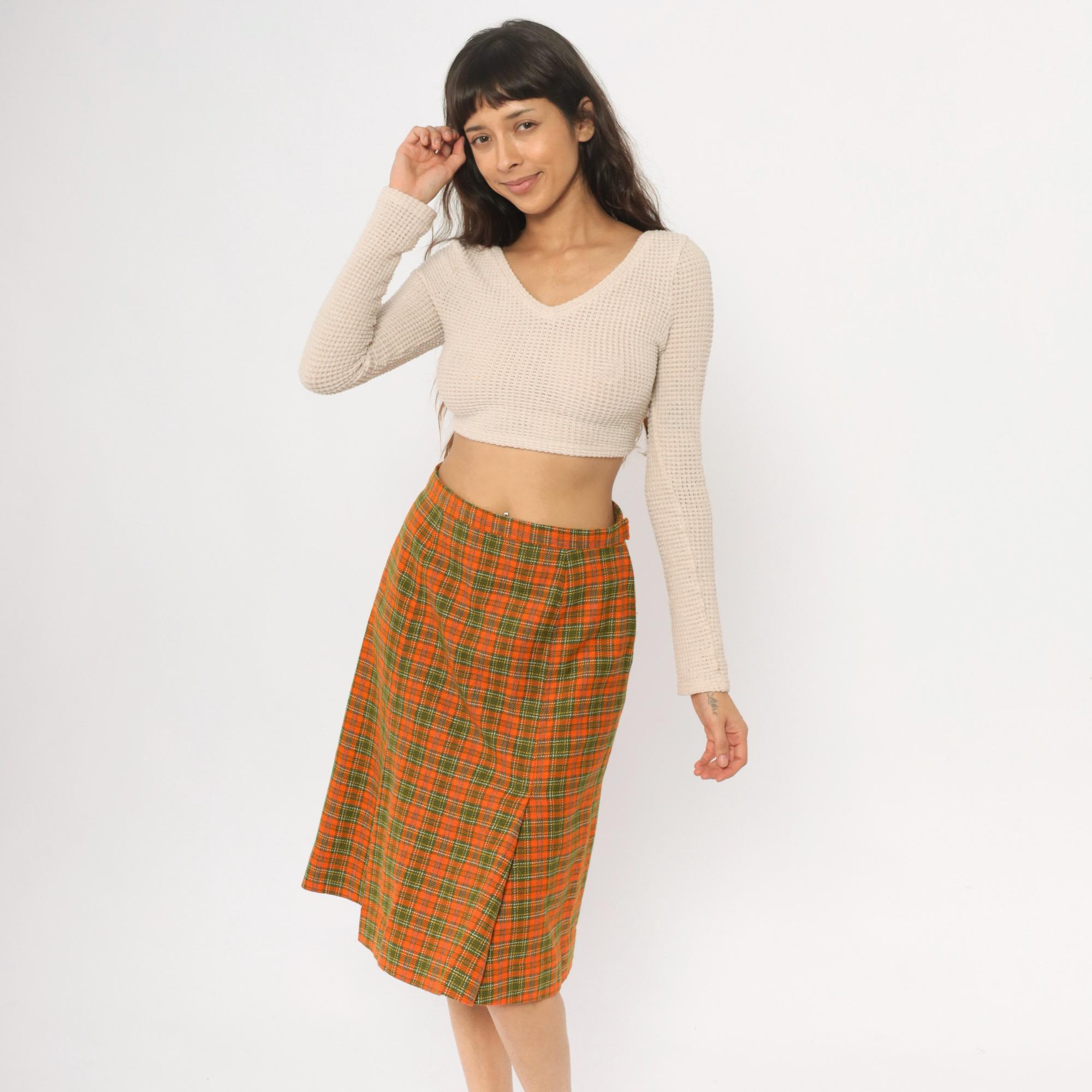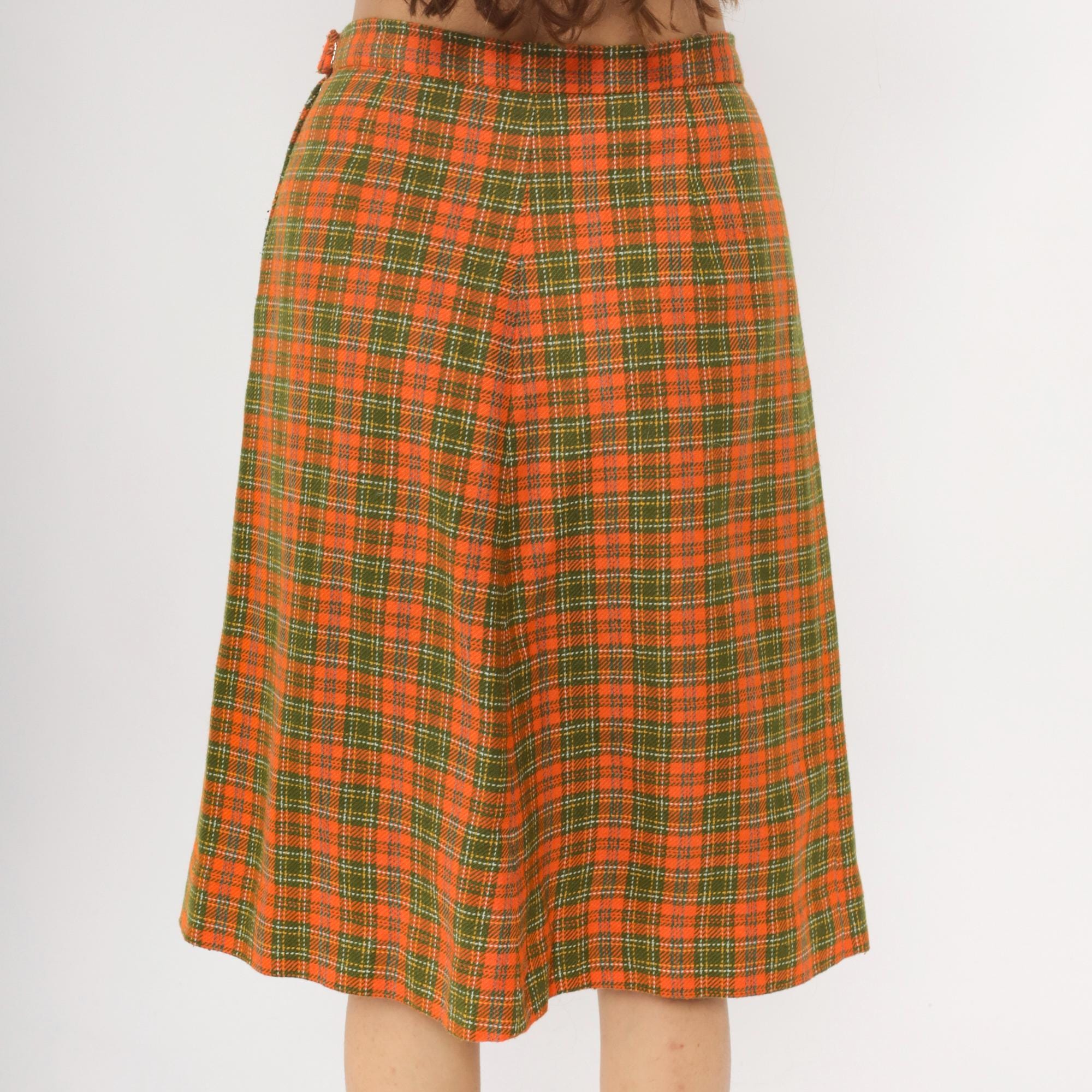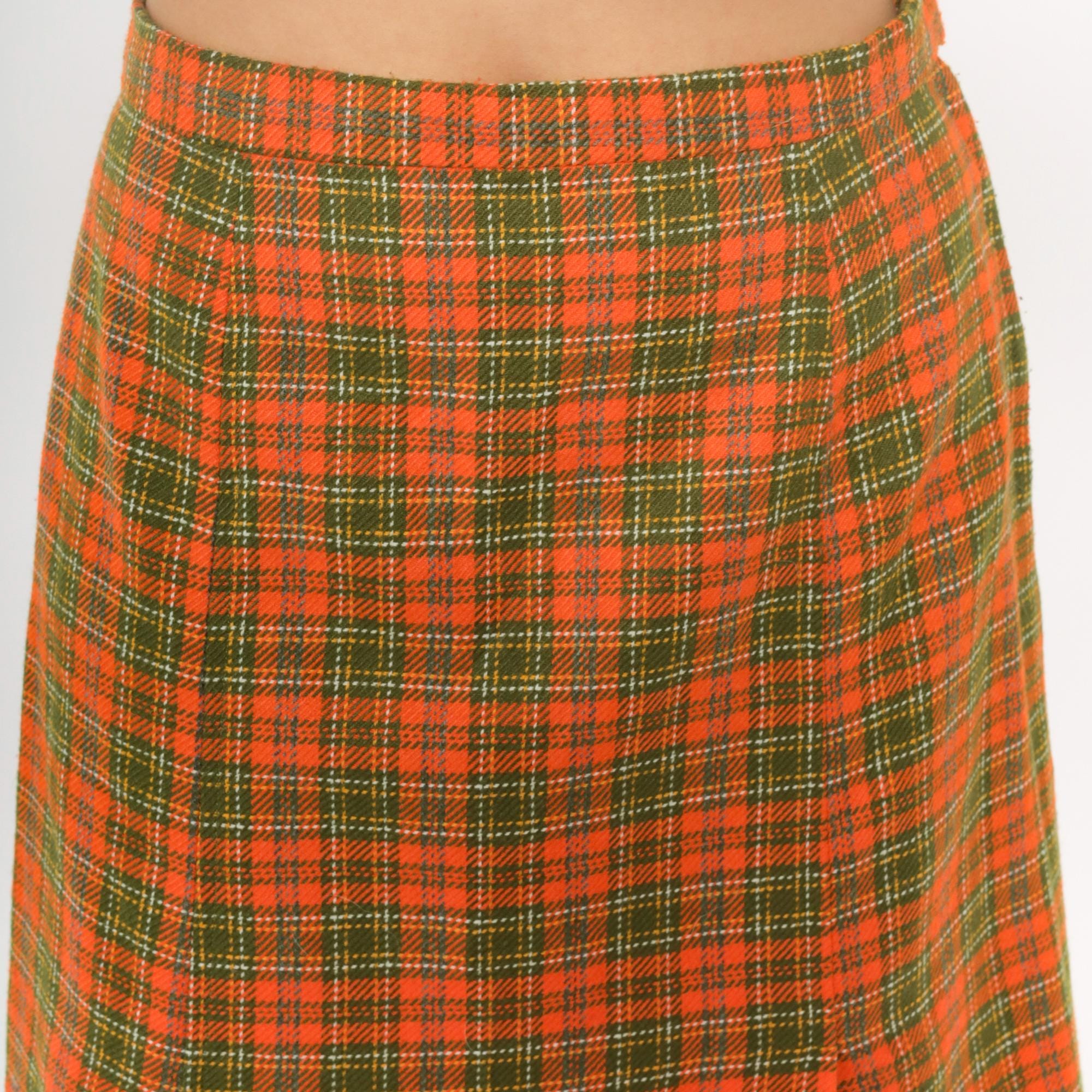 70s orange and green plaid wrap skirt with asymmetrical front overlap and structured waistband. A-line silhouette in autumn tones of orange, green, brown, and yellow plaid pattern.