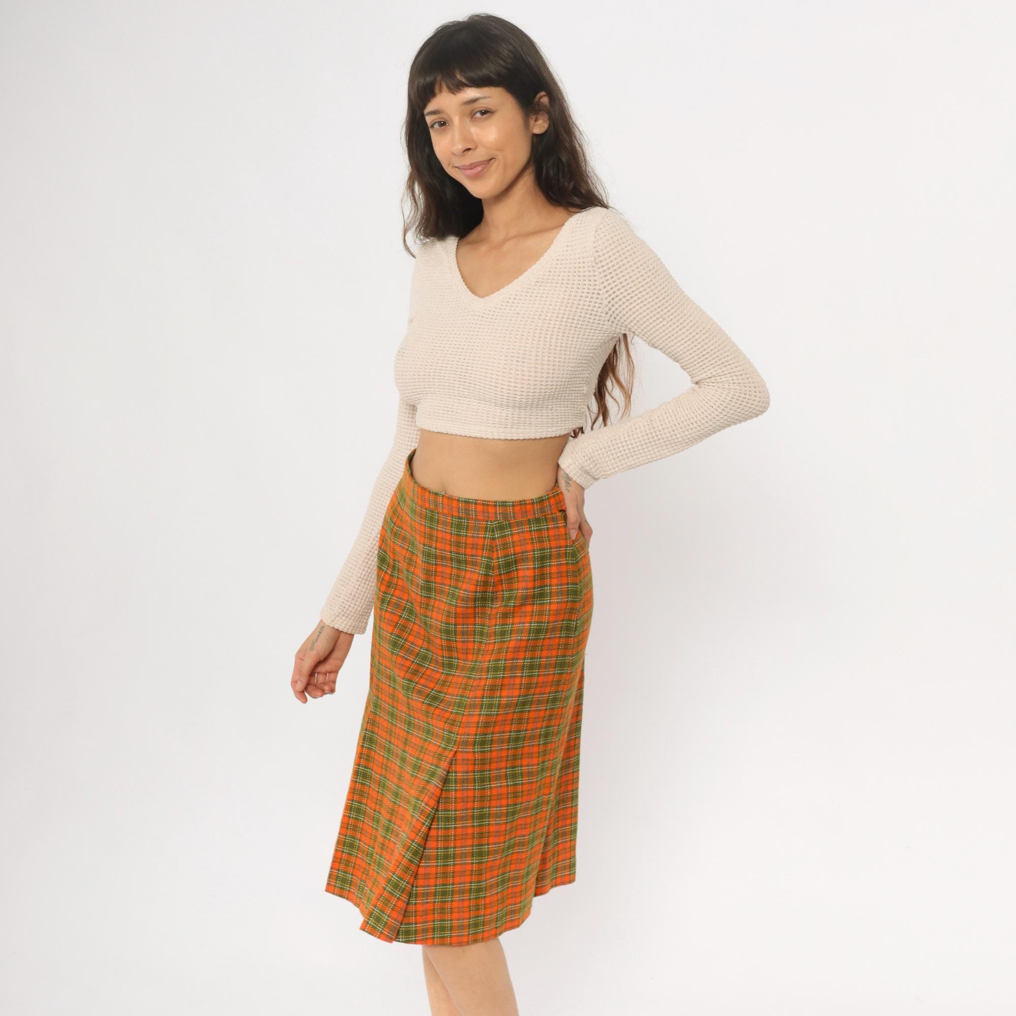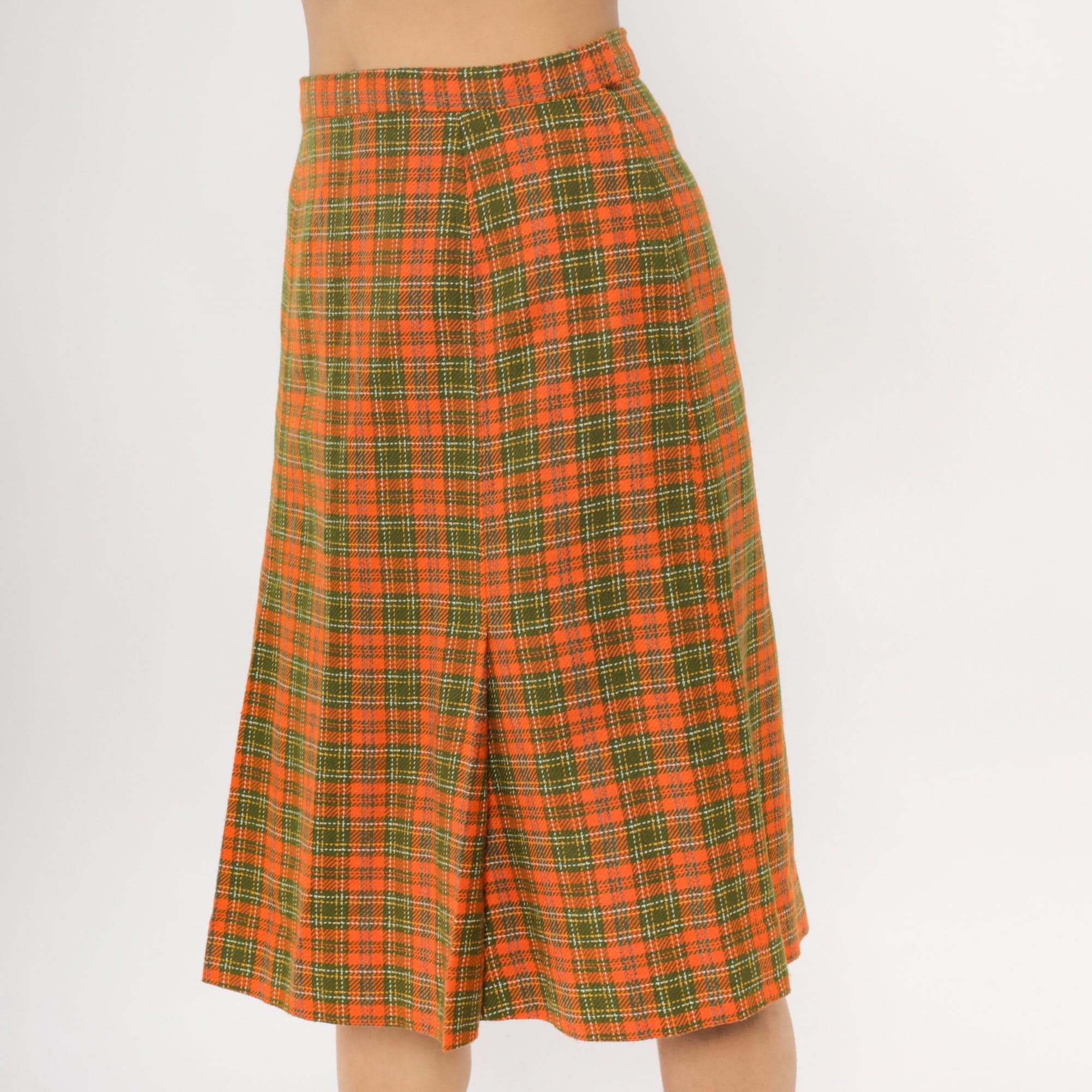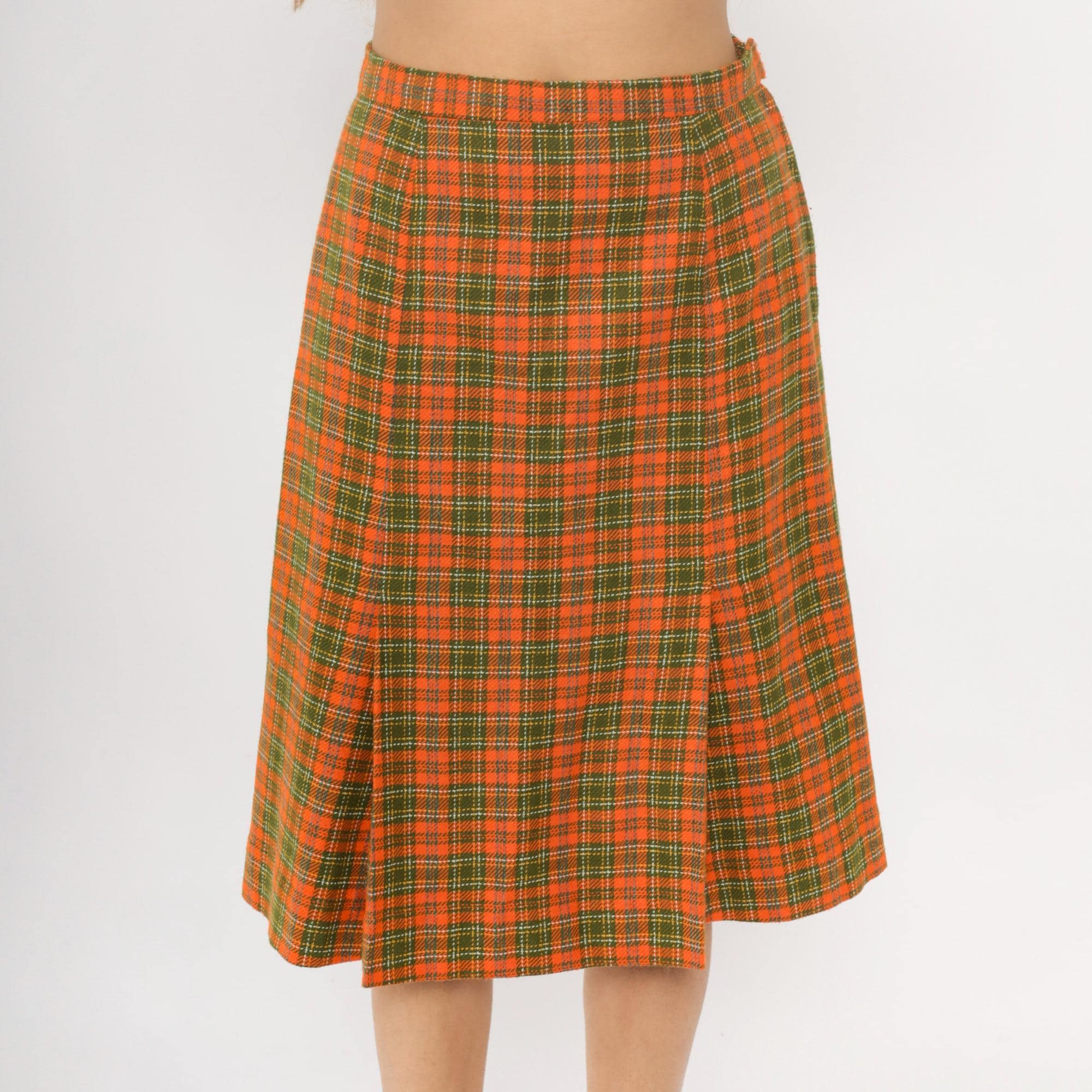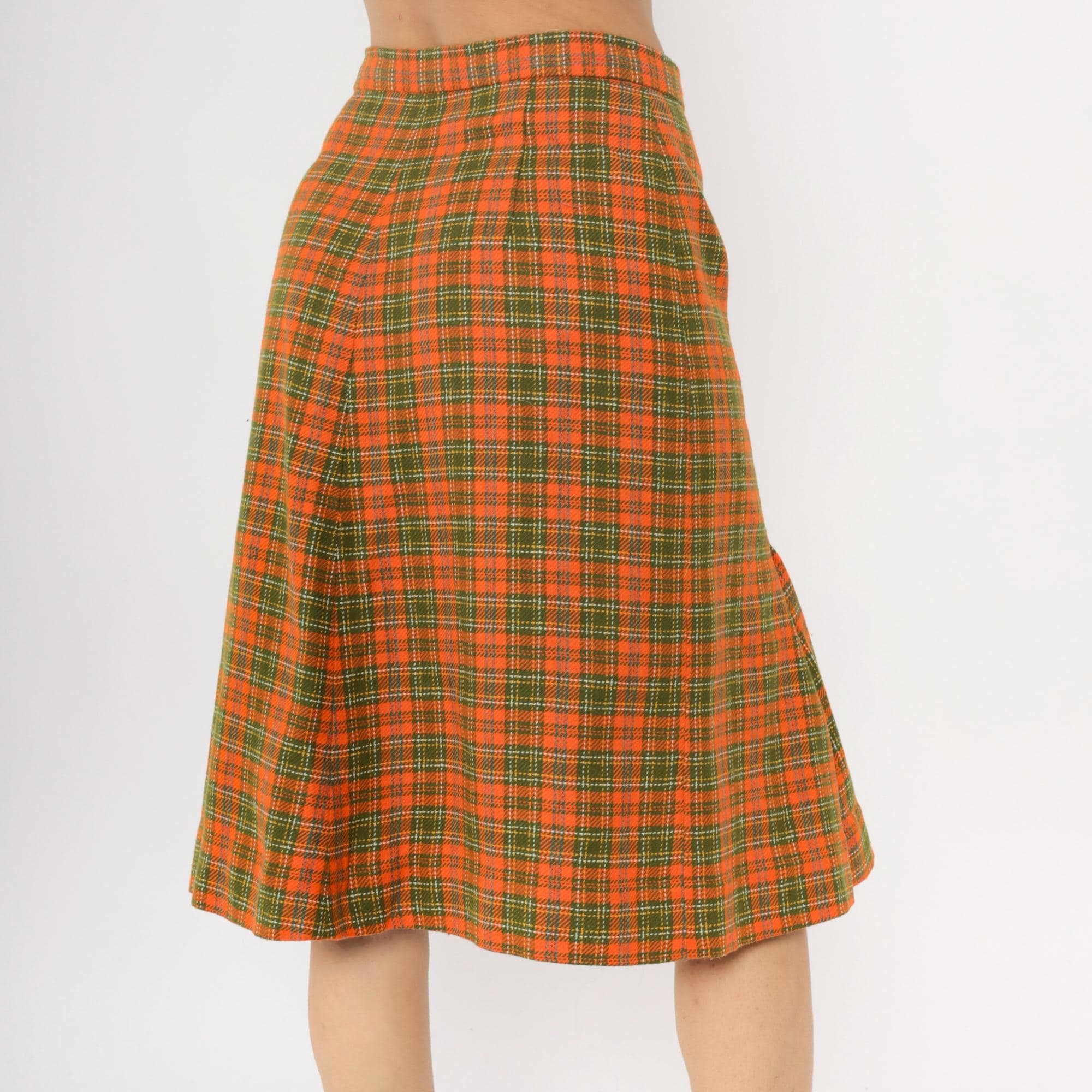 70s orange and green plaid wrap skirt with asymmetrical front overlap and structured waistband. A-line silhouette in autumn tones of orange, green, brown, and yellow plaid pattern.