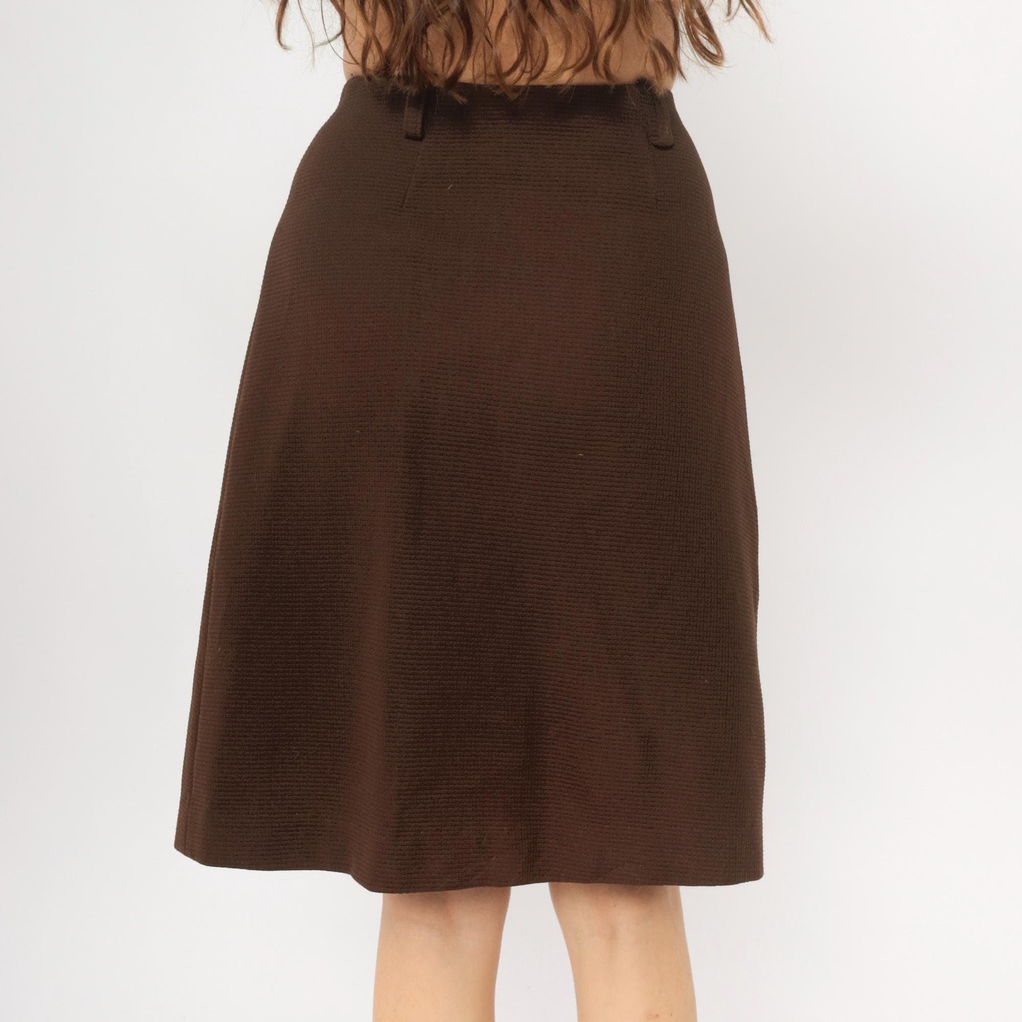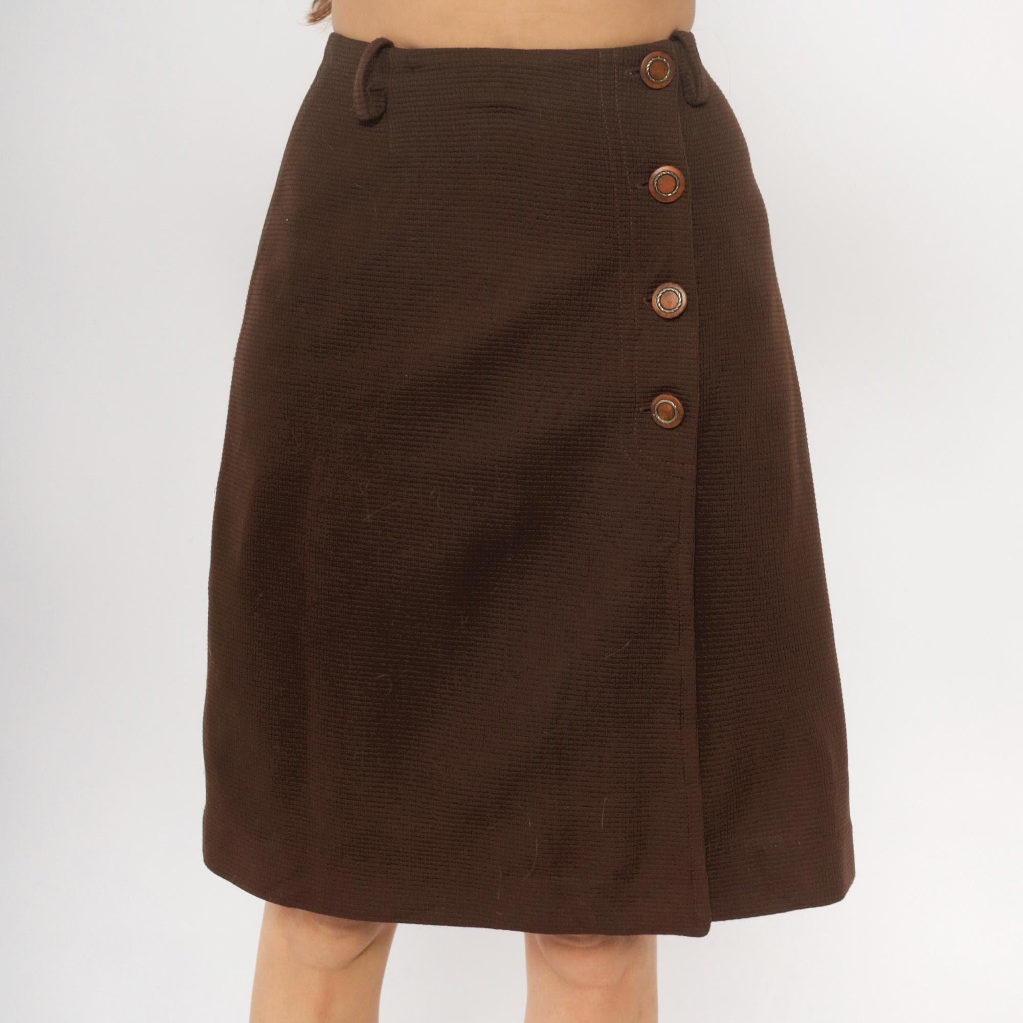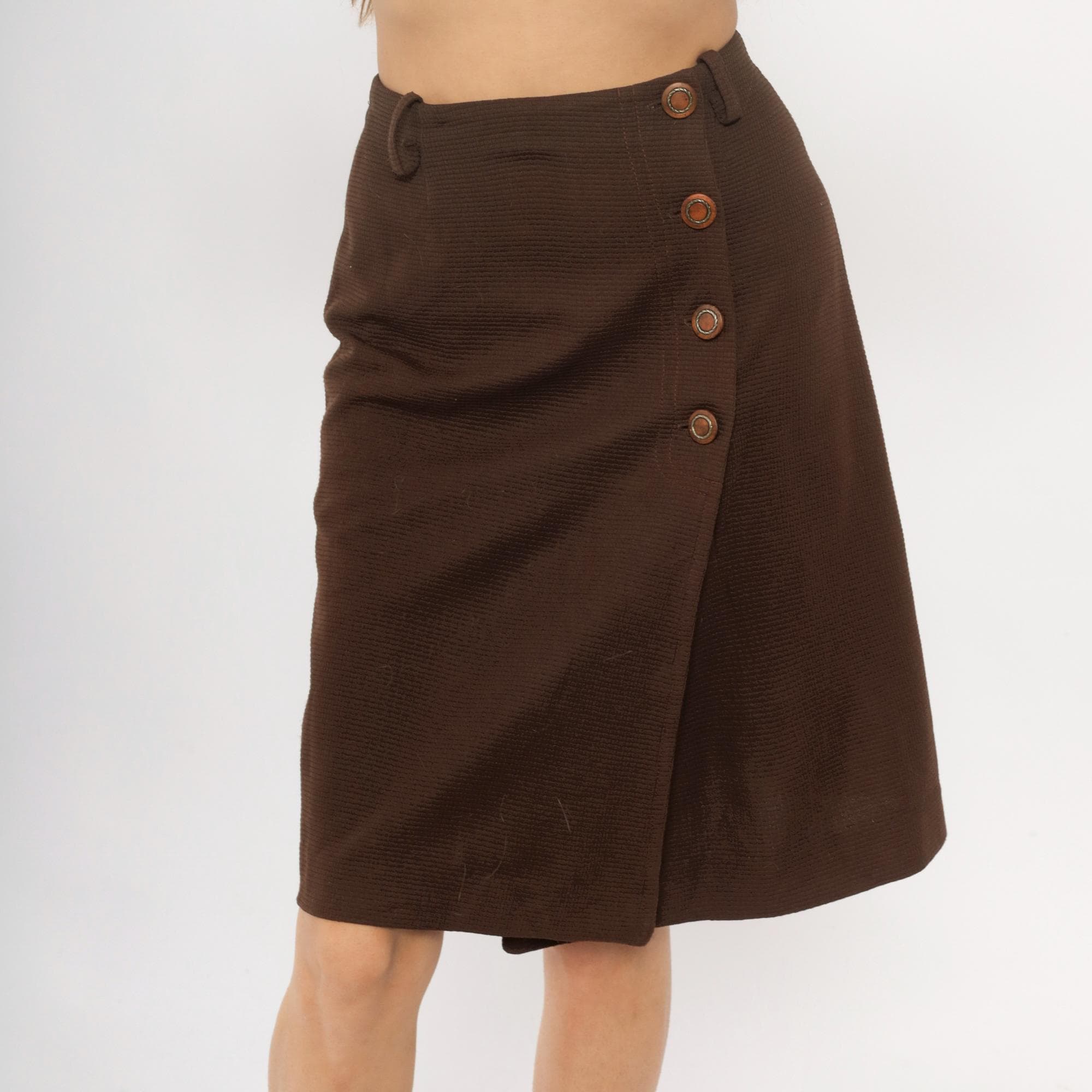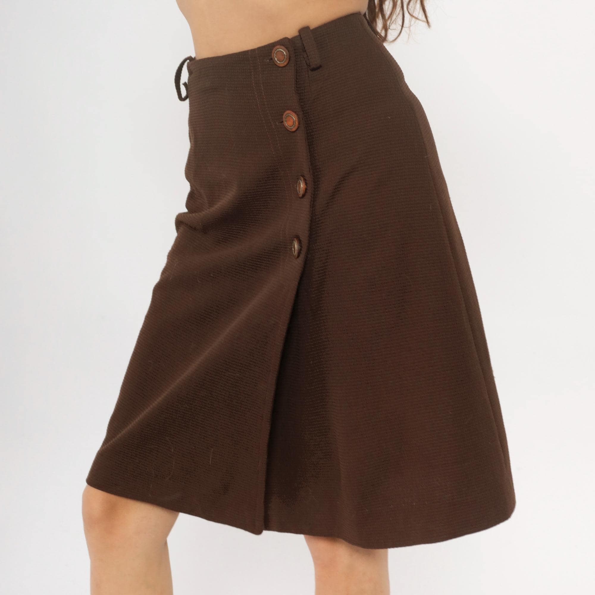 70s brown skirt in textured horizontal ribbed polyester. A-line silhouette with four decorative button closure along the left side wrap, belt loops at waist.