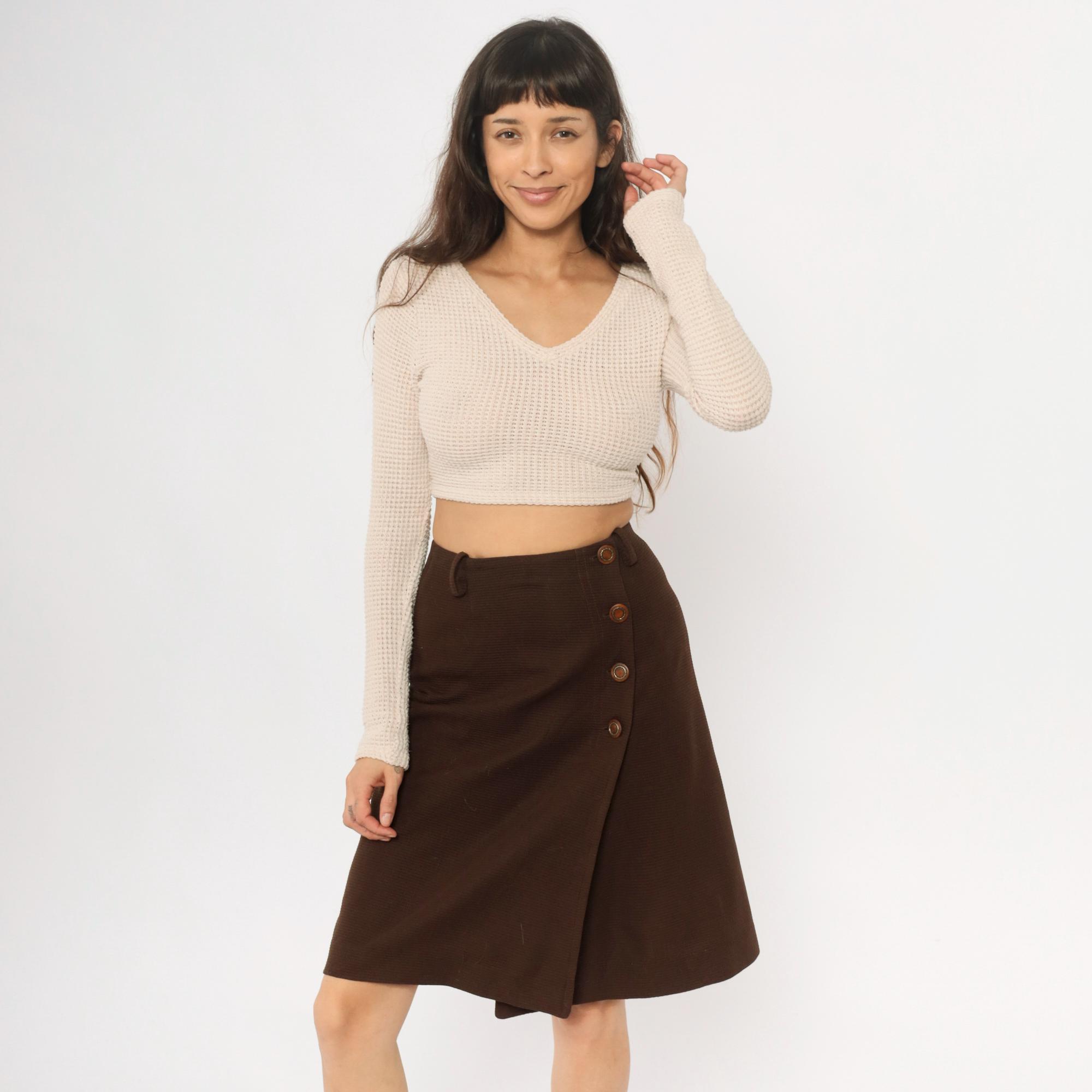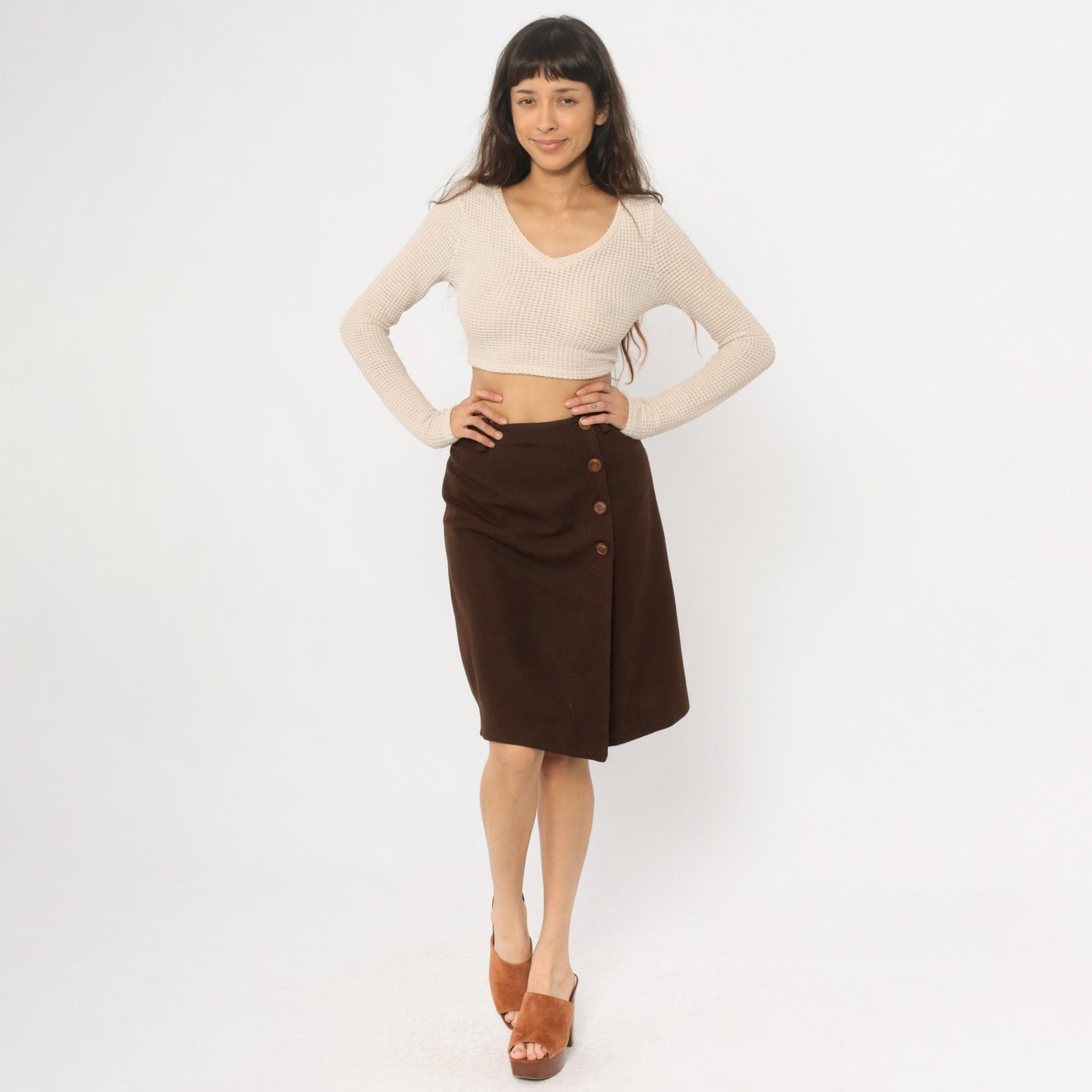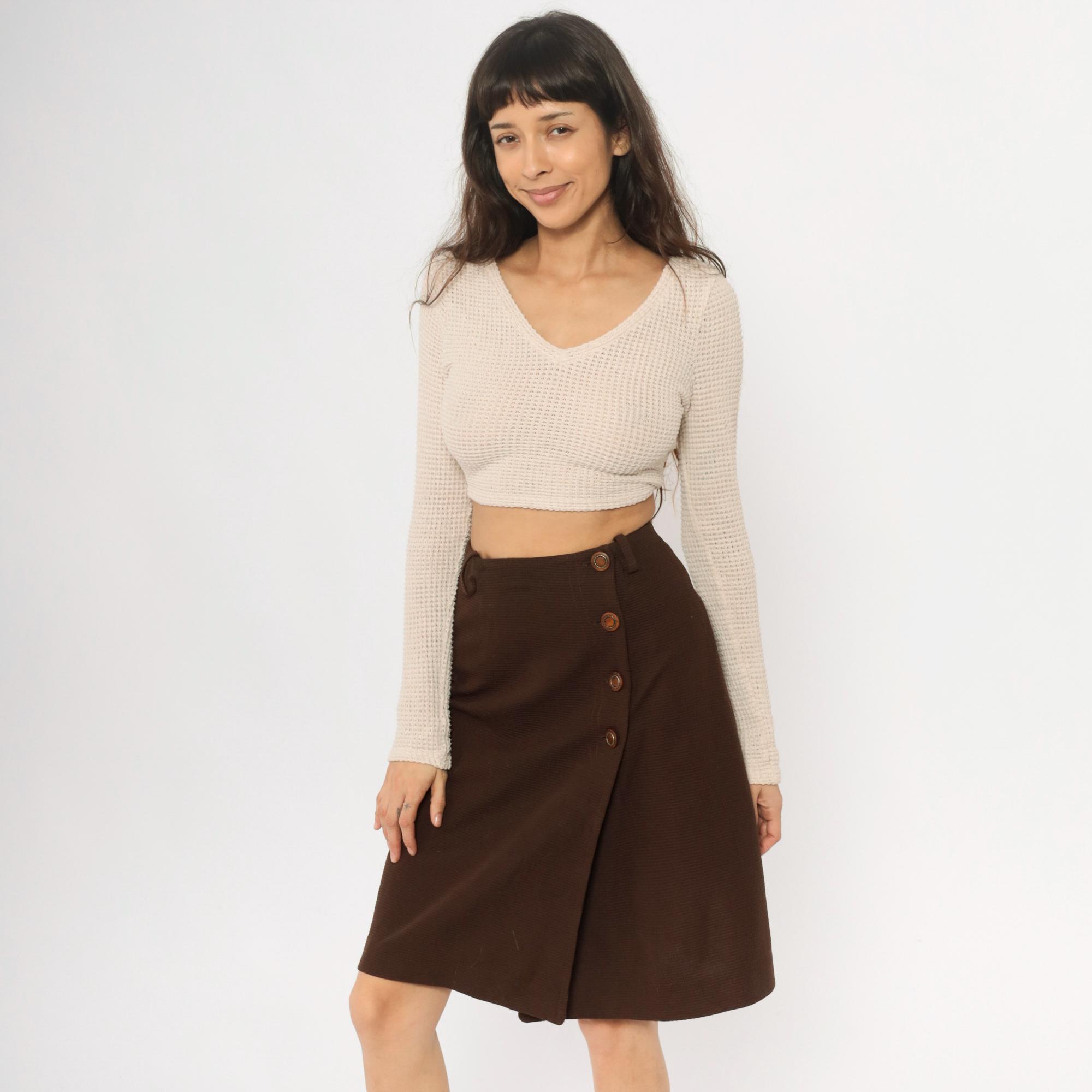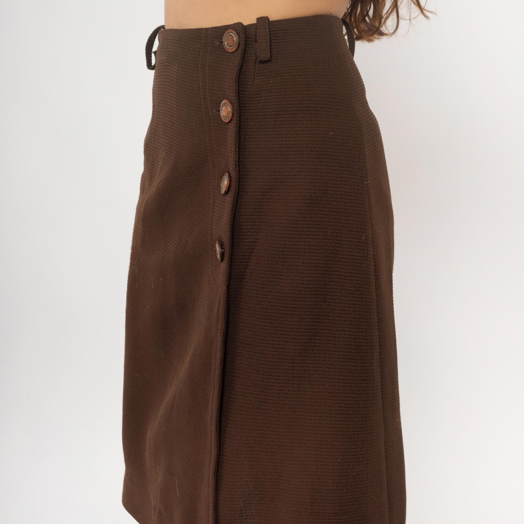 70s brown skirt in textured horizontal ribbed polyester. A-line silhouette with four decorative button closure along the left side wrap, belt loops at waist.