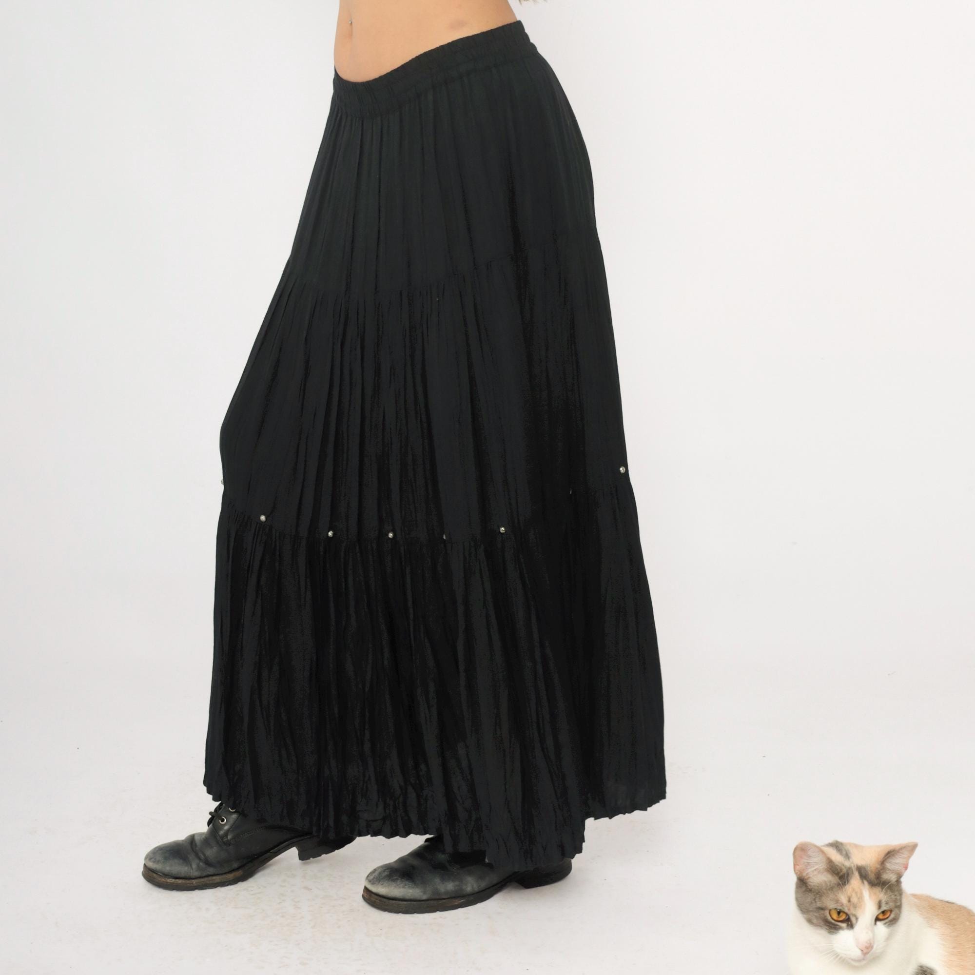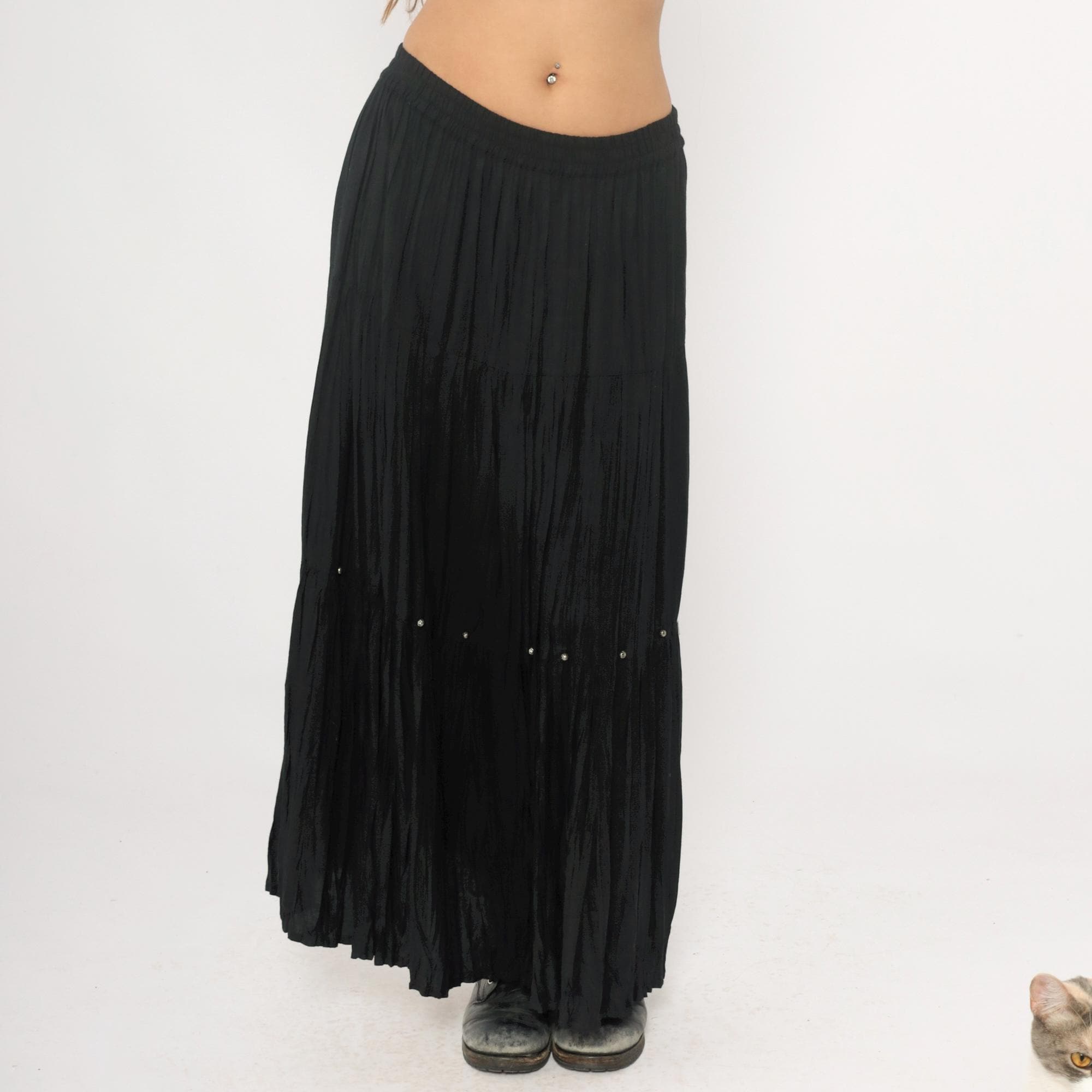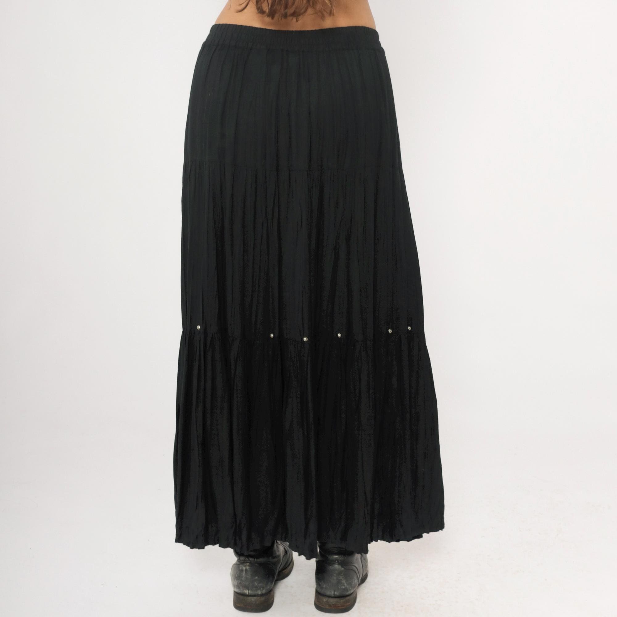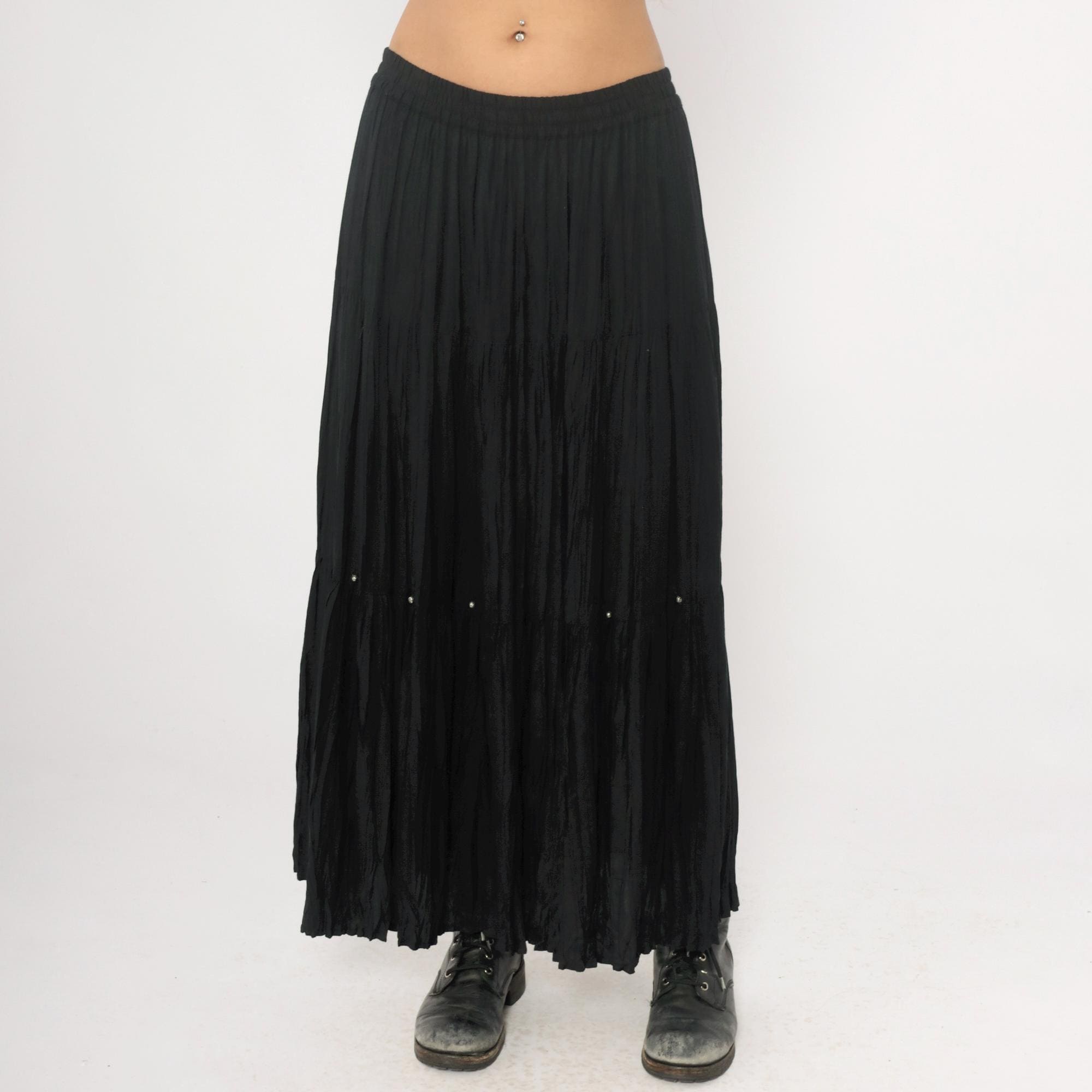 90s black maxi skirt with tiered construction and crinkled pleated texture throughout. Three tiers separated by rows of small silver studs, elastic waistband.
