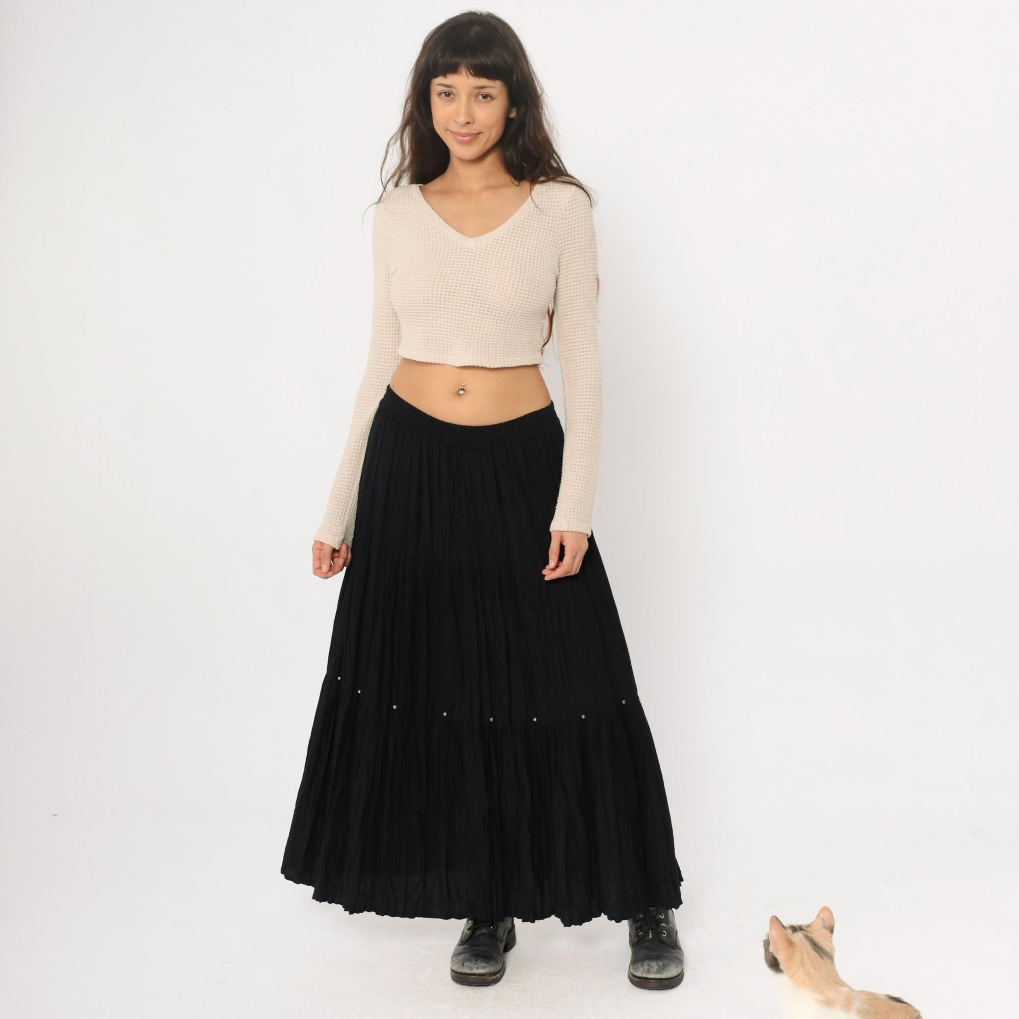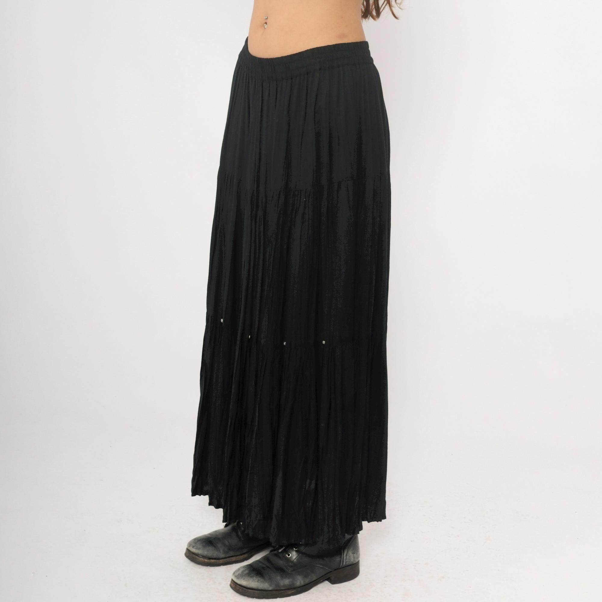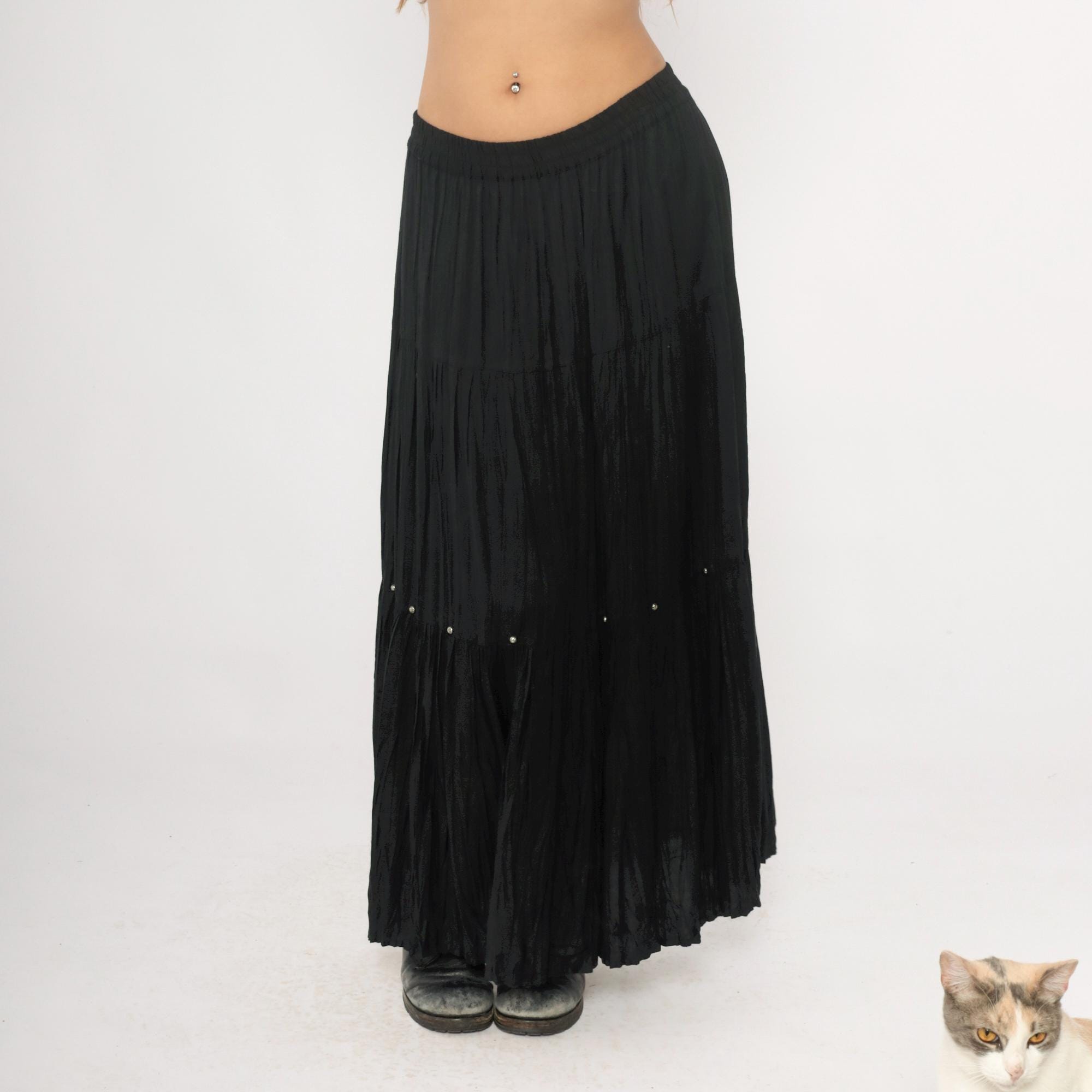 90s black maxi skirt with tiered construction and crinkled pleated texture throughout. Three tiers separated by rows of small silver studs, elastic waistband.