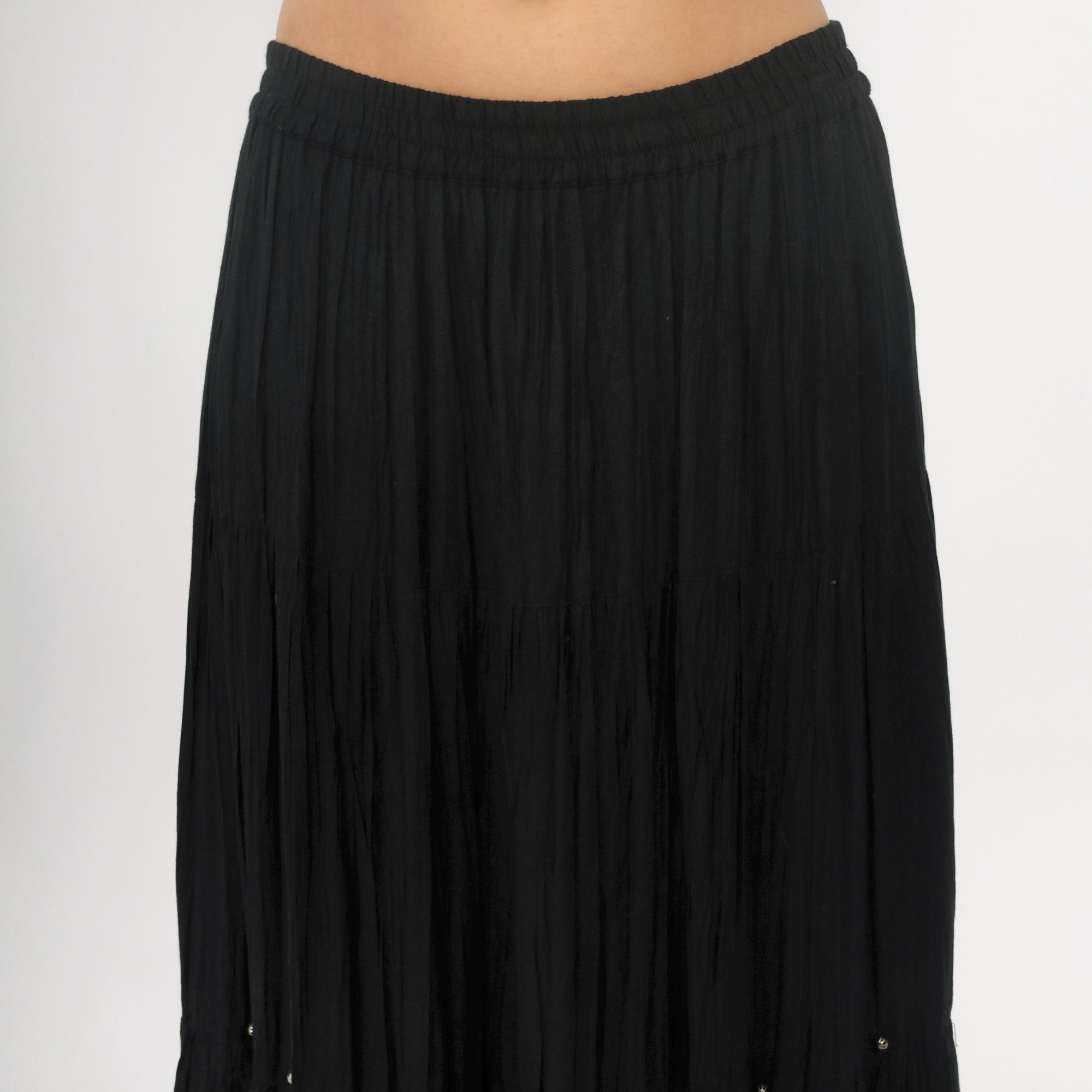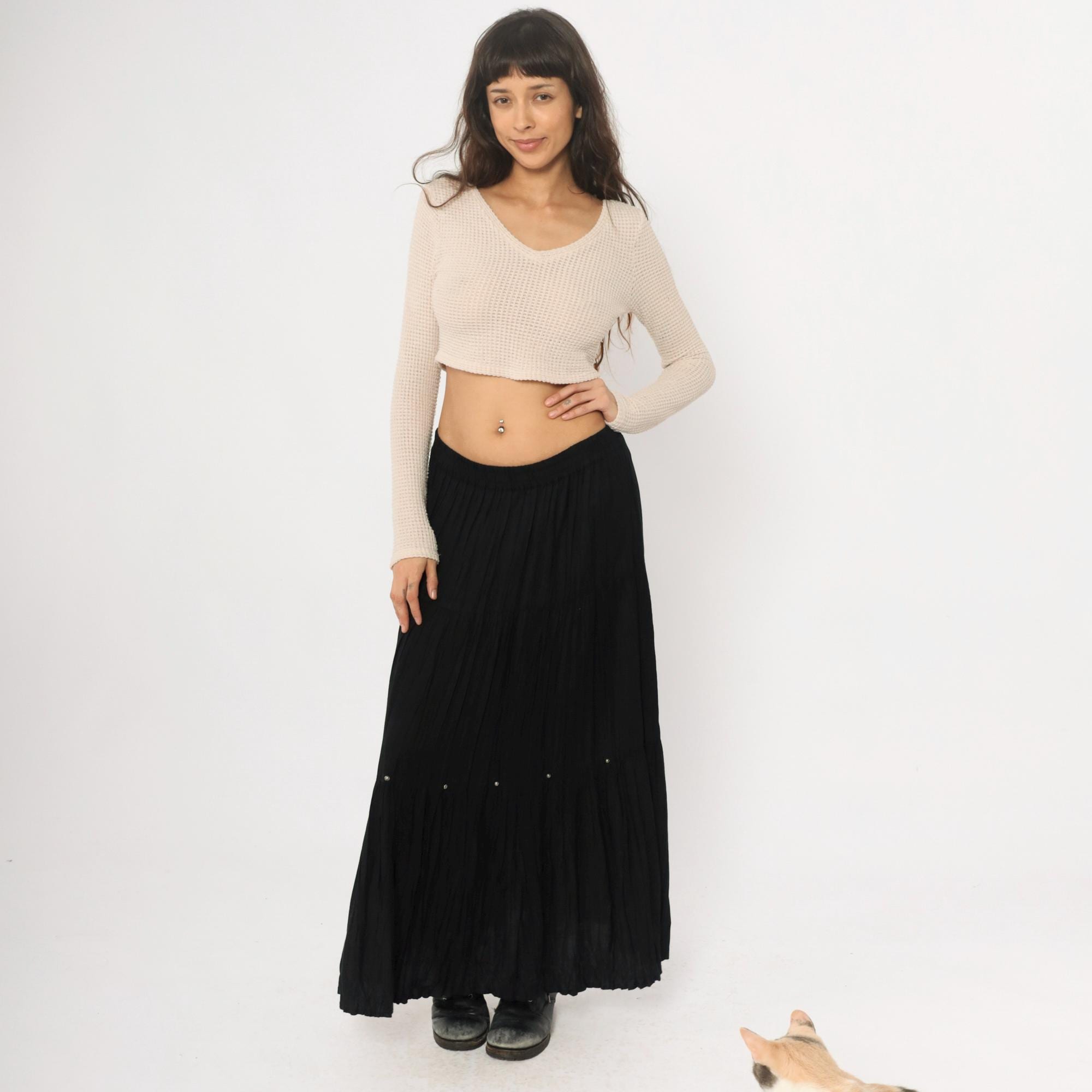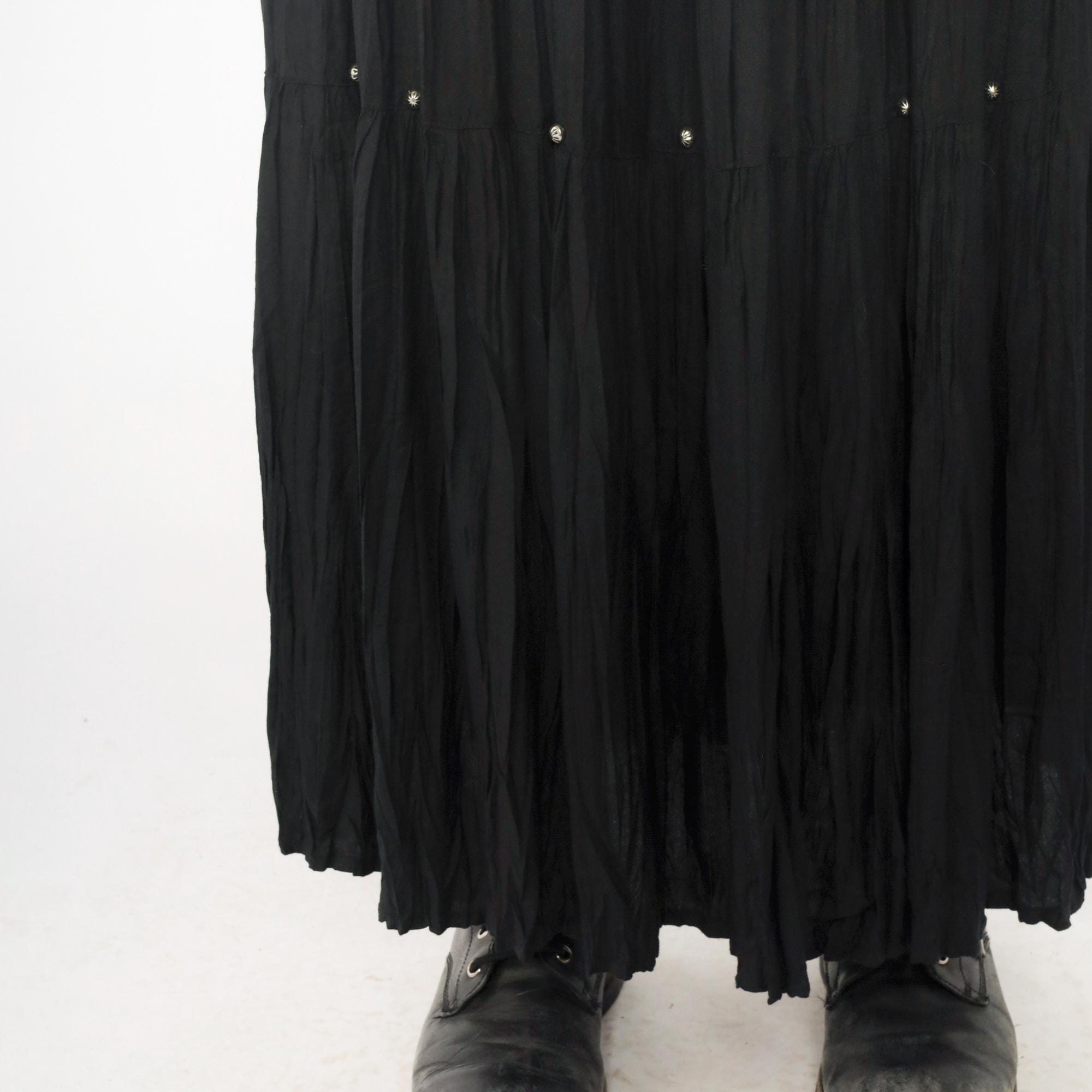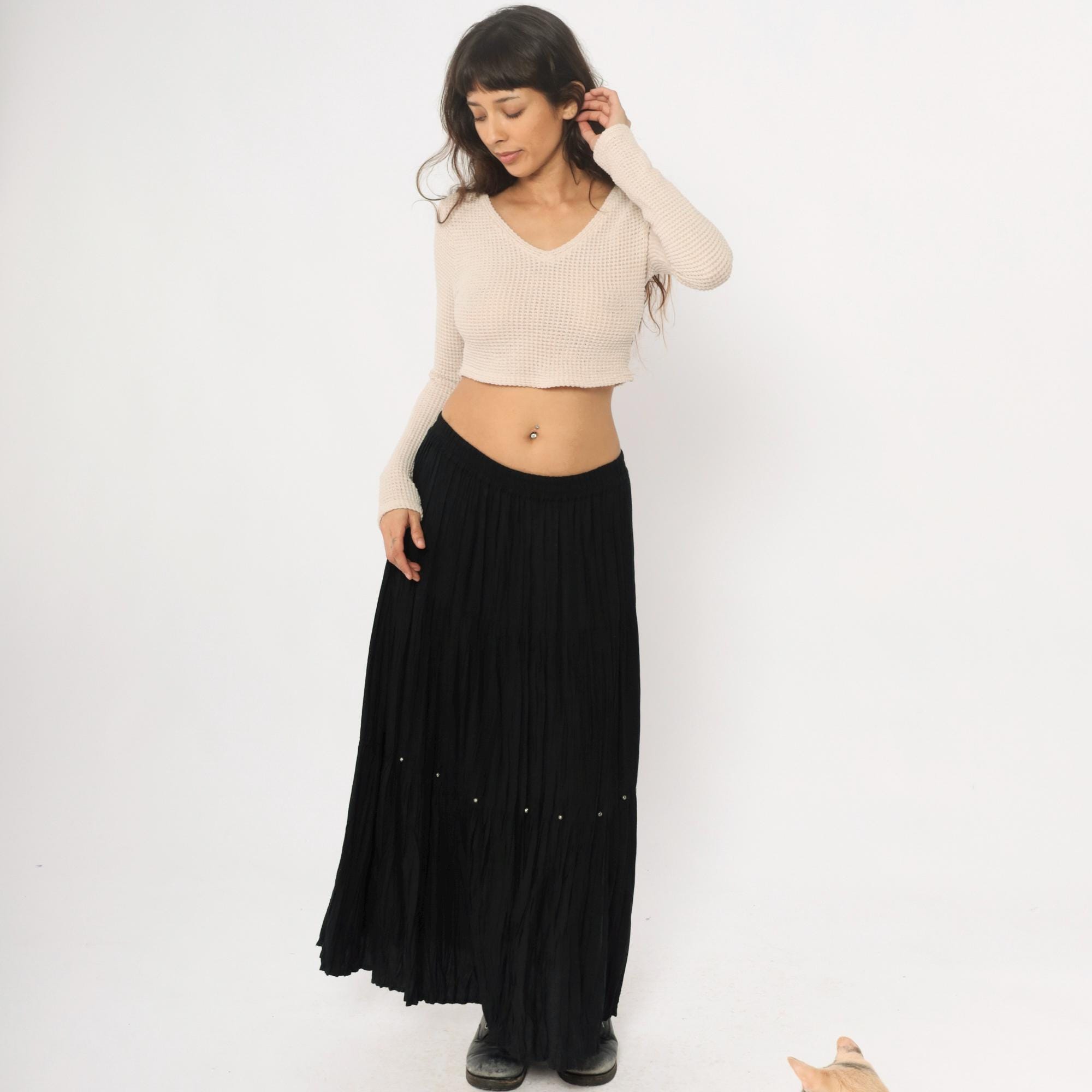90s black maxi skirt with tiered construction and crinkled pleated texture throughout. Three tiers separated by rows of small silver studs, elastic waistband.