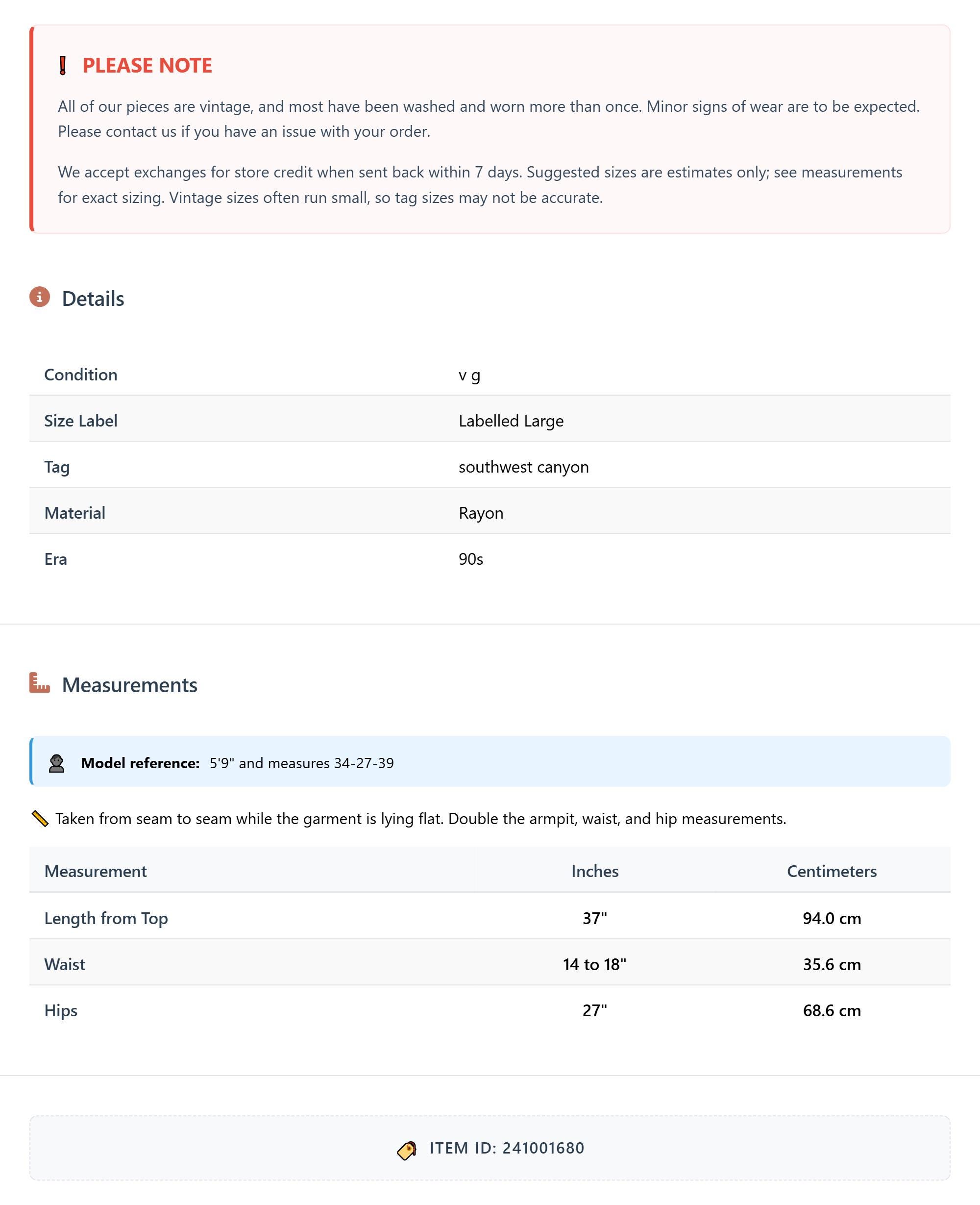 Suggested sizes are estimates only; see measurements for exact sizing. Vintage sizes often run small, so tag sizes may not be accurate.