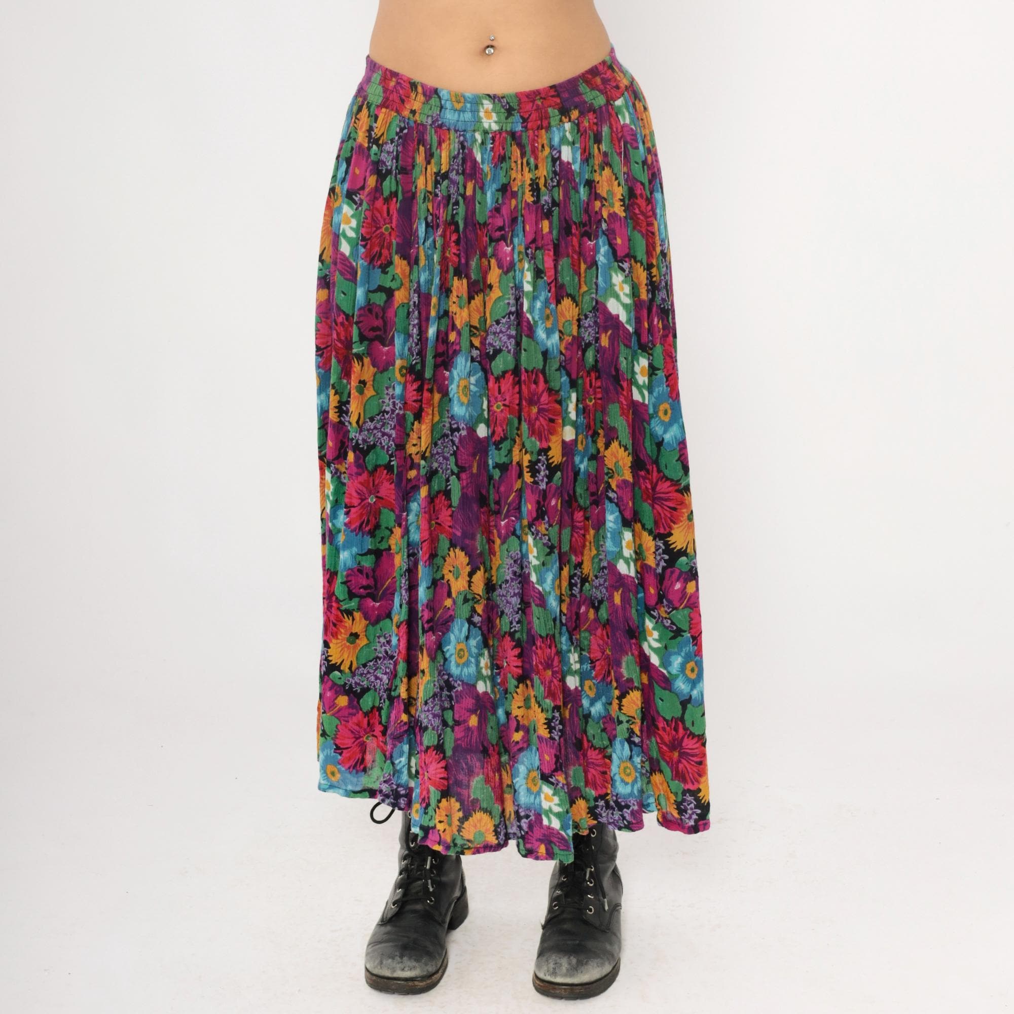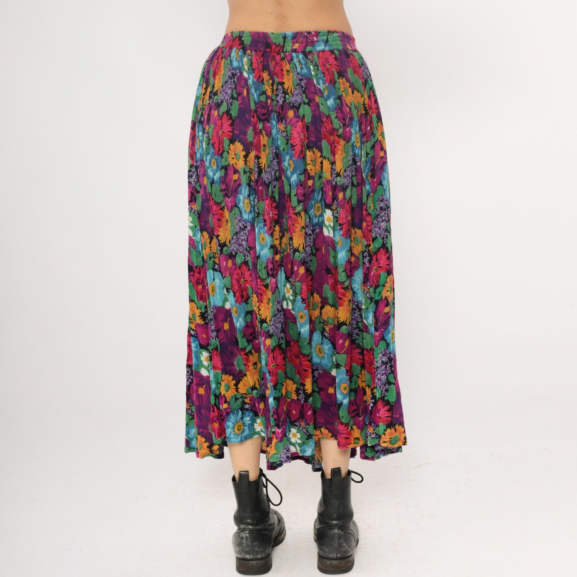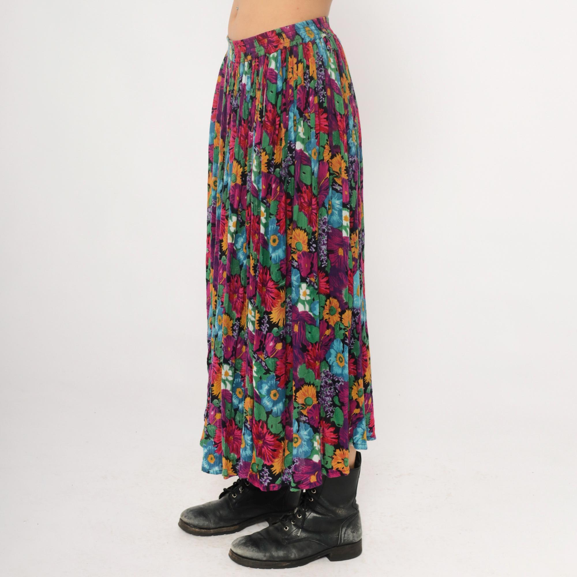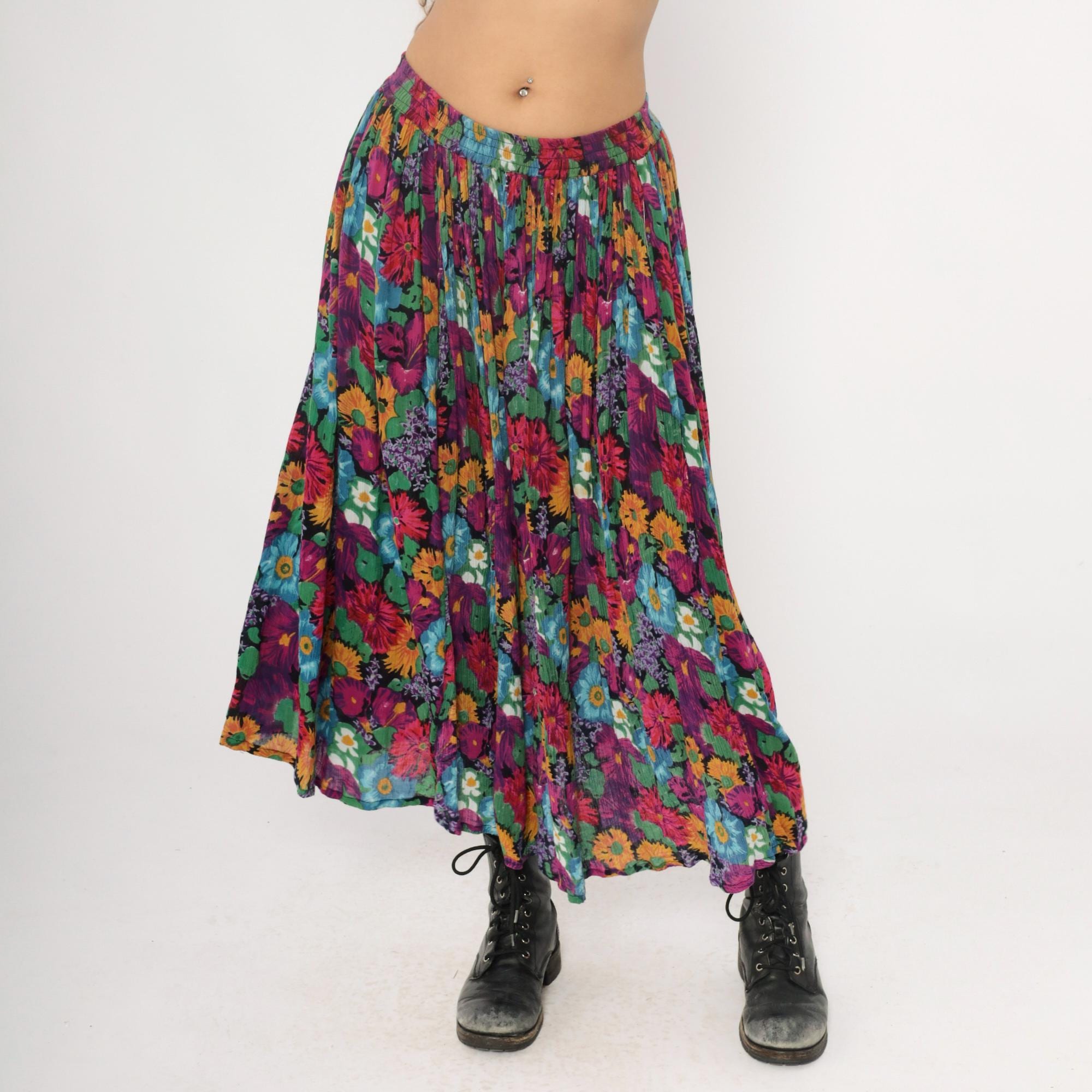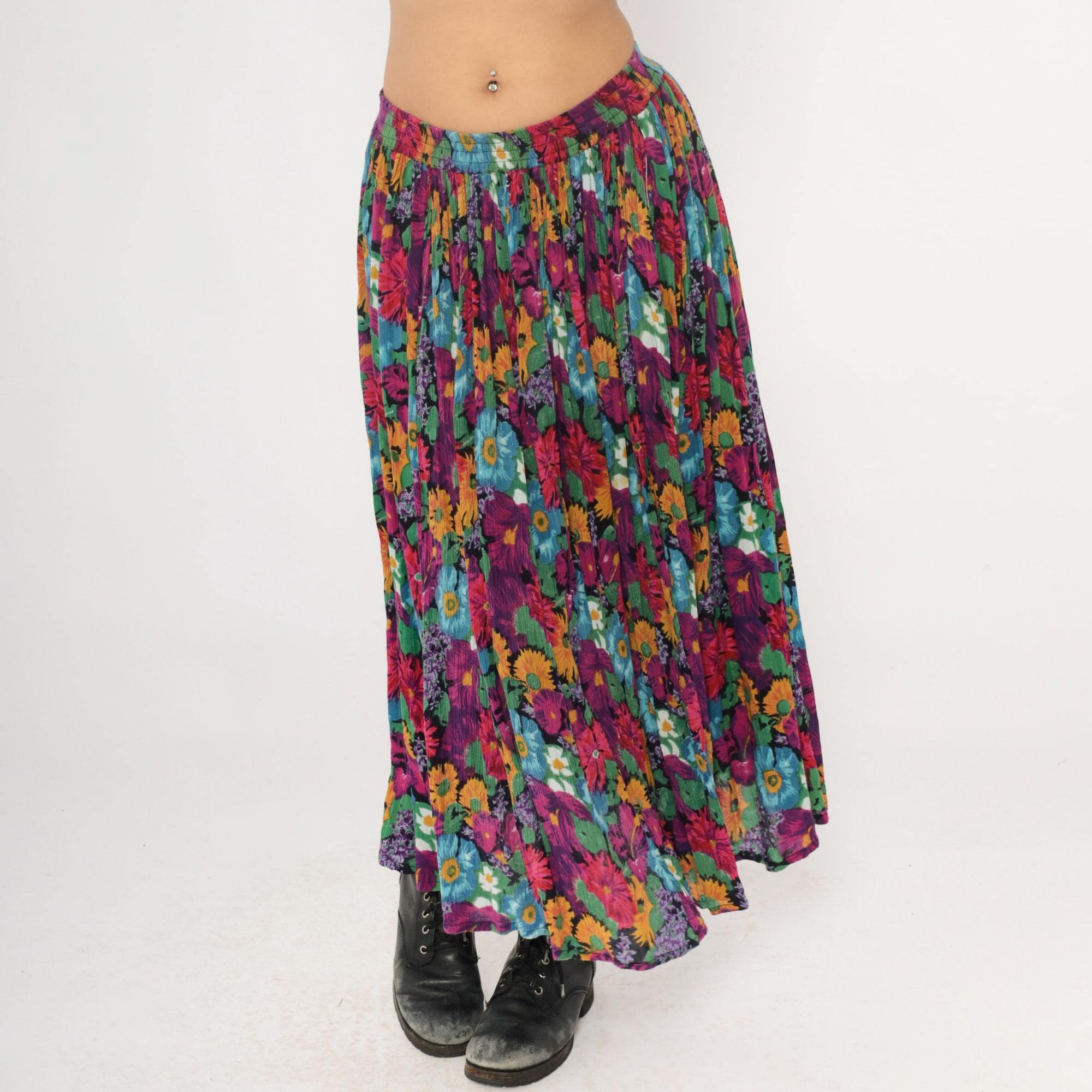 90s multicolor floral maxi skirt from Jane Ashley with gathered elastic waist and pleated construction throughout. Purple base fabric with dense all-over print of pink, red, orange, yellow, blue, and green flowers including daisies and other garden florals.