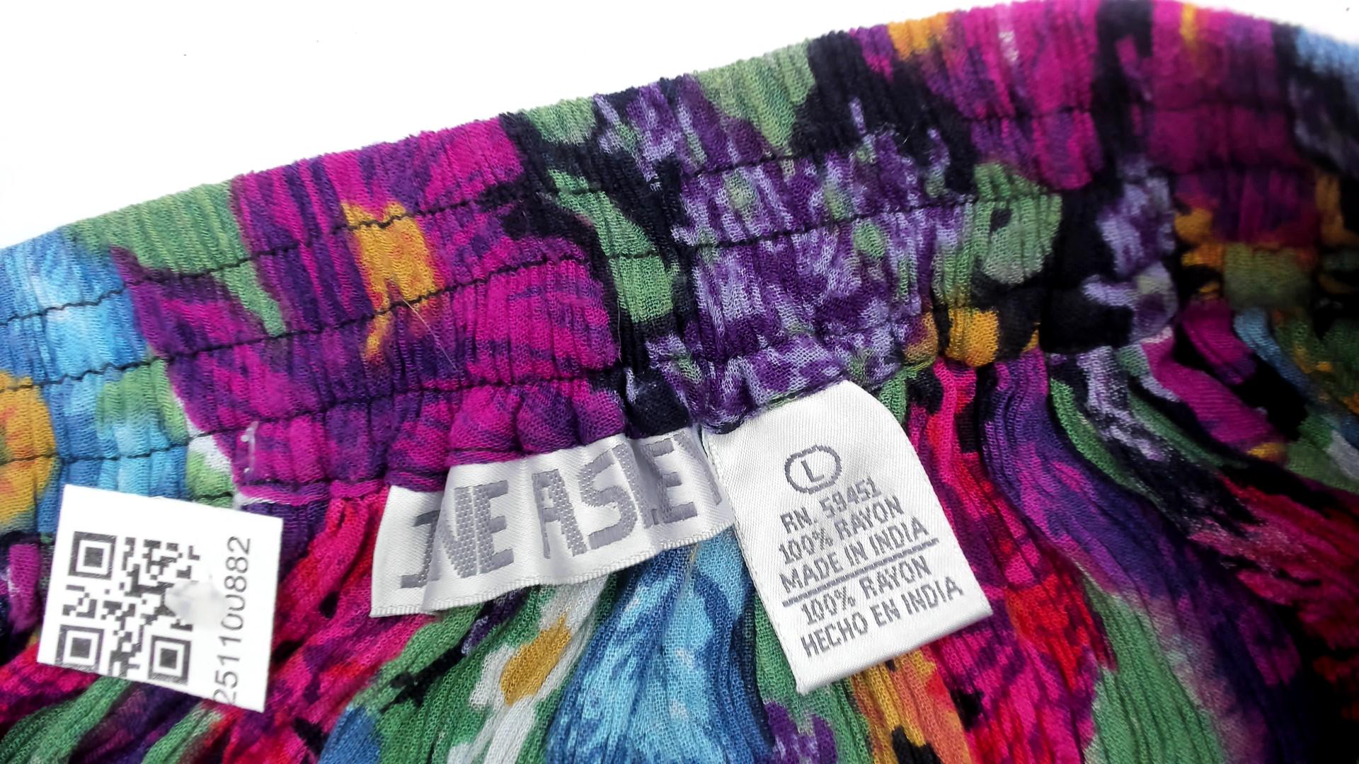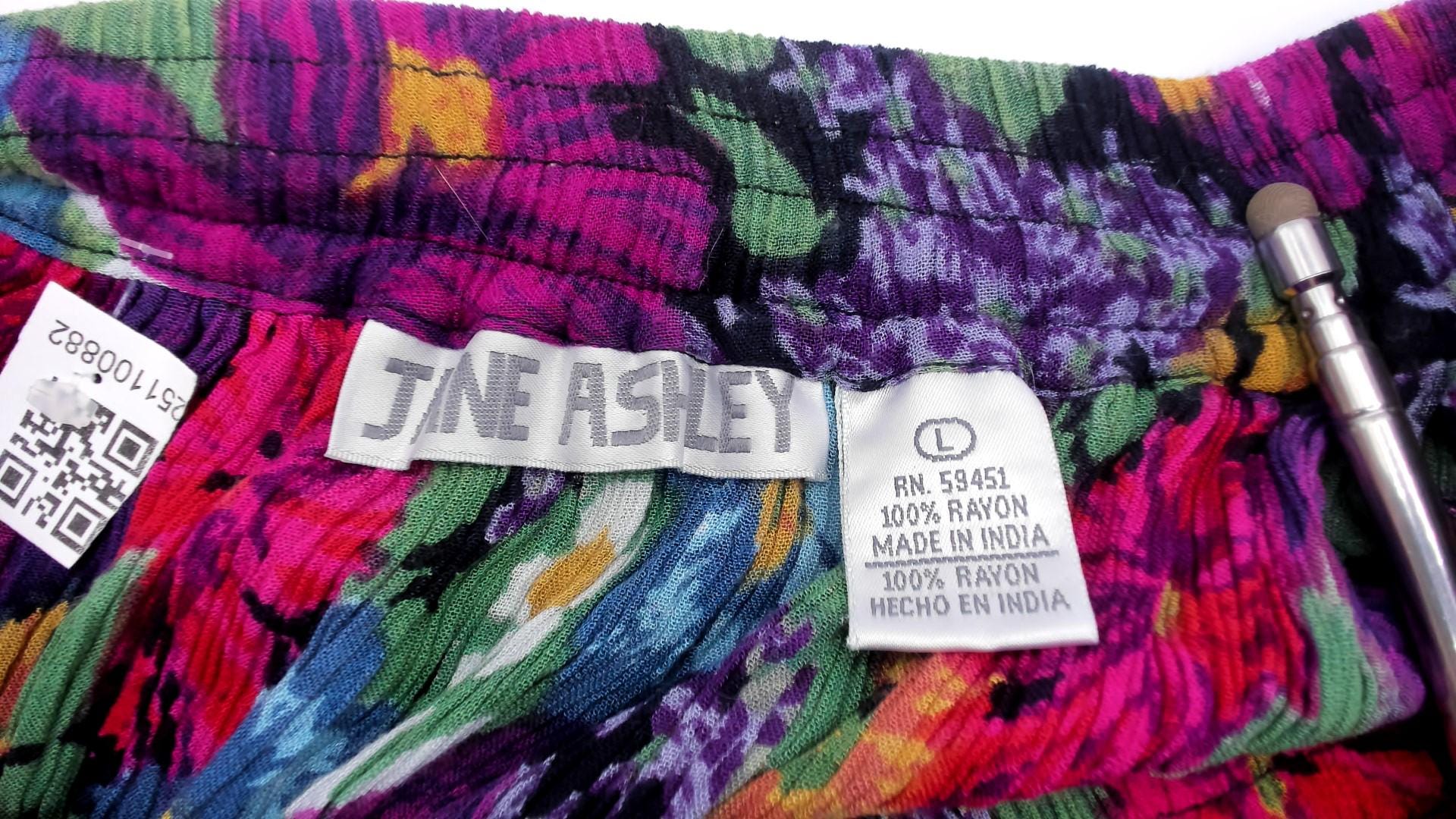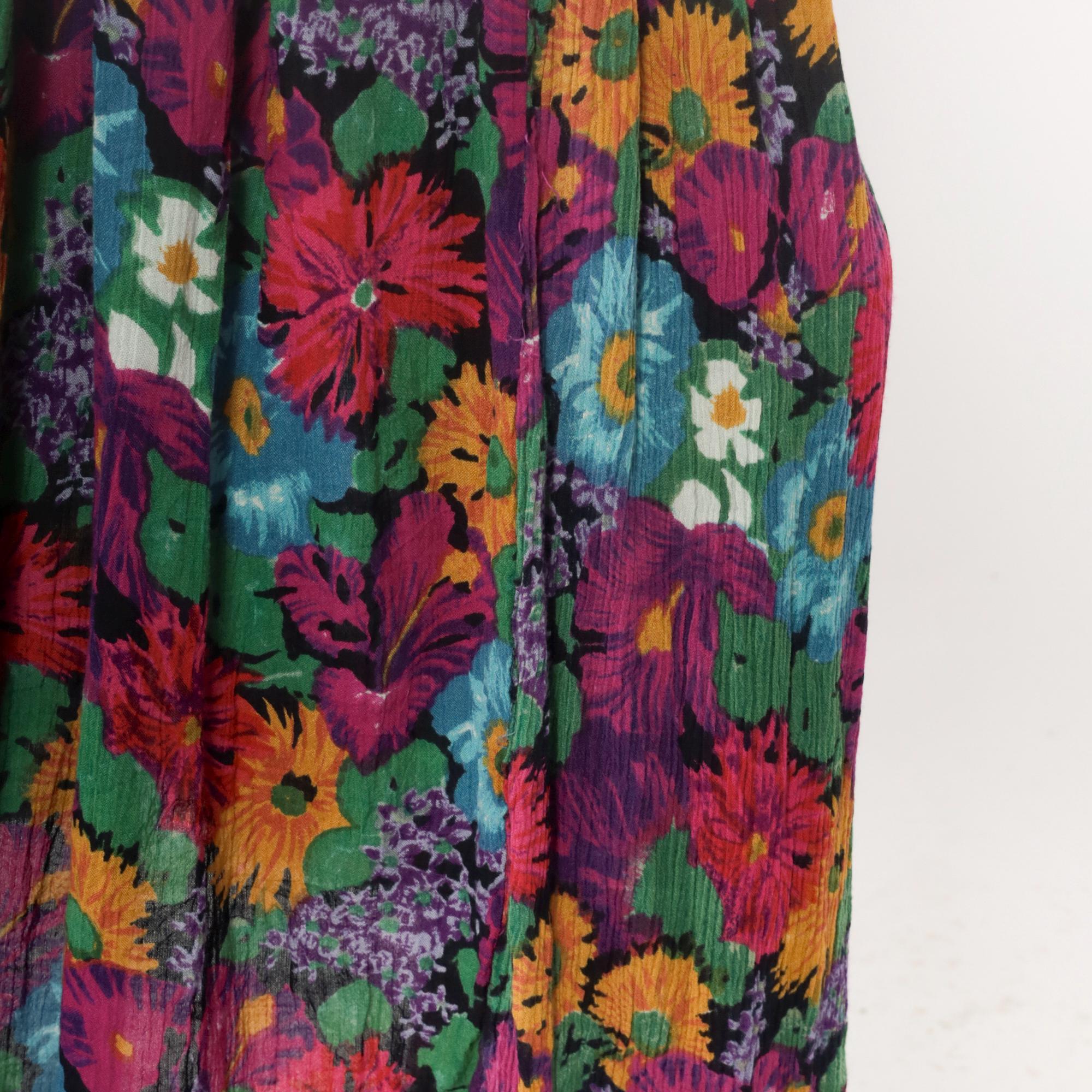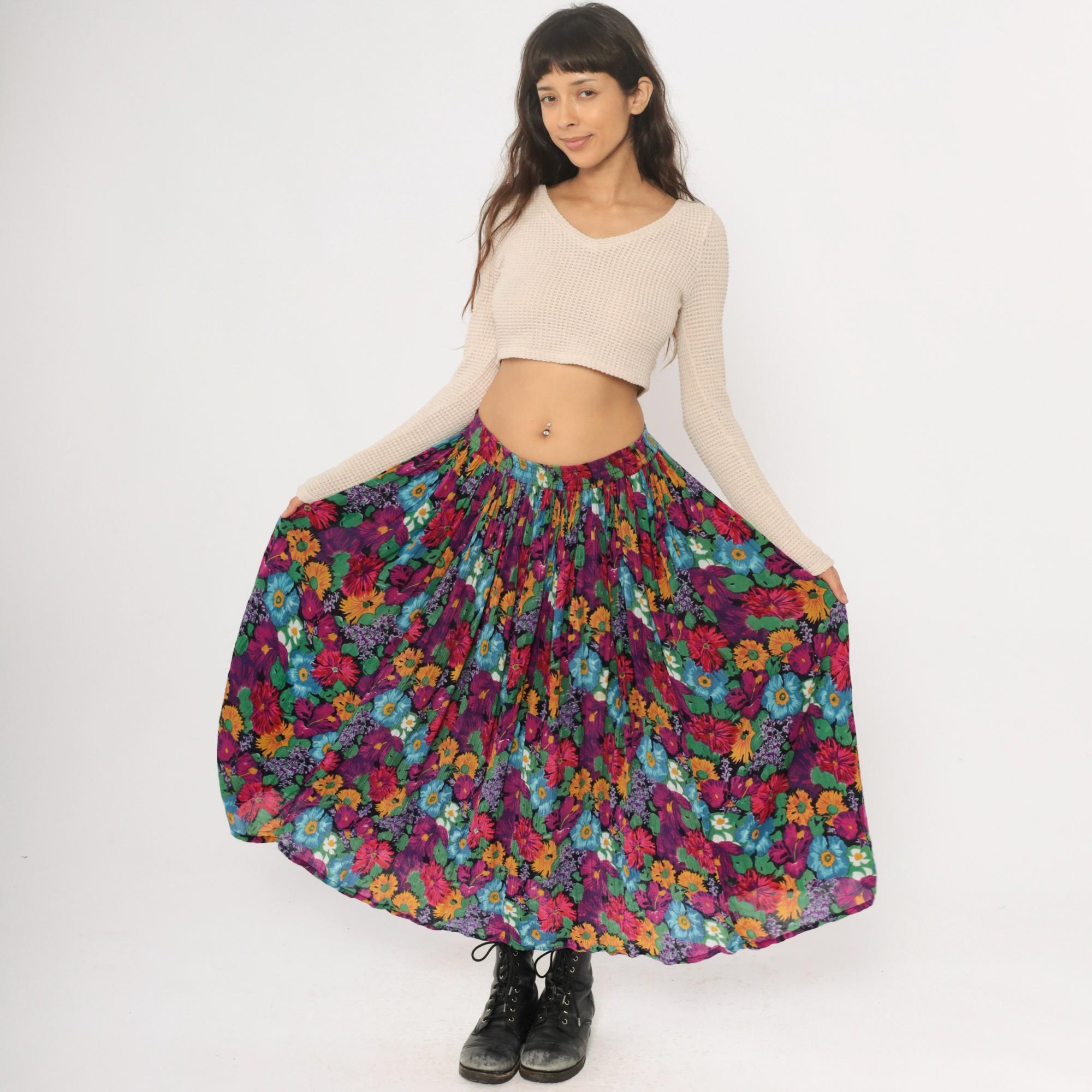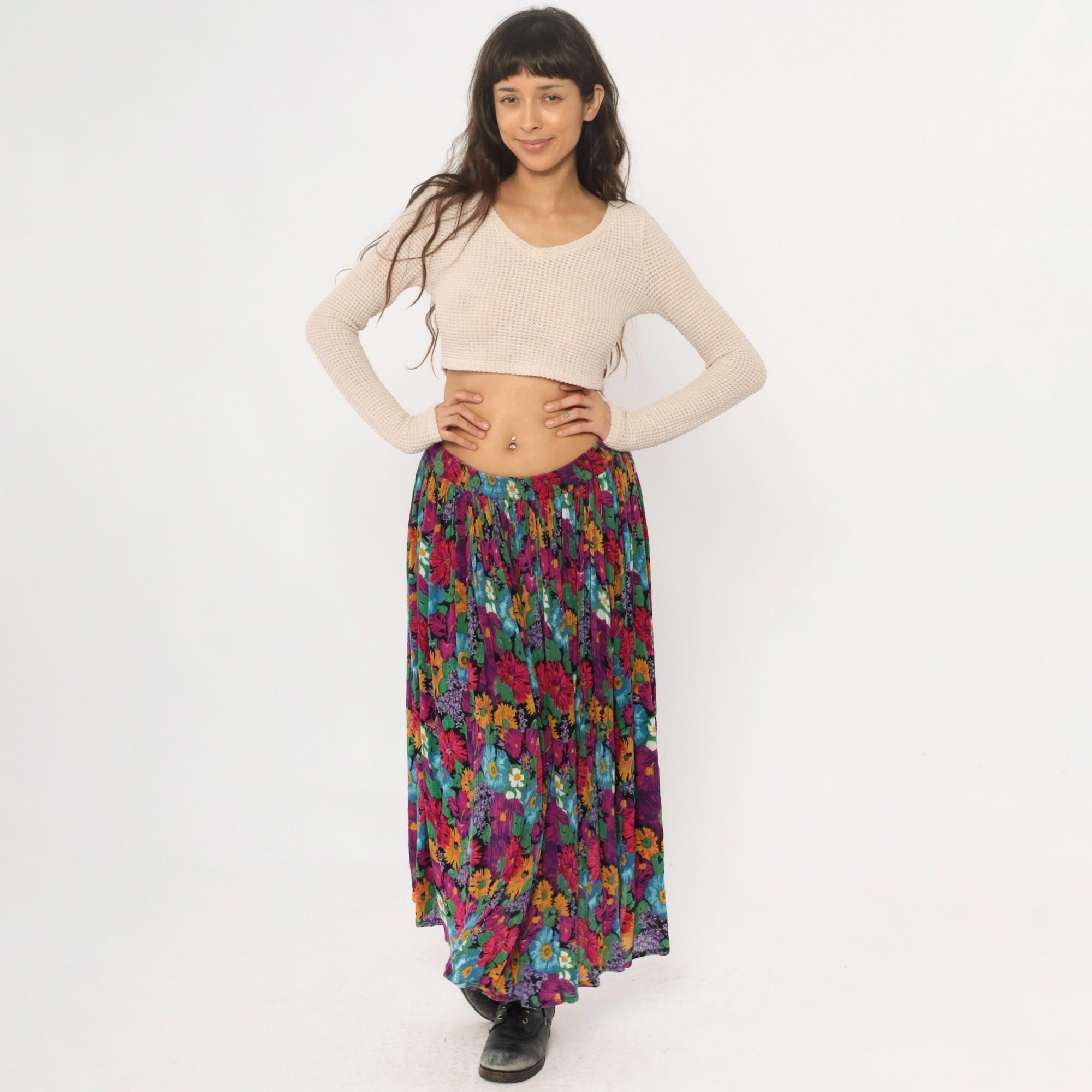 90s multicolor floral maxi skirt from Jane Ashley with gathered elastic waist and pleated construction throughout. Purple base fabric with dense all-over print of pink, red, orange, yellow, blue, and green flowers including daisies and other garden florals.