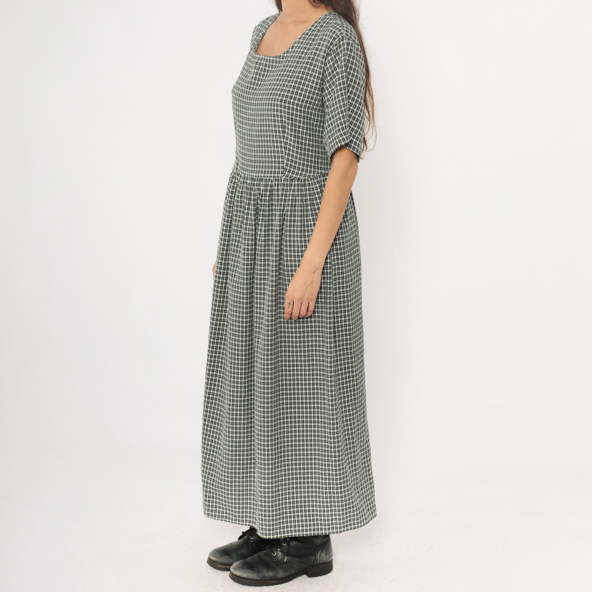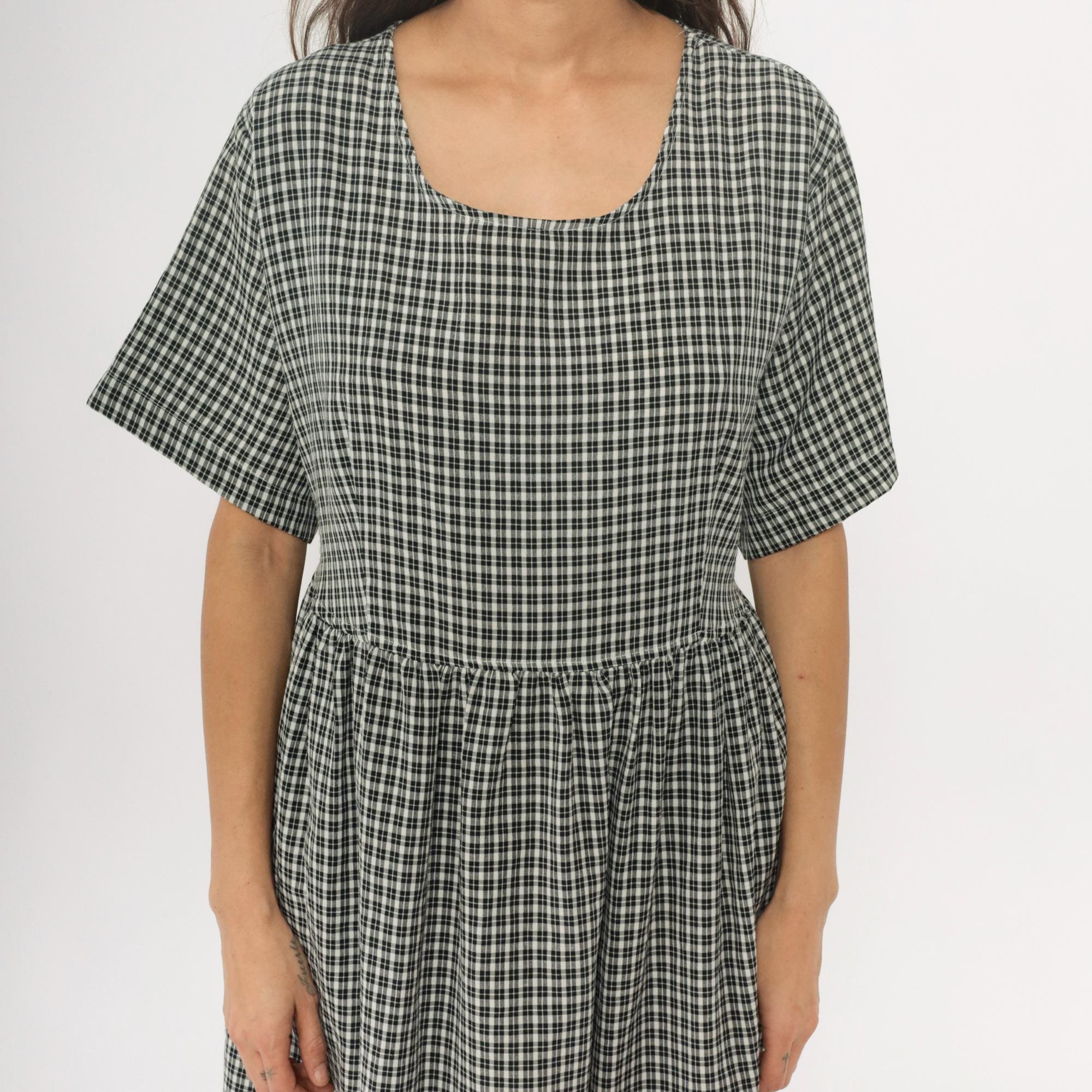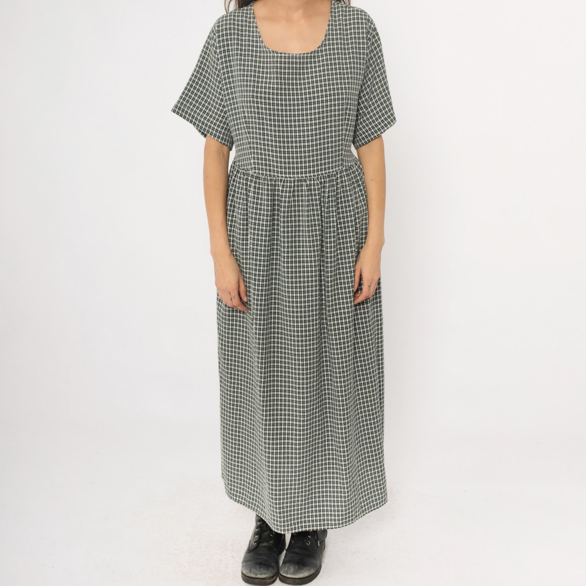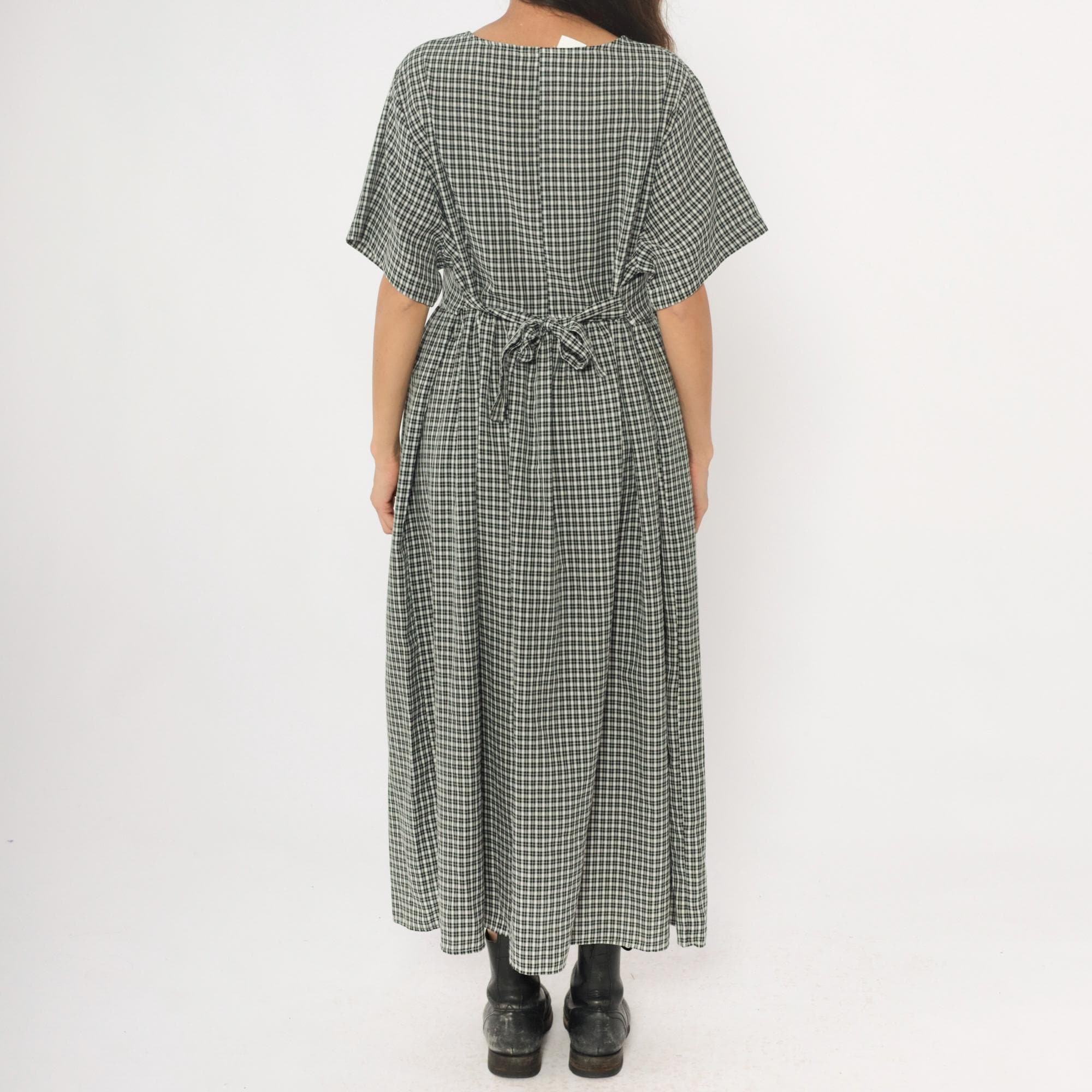 90s black and white gingham maxi dress with square neckline and short sleeves. Gathered elastic waist with back tie closure, full skirt.