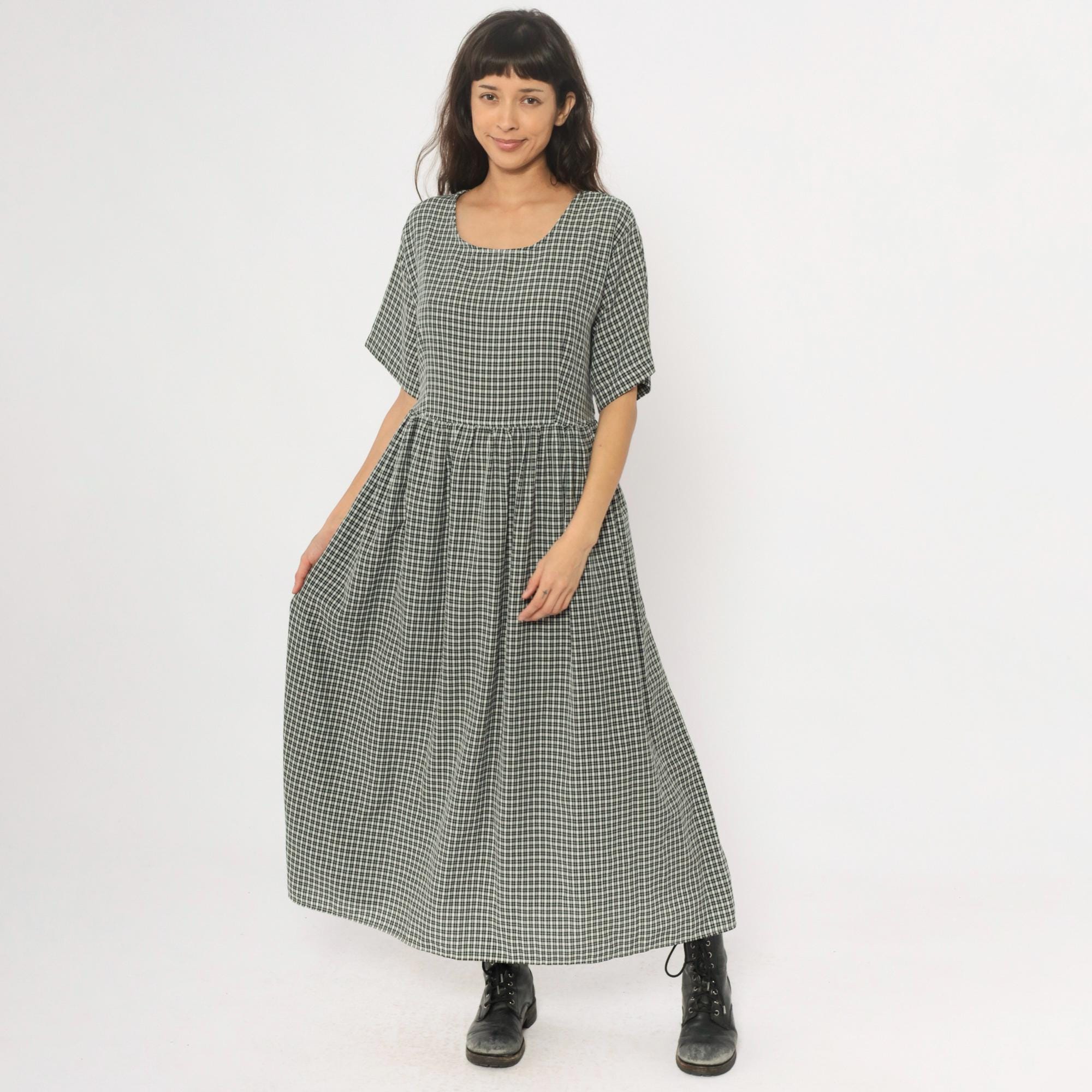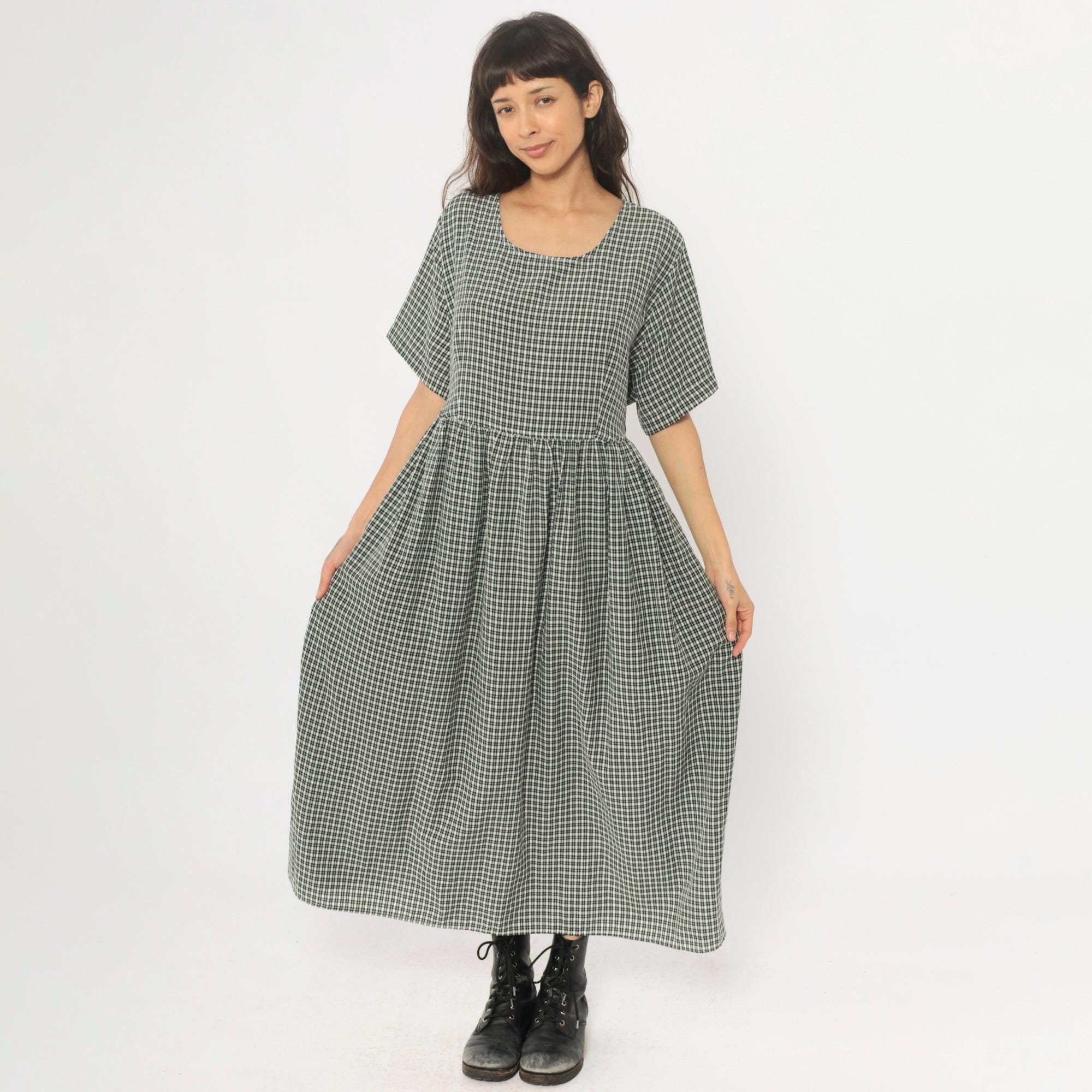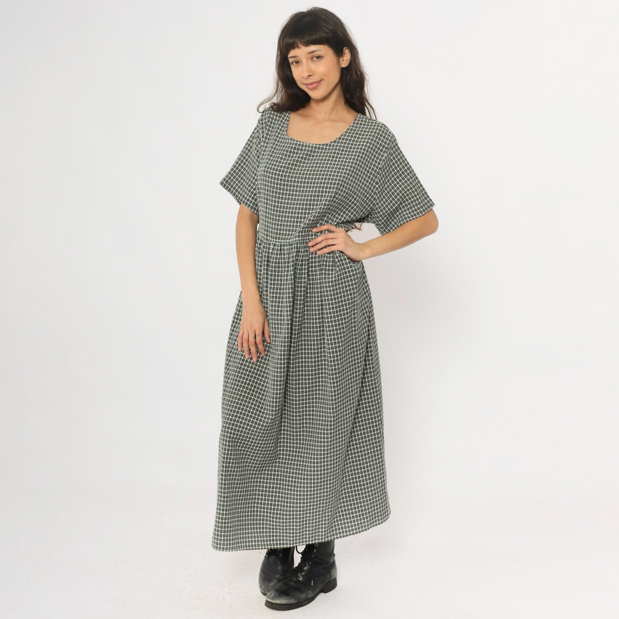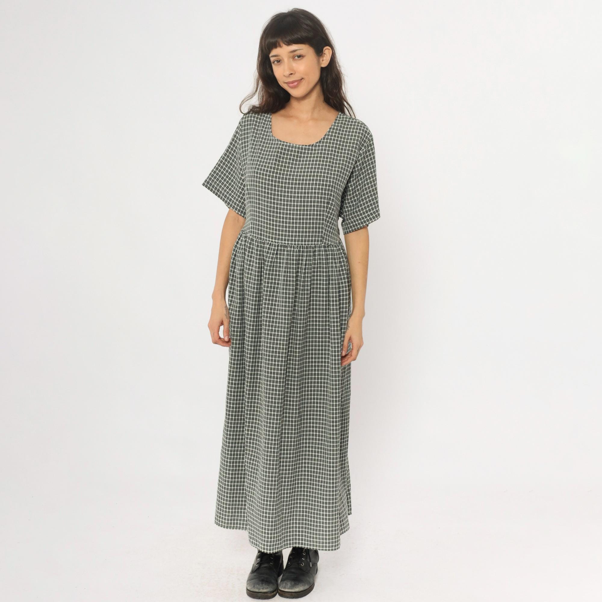 90s black and white gingham maxi dress with square neckline and short sleeves. Gathered elastic waist with back tie closure, full skirt.
