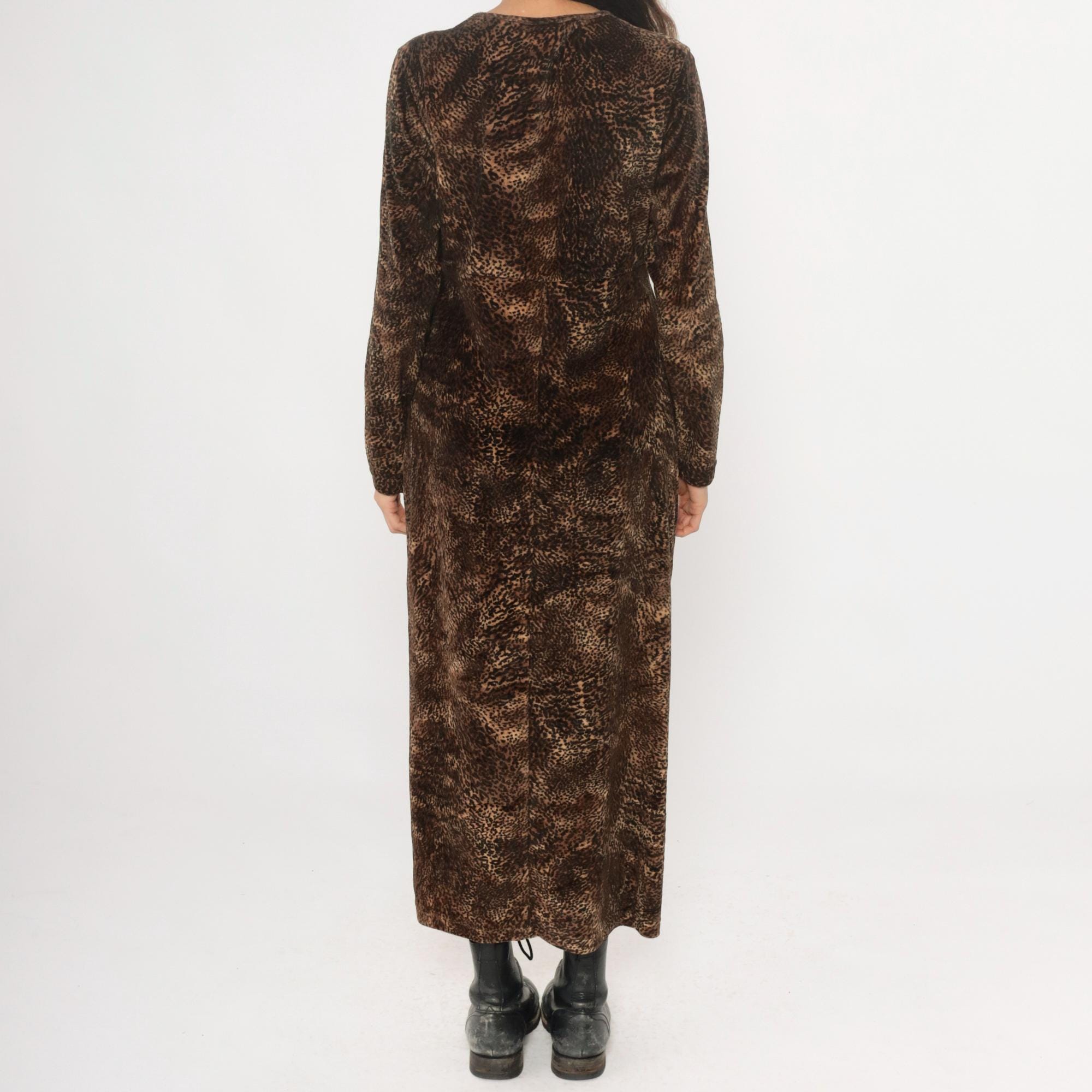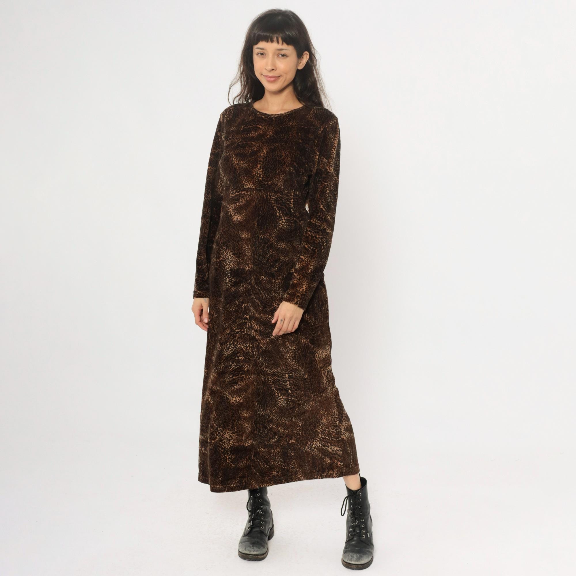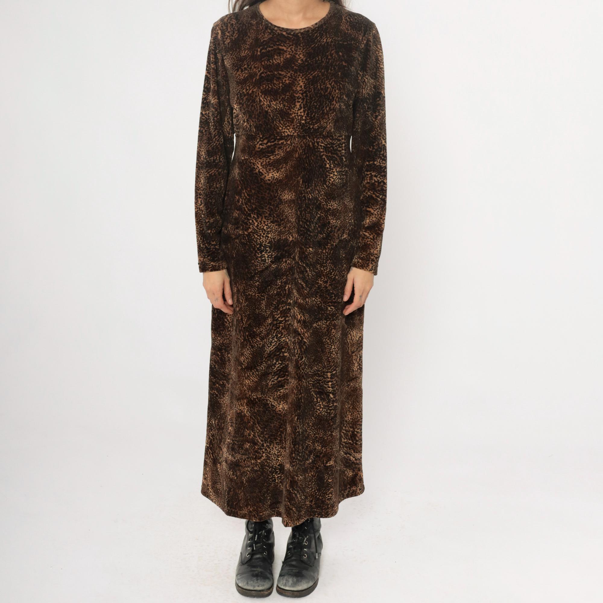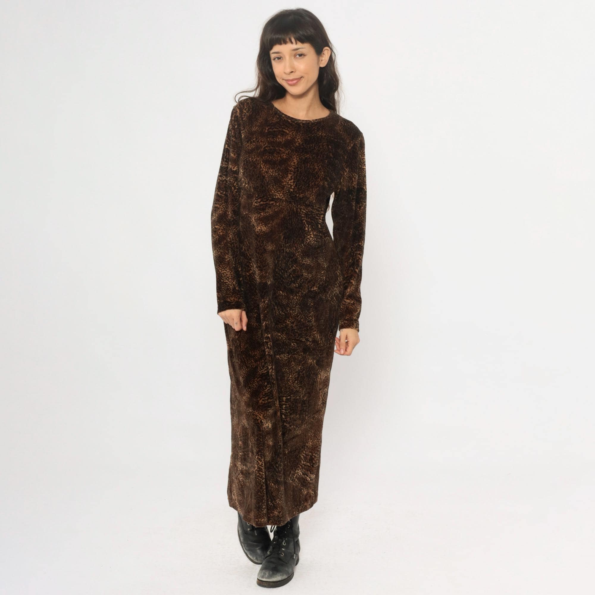 90s leopard print maxi dress from Jones New York in brown, tan, and black tones. Crew neckline, long sleeves, ankle-length straight silhouette. Pullover style with no closures.