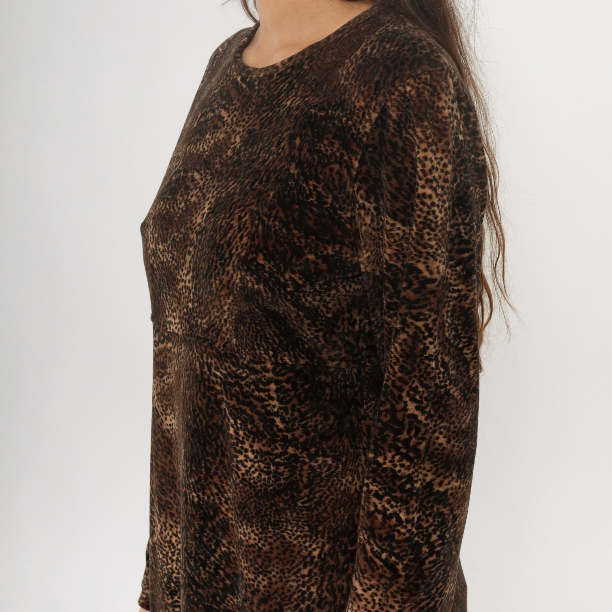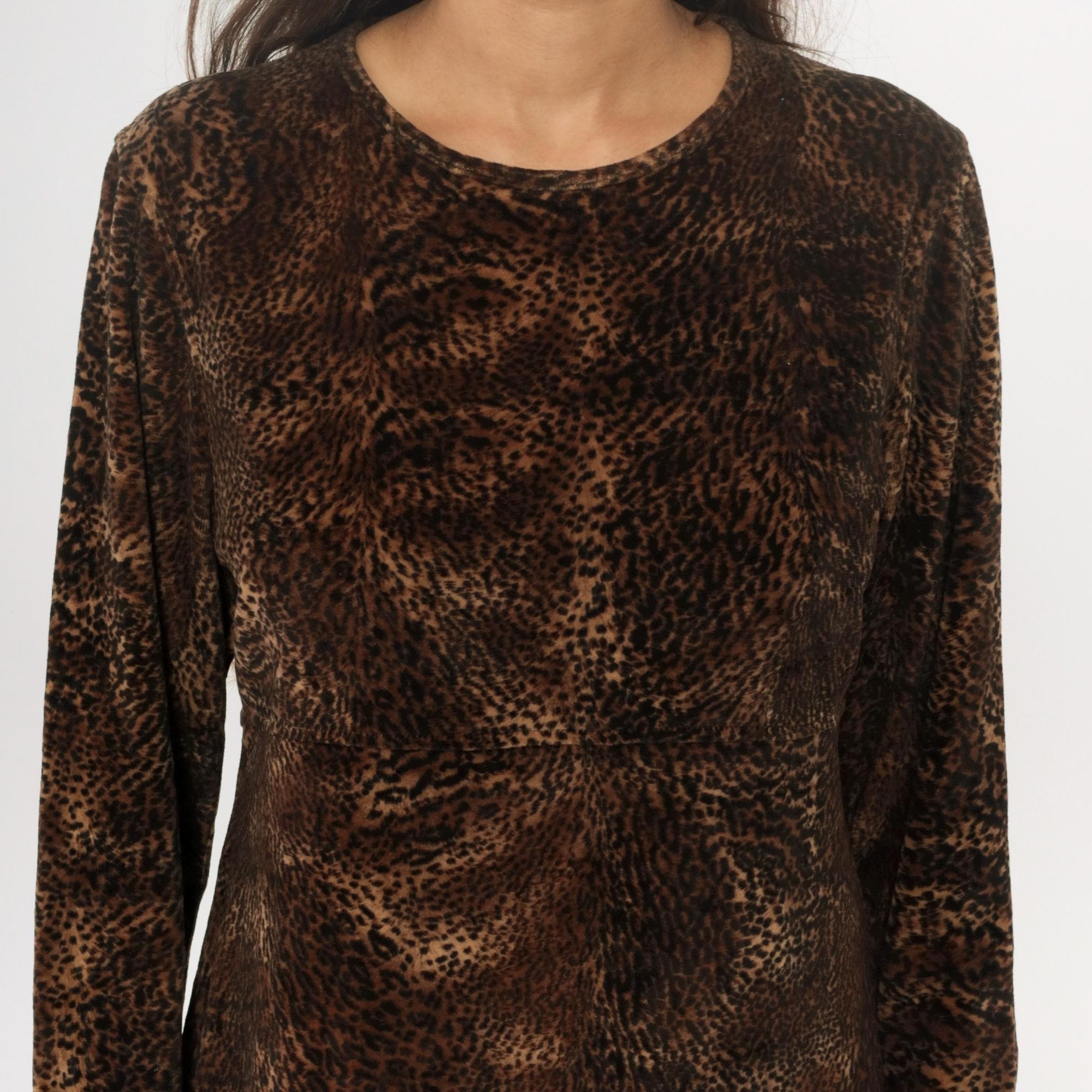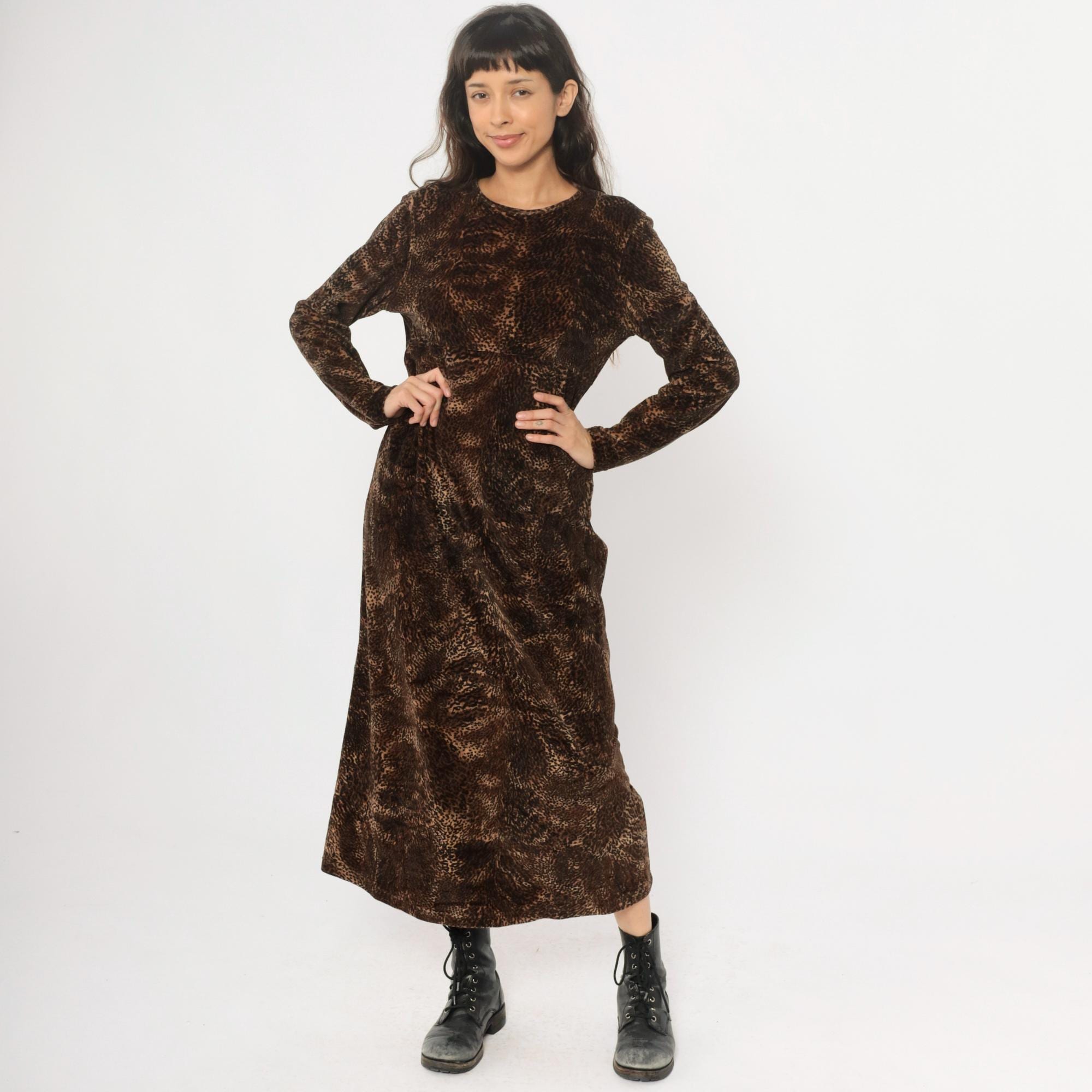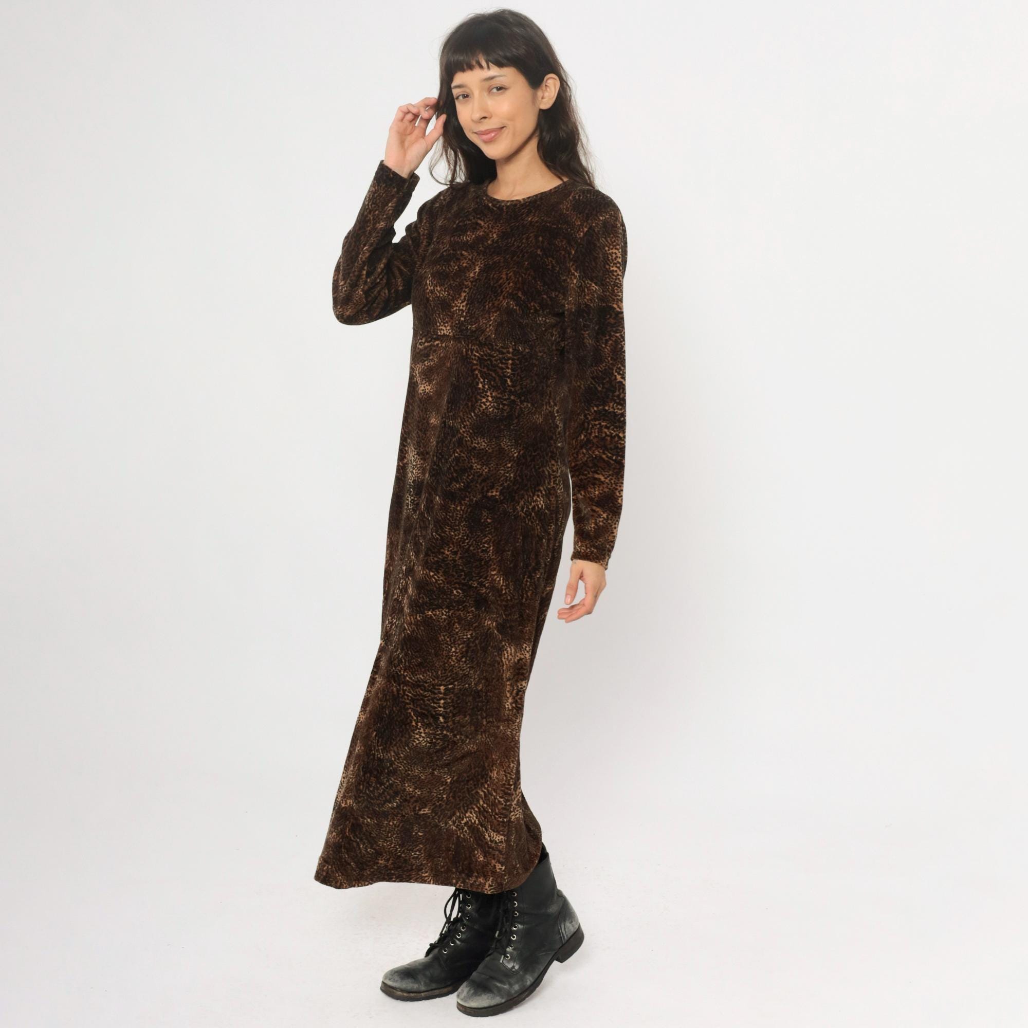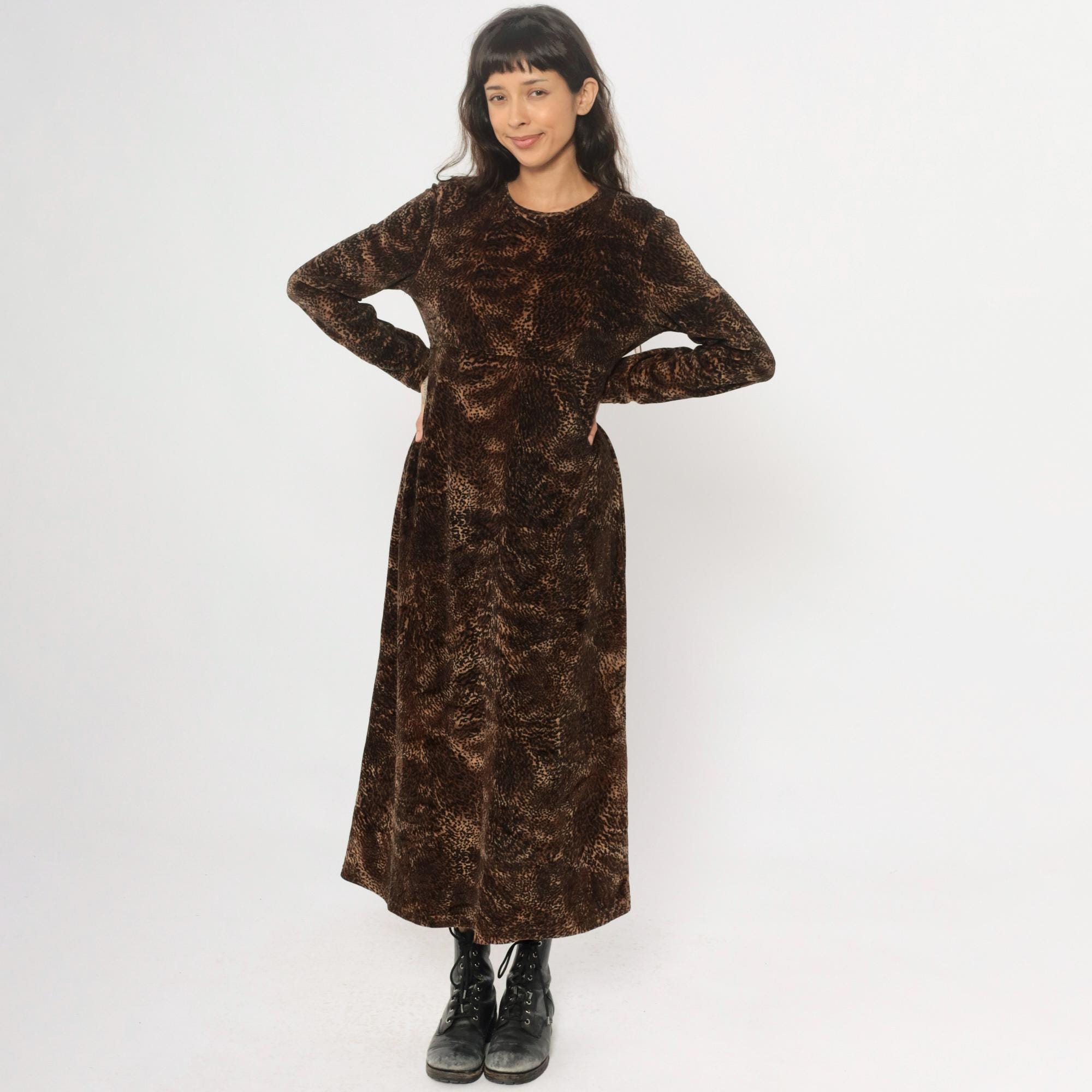 90s leopard print maxi dress from Jones New York in brown, tan, and black tones. Crew neckline, long sleeves, ankle-length straight silhouette. Pullover style with no closures.
