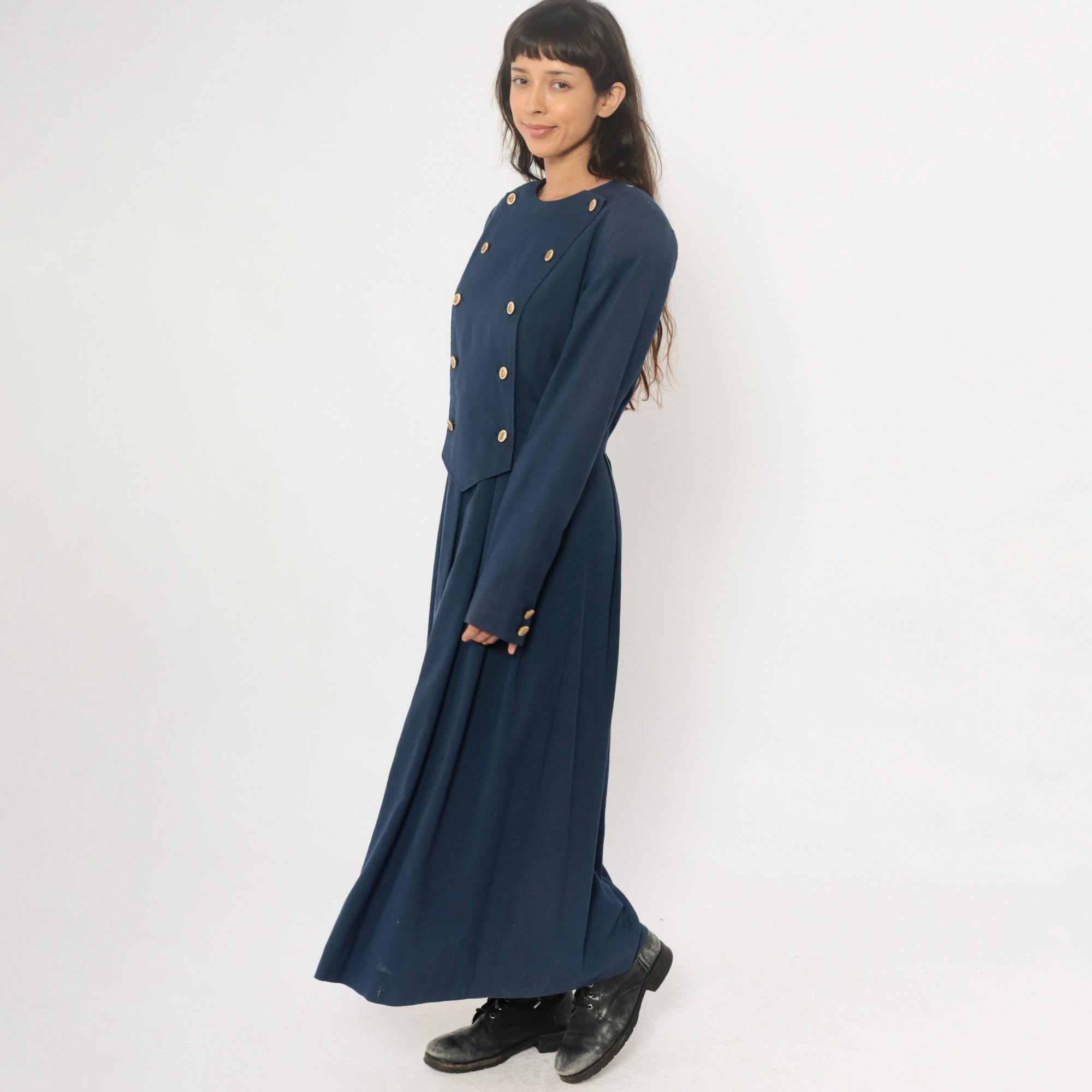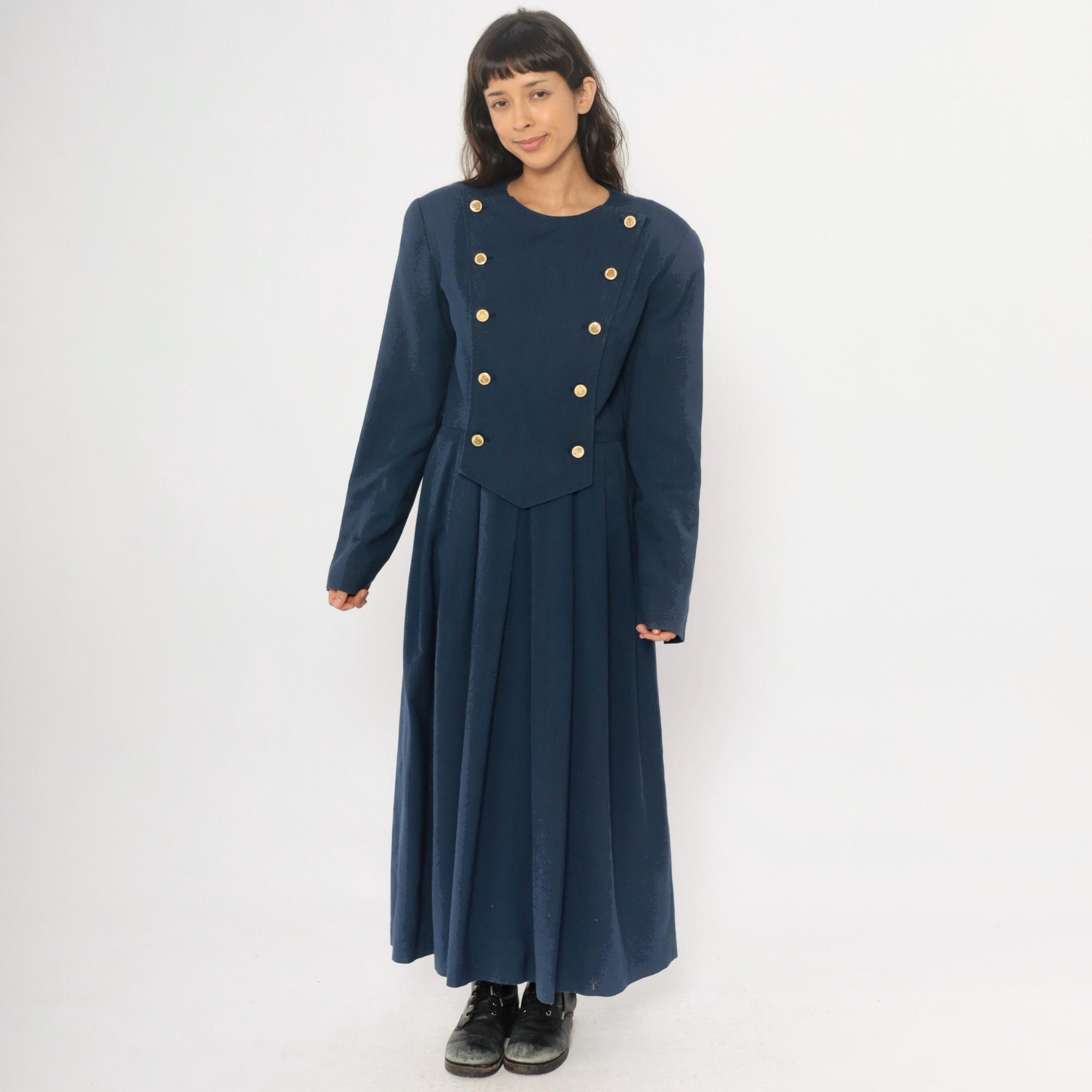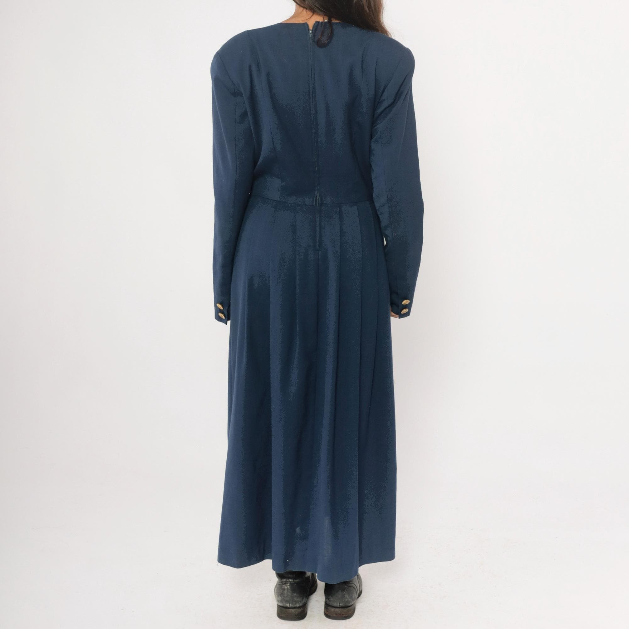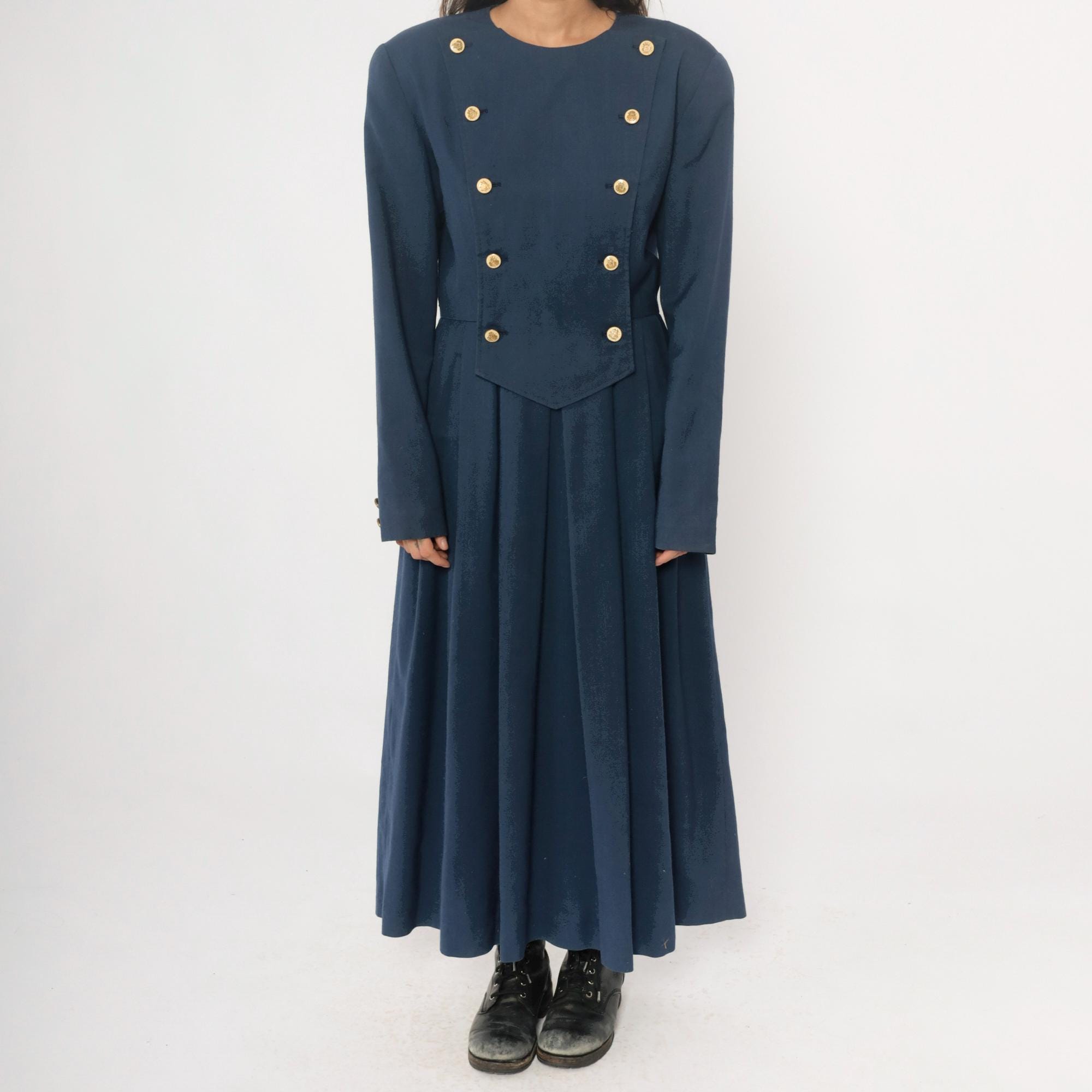 80s navy blue maxi dress with double-breasted military styling and decorative gold buttons arranged in two columns down the front. Fitted long sleeves with three gold buttons at each cuff, structured bodice with belt detail at waist, full pleated A-line skirt.