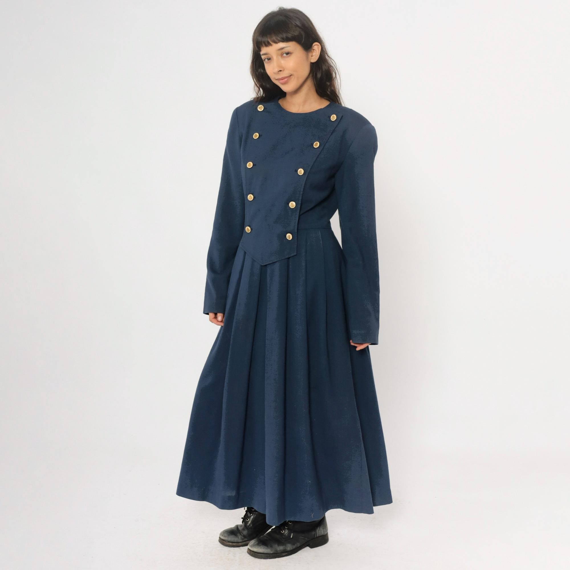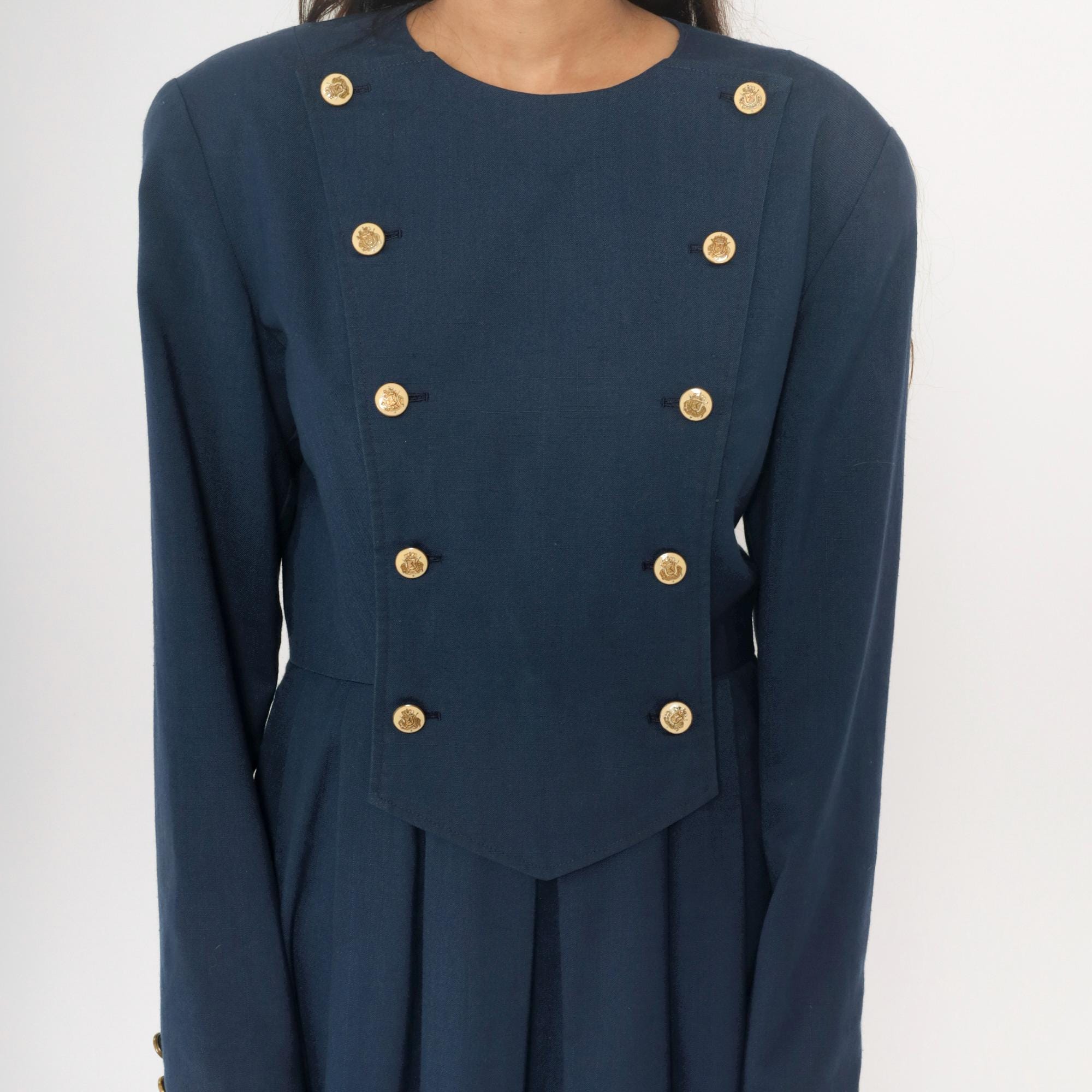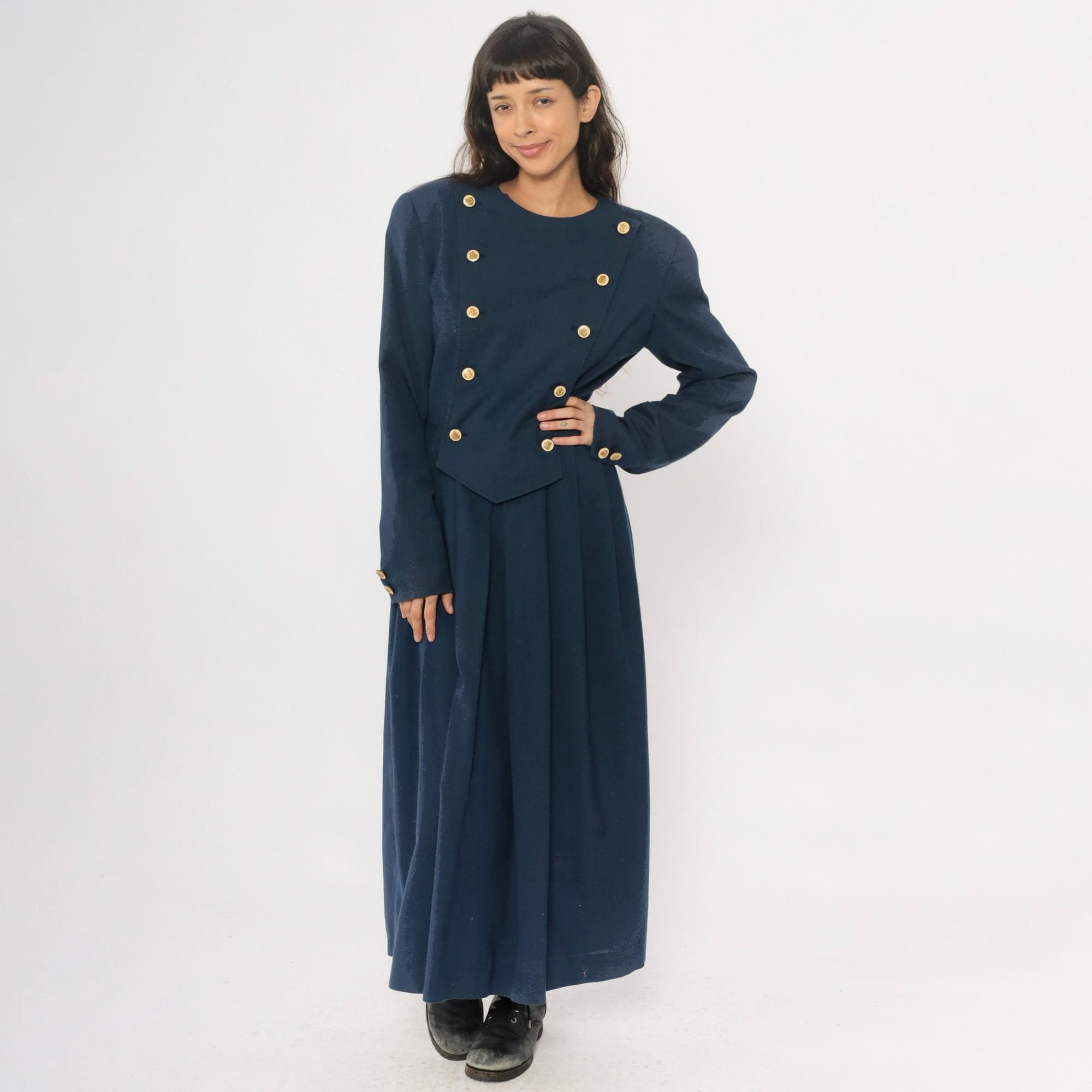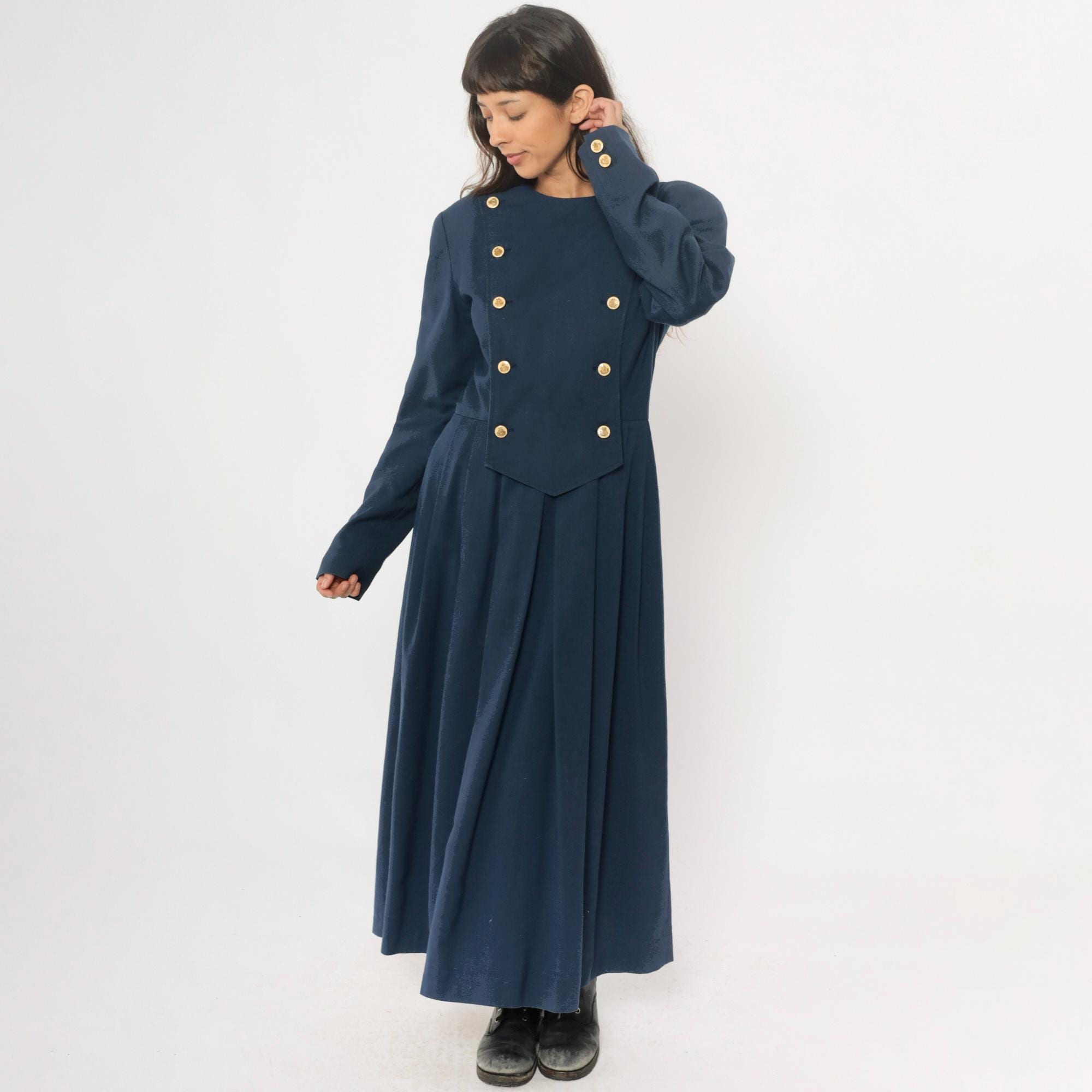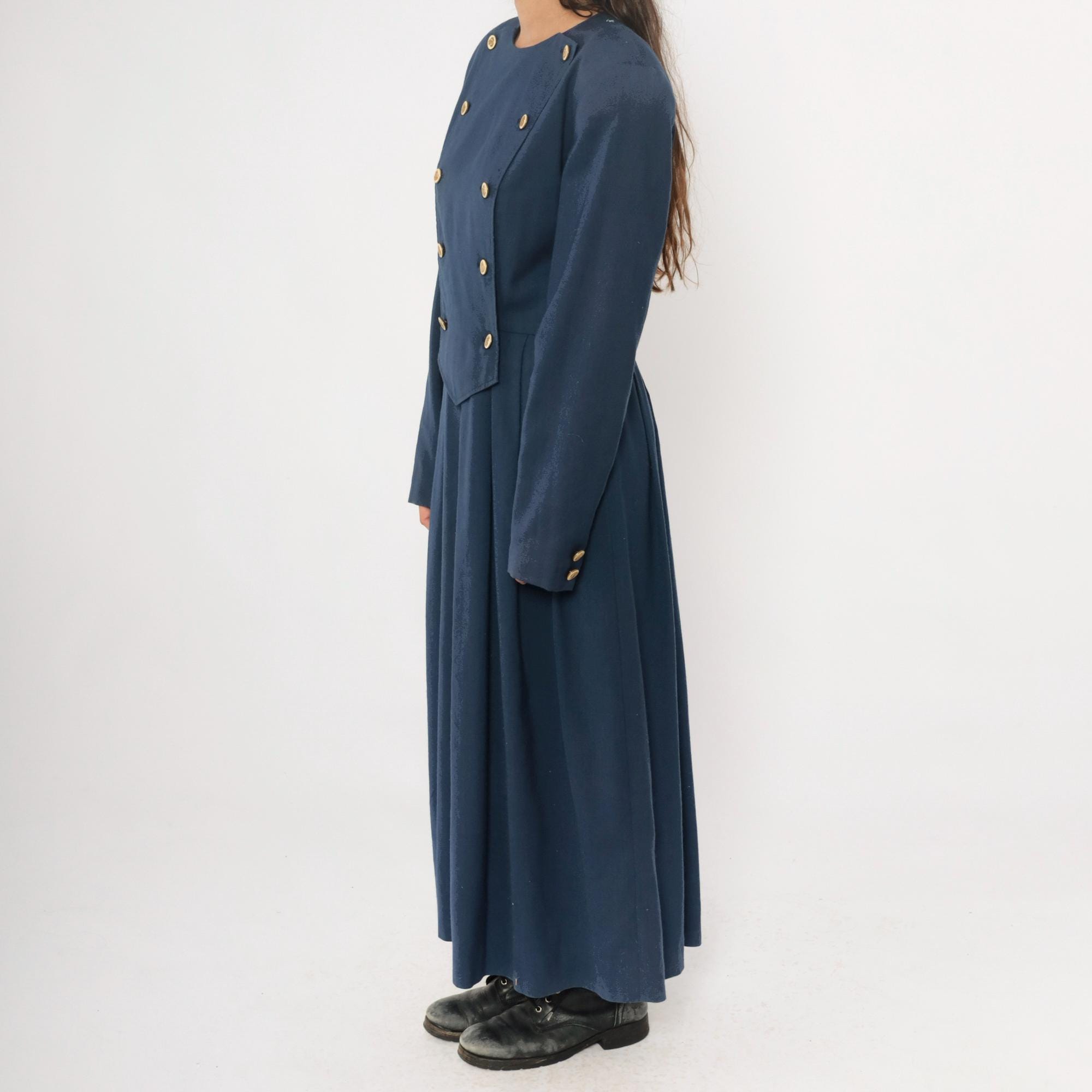 80s navy blue maxi dress with double-breasted military styling and decorative gold buttons arranged in two columns down the front. Fitted long sleeves with three gold buttons at each cuff, structured bodice with belt detail at waist, full pleated A-line skirt.