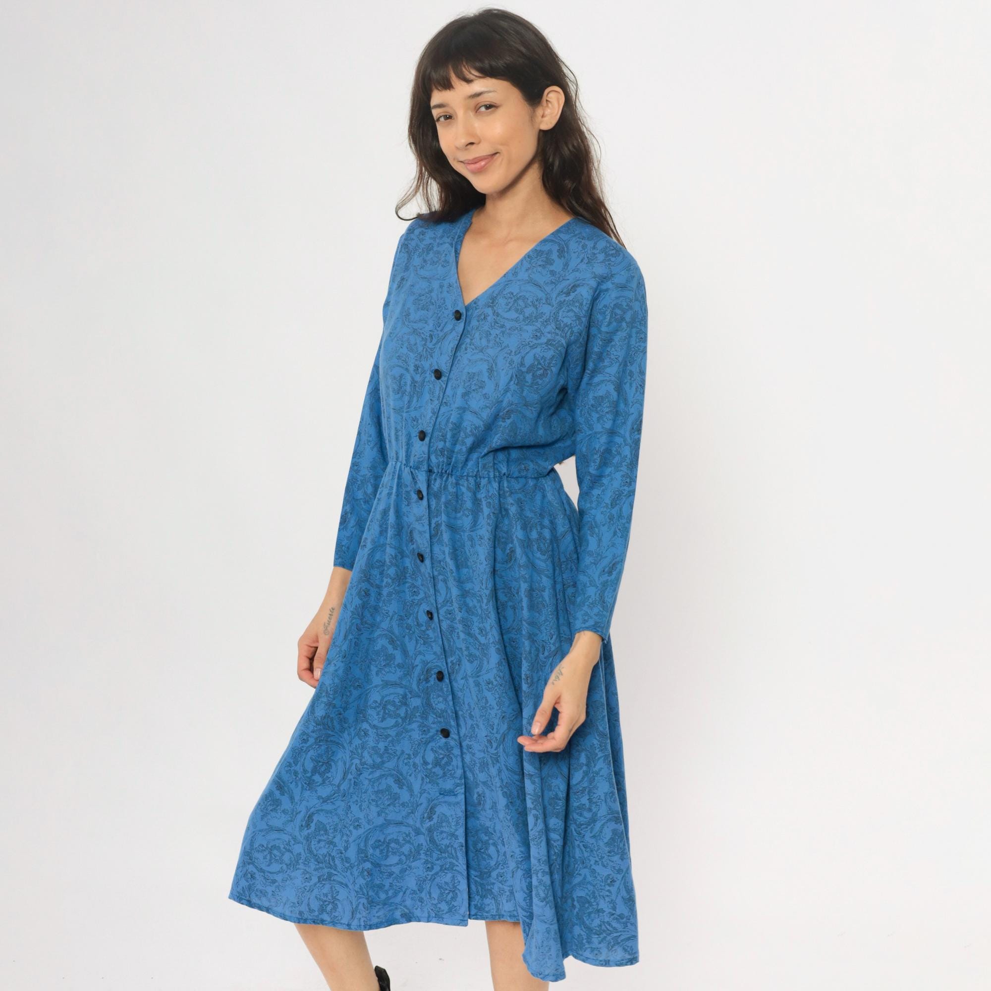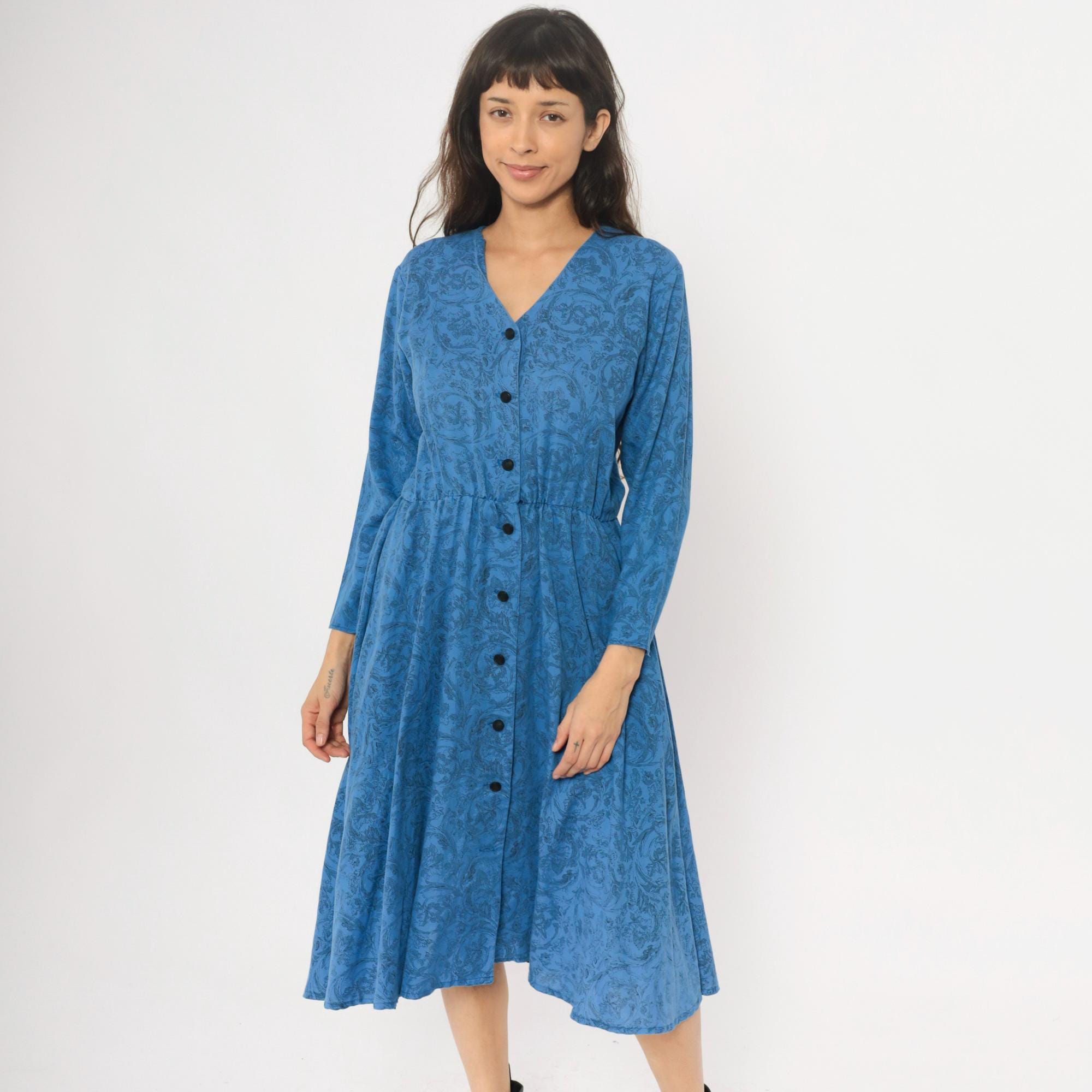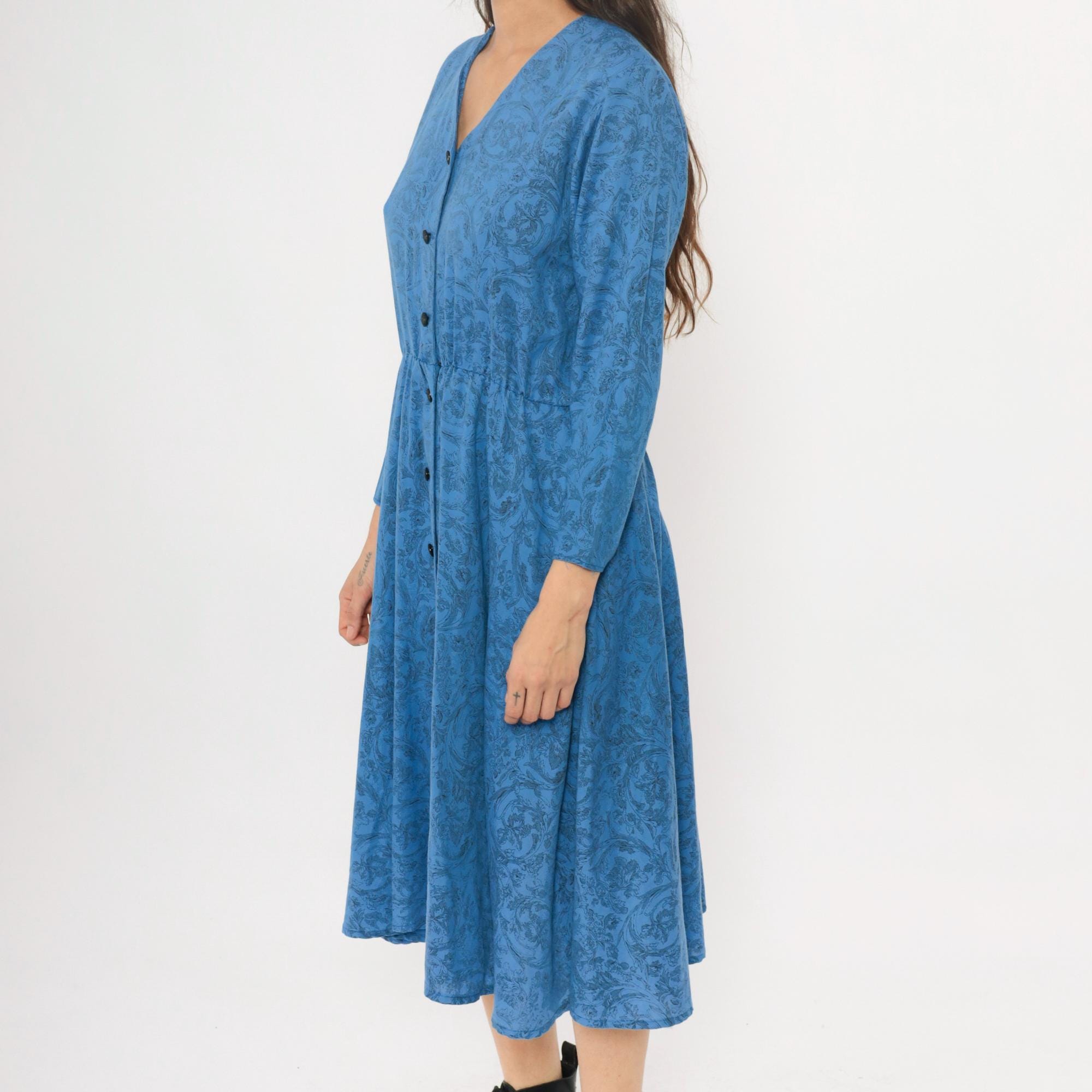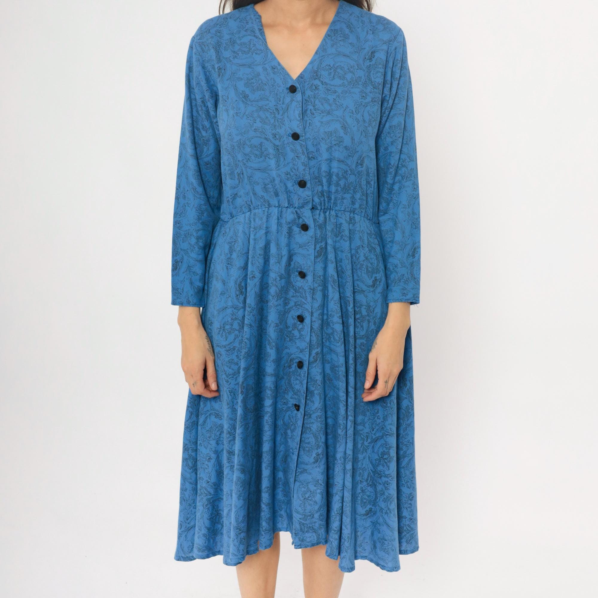 80s blue dress with darker blue paisley and floral pattern throughout the fabric. Button front closure with V-neckline, long sleeves, gathered waist, and full skirt.