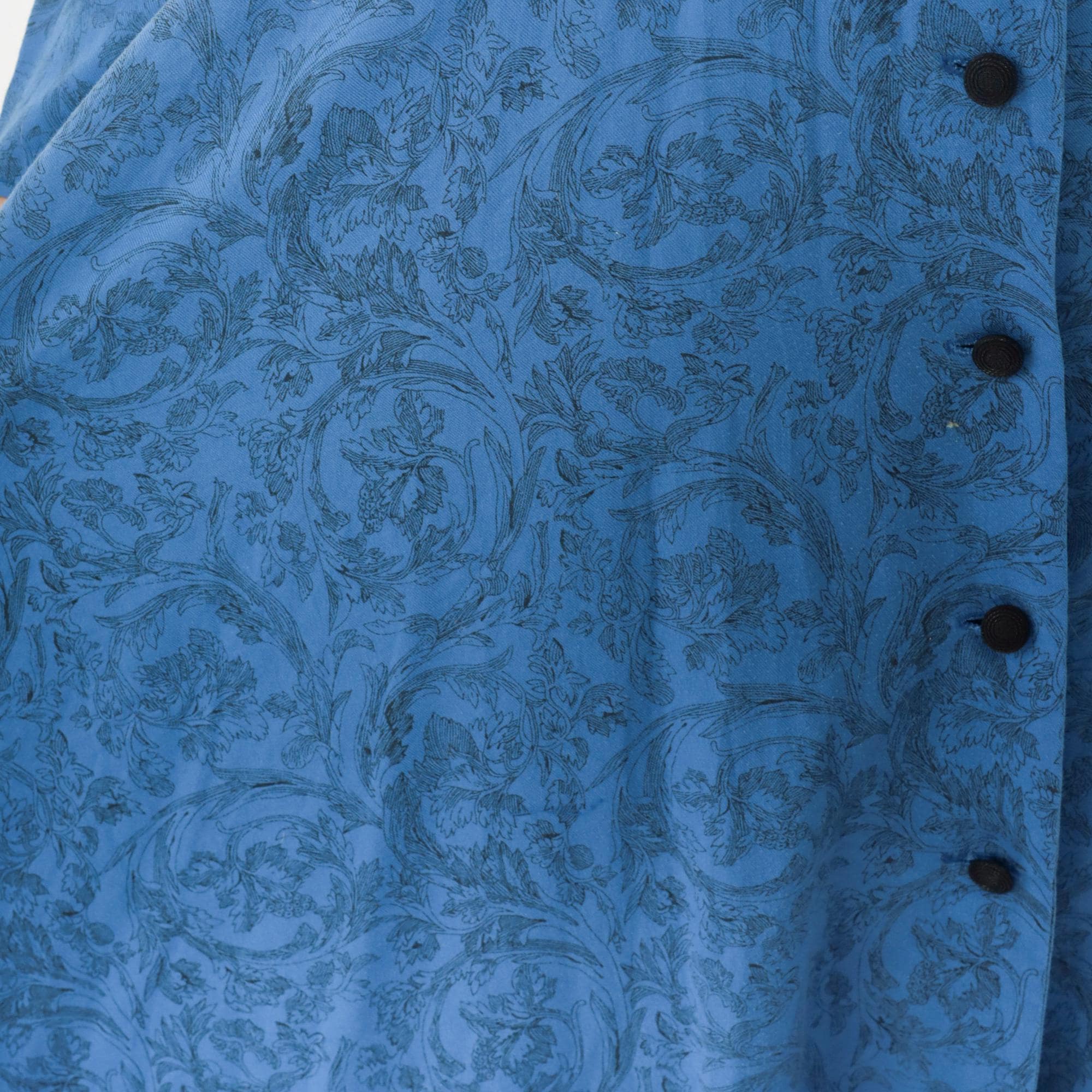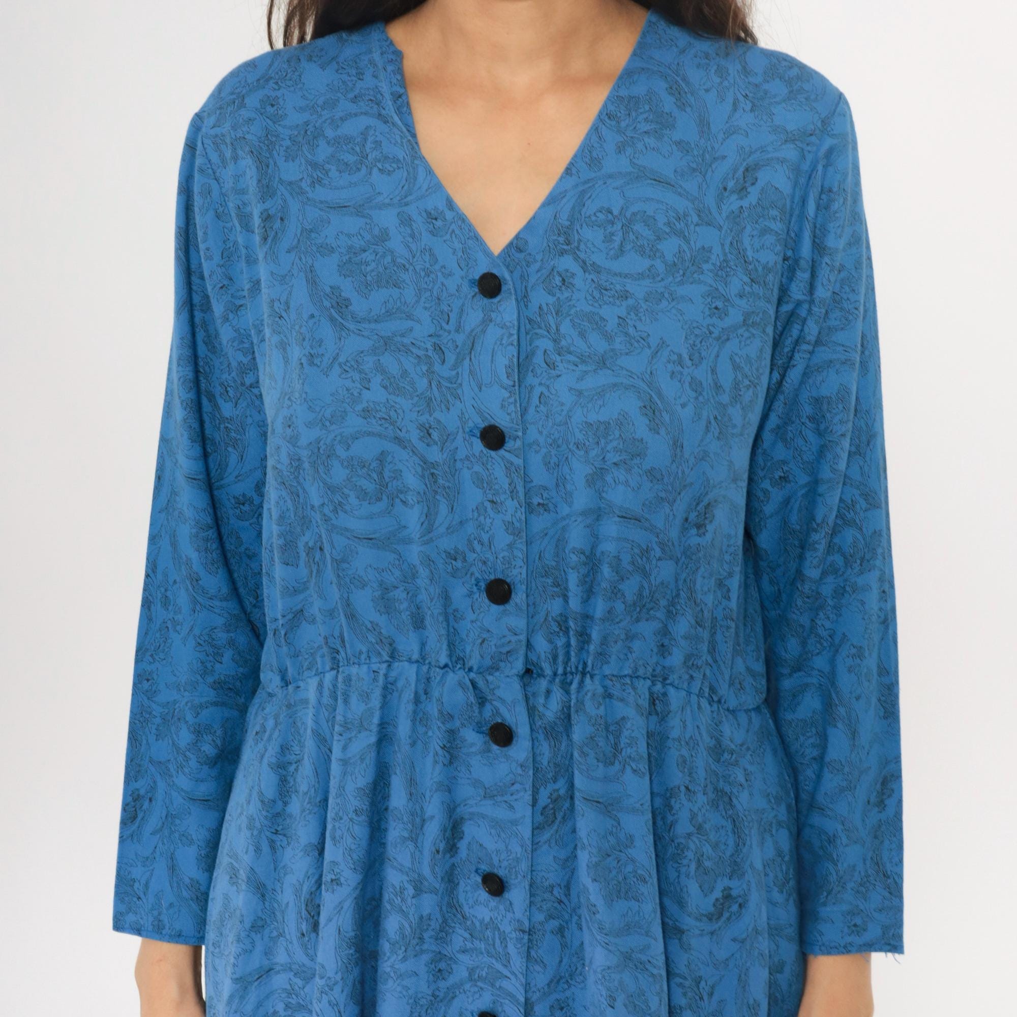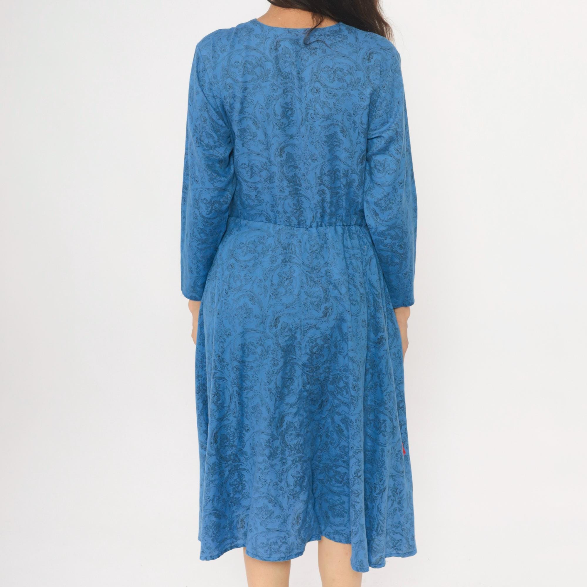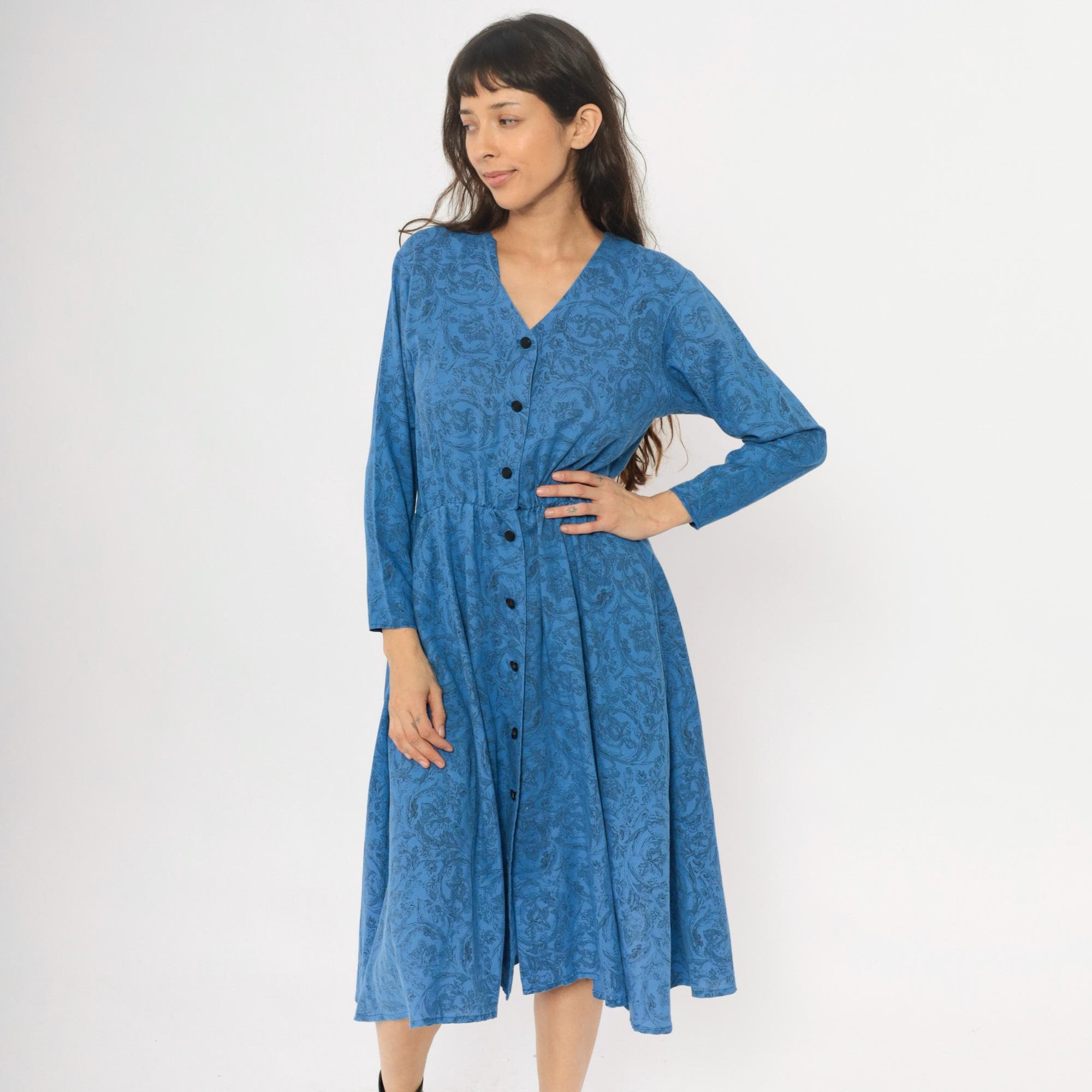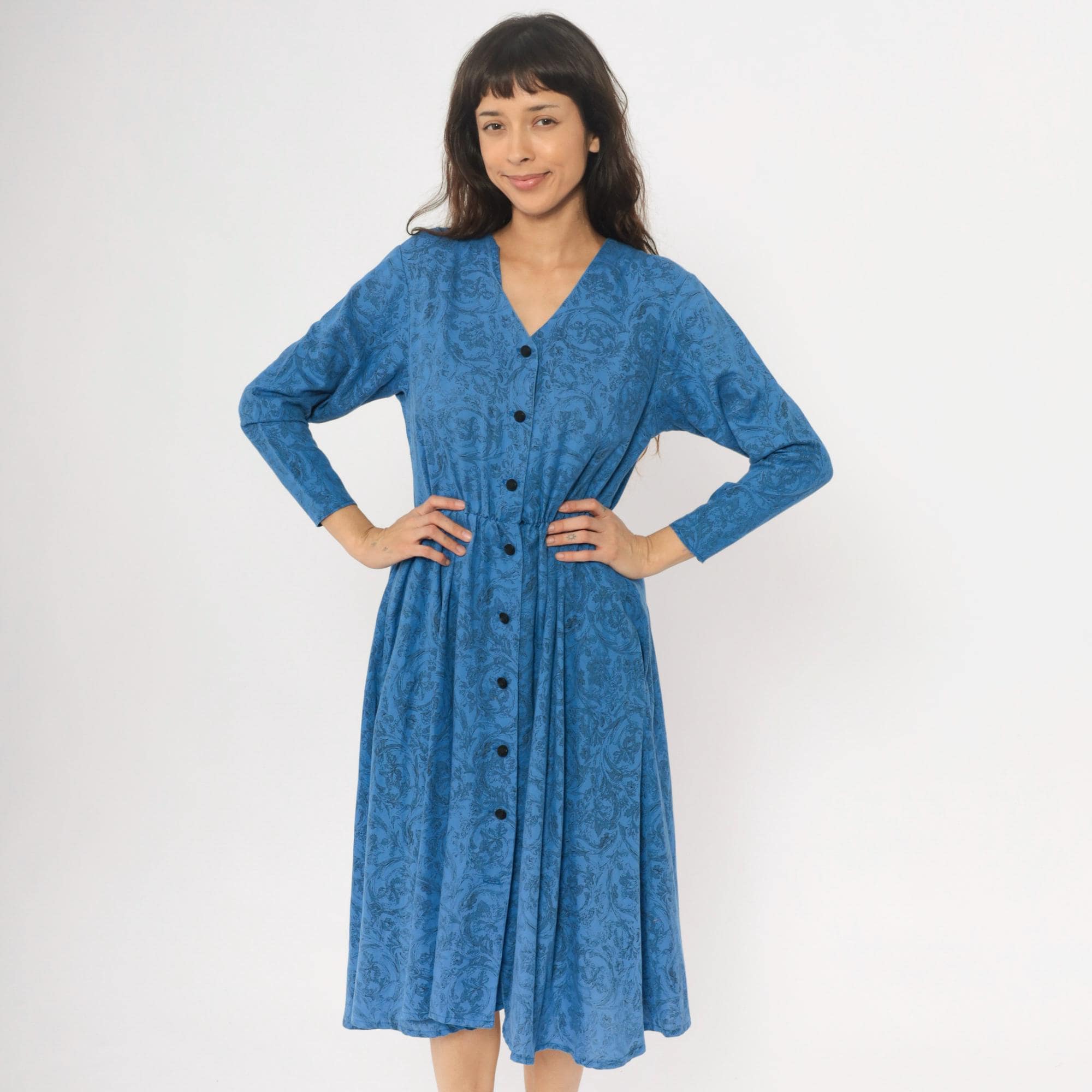 80s blue dress with darker blue paisley and floral pattern throughout the fabric. Button front closure with V-neckline, long sleeves, gathered waist, and full skirt.