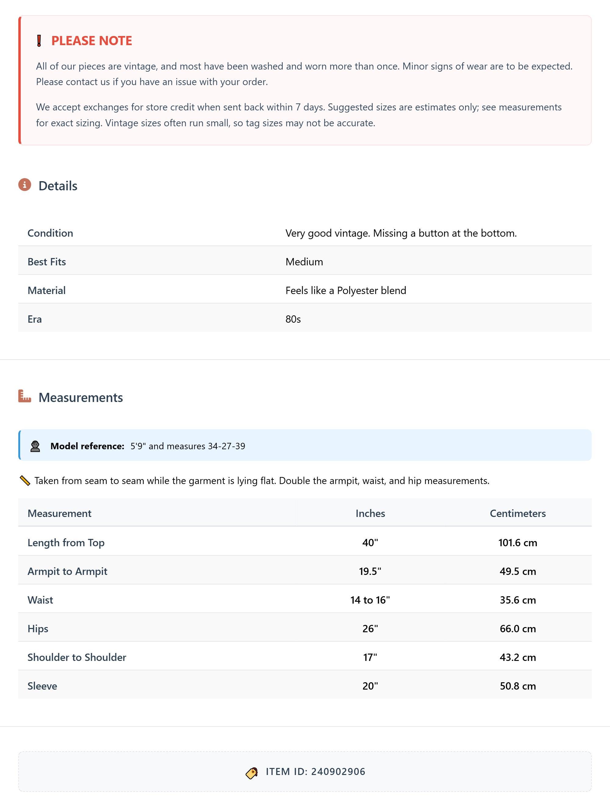 Suggested sizes are estimates only; see measurements for exact sizing. Vintage sizes often run small, so tag sizes may not be accurate.