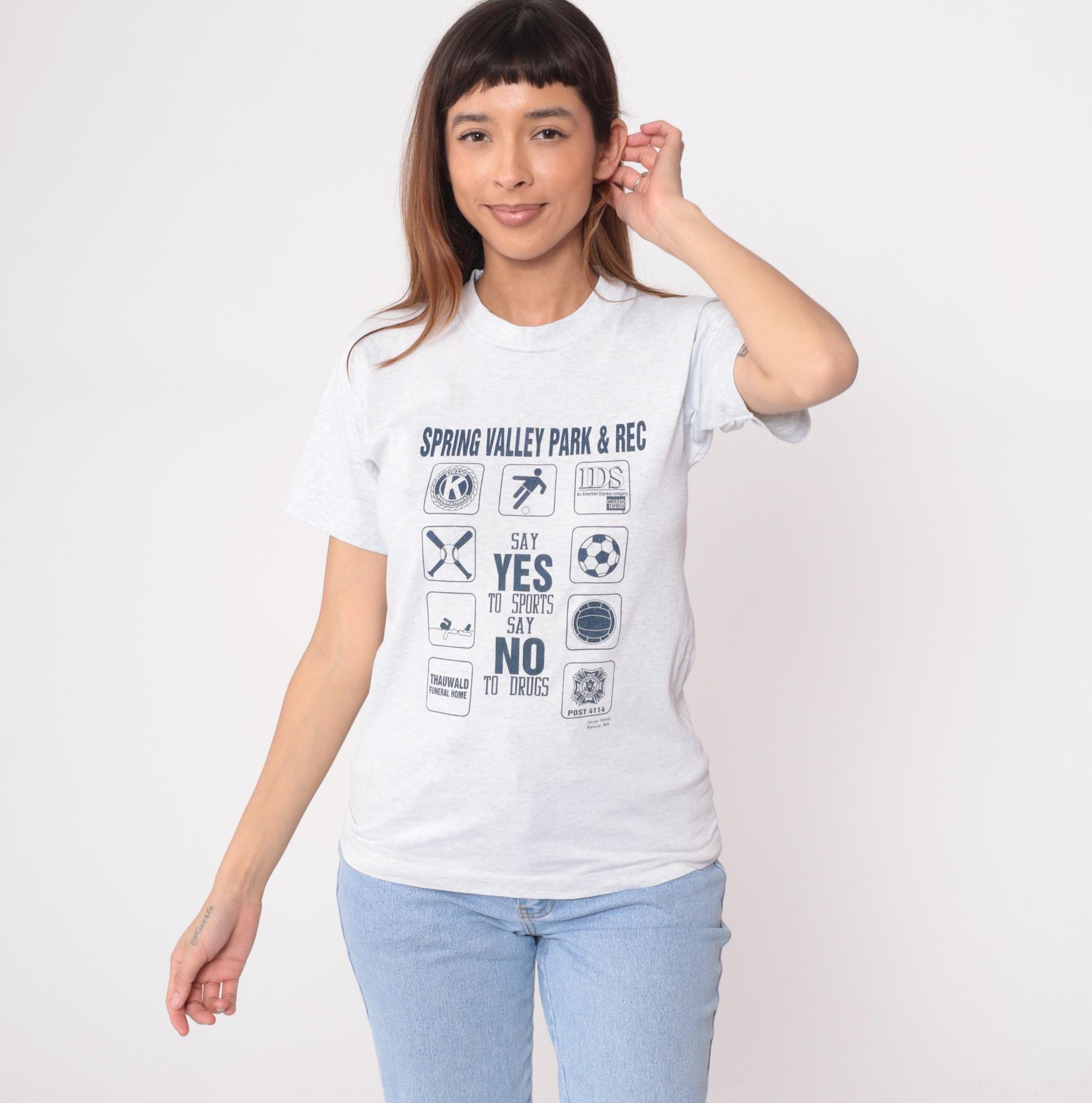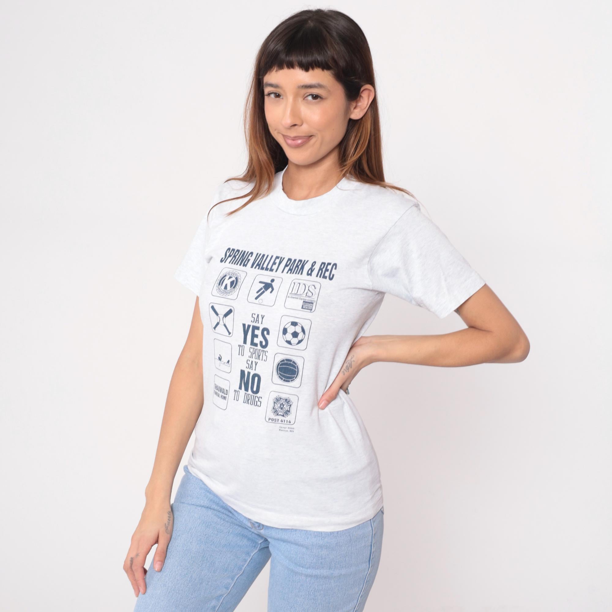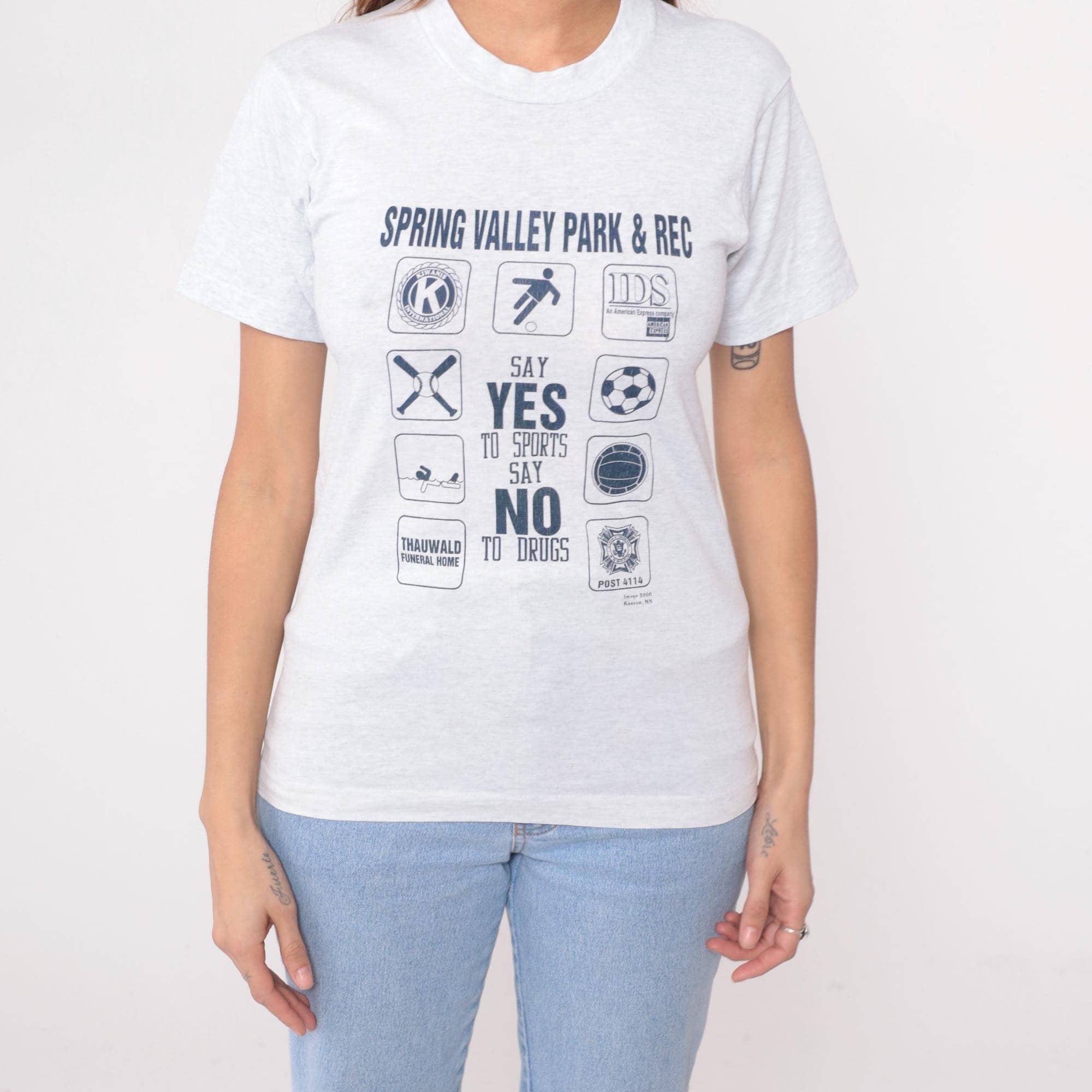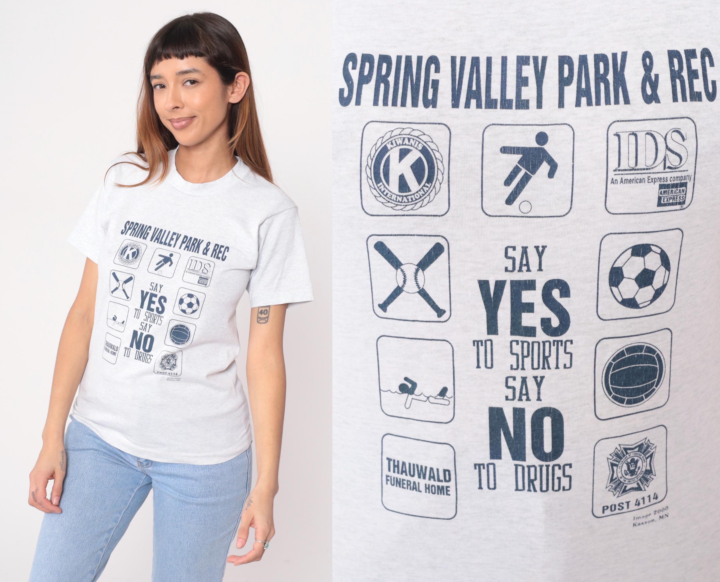 90s white graphic t-shirt from Spring Valley Park & Recreation in Kansas, Minnesota, with navy blue print featuring sponsor logos including Kiwanis International, IDS American Express, Thauwald Funeral Home, and Post 4114 arranged in boxes around sports icons for soccer, baseball, swimming, and volleyball. Central message reads "SAY YES TO SPORTS SAY NO TO DRUGS" in bold lettering. Crew neck with short sleeves, tagged fruit of the loom best.